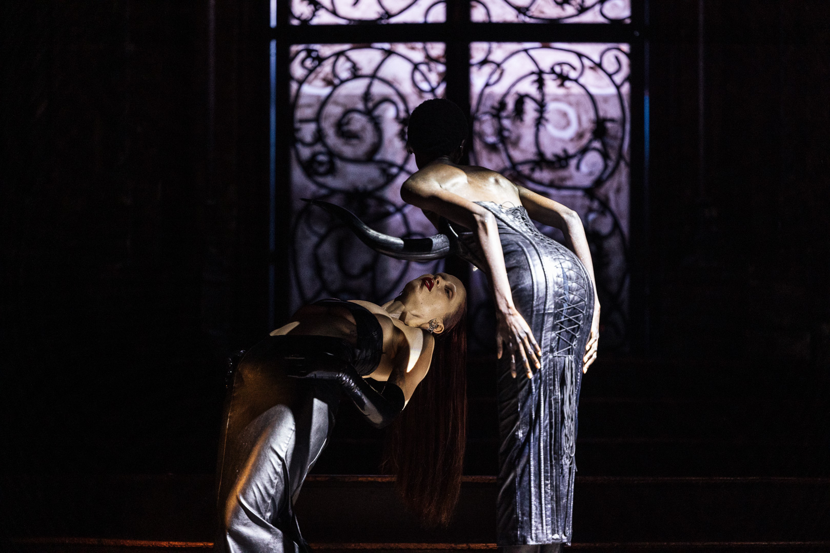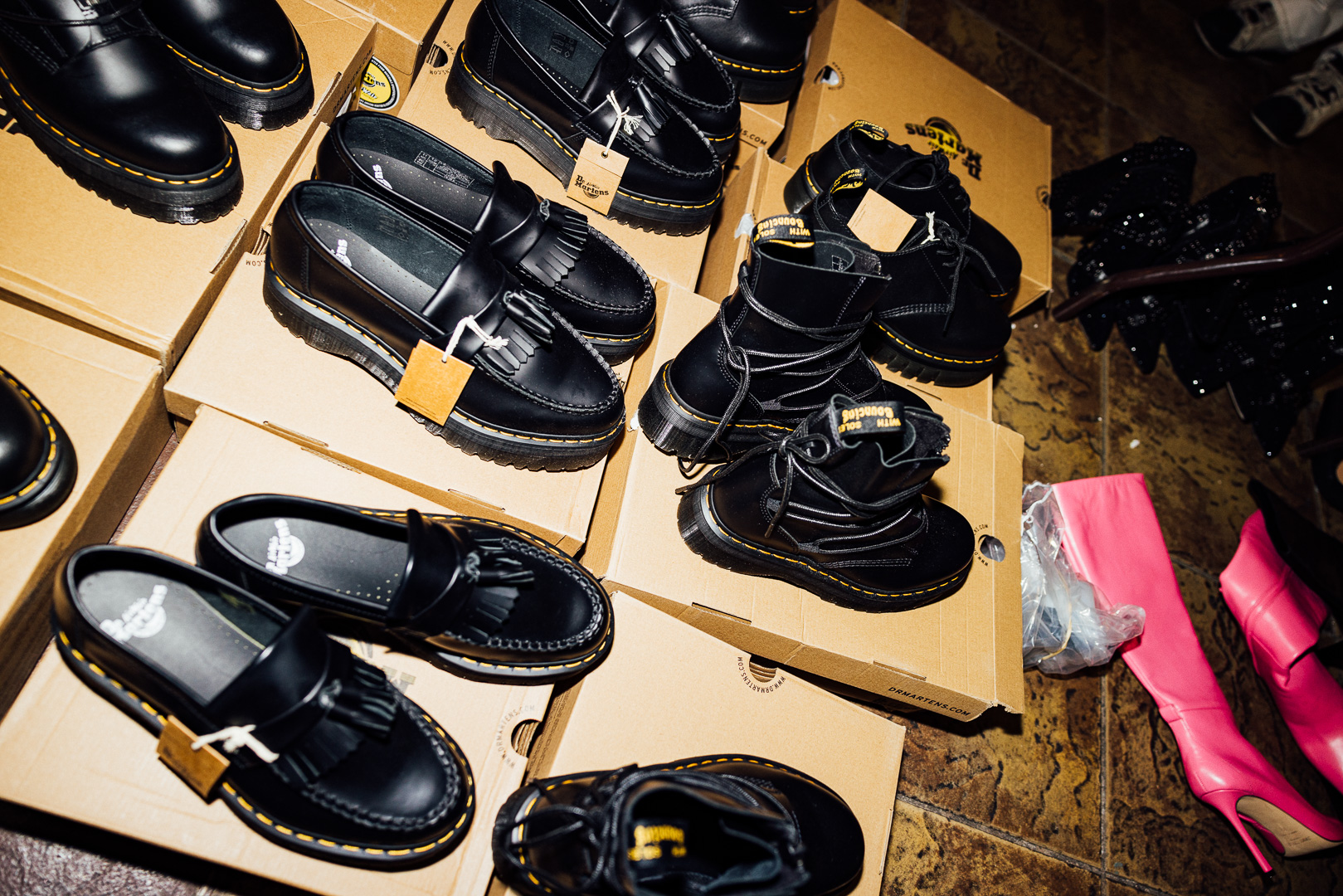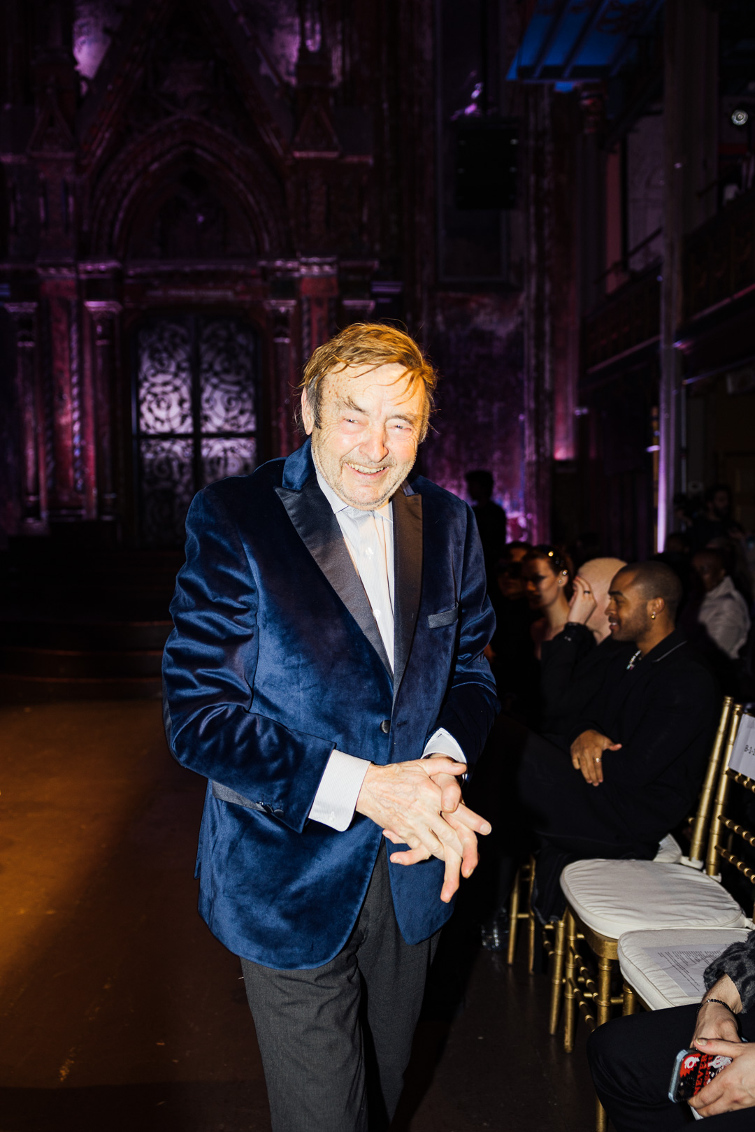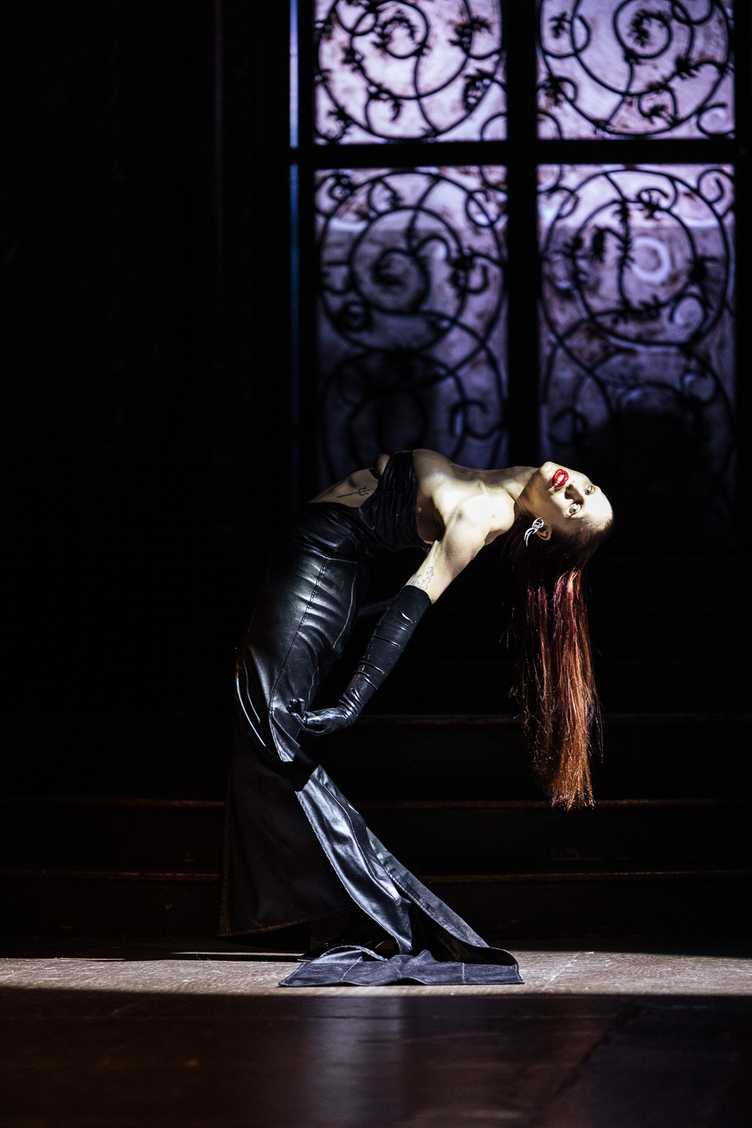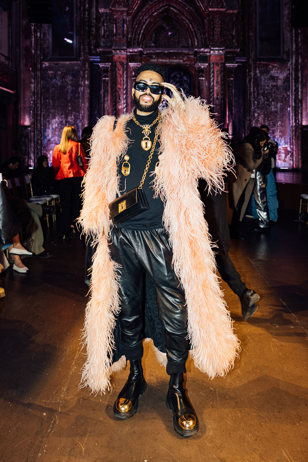 Le latex et le cuir sont présents tout au long de la collection avec des épaules pointues, de la corseterie et des traînes, avec de nombreux ourlets exagérés, dans une palette de couleurs de prune, d’argent métallique, de rouge sang et de noir profond. Le cuir gris dramatique et en détresse est imprimé sur du cuir végétal, en collaboration avec Kornit.