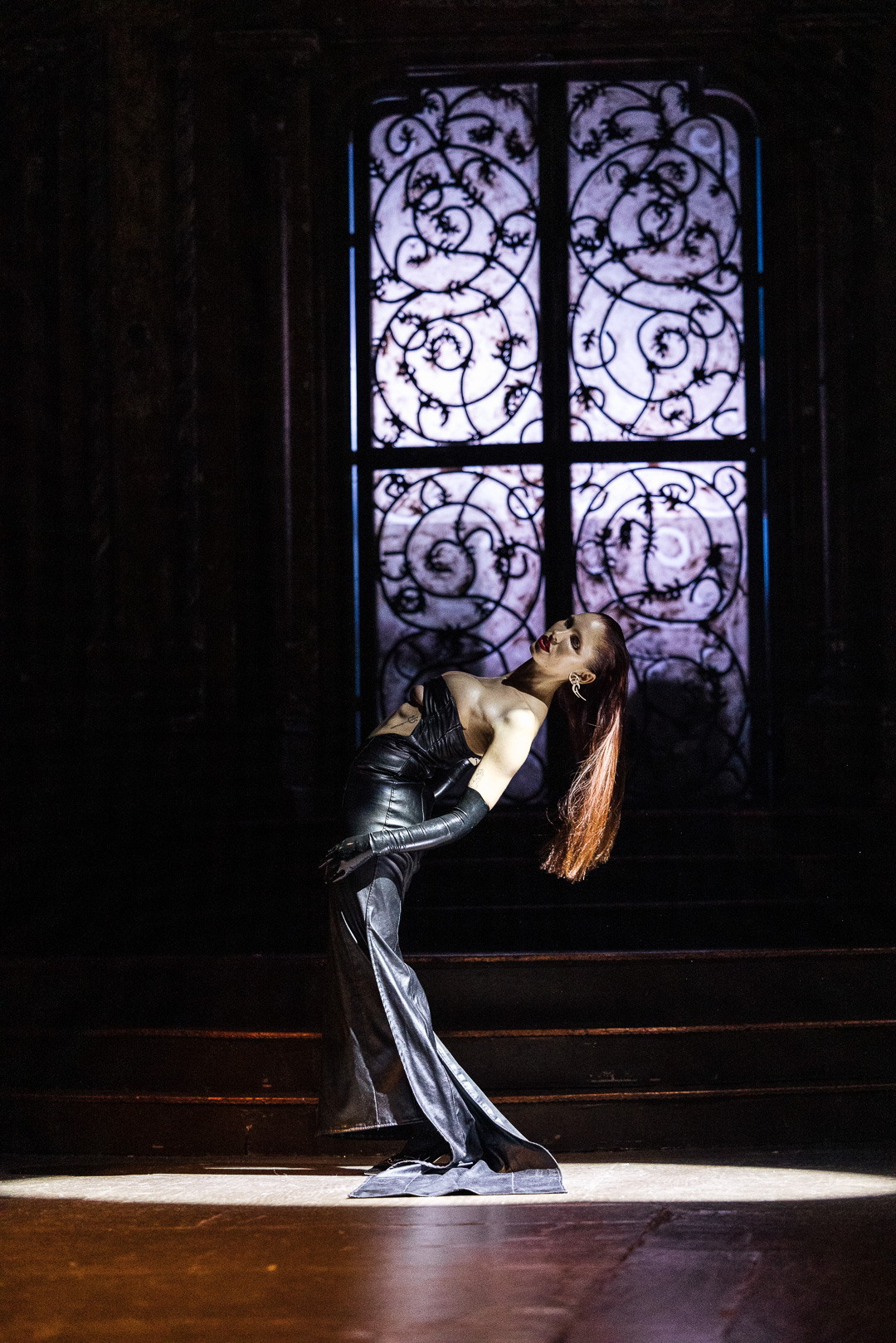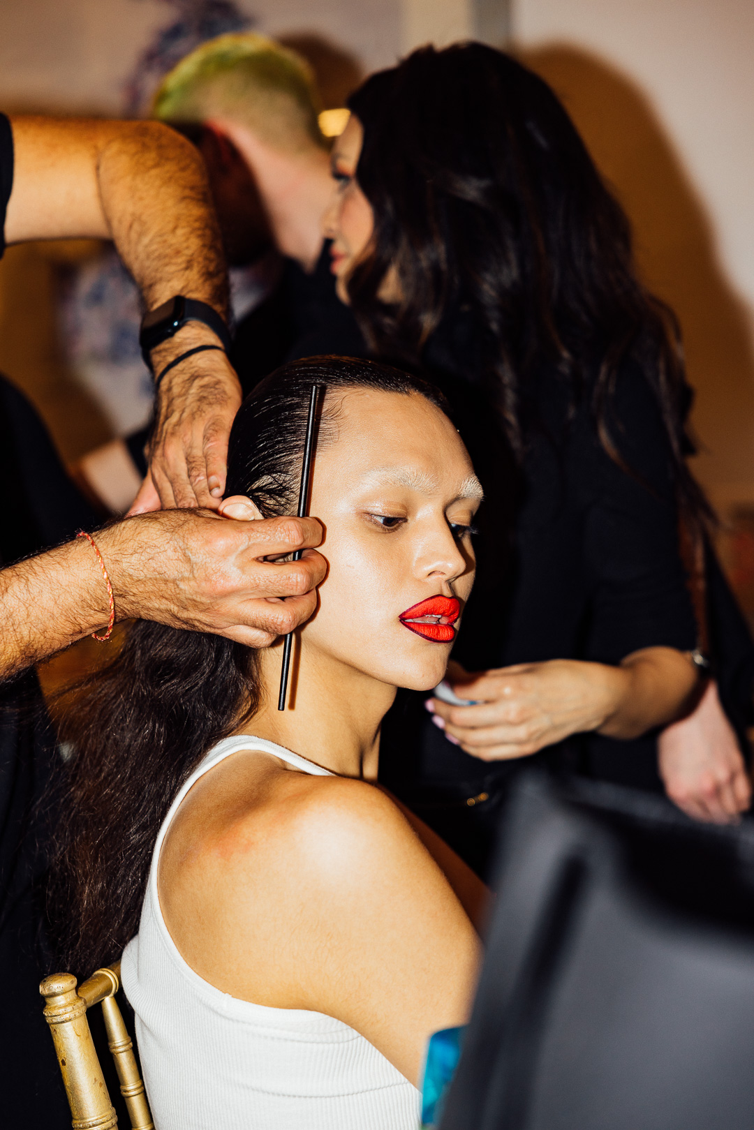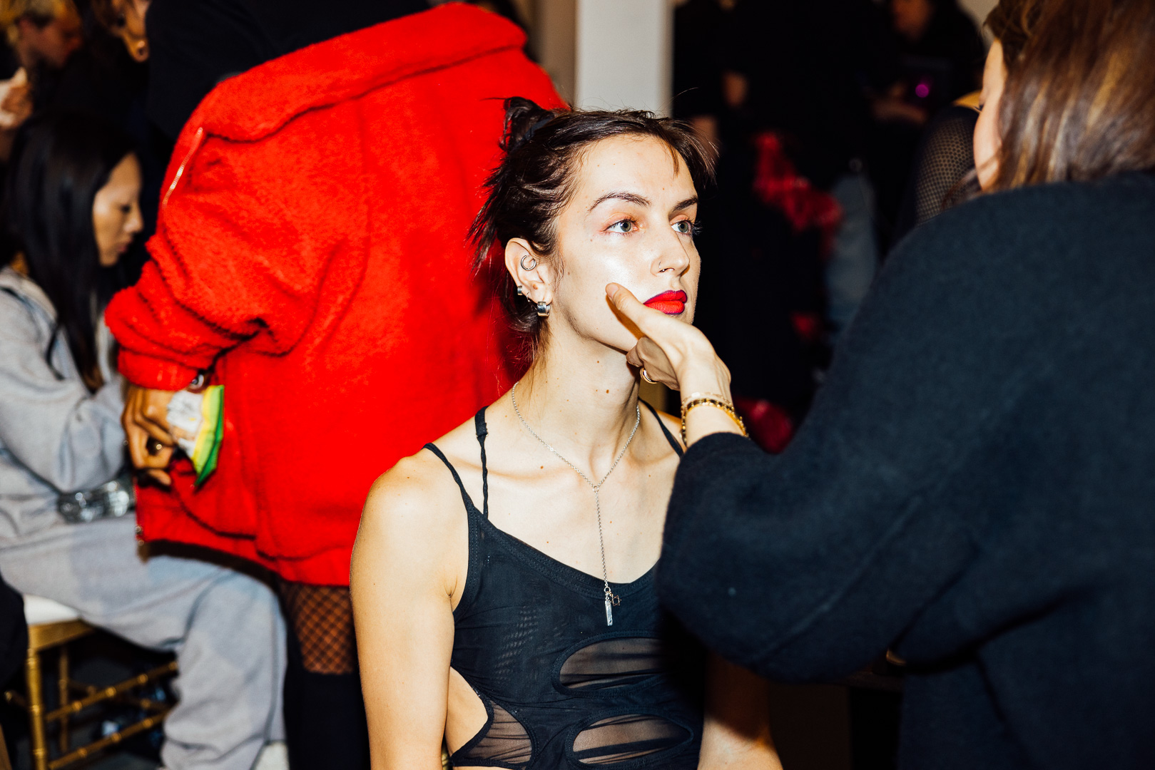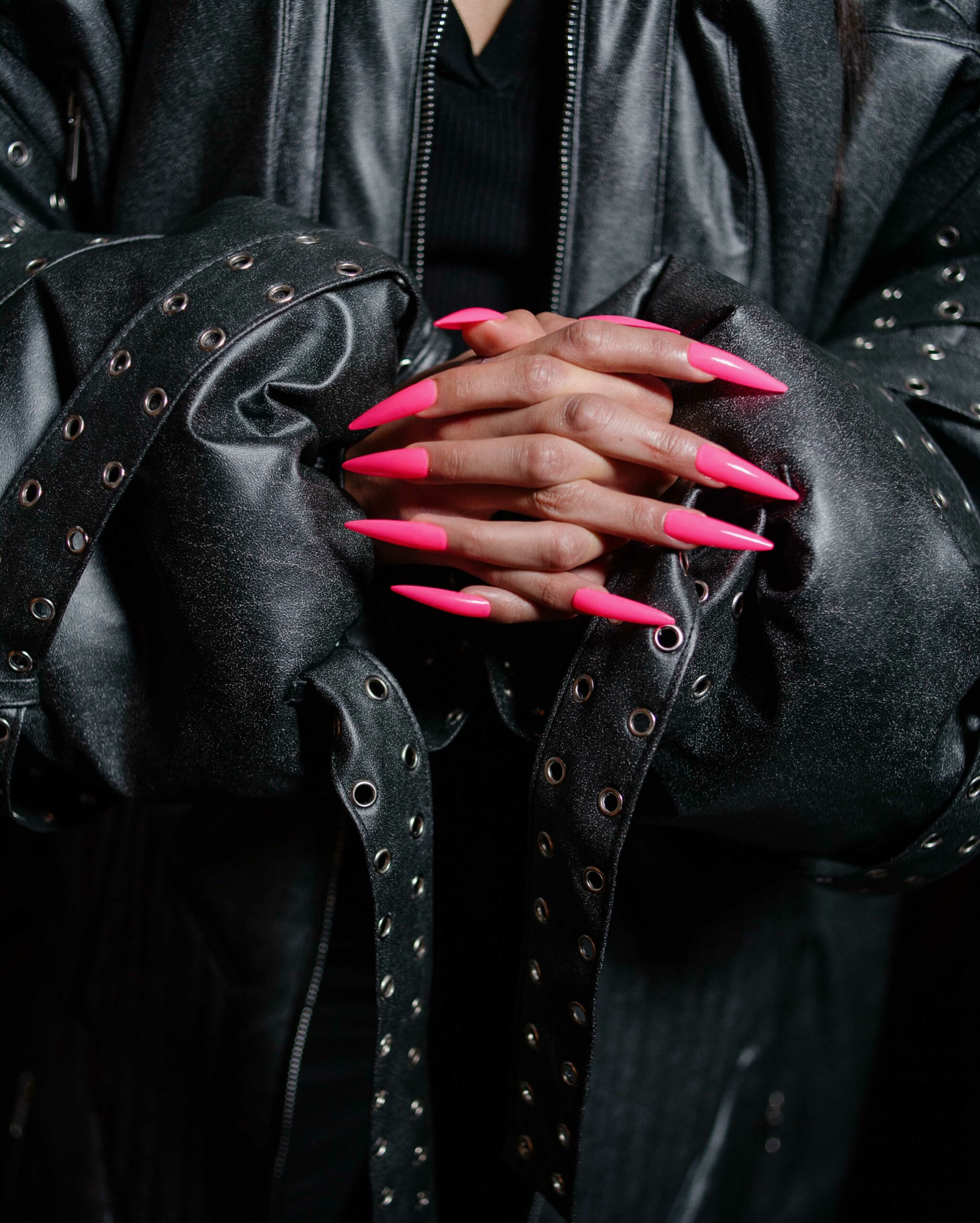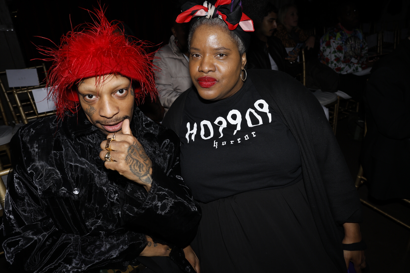 Le latex et le cuir sont présents tout au long de la collection avec des épaules pointues, de la corseterie et des traînes, avec de nombreux ourlets exagérés, dans une palette de couleurs de prune, d’argent métallique, de rouge sang et de noir profond. Le cuir gris dramatique et en détresse est imprimé sur du cuir végétal, en collaboration avec Kornit.