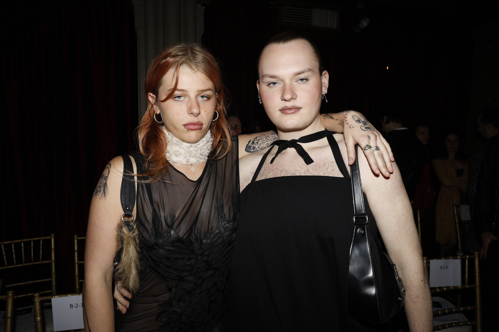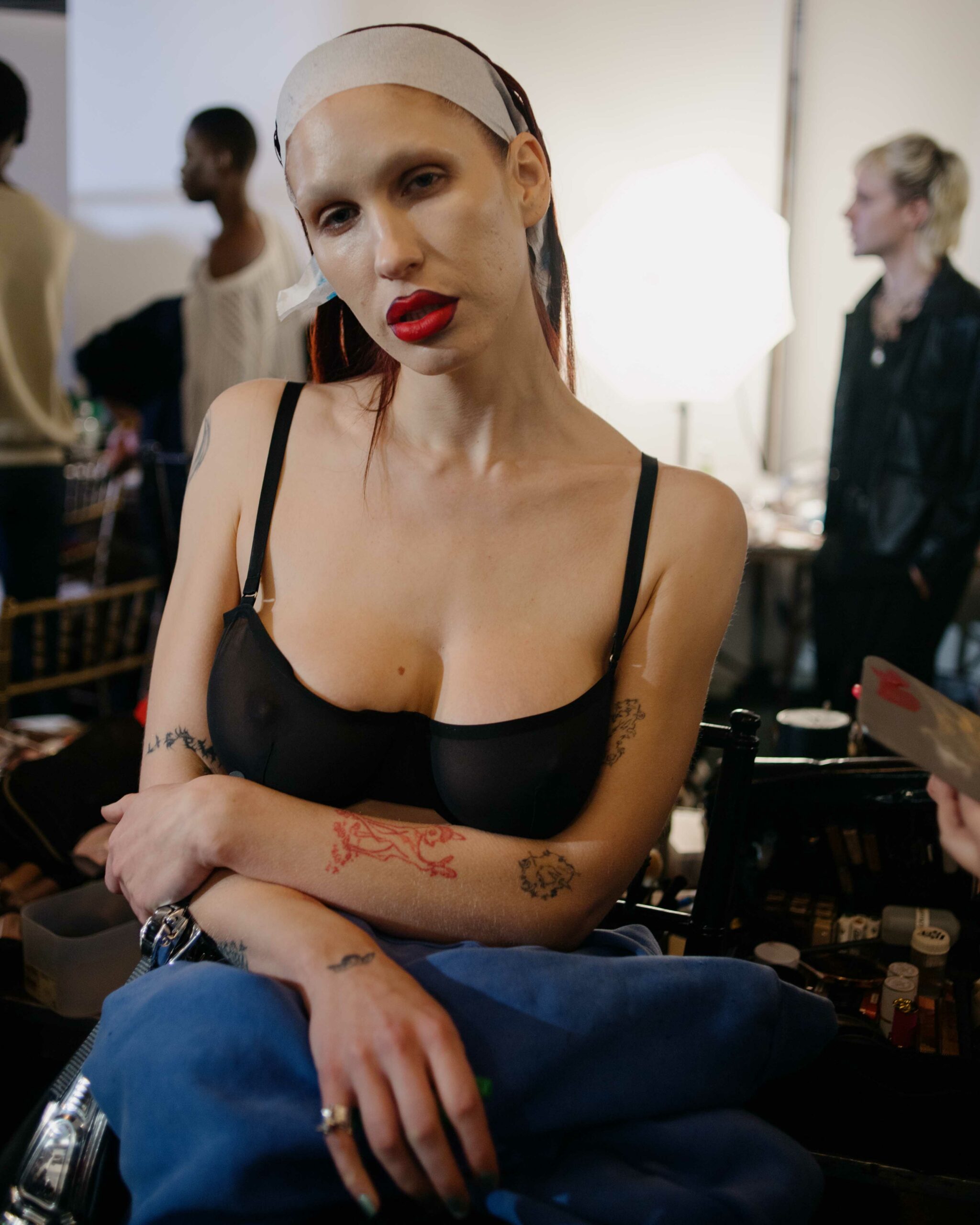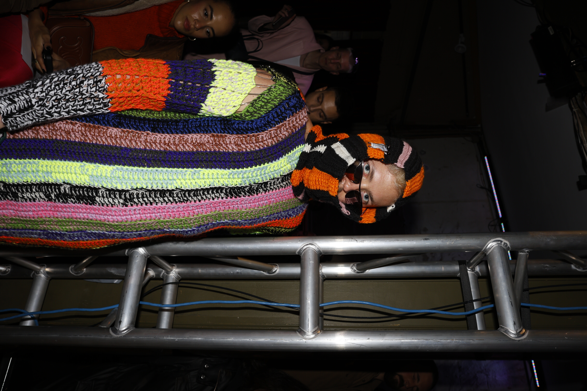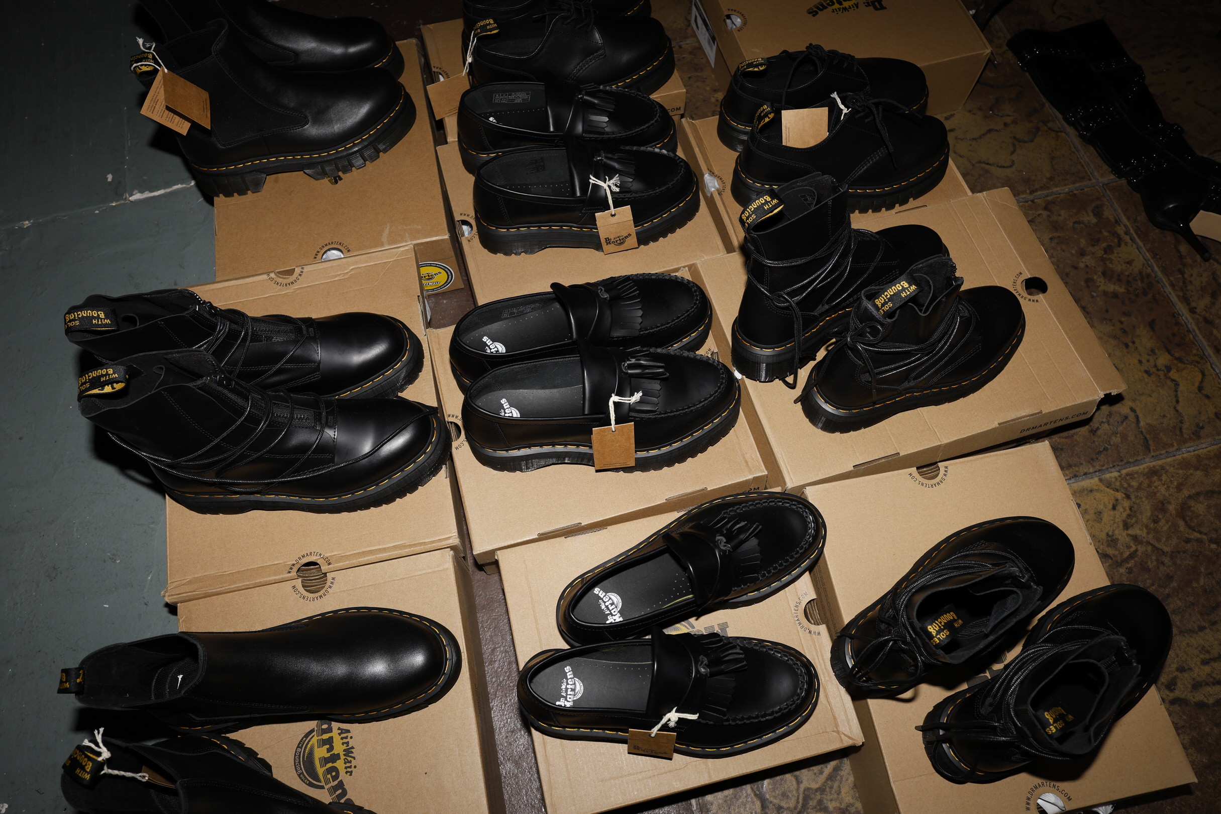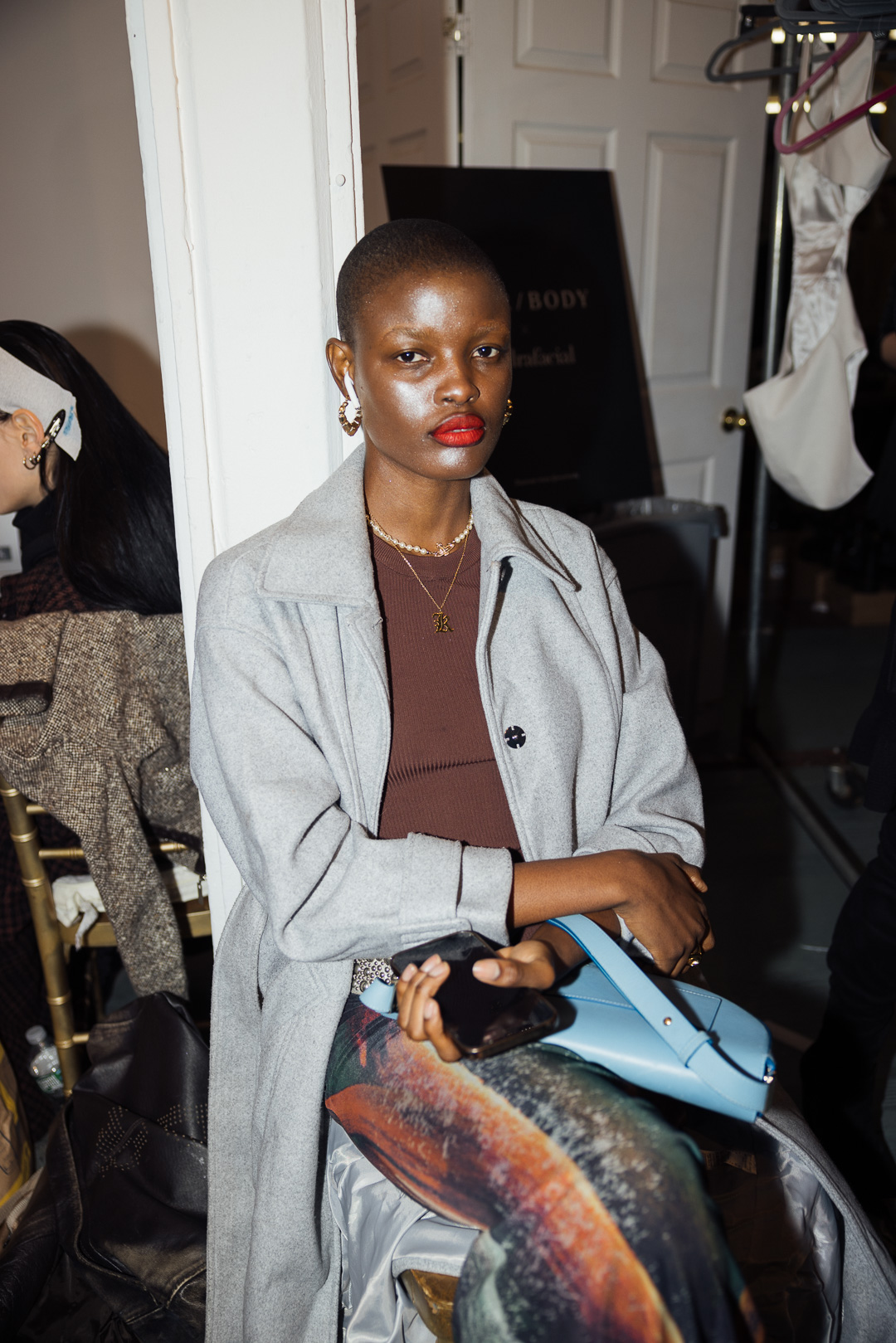 Le latex et le cuir sont présents tout au long de la collection avec des épaules pointues, de la corseterie et des traînes, avec de nombreux ourlets exagérés, dans une palette de couleurs de prune, d’argent métallique, de rouge sang et de noir profond. Le cuir gris dramatique et en détresse est imprimé sur du cuir végétal, en collaboration avec Kornit.