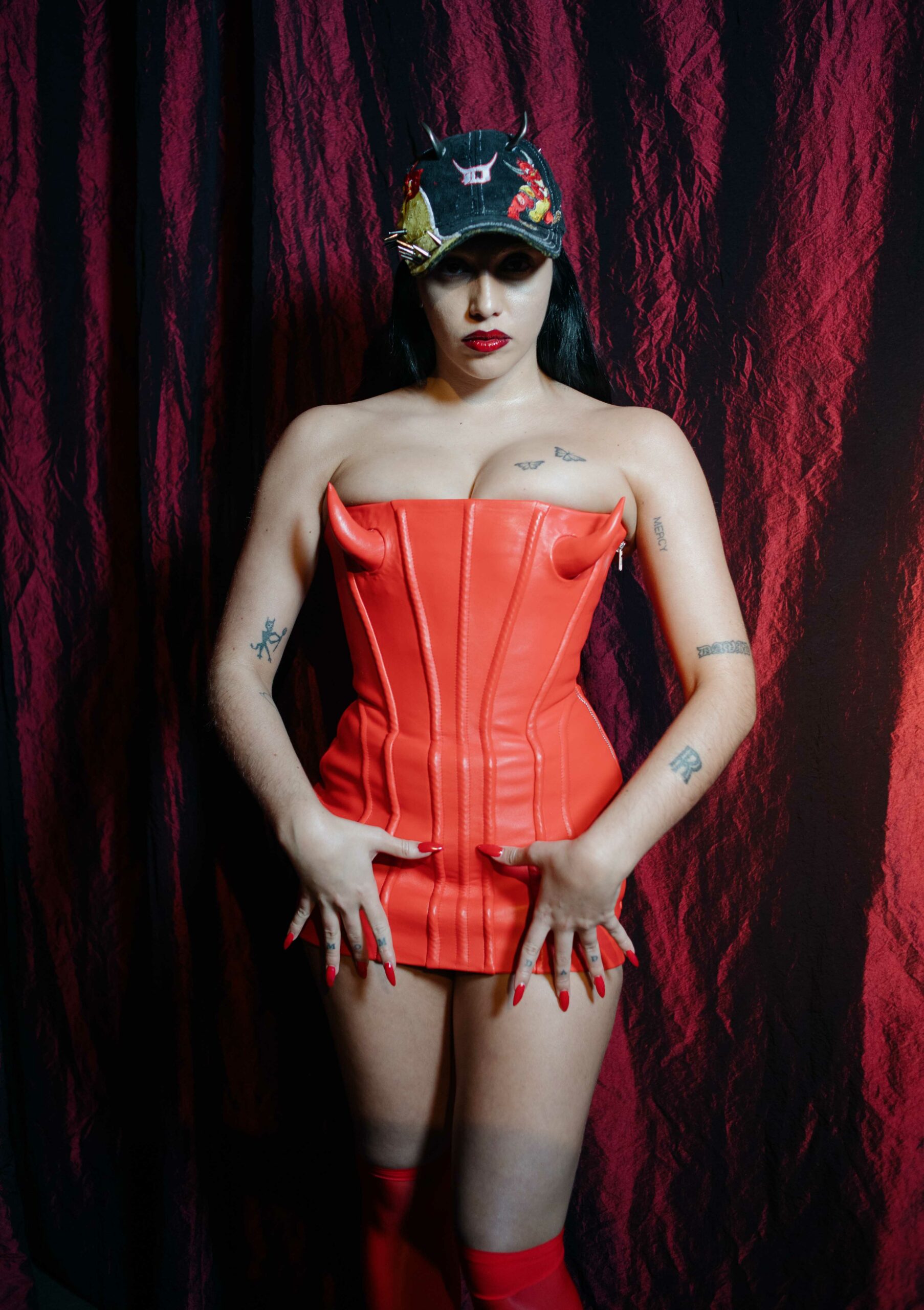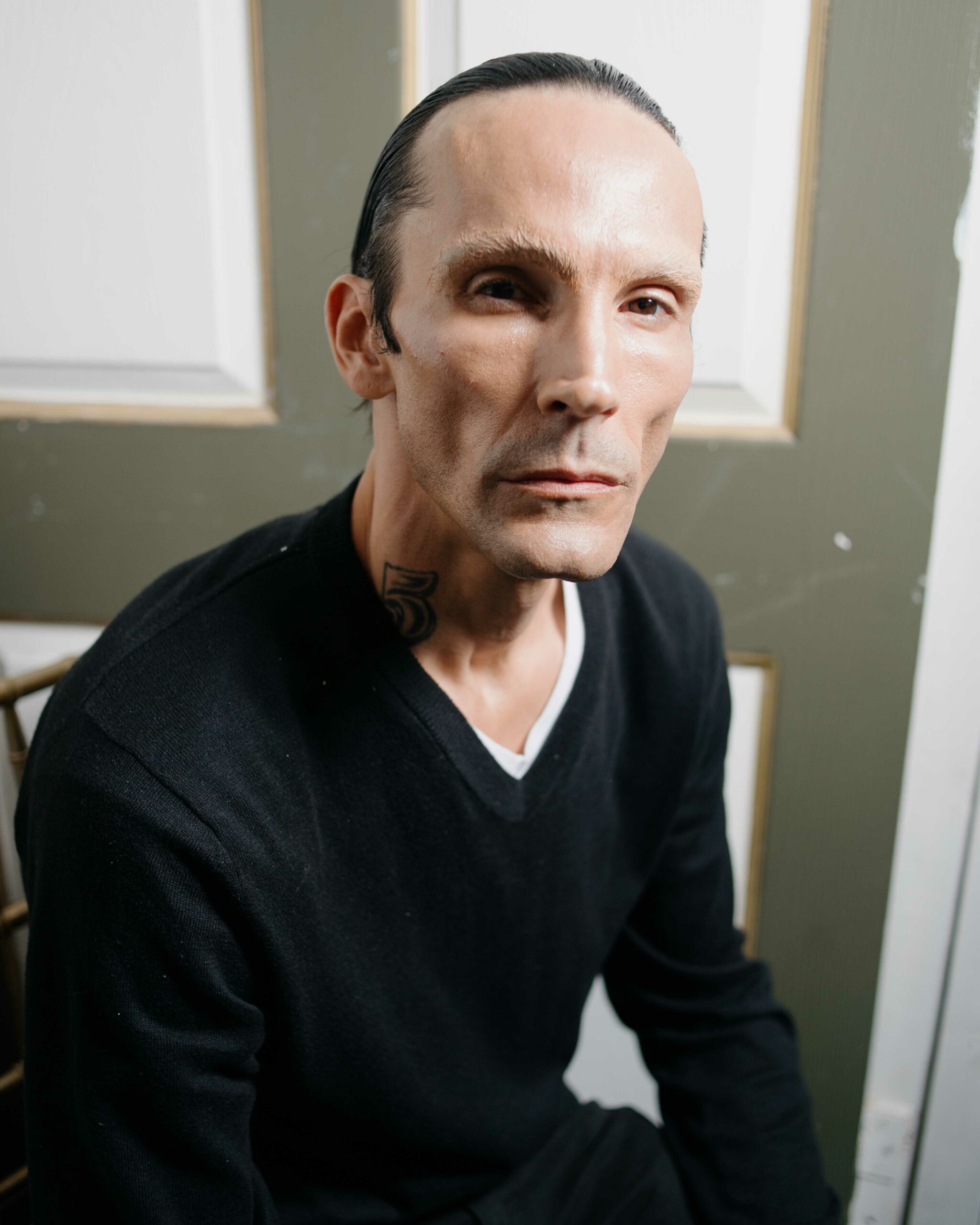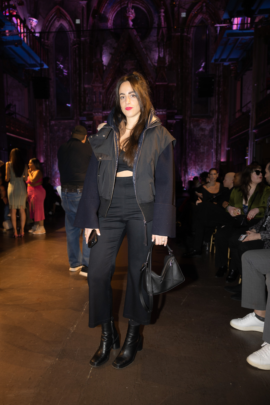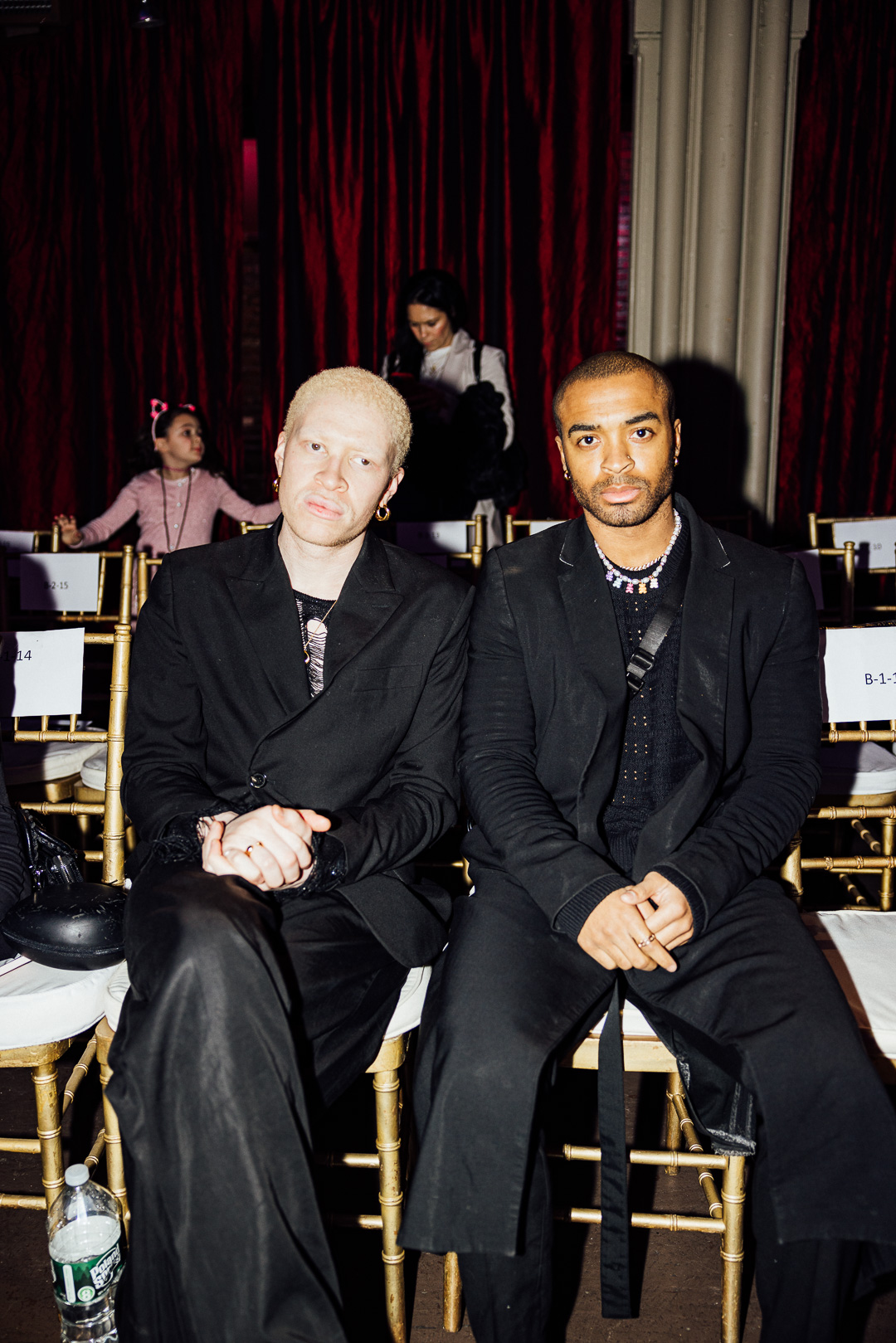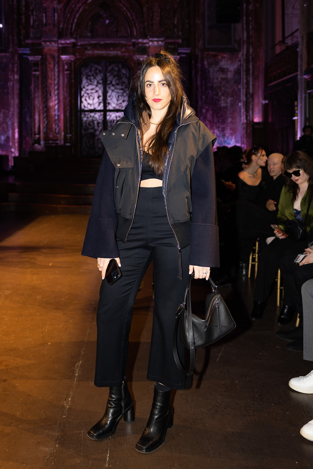 Le latex et le cuir sont présents tout au long de la collection avec des épaules pointues, de la corseterie et des traînes, avec de nombreux ourlets exagérés, dans une palette de couleurs de prune, d’argent métallique, de rouge sang et de noir profond. Le cuir gris dramatique et en détresse est imprimé sur du cuir végétal, en collaboration avec Kornit.