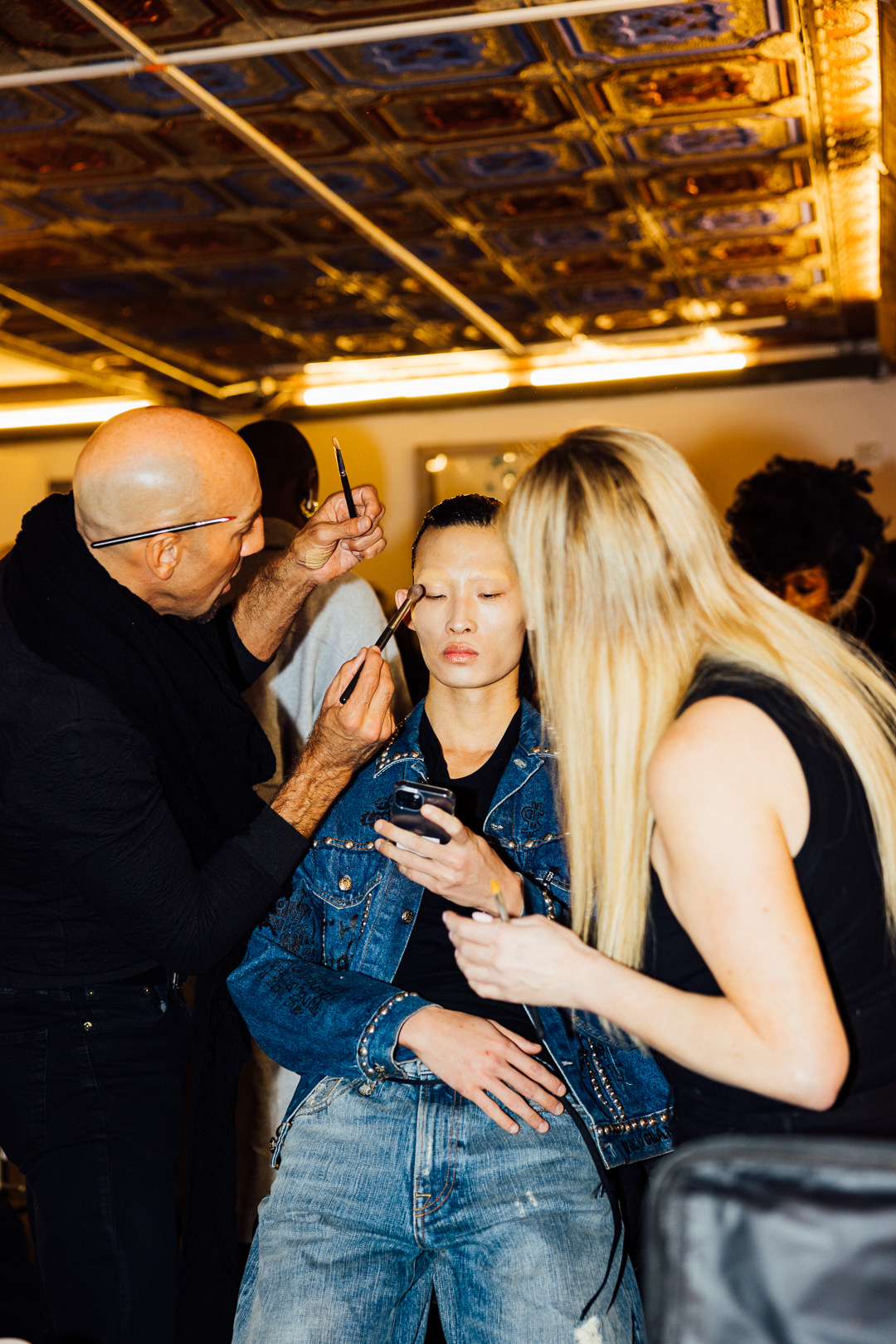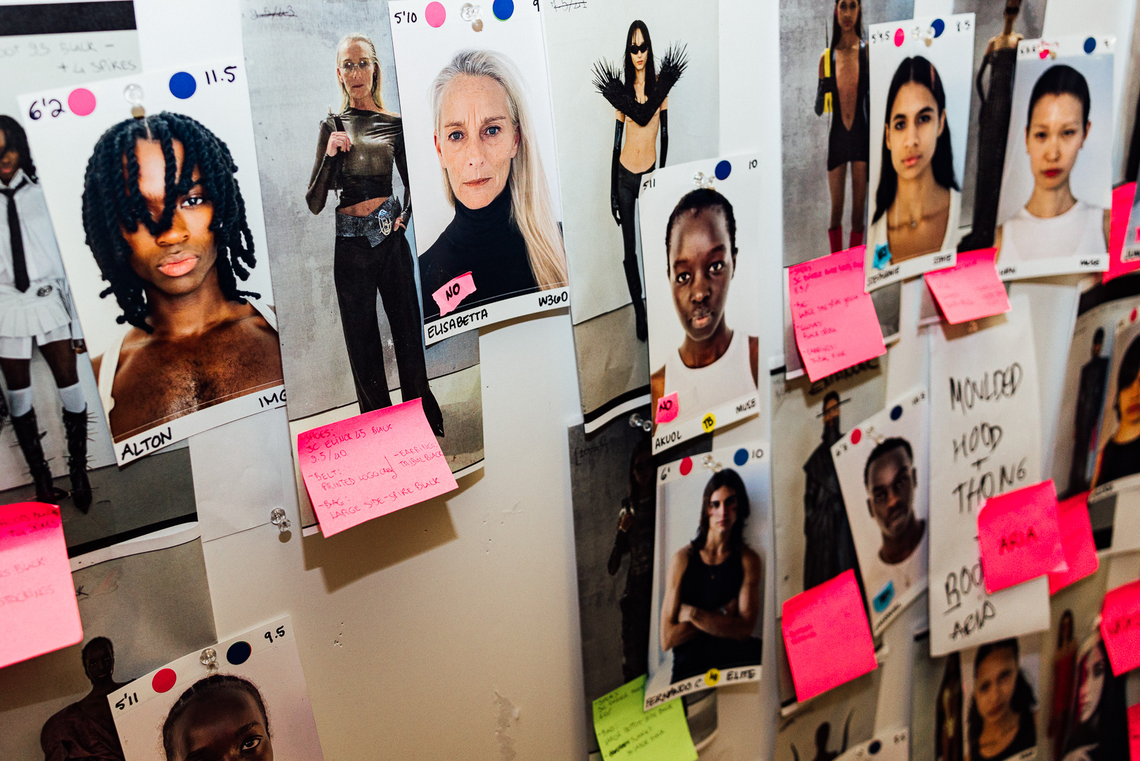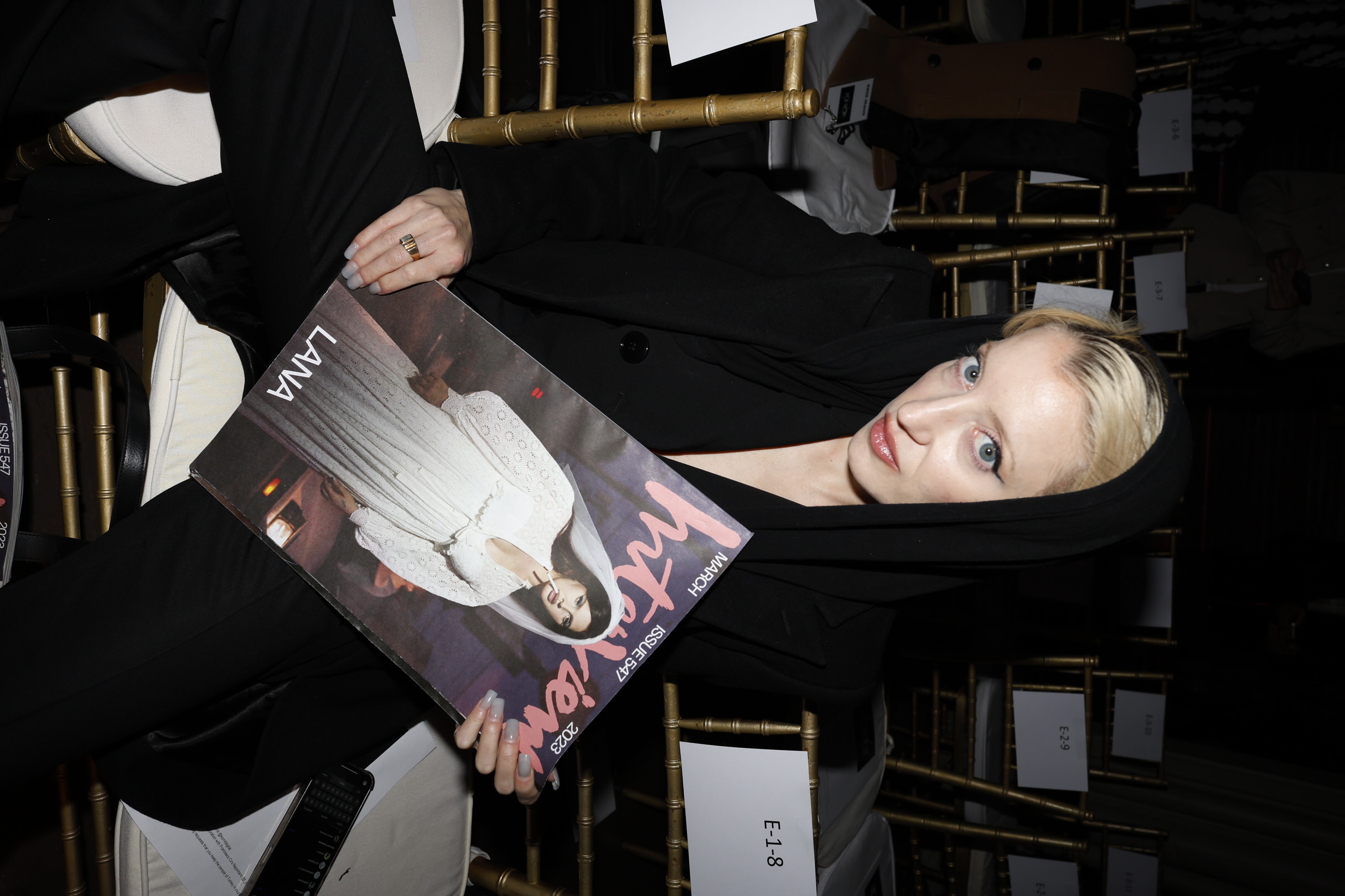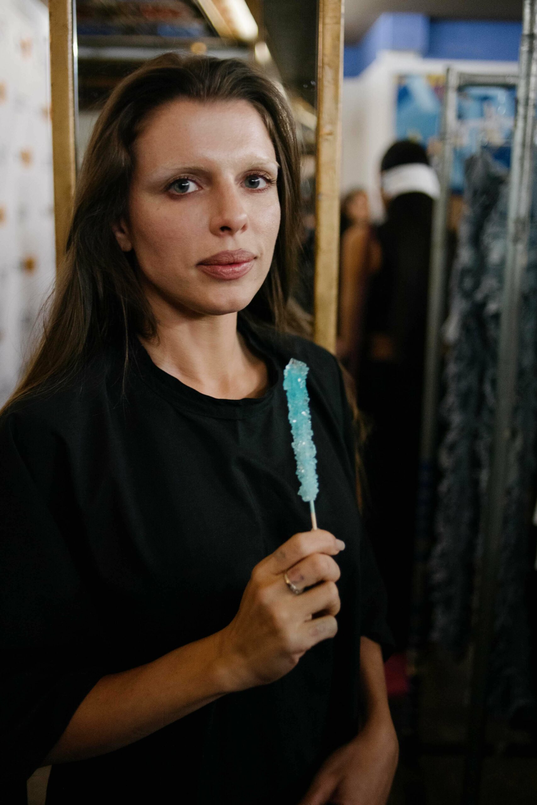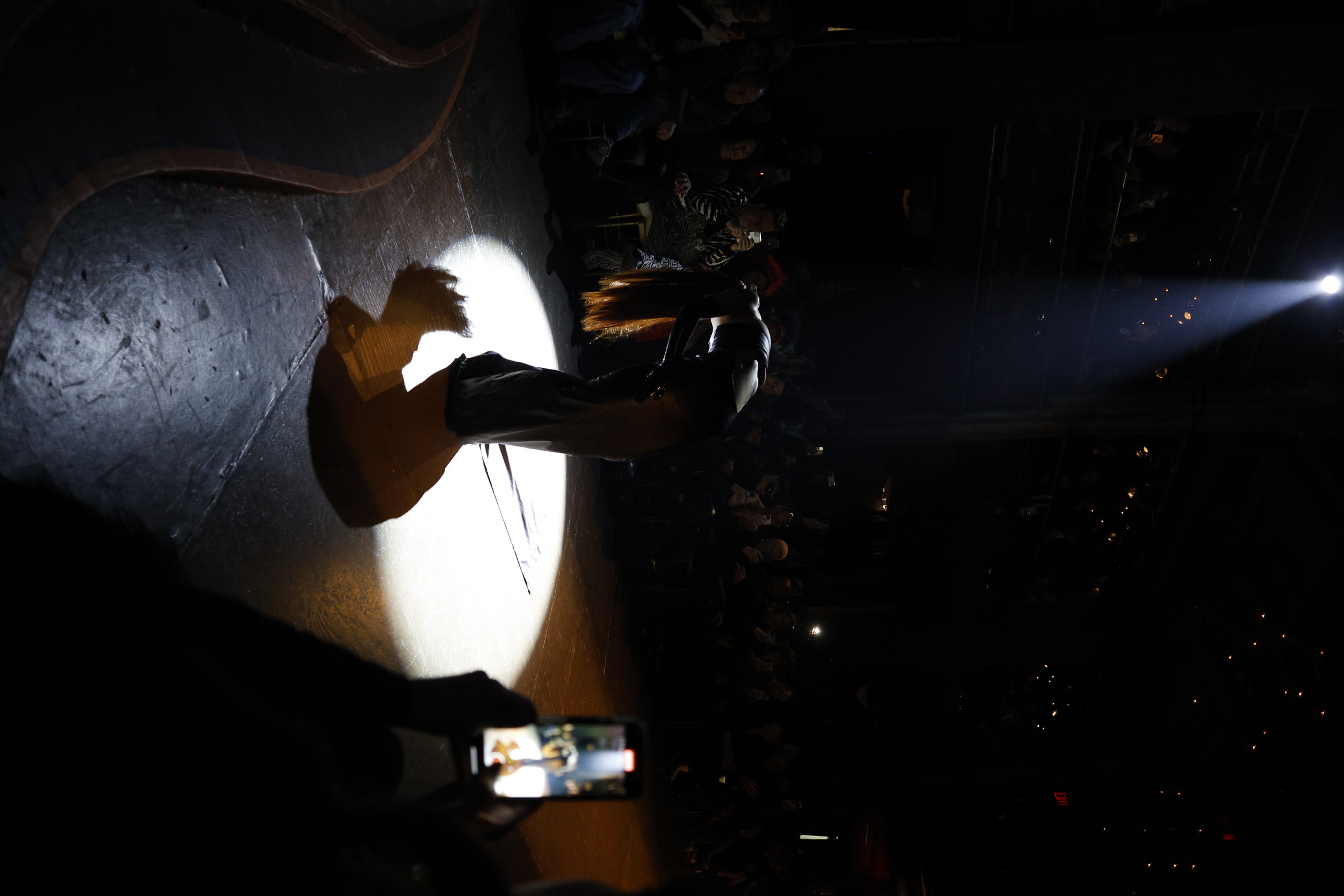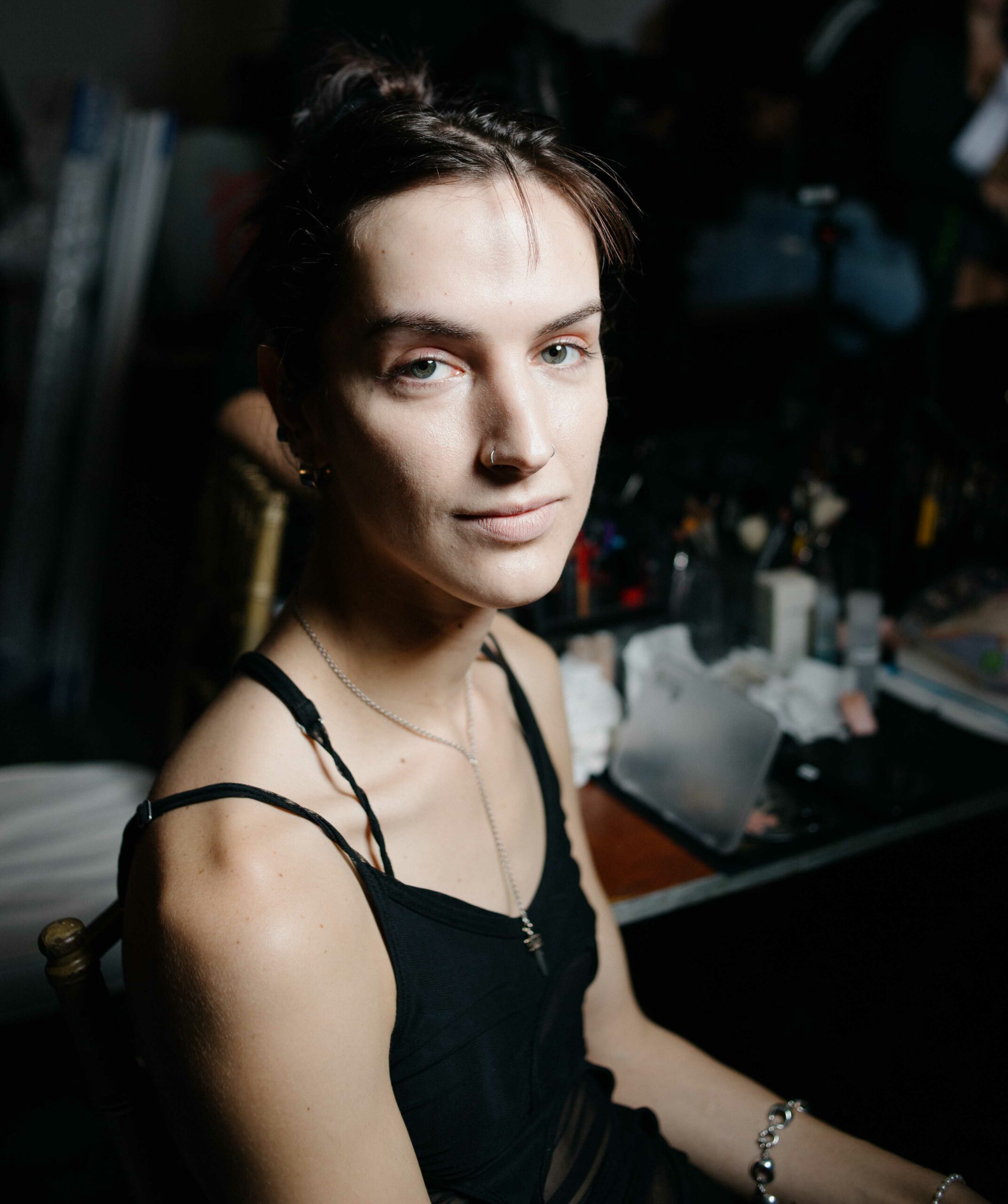 Le latex et le cuir sont présents tout au long de la collection avec des épaules pointues, de la corseterie et des traînes, avec de nombreux ourlets exagérés, dans une palette de couleurs de prune, d’argent métallique, de rouge sang et de noir profond. Le cuir gris dramatique et en détresse est imprimé sur du cuir végétal, en collaboration avec Kornit.