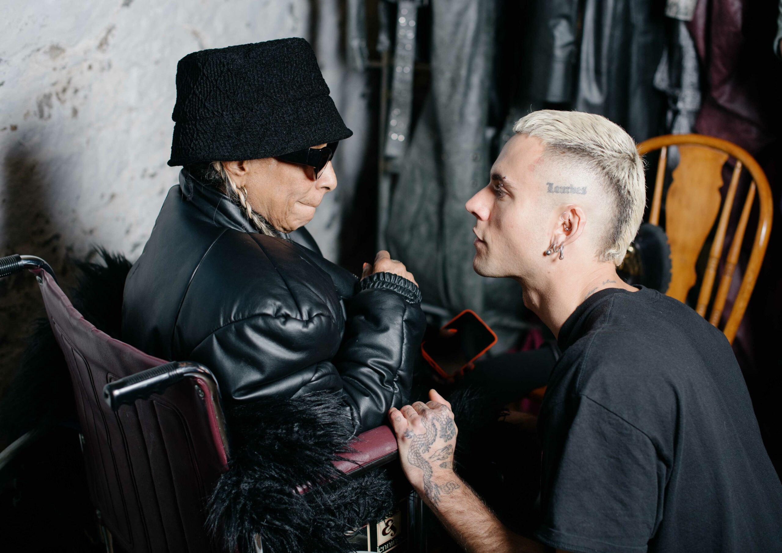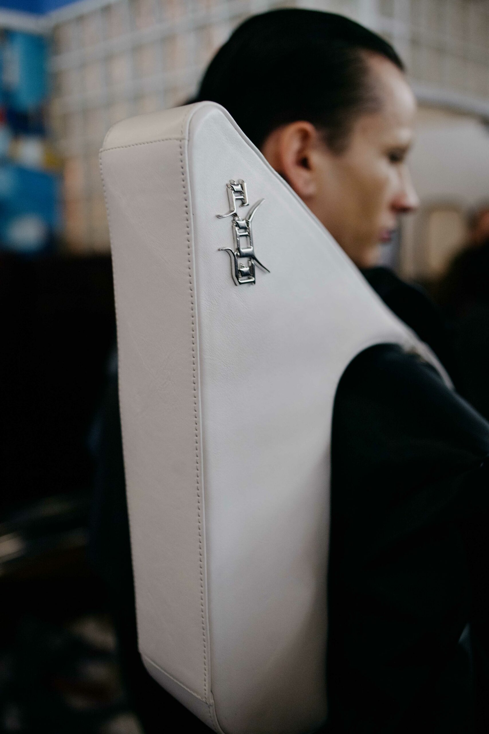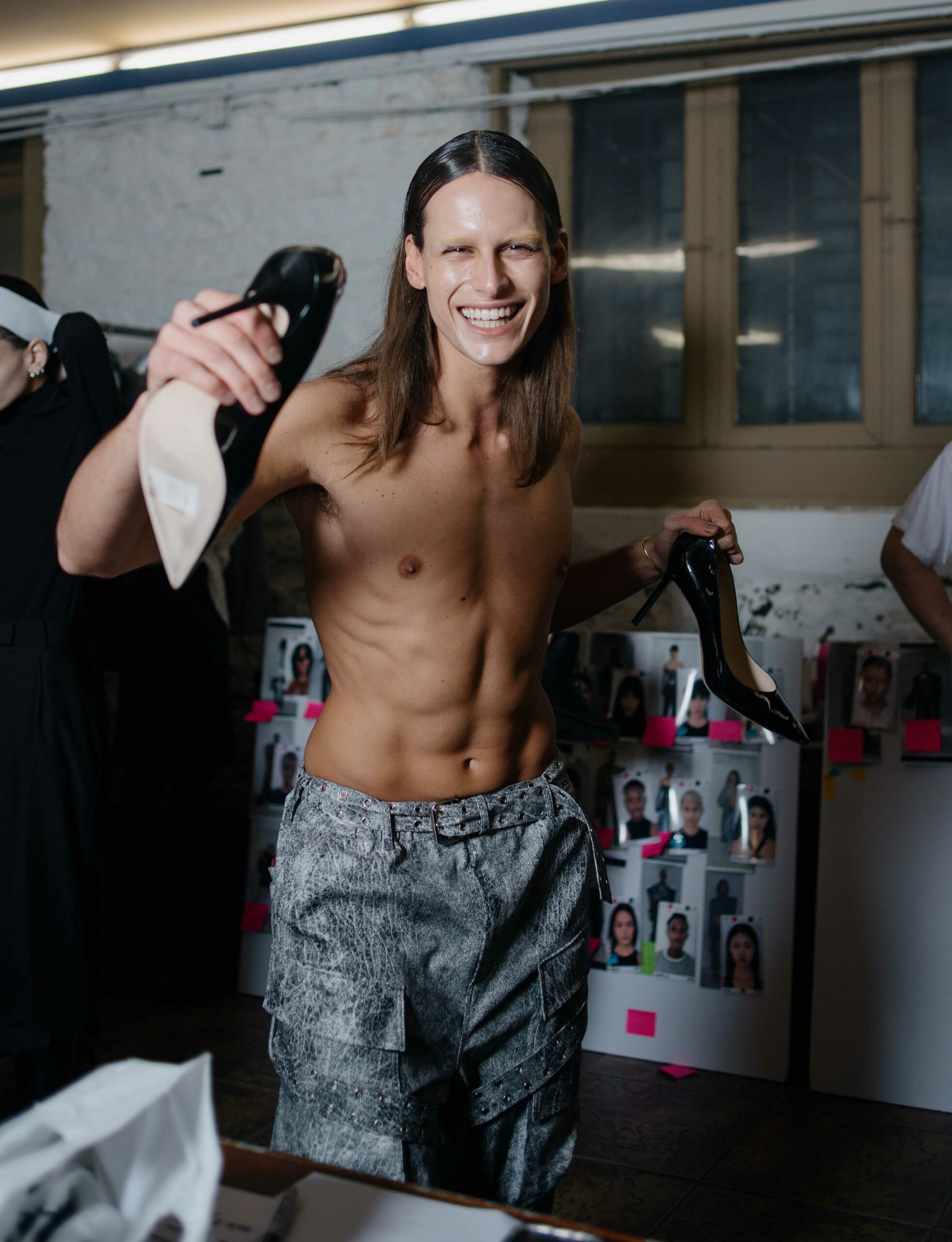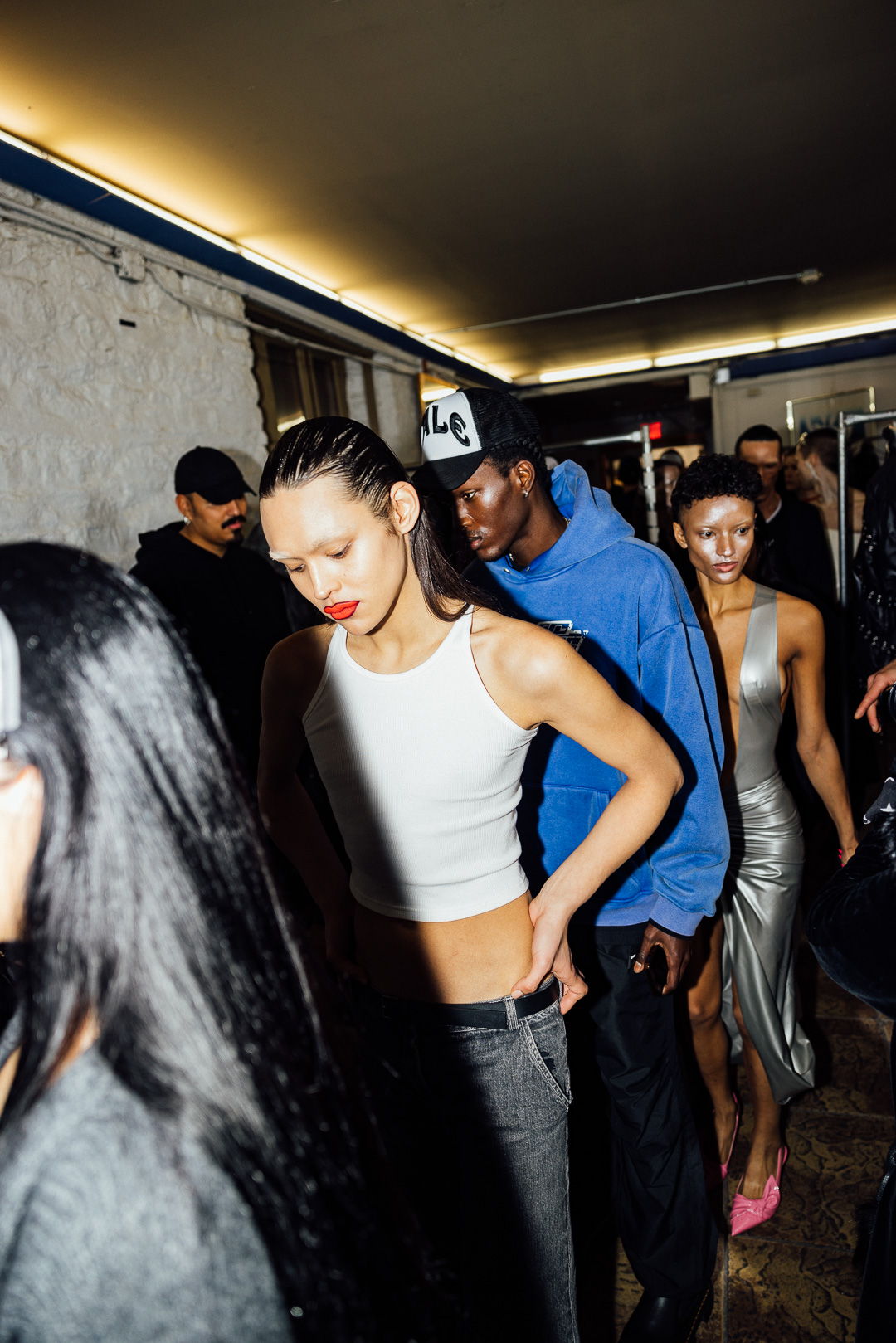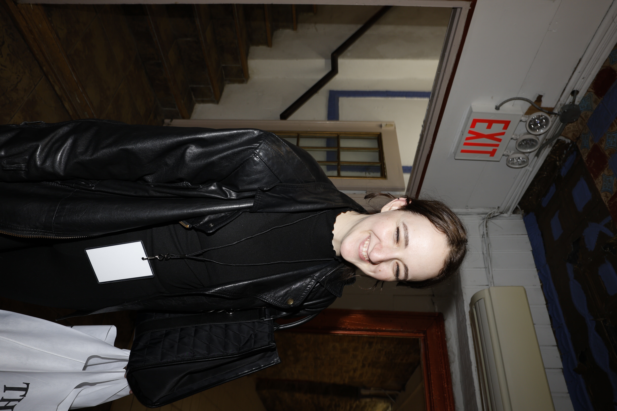 Le latex et le cuir sont présents tout au long de la collection avec des épaules pointues, de la corseterie et des traînes, avec de nombreux ourlets exagérés, dans une palette de couleurs de prune, d’argent métallique, de rouge sang et de noir profond. Le cuir gris dramatique et en détresse est imprimé sur du cuir végétal, en collaboration avec Kornit.