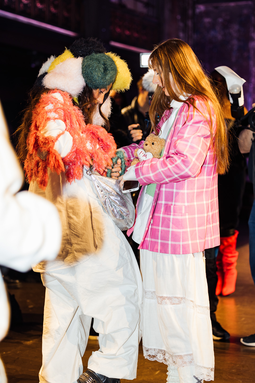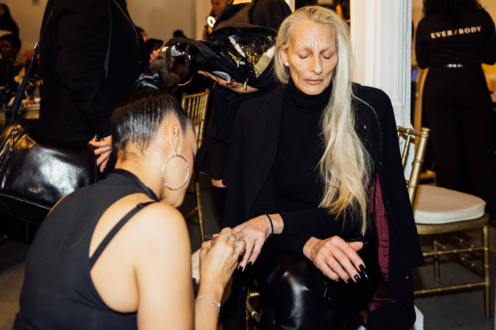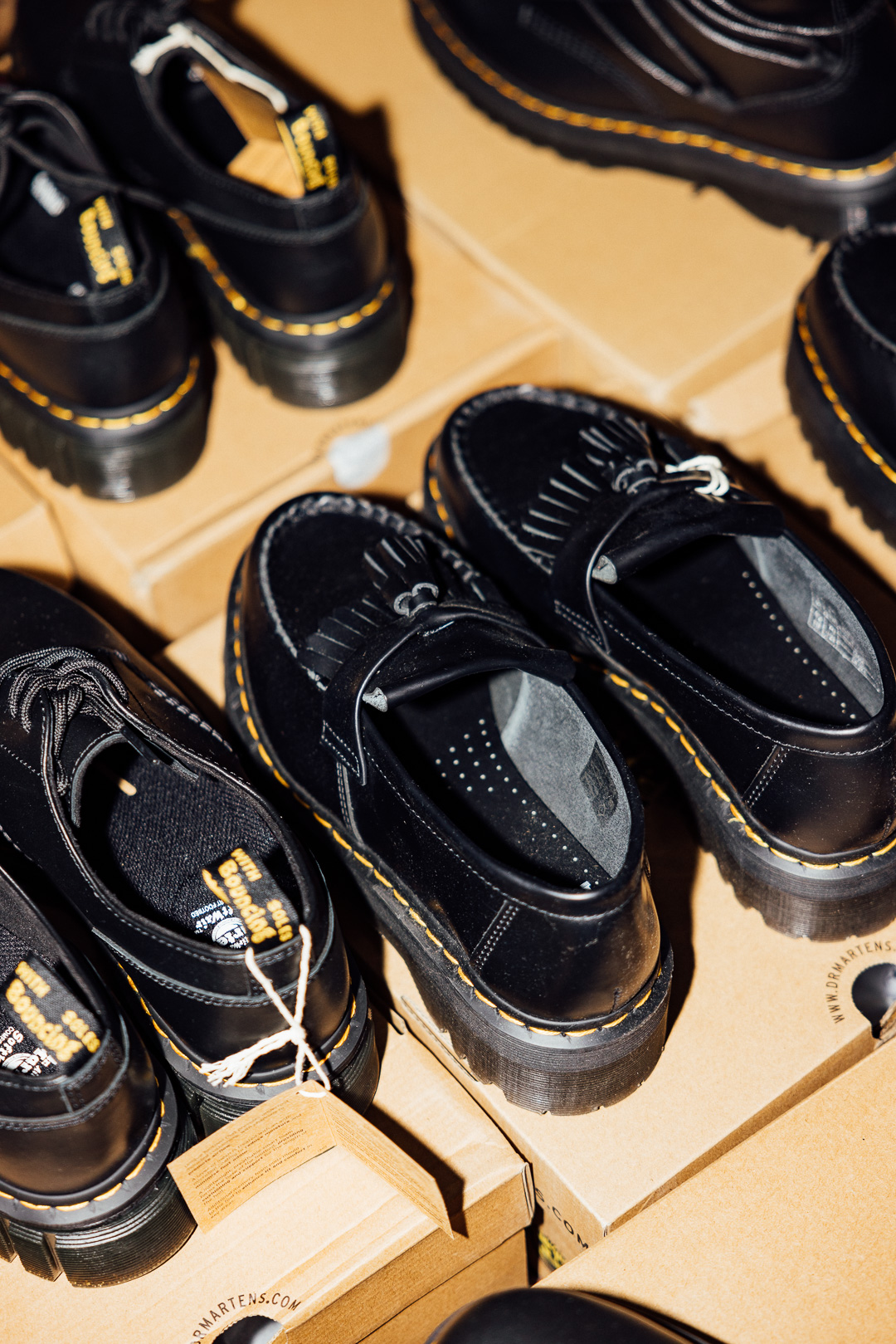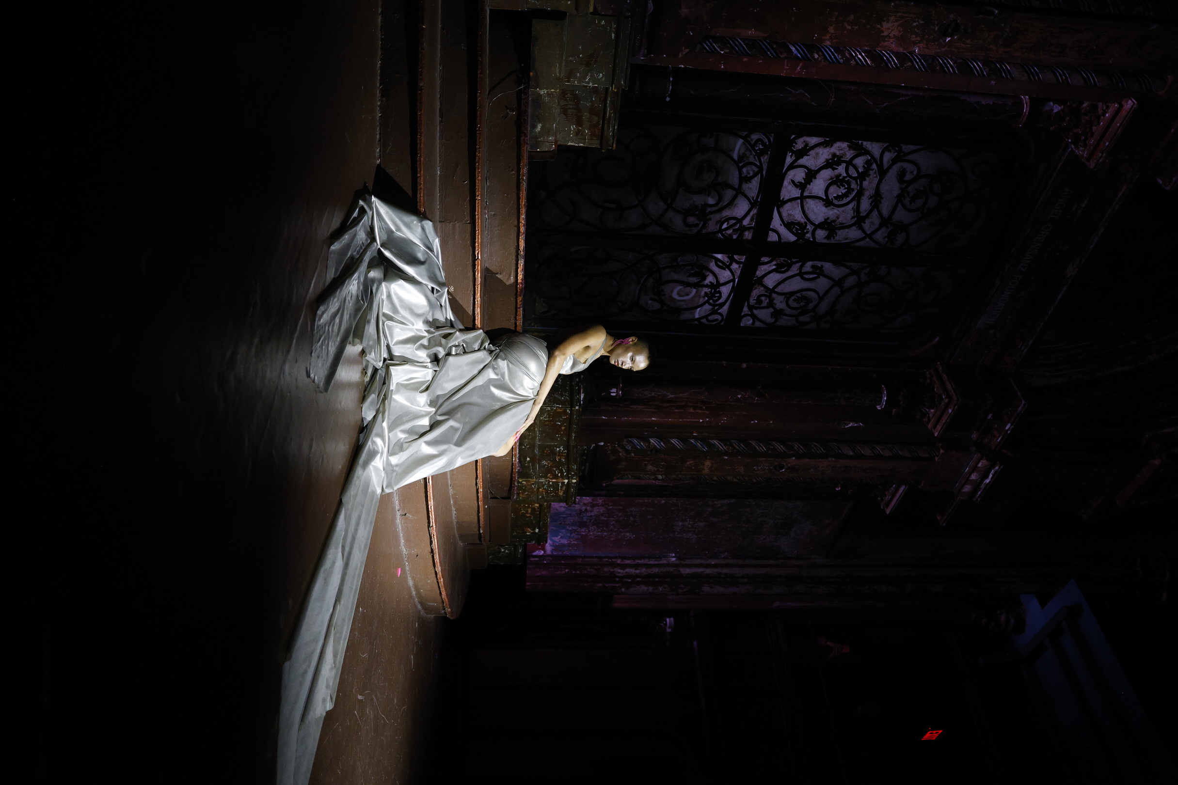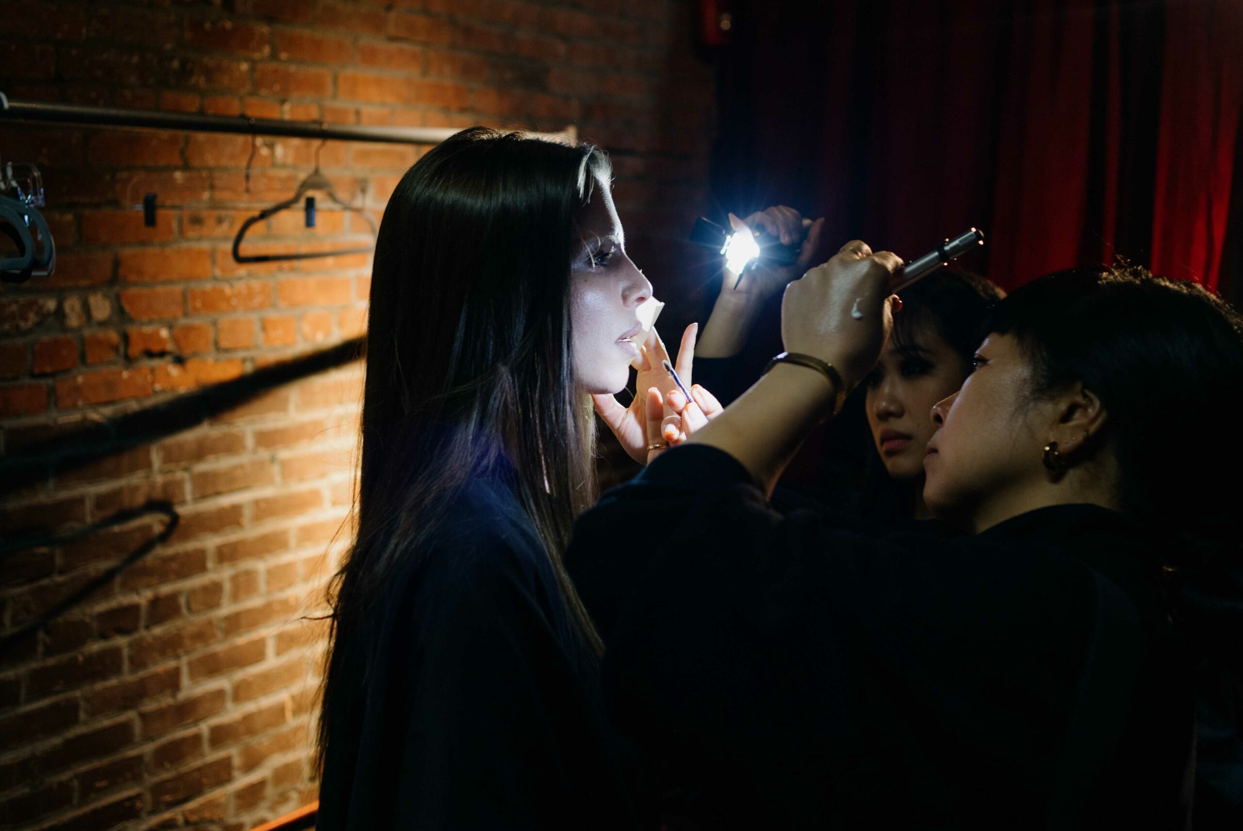 Le latex et le cuir sont présents tout au long de la collection avec des épaules pointues, de la corseterie et des traînes, avec de nombreux ourlets exagérés, dans une palette de couleurs de prune, d’argent métallique, de rouge sang et de noir profond. Le cuir gris dramatique et en détresse est imprimé sur du cuir végétal, en collaboration avec Kornit.