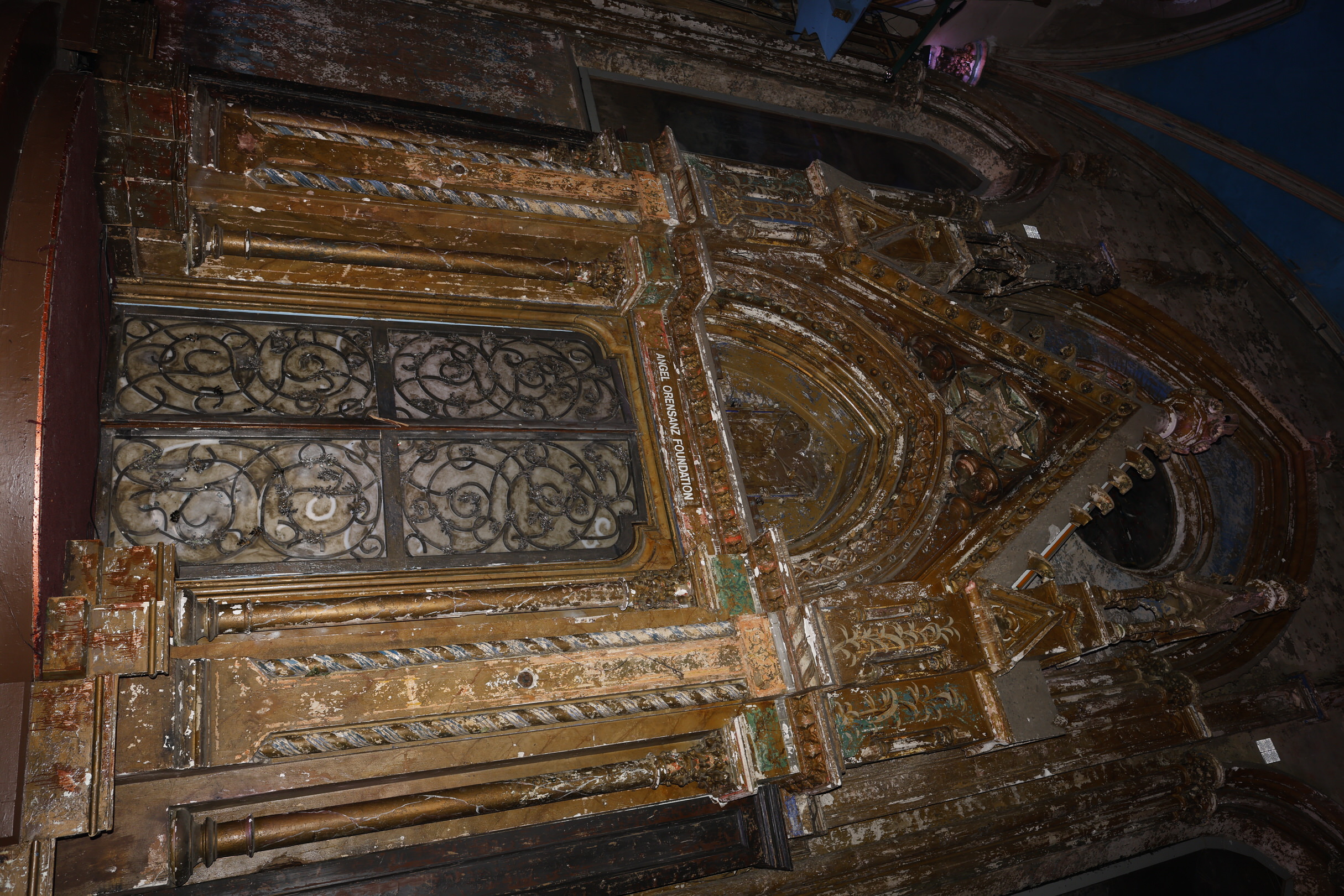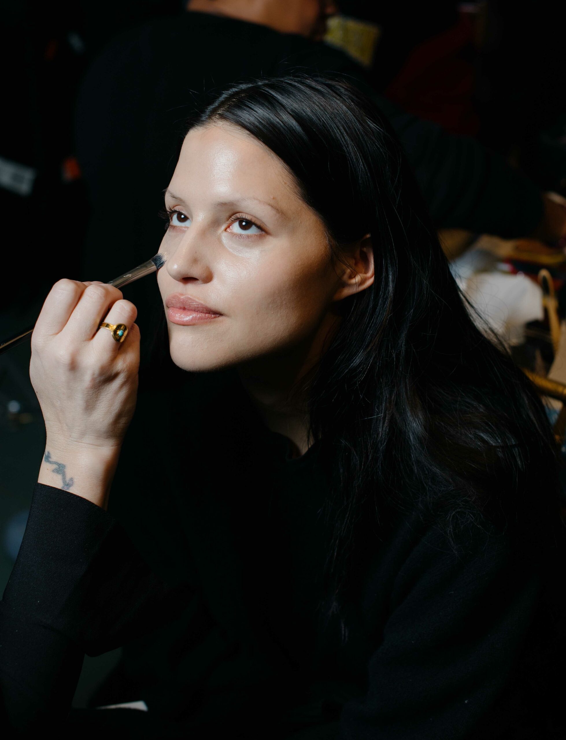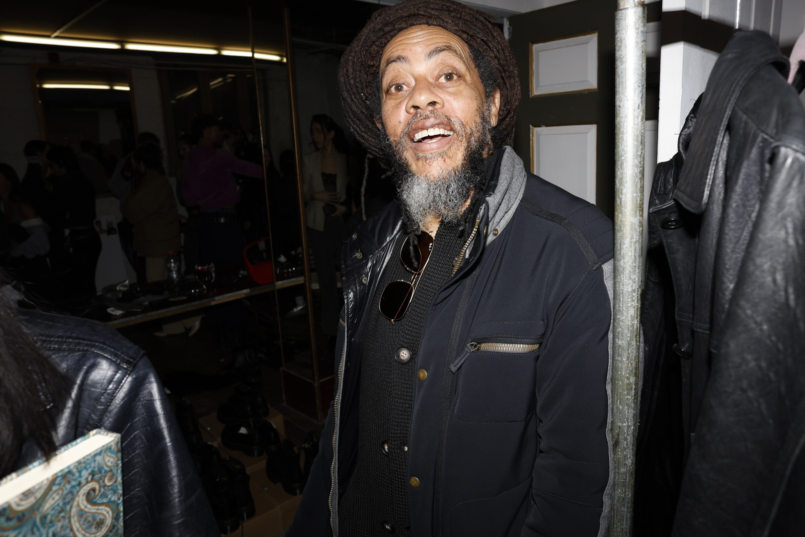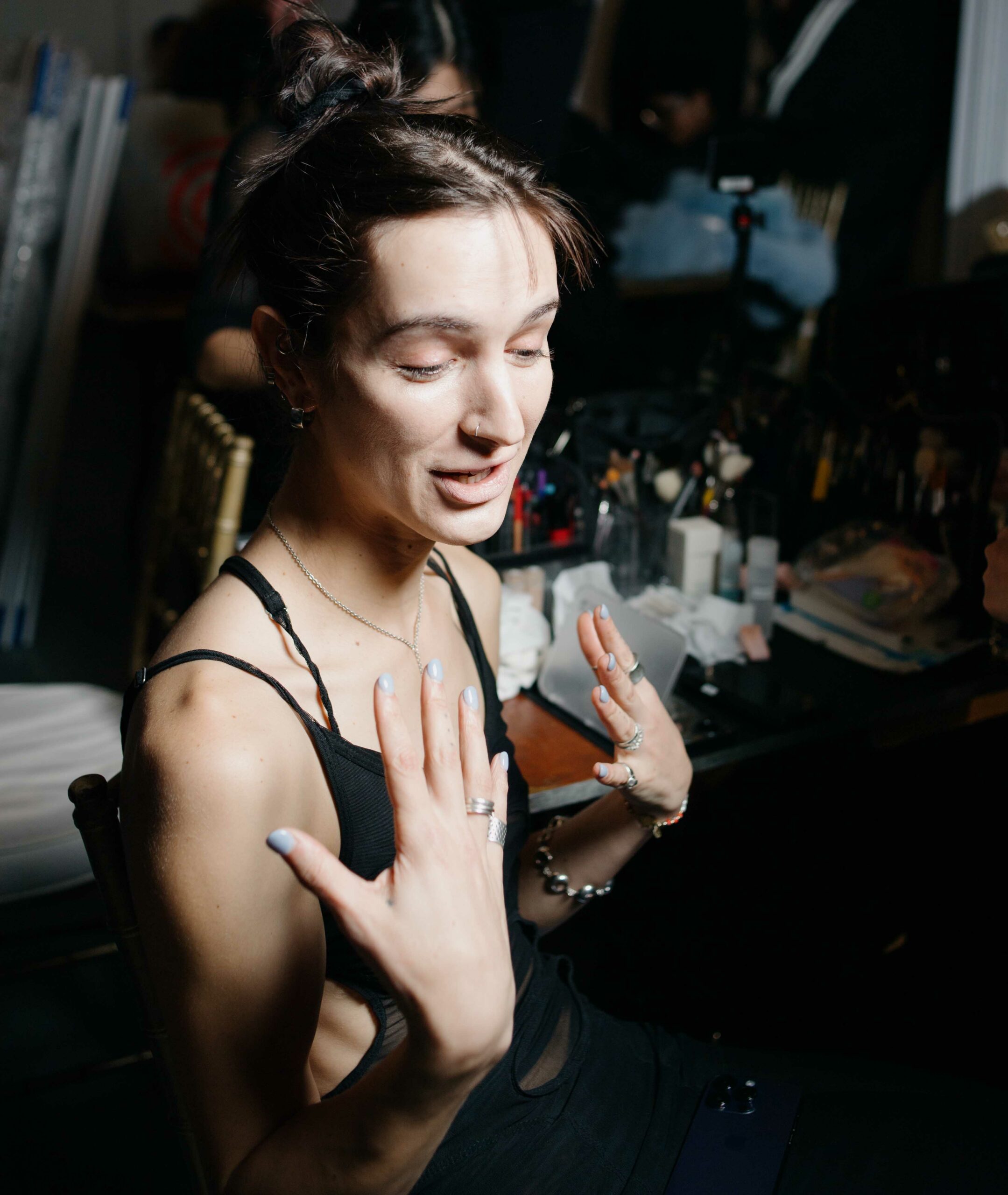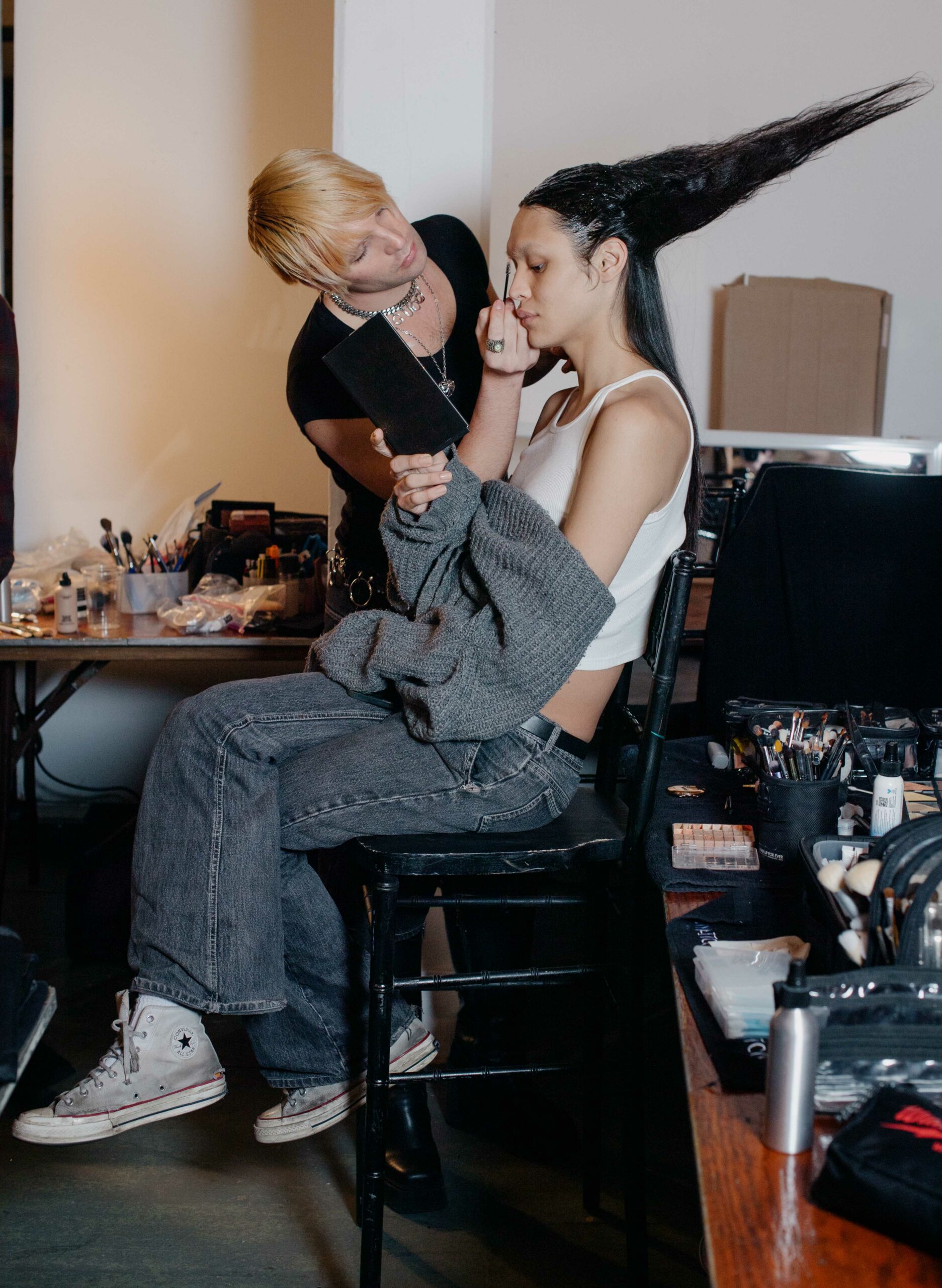 Le latex et le cuir sont présents tout au long de la collection avec des épaules pointues, de la corseterie et des traînes, avec de nombreux ourlets exagérés, dans une palette de couleurs de prune, d’argent métallique, de rouge sang et de noir profond. Le cuir gris dramatique et en détresse est imprimé sur du cuir végétal, en collaboration avec Kornit.