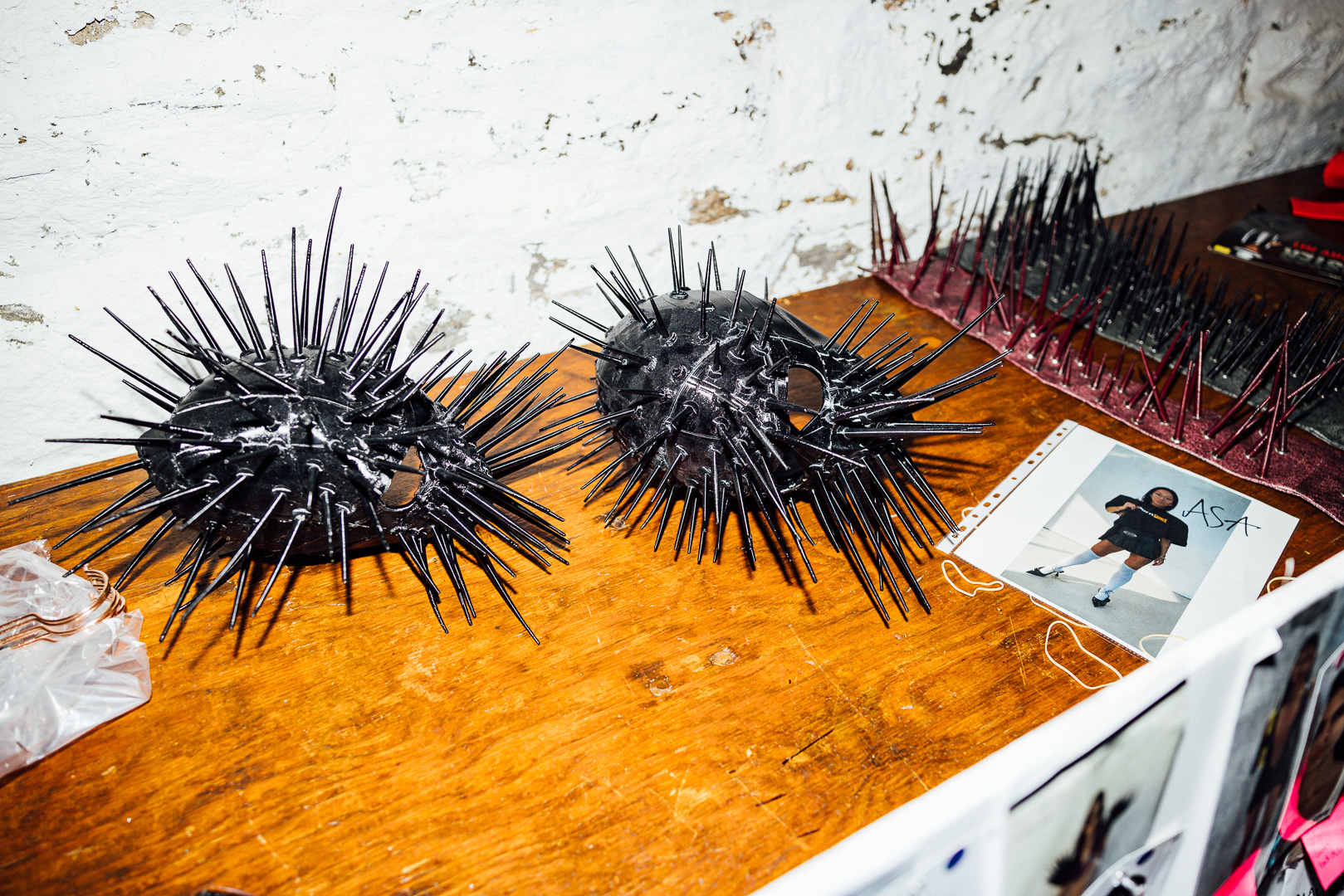 Ensuite, les accessoires de masques à pointes et de couvre-chefs entièrement embellis donnent un ton guerrier futuriste avec des chaînes superposées et des lunettes caractéristiques.