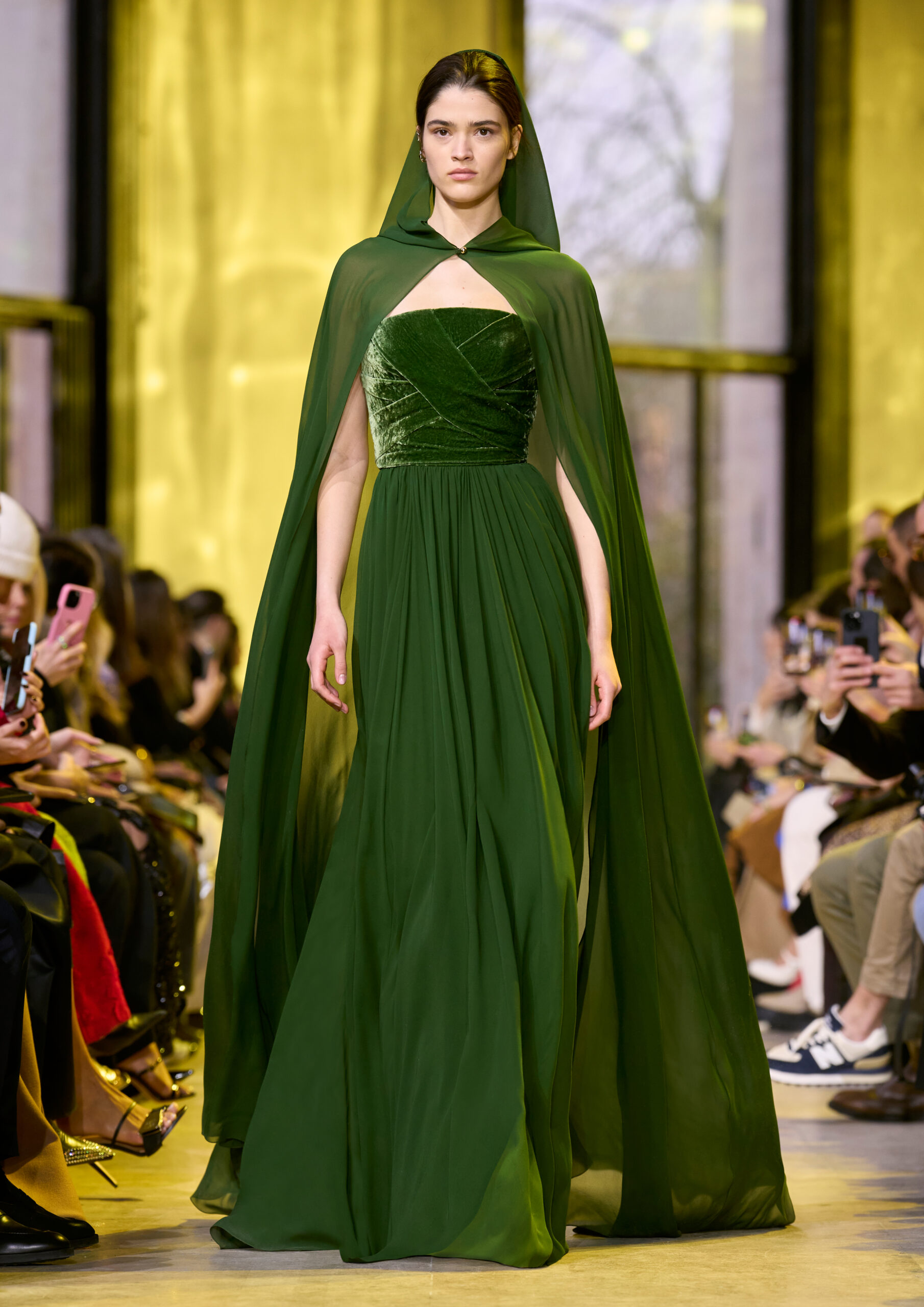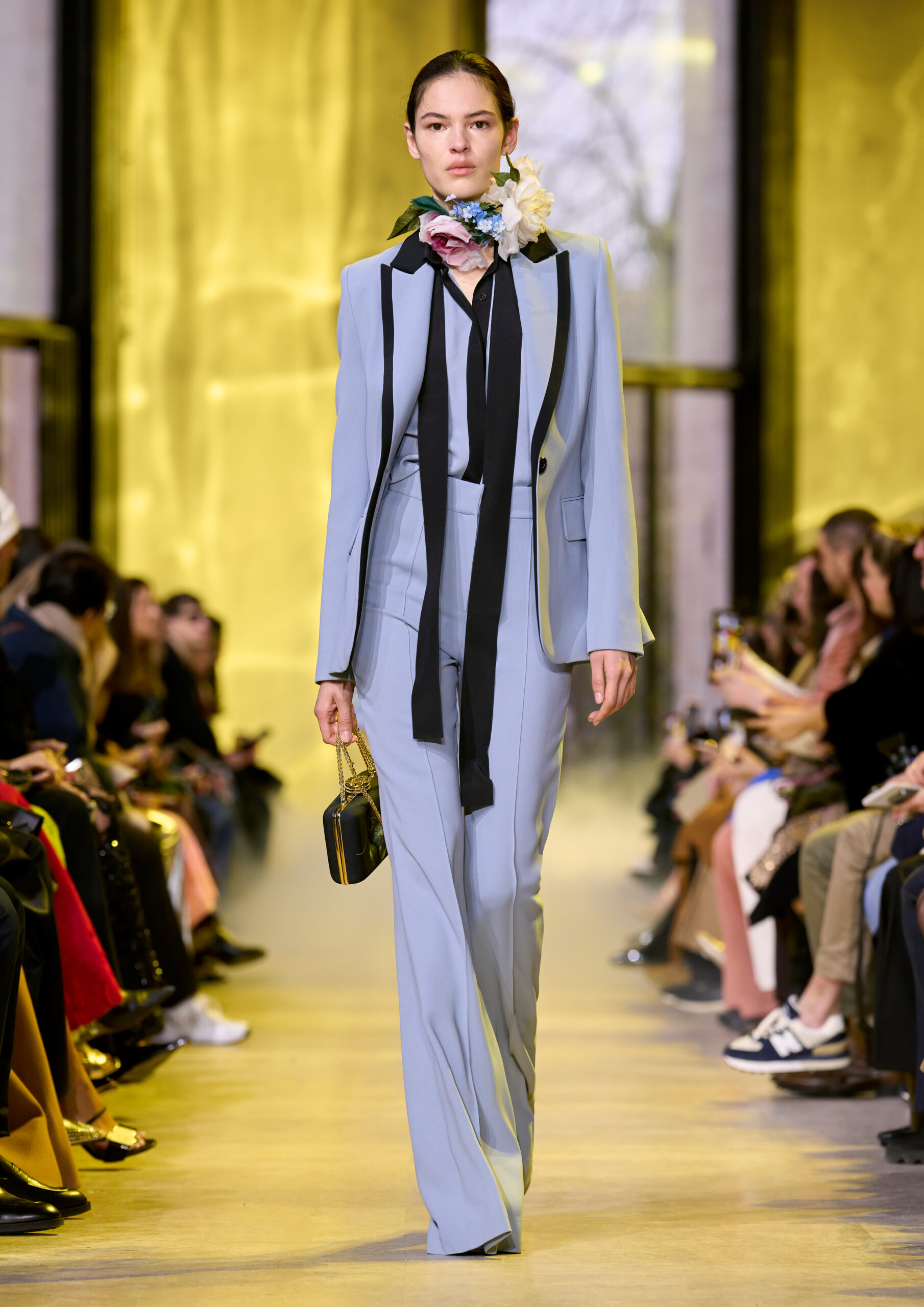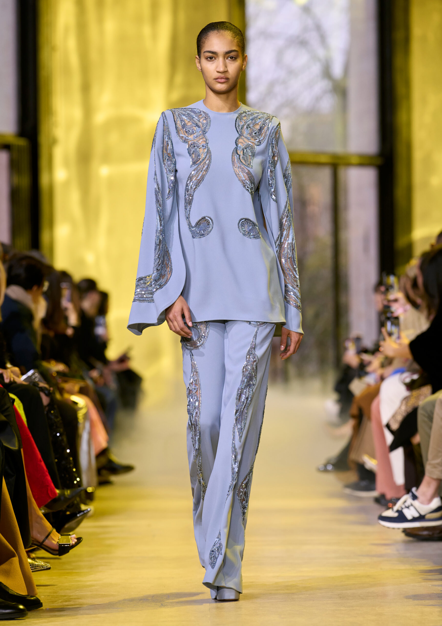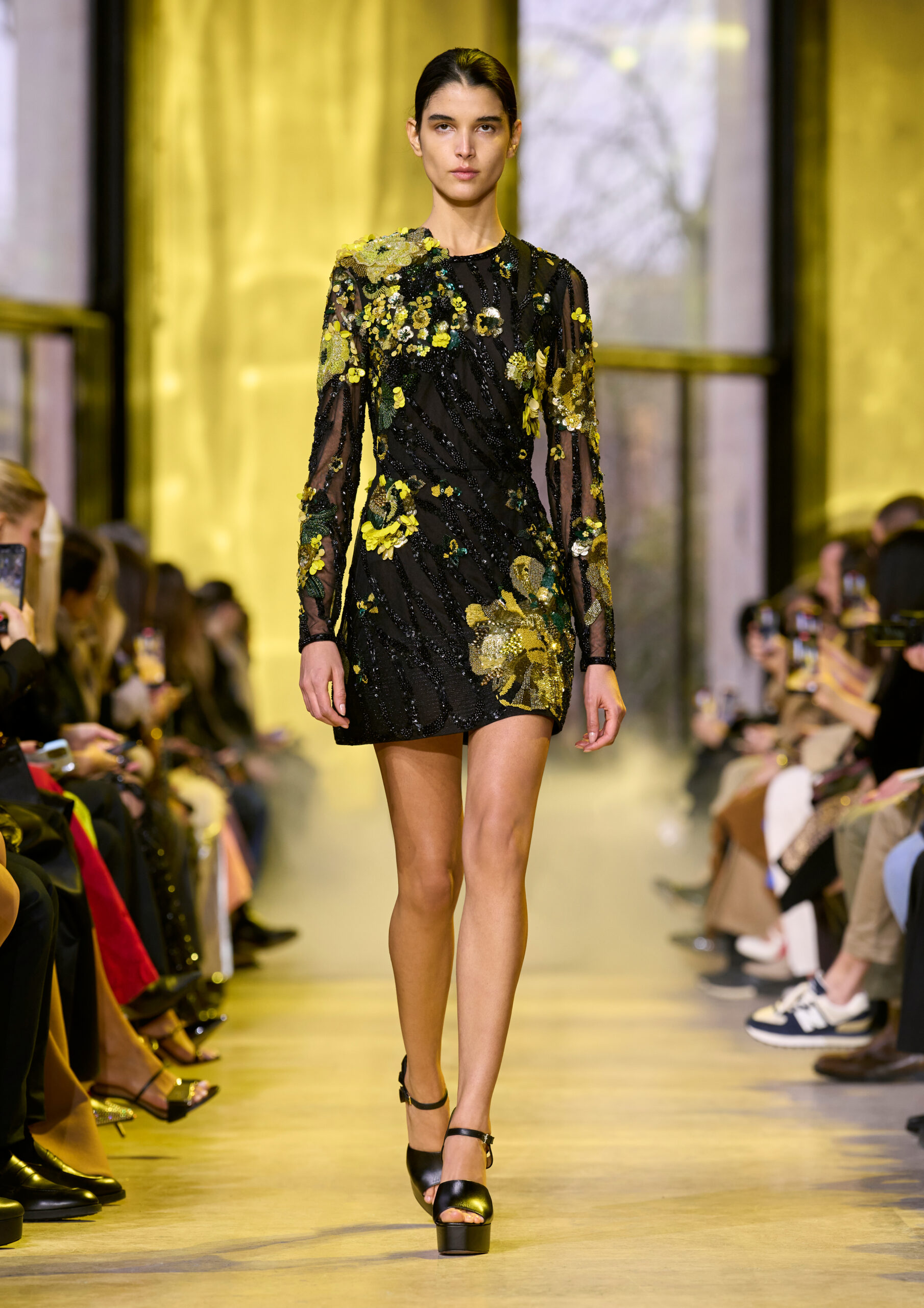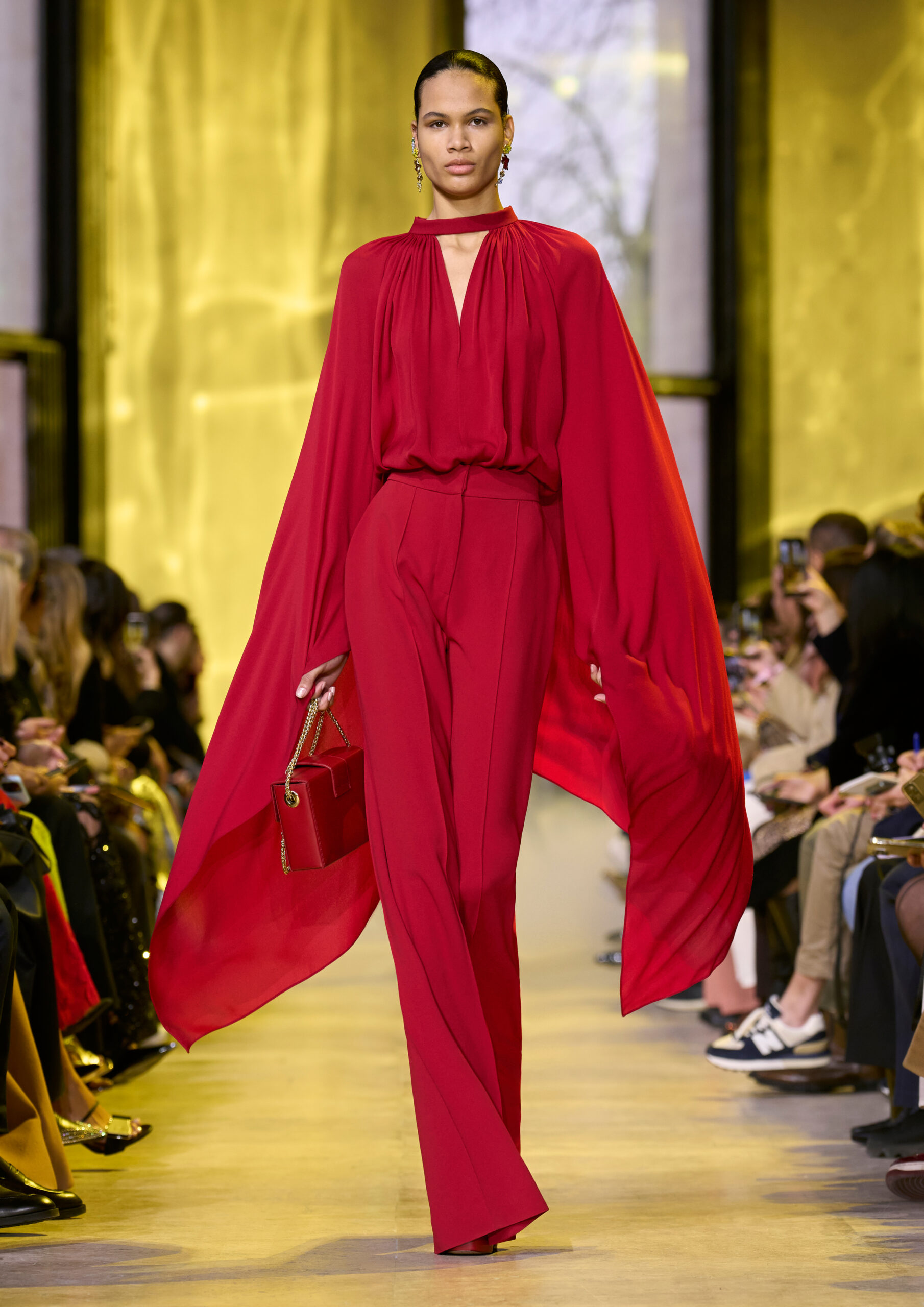 Les tenues portent la femme ELIE SAAB du jour à la nuit, où elle illumine les heures sombres. Des fleurs 3D complexes émergent de sequins étincelants et de tulle, se déplaçant sur les décolletés halter et les robes sirène transparentes. Des illuminations et des broderies de perles élaborées donnent une subtile brillance de cristal aux robes à décolleté en V et aux robes bustiers en velours moelleux et en crêpe agile. Des capes en soie fine avec capuche ajoutent une légère couche de prestance et de grandeur. Des taffetas puissants de New Red et de Citrine drapent et s’étalent sur les tailles de robes de cocktail courtes et de combinaisons-pantalons, et dans des robes flottantes avec des lignes d’épaules élaborées. Des fedoras en feutre doux – méticuleusement créés avec le maître chapelier italien, Borsalino – rehaussent délicatement les embellissements naissants sur les courts manteaux en laine. Des sacs à chaîne en cuir superposé et des talons hauts ELIE SAAB monogrammés en cristaux et en plexi ajoutent une touche finale de splendeur.