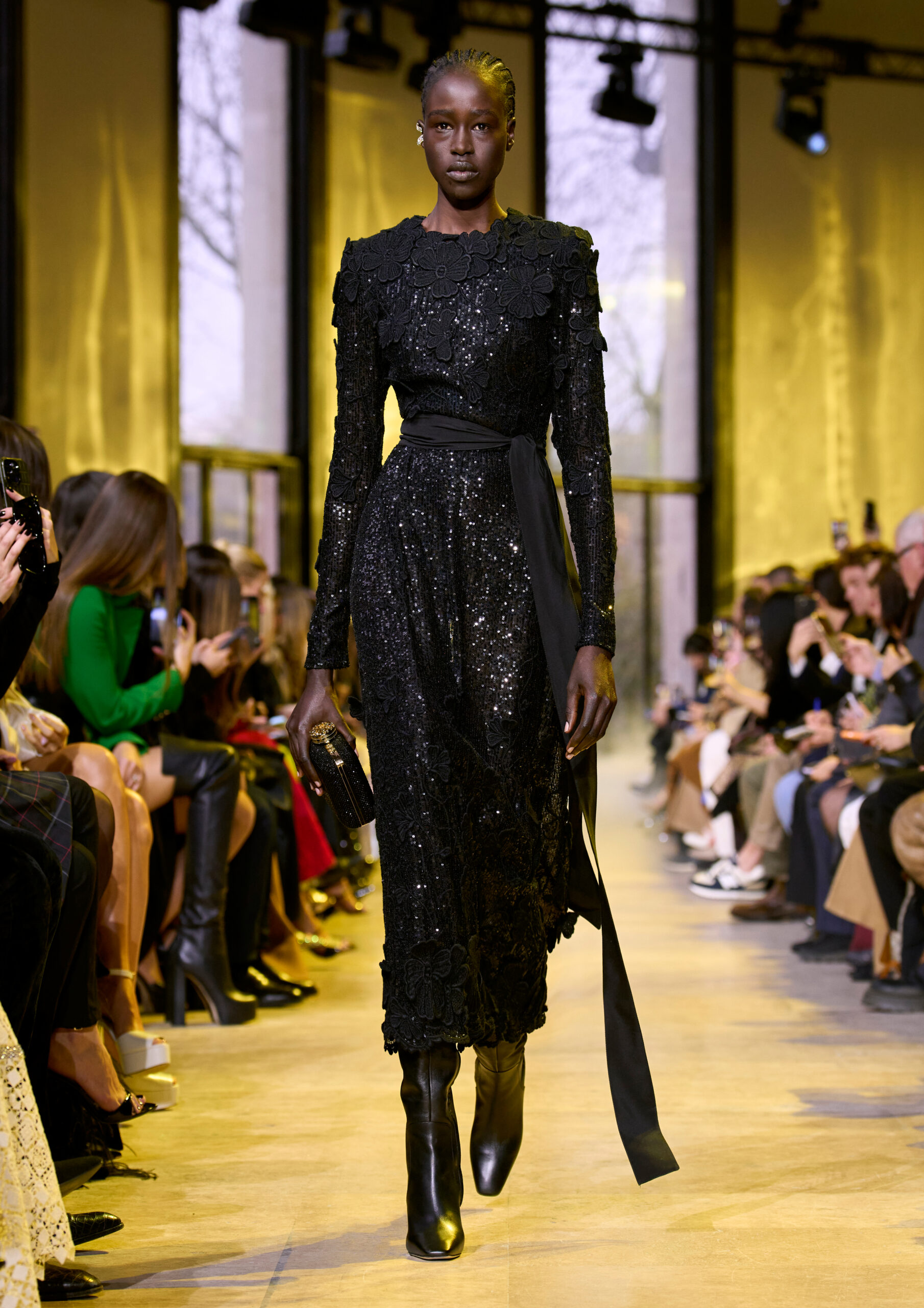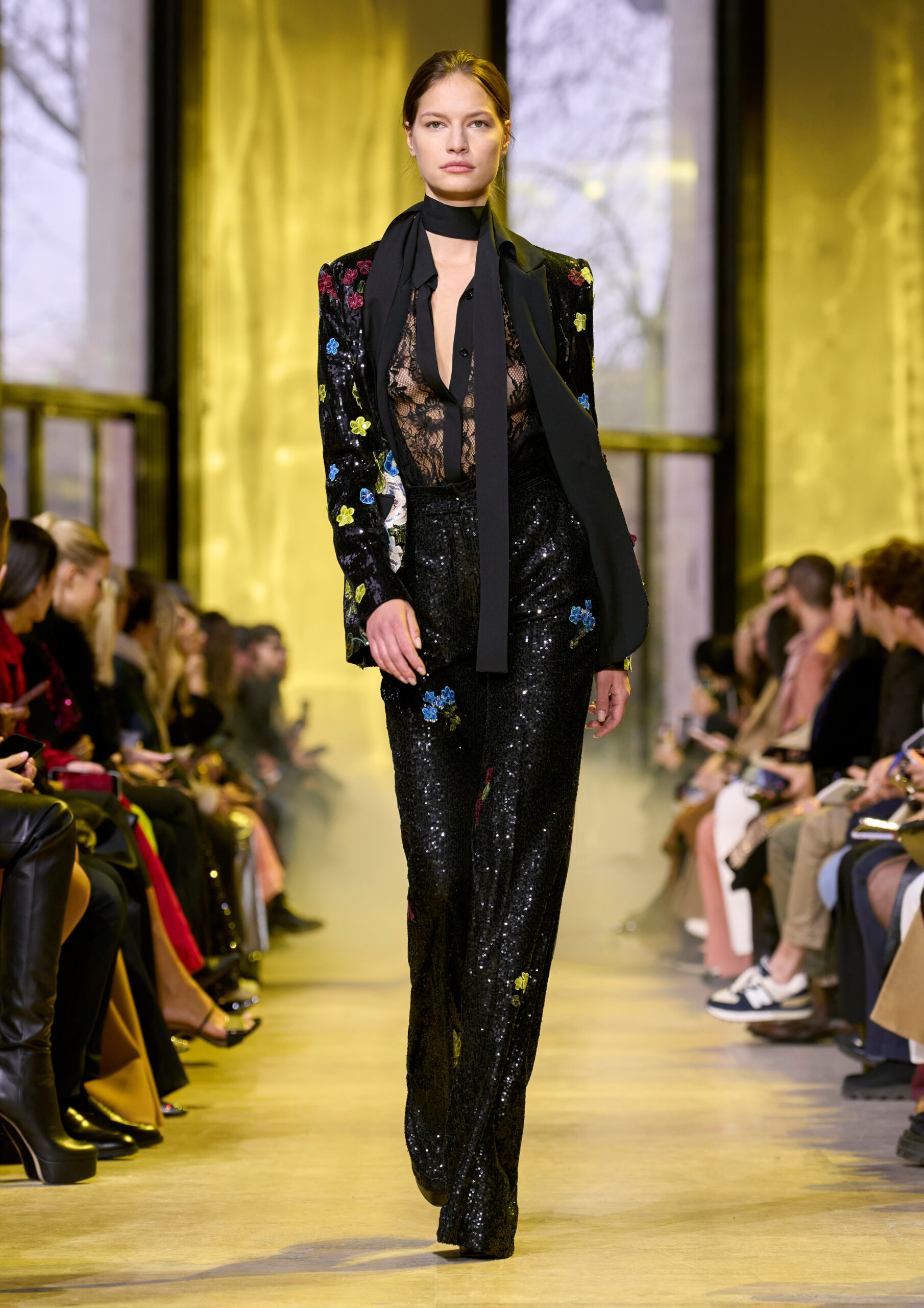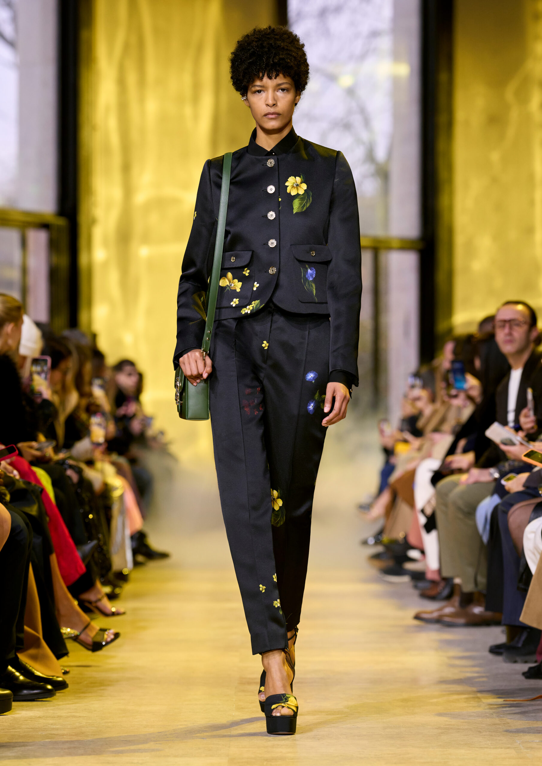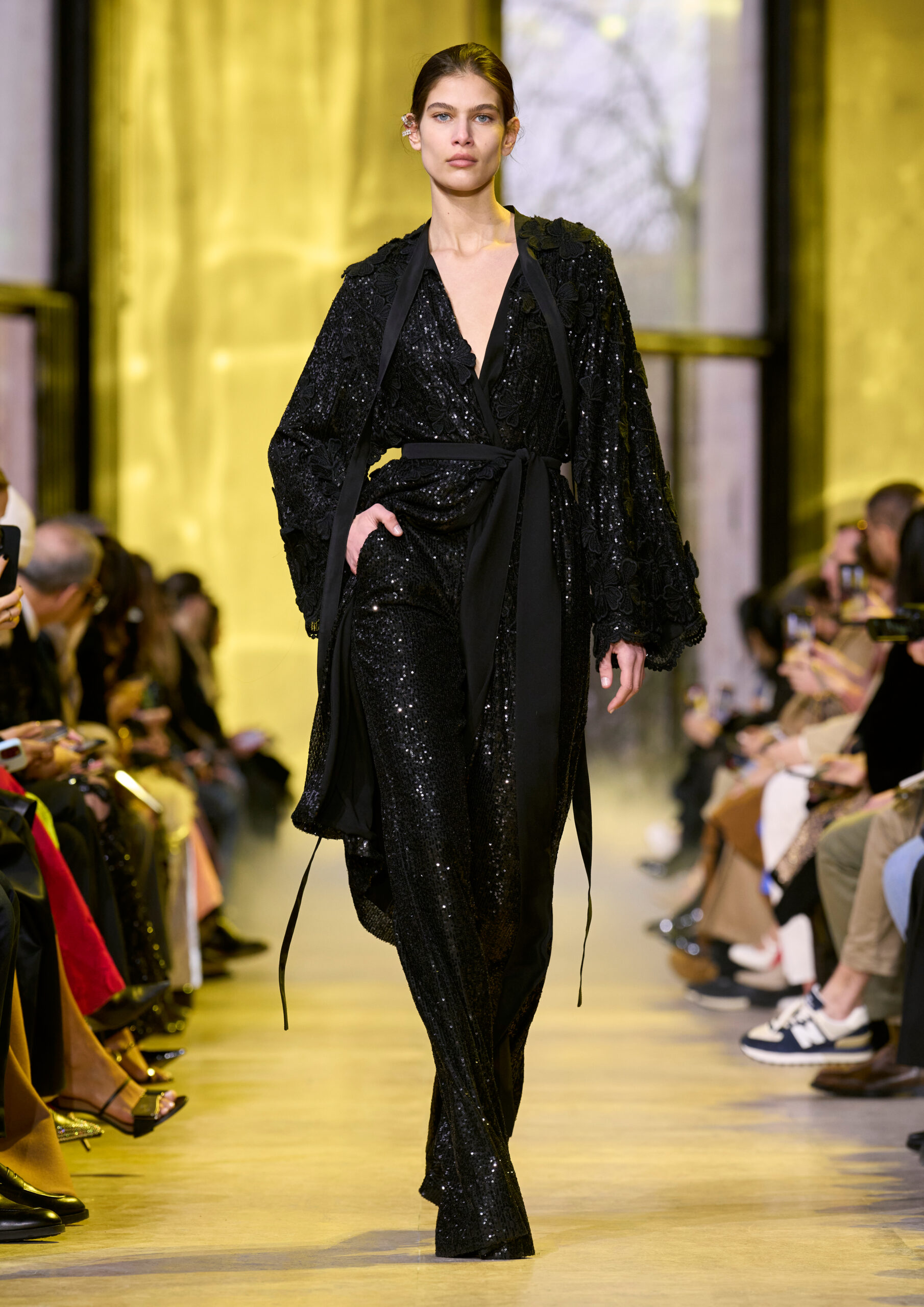Les tenues portent la femme ELIE SAAB du jour à la nuit, où elle illumine les heures sombres. Des fleurs 3D complexes émergent de sequins étincelants et de tulle, se déplaçant sur les décolletés halter et les robes sirène transparentes. Des illuminations et des broderies de perles élaborées donnent une subtile brillance de cristal aux robes à décolleté en V et aux robes bustiers en velours moelleux et en crêpe agile. Des capes en soie fine avec capuche ajoutent une légère couche de prestance et de grandeur. Des taffetas puissants de New Red et de Citrine drapent et s’étalent sur les tailles de robes de cocktail courtes et de combinaisons-pantalons, et dans des robes flottantes avec des lignes d’épaules élaborées. Des fedoras en feutre doux – méticuleusement créés avec le maître chapelier italien, Borsalino – rehaussent délicatement les embellissements naissants sur les courts manteaux en laine. Des sacs à chaîne en cuir superposé et des talons hauts ELIE SAAB monogrammés en cristaux et en plexi ajoutent une touche finale de splendeur.