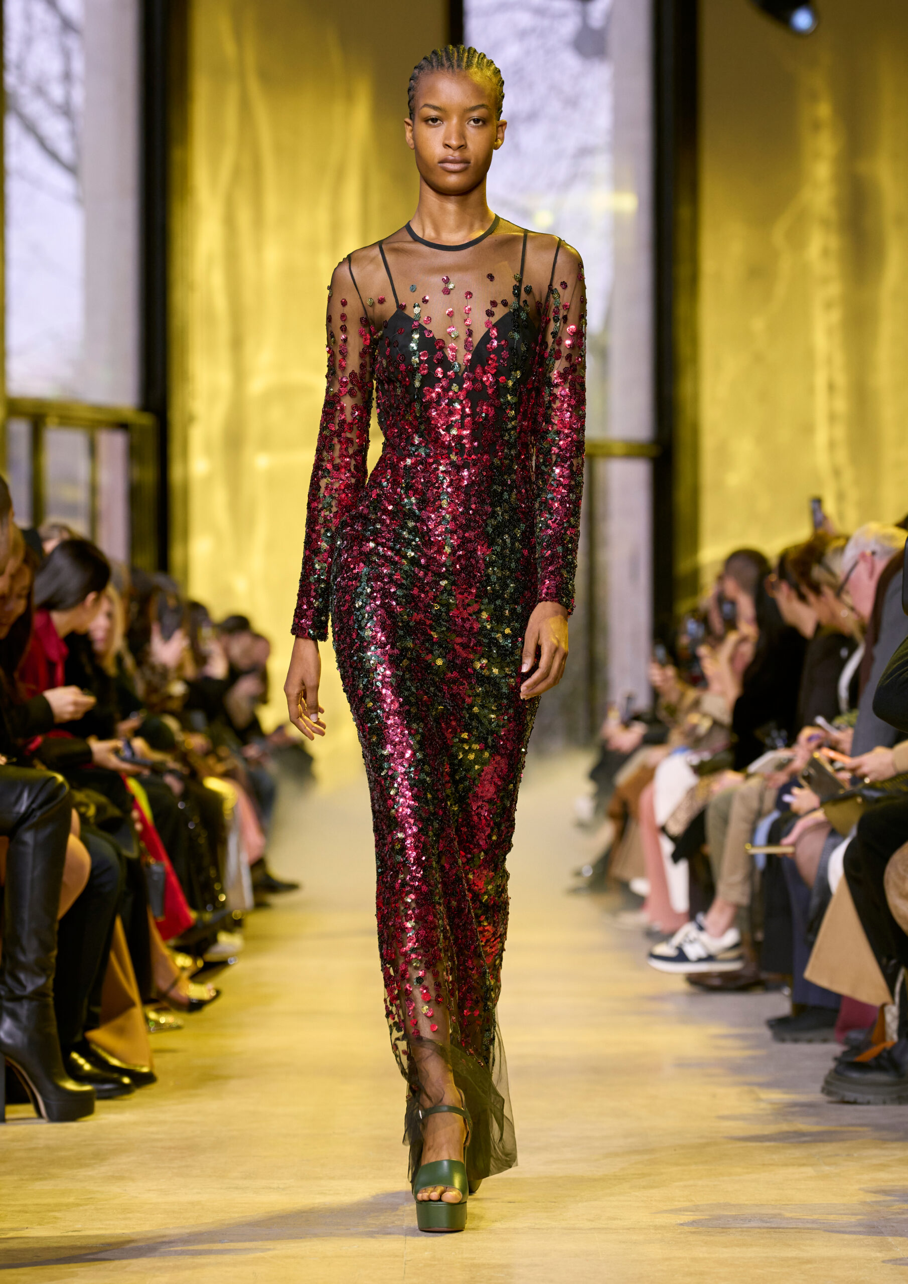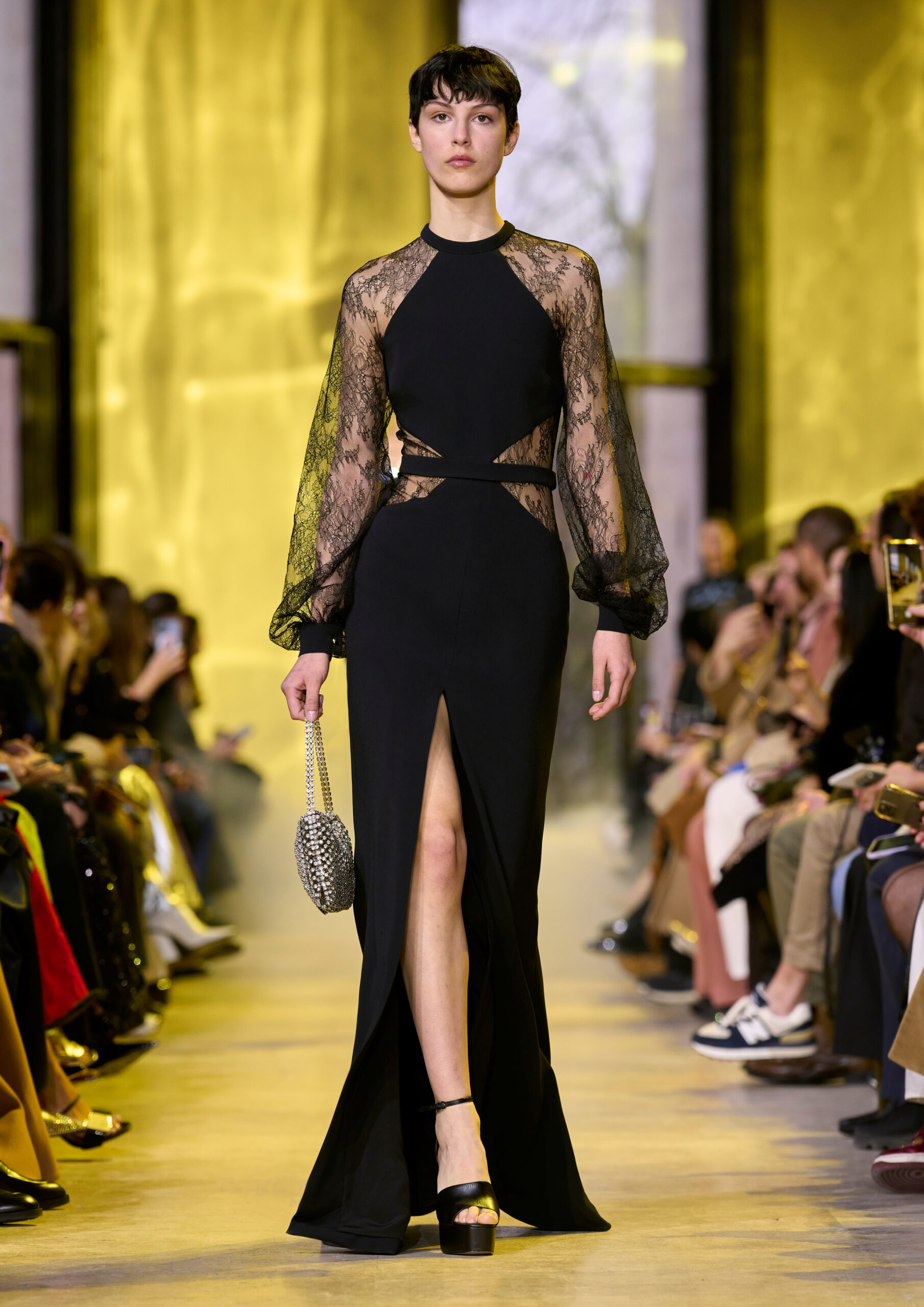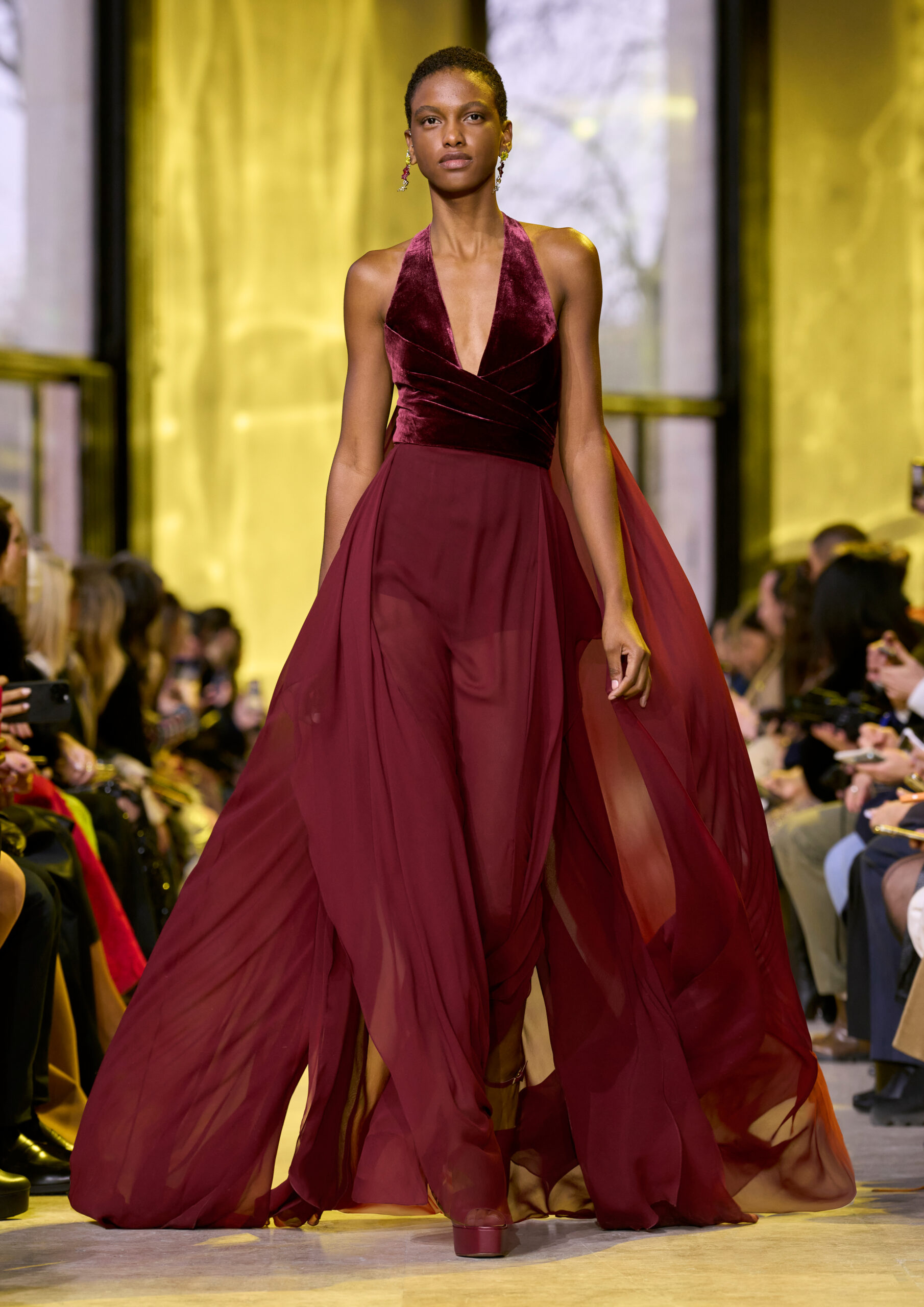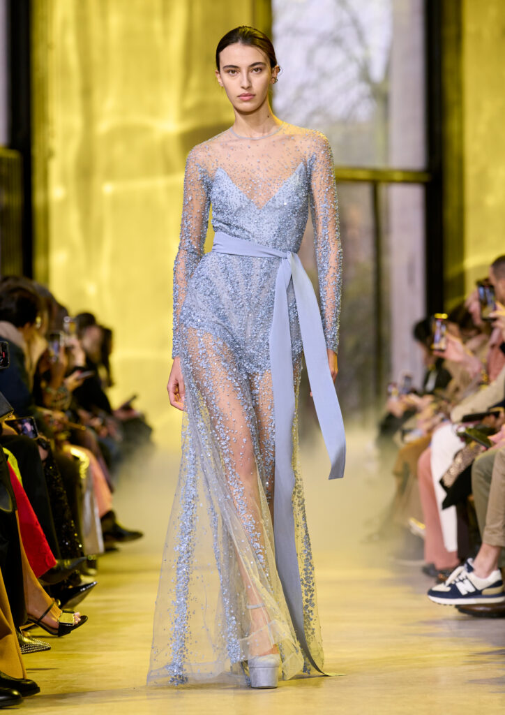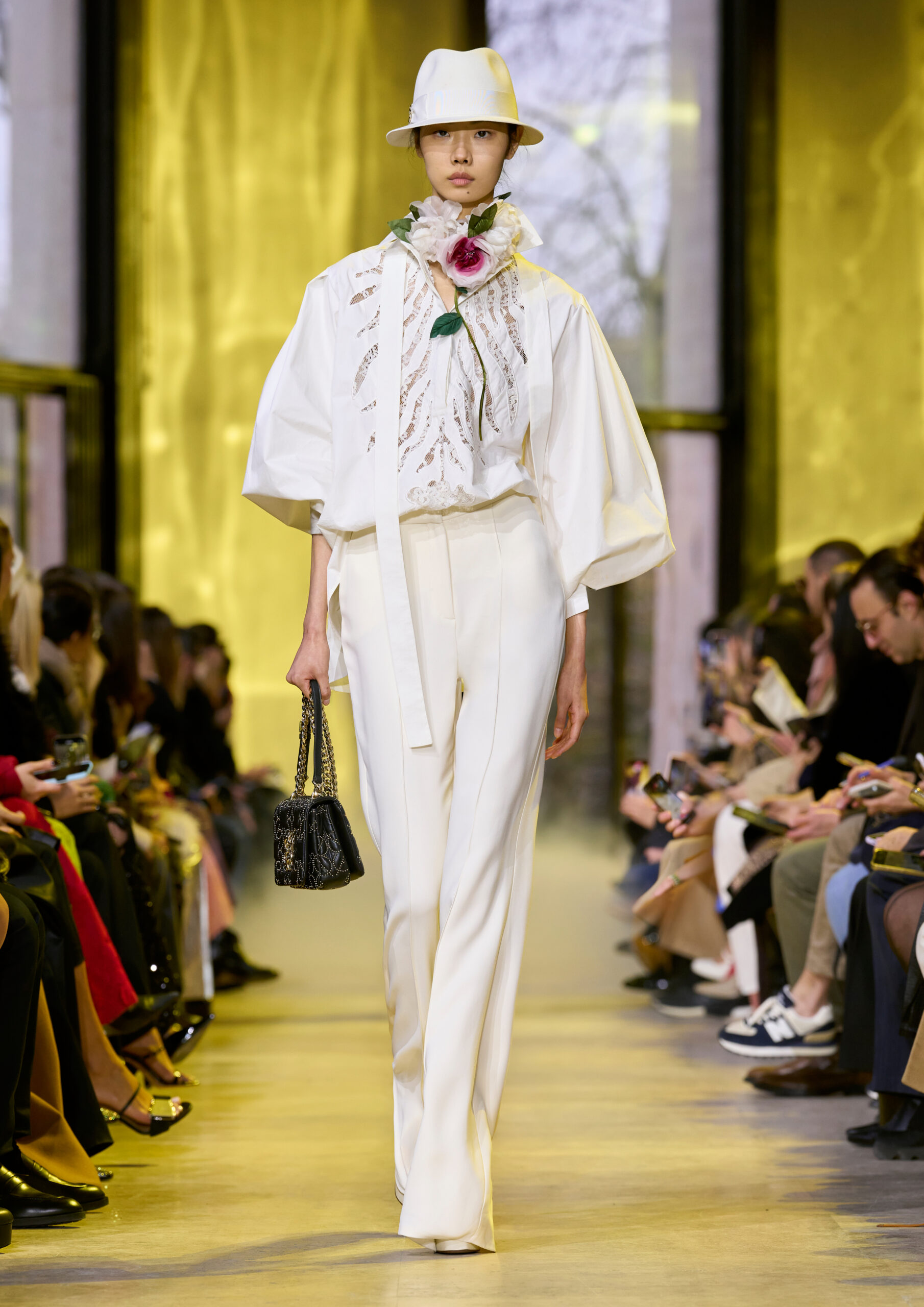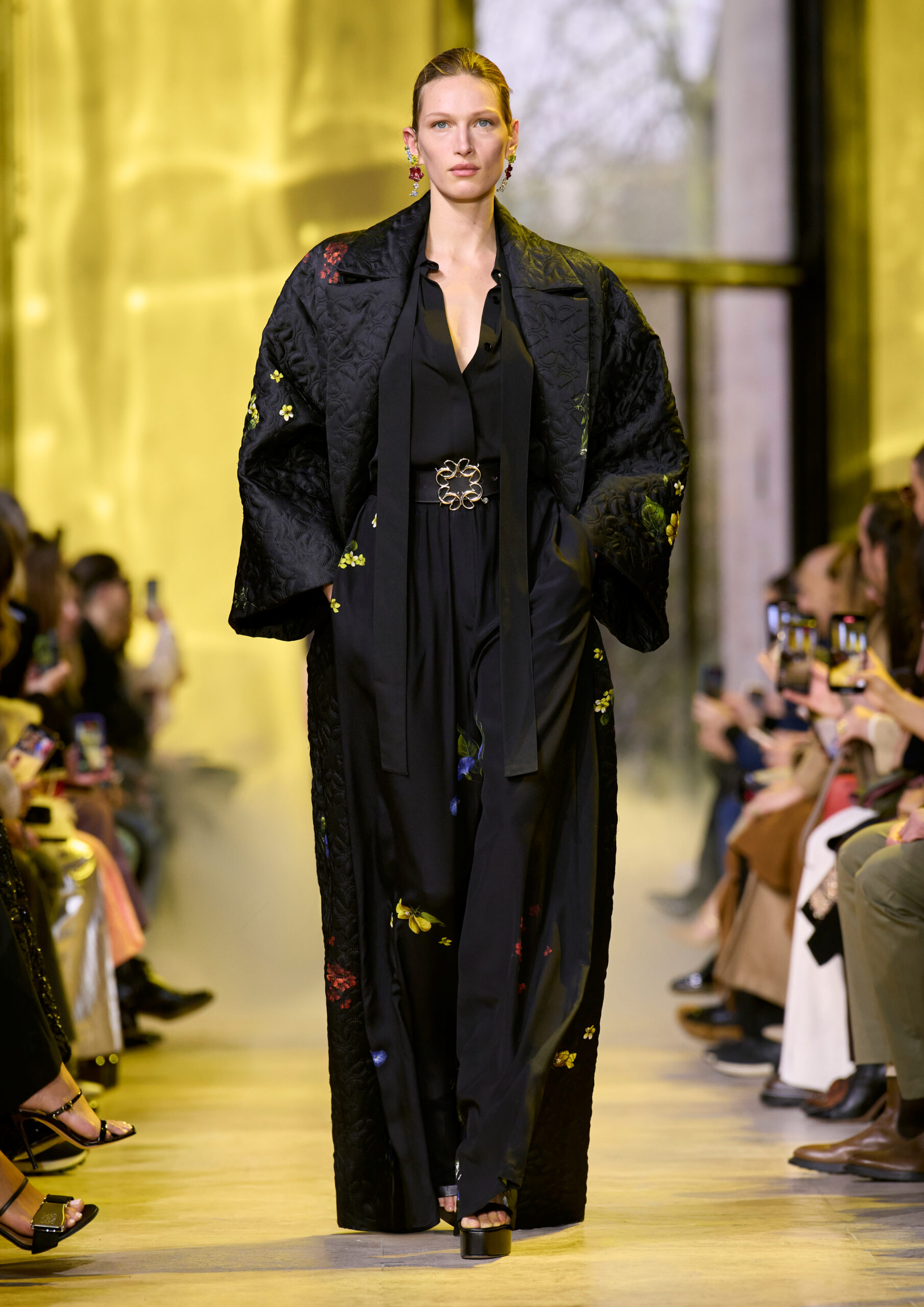 Les tenues portent la femme ELIE SAAB du jour à la nuit, où elle illumine les heures sombres. Des fleurs 3D complexes émergent de sequins étincelants et de tulle, se déplaçant sur les décolletés halter et les robes sirène transparentes. Des illuminations et des broderies de perles élaborées donnent une subtile brillance de cristal aux robes à décolleté en V et aux robes bustiers en velours moelleux et en crêpe agile. Des capes en soie fine avec capuche ajoutent une légère couche de prestance et de grandeur. Des taffetas puissants de New Red et de Citrine drapent et s’étalent sur les tailles de robes de cocktail courtes et de combinaisons-pantalons, et dans des robes flottantes avec des lignes d’épaules élaborées. Des fedoras en feutre doux – méticuleusement créés avec le maître chapelier italien, Borsalino – rehaussent délicatement les embellissements naissants sur les courts manteaux en laine. Des sacs à chaîne en cuir superposé et des talons hauts ELIE SAAB monogrammés en cristaux et en plexi ajoutent une touche finale de splendeur.