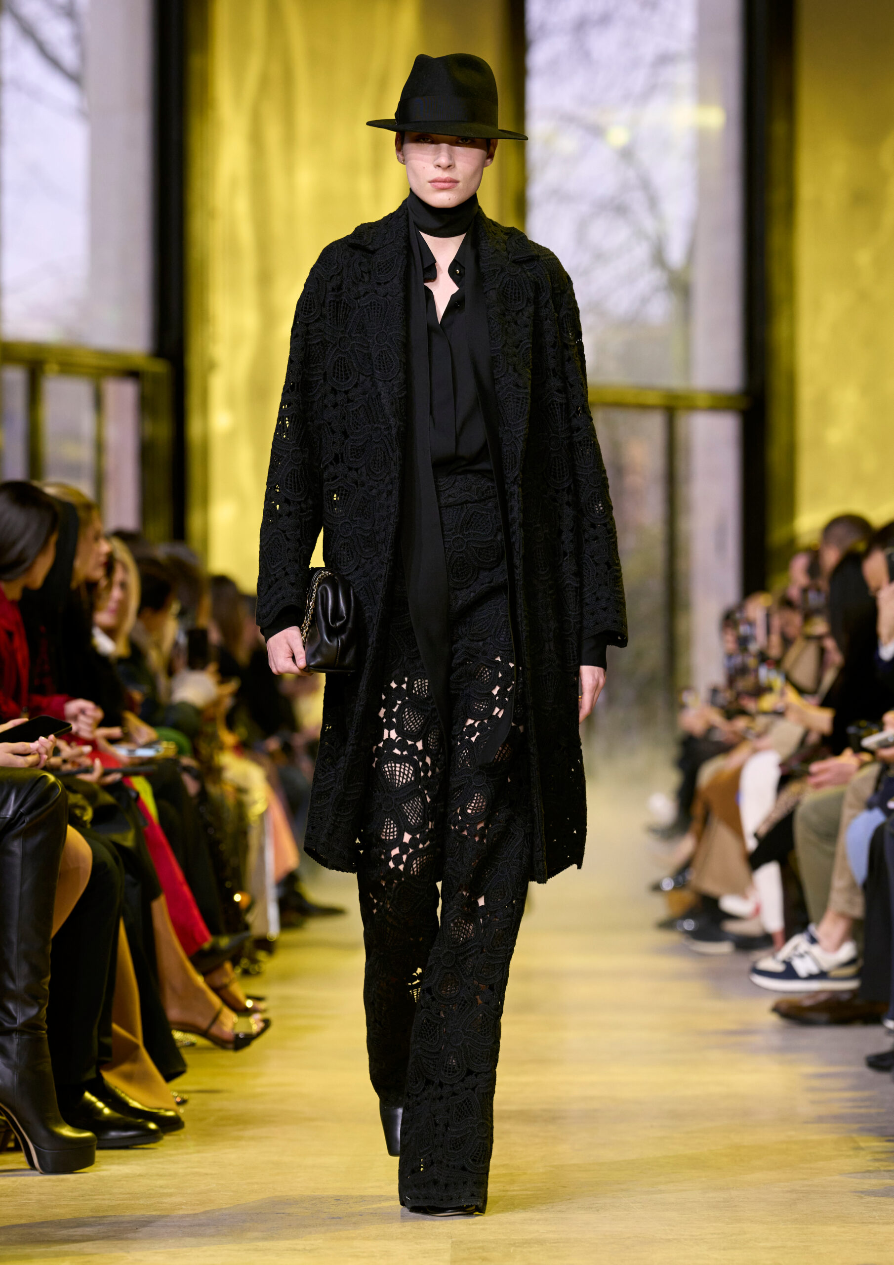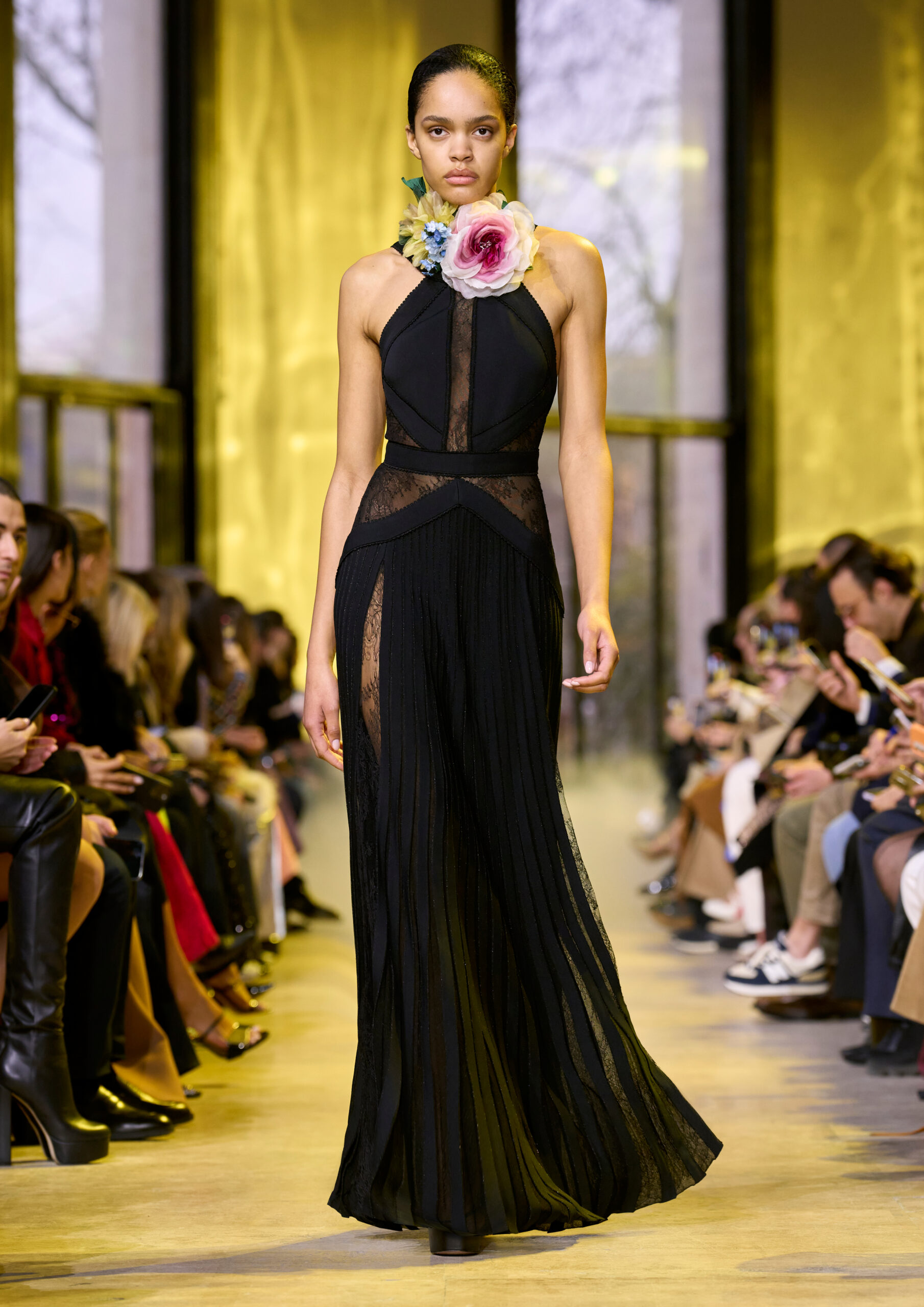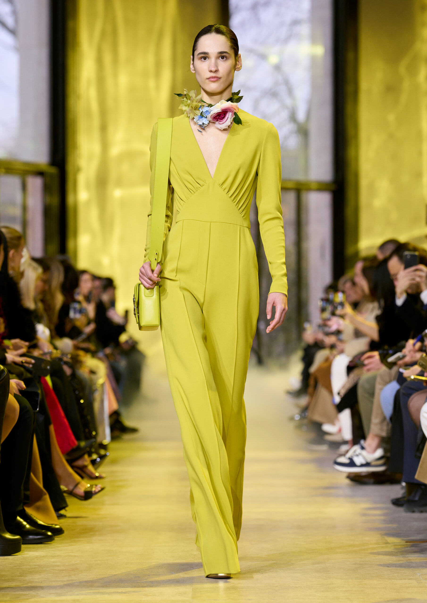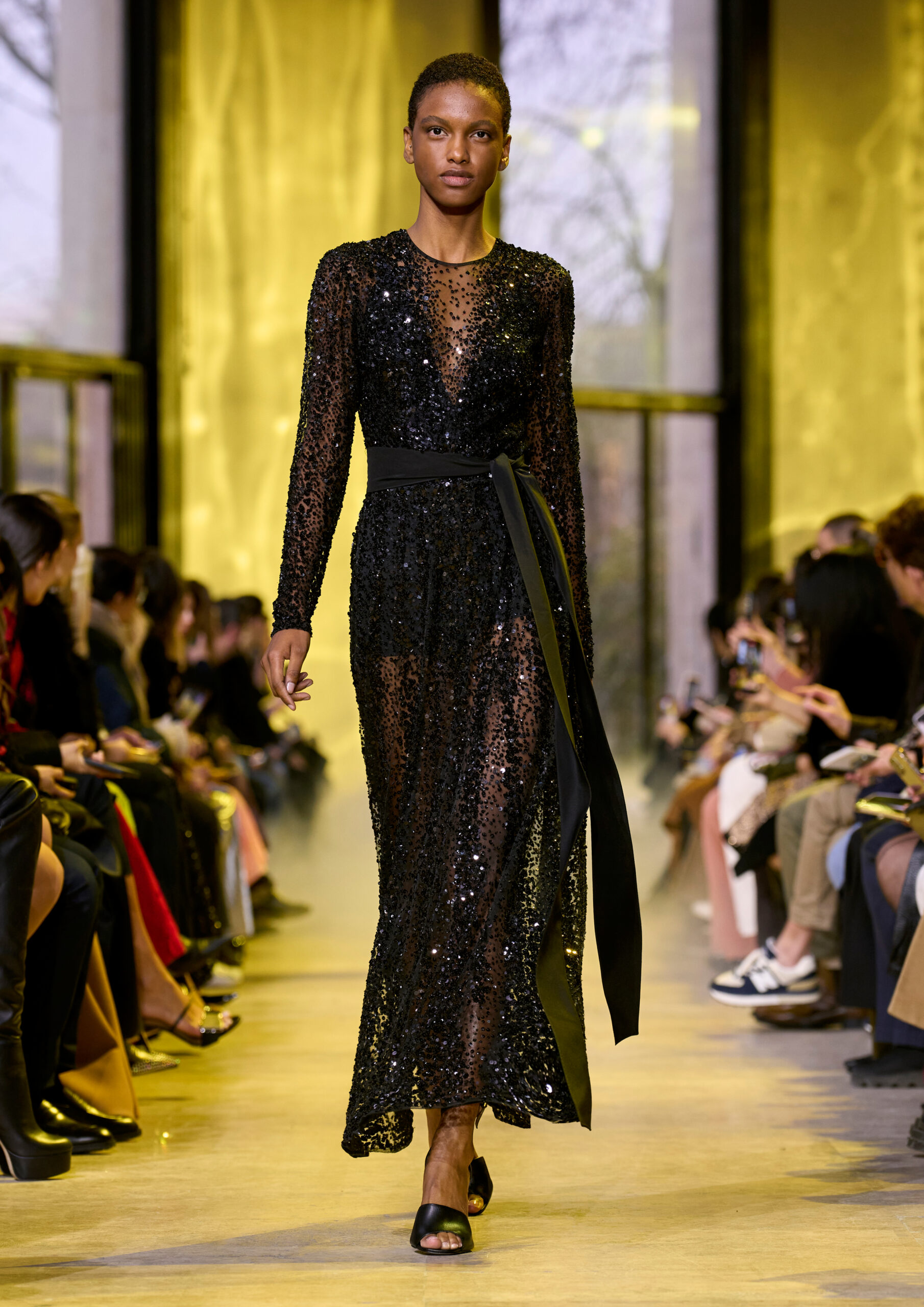 Les tenues portent la femme ELIE SAAB du jour à la nuit, où elle illumine les heures sombres. Des fleurs 3D complexes émergent de sequins étincelants et de tulle, se déplaçant sur les décolletés halter et les robes sirène transparentes. Des illuminations et des broderies de perles élaborées donnent une subtile brillance de cristal aux robes à décolleté en V et aux robes bustiers en velours moelleux et en crêpe agile. Des capes en soie fine avec capuche ajoutent une légère couche de prestance et de grandeur. Des taffetas puissants de New Red et de Citrine drapent et s’étalent sur les tailles de robes de cocktail courtes et de combinaisons-pantalons, et dans des robes flottantes avec des lignes d’épaules élaborées. Des fedoras en feutre doux – méticuleusement créés avec le maître chapelier italien, Borsalino – rehaussent délicatement les embellissements naissants sur les courts manteaux en laine. Des sacs à chaîne en cuir superposé et des talons hauts ELIE SAAB monogrammés en cristaux et en plexi ajoutent une touche finale de splendeur.
