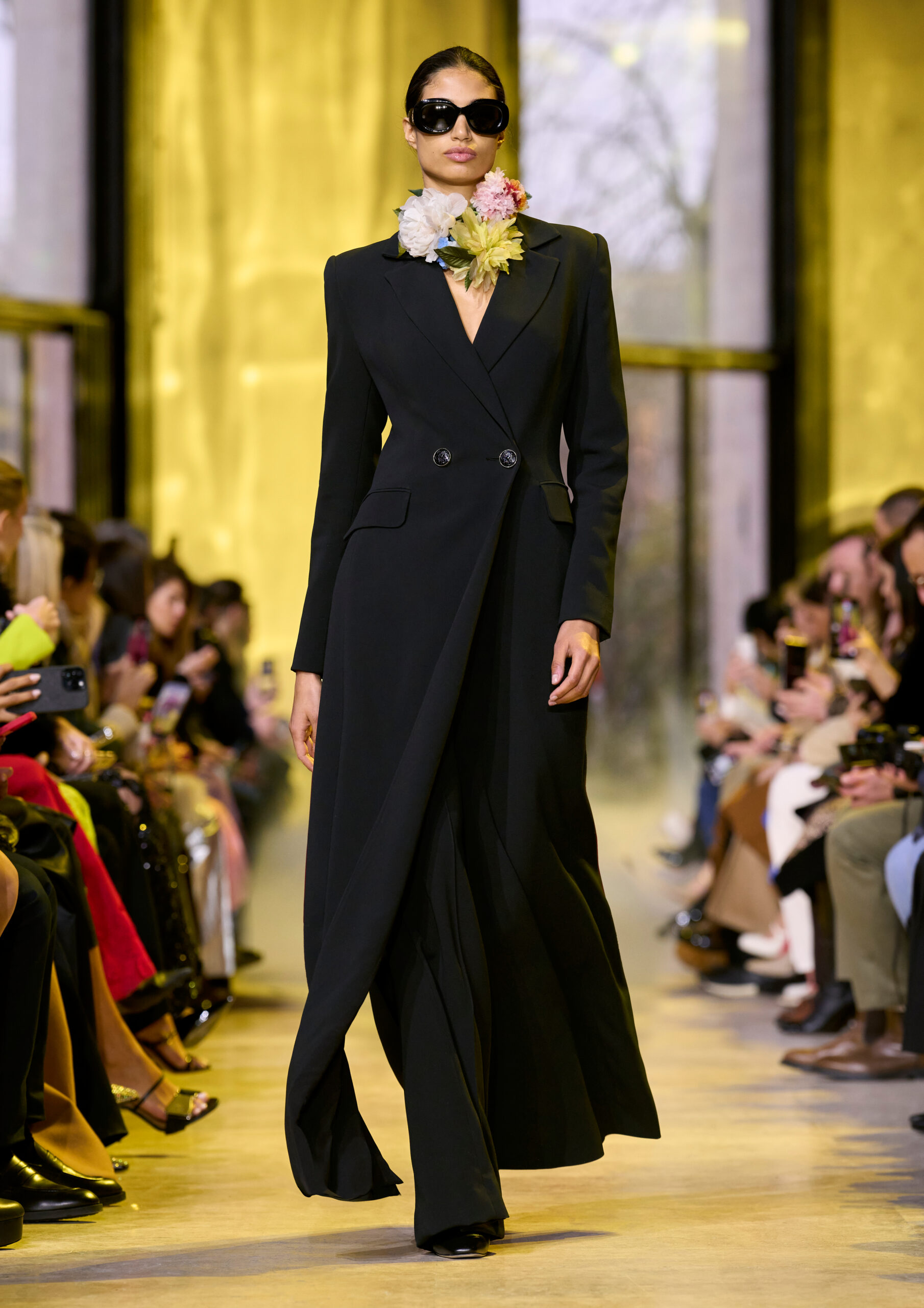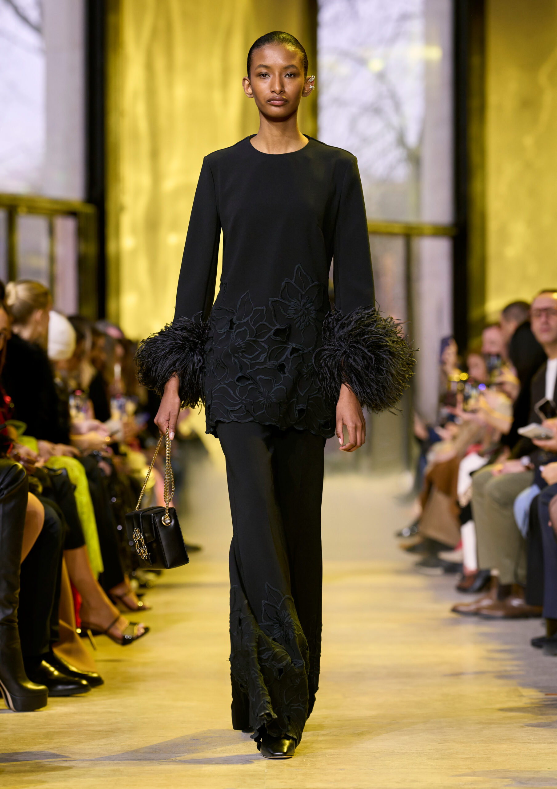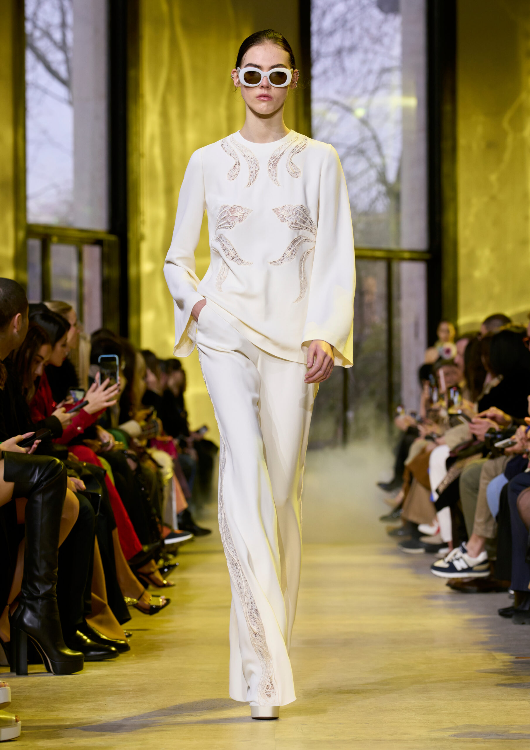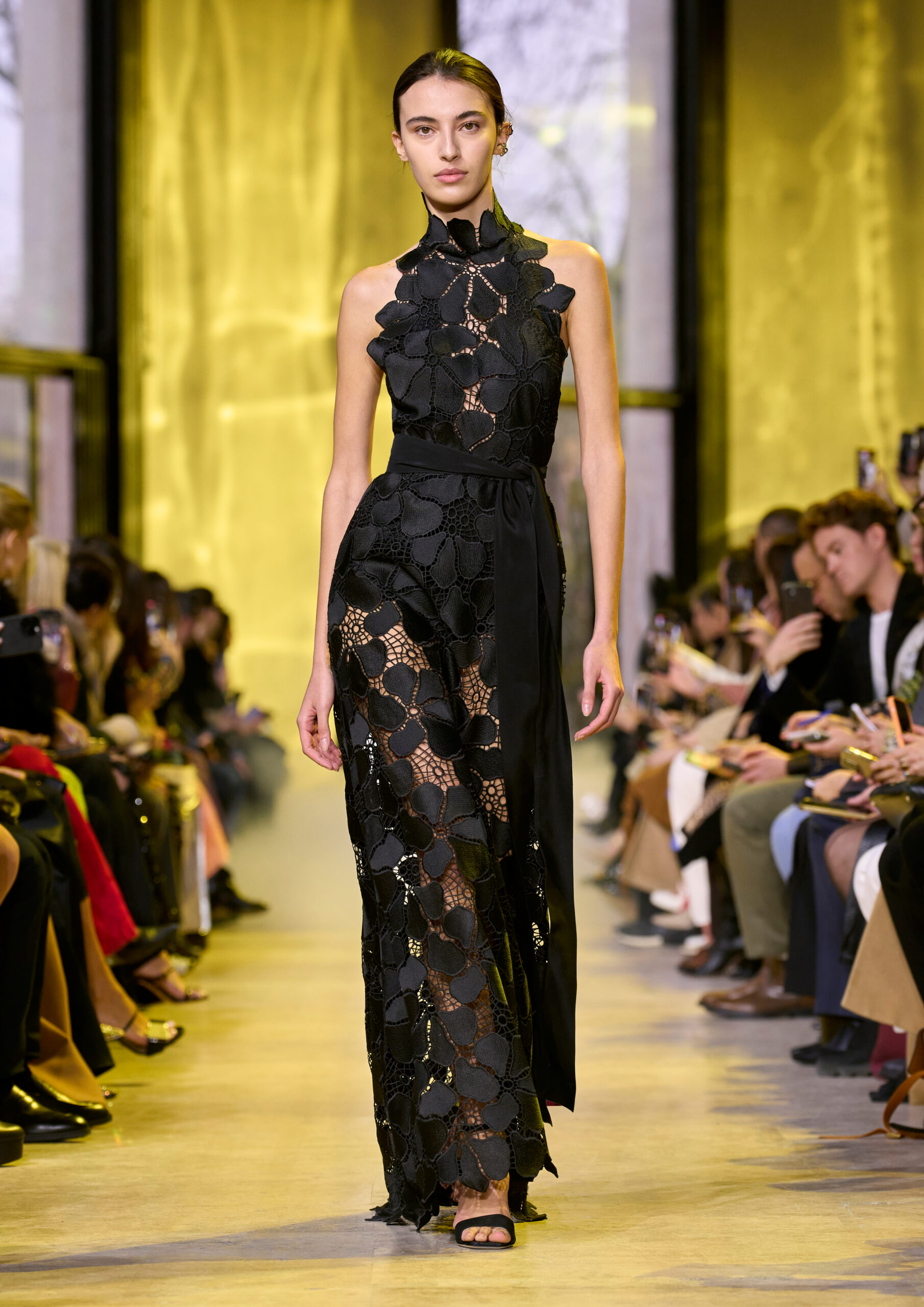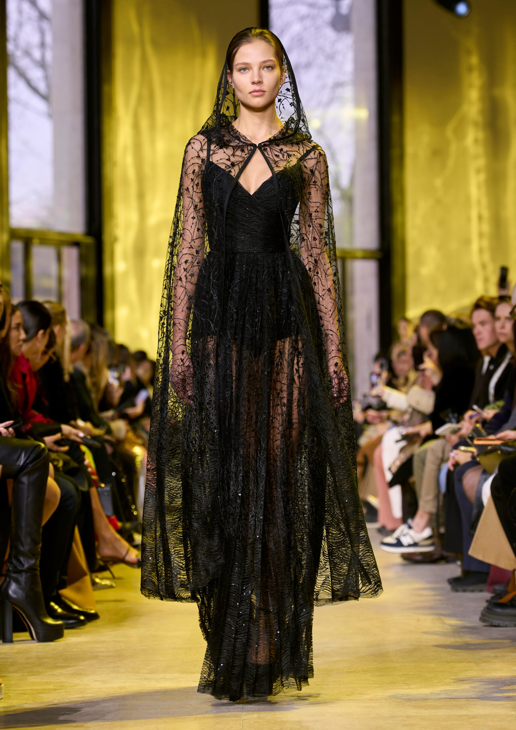Les tenues portent la femme ELIE SAAB du jour à la nuit, où elle illumine les heures sombres. Des fleurs 3D complexes émergent de sequins étincelants et de tulle, se déplaçant sur les décolletés halter et les robes sirène transparentes. Des illuminations et des broderies de perles élaborées donnent une subtile brillance de cristal aux robes à décolleté en V et aux robes bustiers en velours moelleux et en crêpe agile. Des capes en soie fine avec capuche ajoutent une légère couche de prestance et de grandeur. Des taffetas puissants de New Red et de Citrine drapent et s’étalent sur les tailles de robes de cocktail courtes et de combinaisons-pantalons, et dans des robes flottantes avec des lignes d’épaules élaborées. Des fedoras en feutre doux – méticuleusement créés avec le maître chapelier italien, Borsalino – rehaussent délicatement les embellissements naissants sur les courts manteaux en laine. Des sacs à chaîne en cuir superposé et des talons hauts ELIE SAAB monogrammés en cristaux et en plexi ajoutent une touche finale de splendeur.