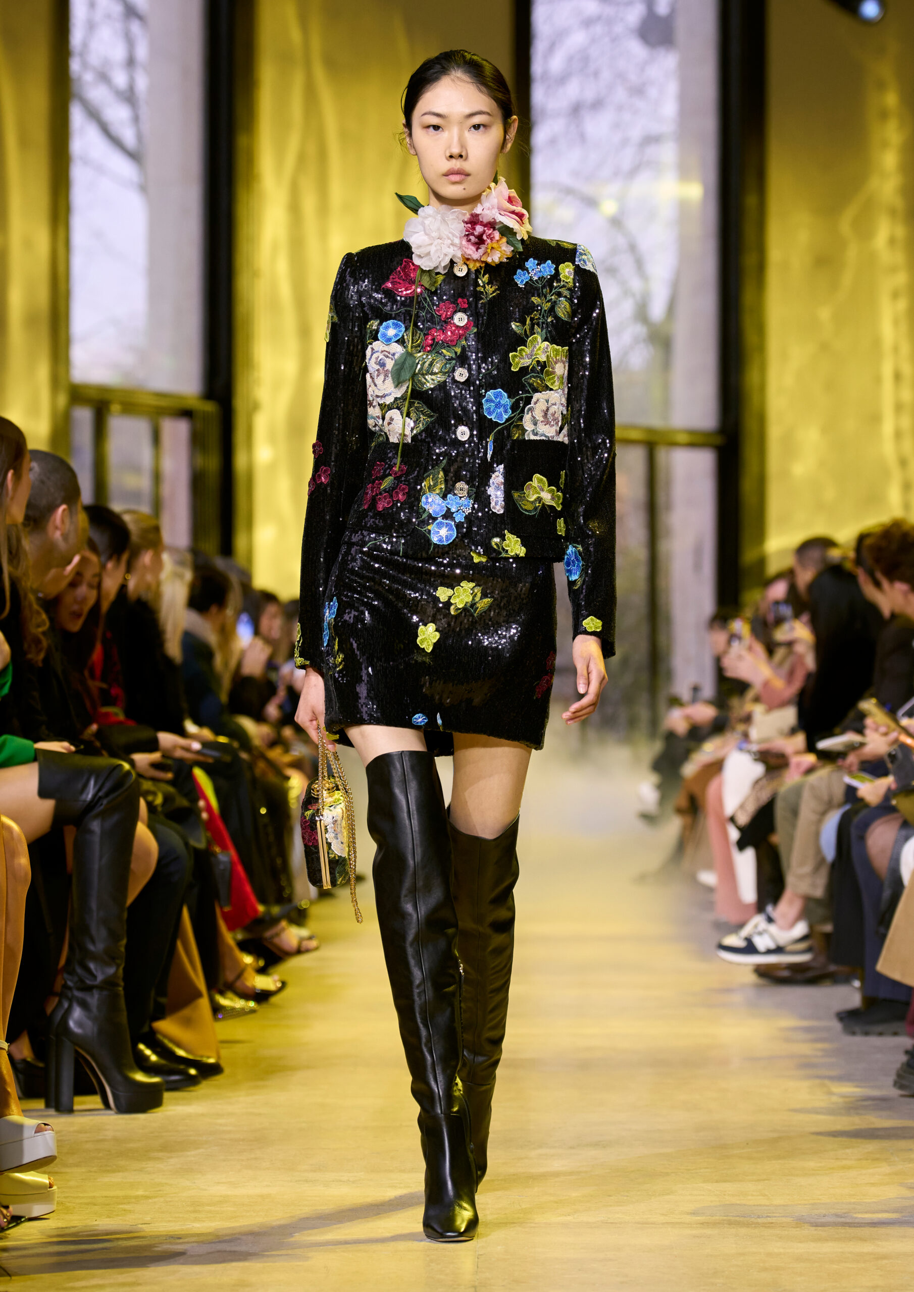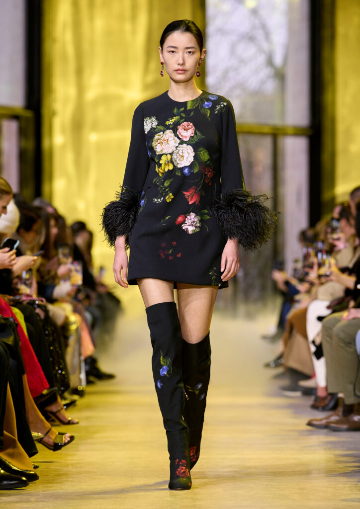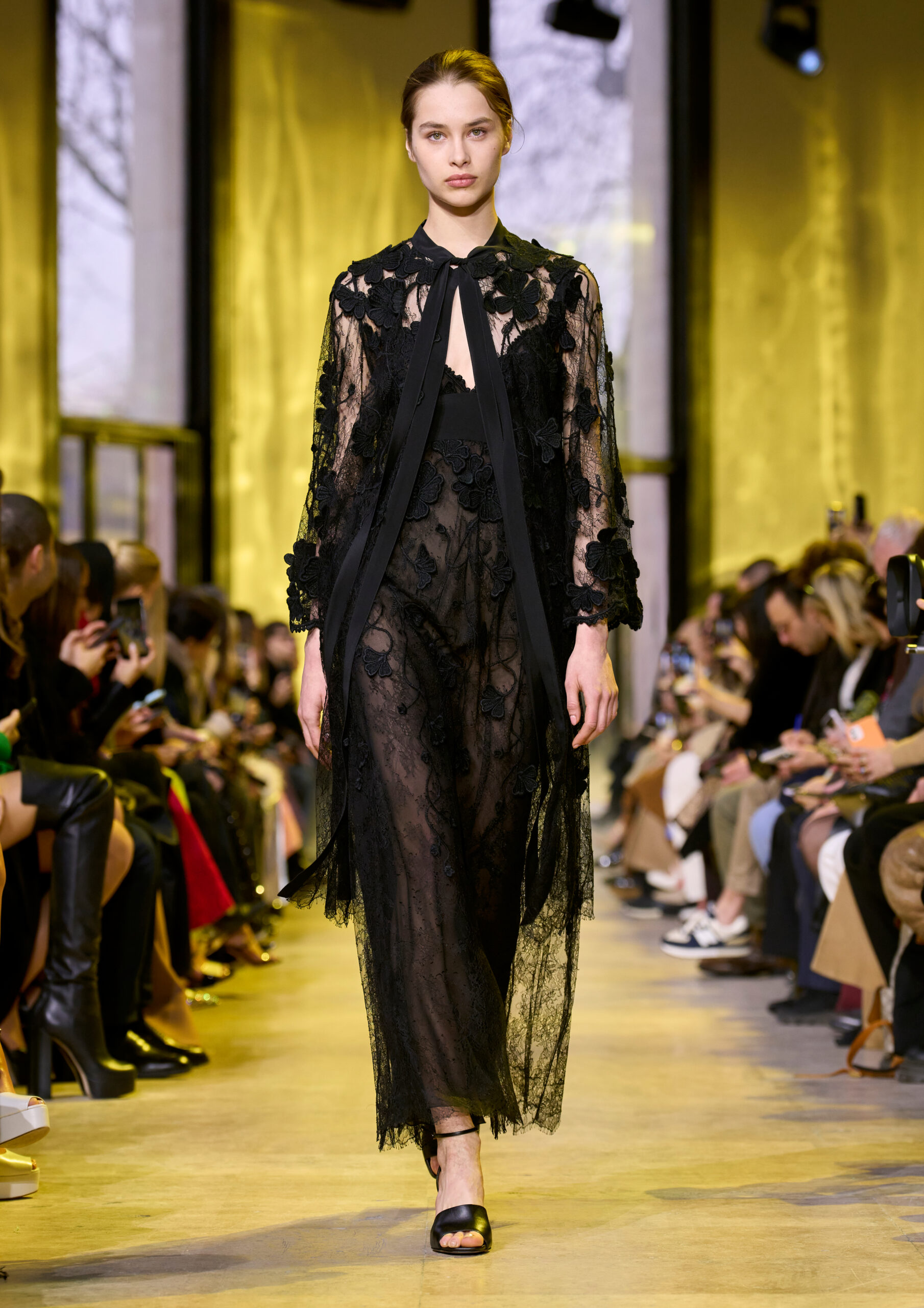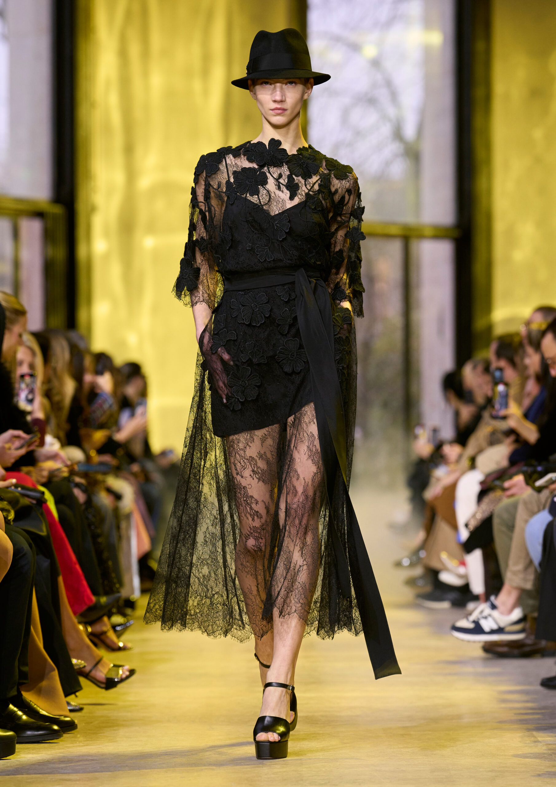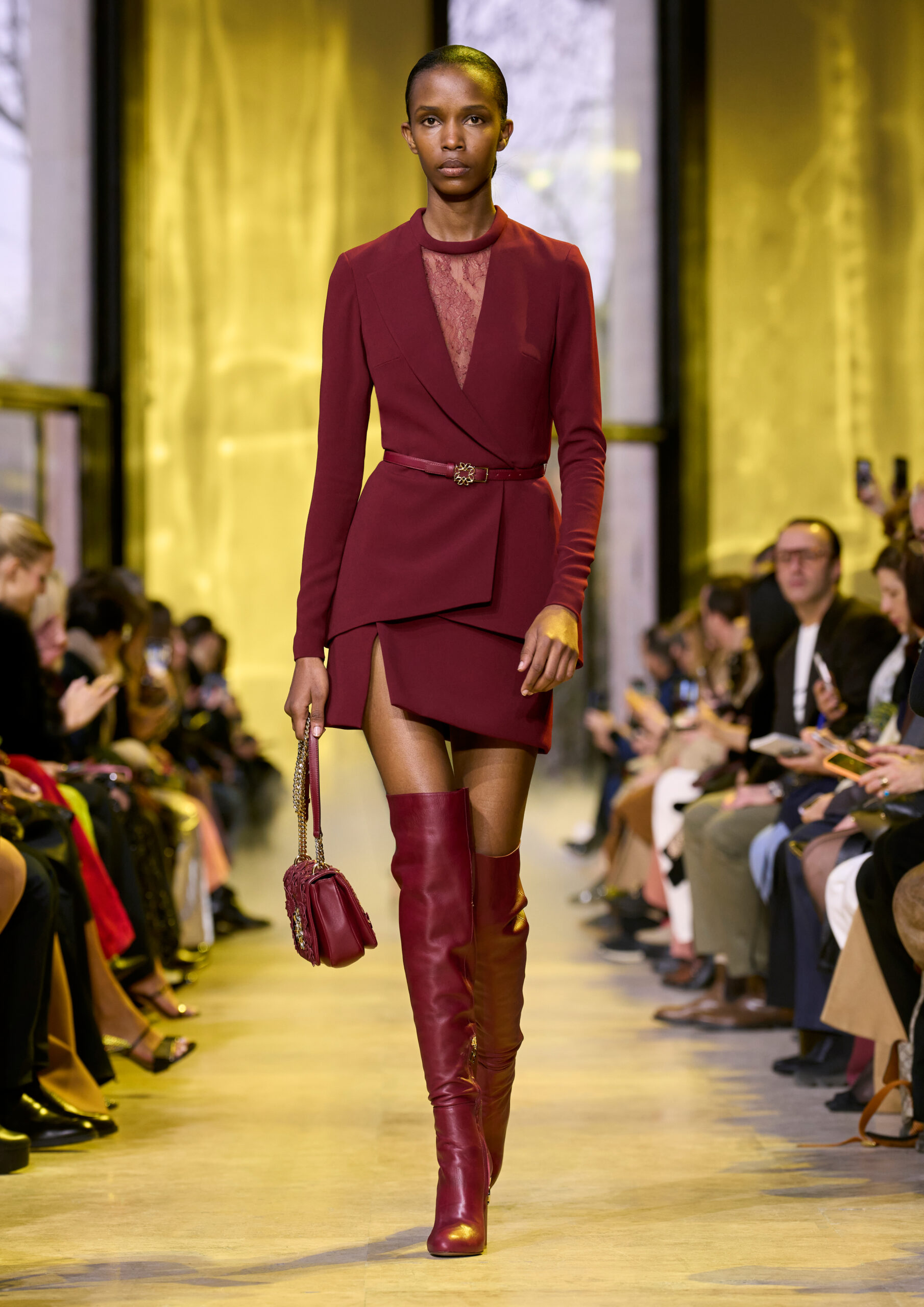 Les tenues portent la femme ELIE SAAB du jour à la nuit, où elle illumine les heures sombres. Des fleurs 3D complexes émergent de sequins étincelants et de tulle, se déplaçant sur les décolletés halter et les robes sirène transparentes. Des illuminations et des broderies de perles élaborées donnent une subtile brillance de cristal aux robes à décolleté en V et aux robes bustiers en velours moelleux et en crêpe agile. Des capes en soie fine avec capuche ajoutent une légère couche de prestance et de grandeur. Des taffetas puissants de New Red et de Citrine drapent et s’étalent sur les tailles de robes de cocktail courtes et de combinaisons-pantalons, et dans des robes flottantes avec des lignes d’épaules élaborées. Des fedoras en feutre doux – méticuleusement créés avec le maître chapelier italien, Borsalino – rehaussent délicatement les embellissements naissants sur les courts manteaux en laine. Des sacs à chaîne en cuir superposé et des talons hauts ELIE SAAB monogrammés en cristaux et en plexi ajoutent une touche finale de splendeur.