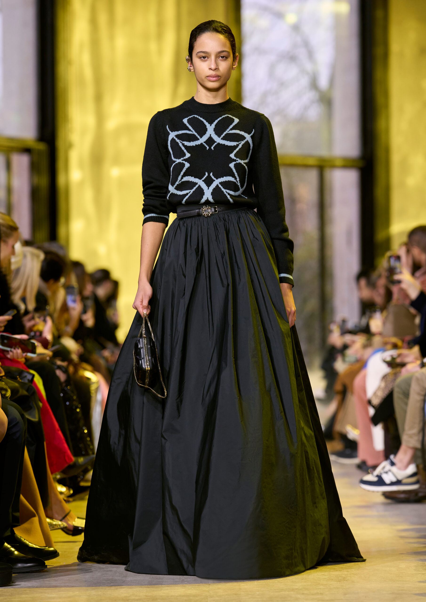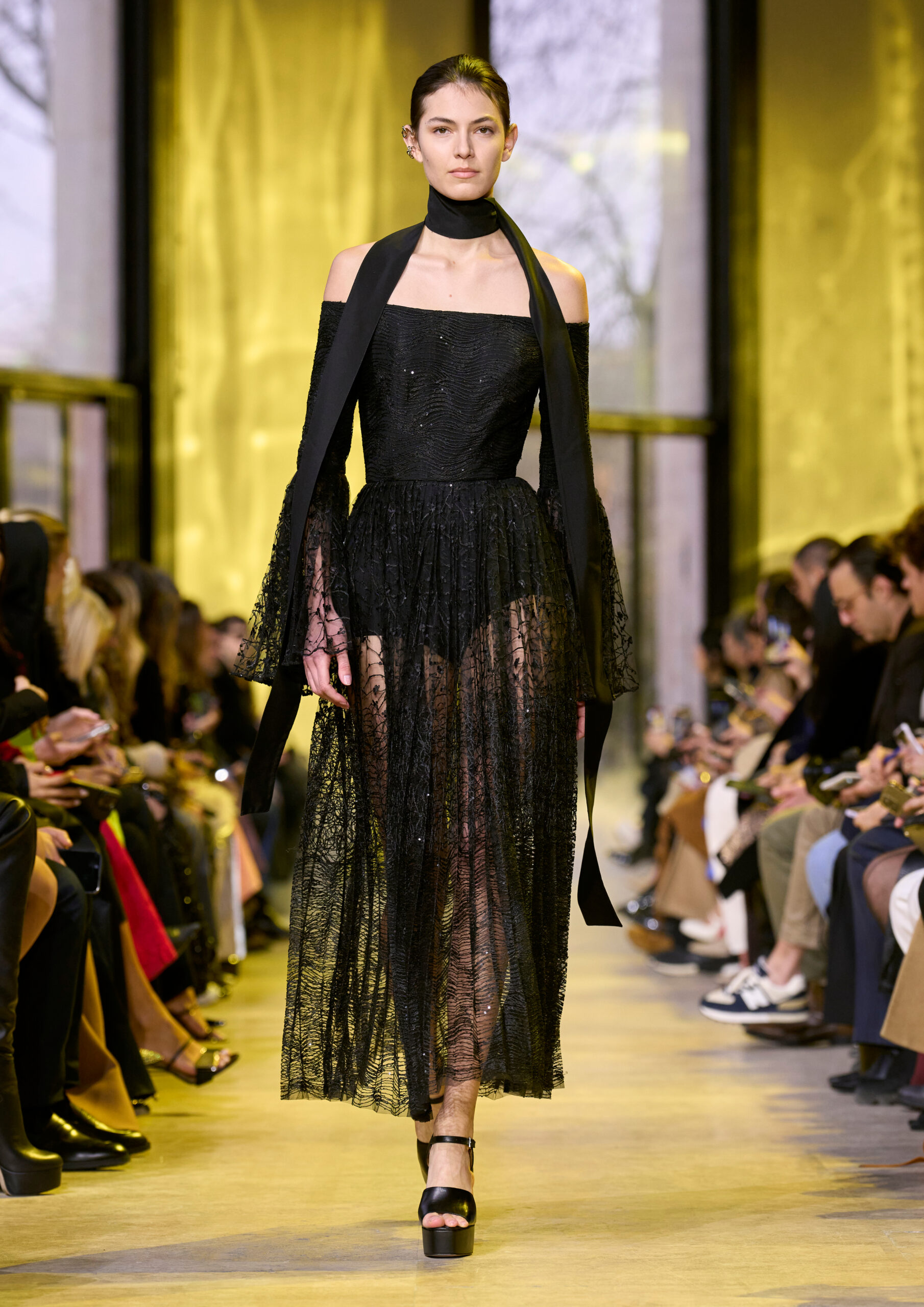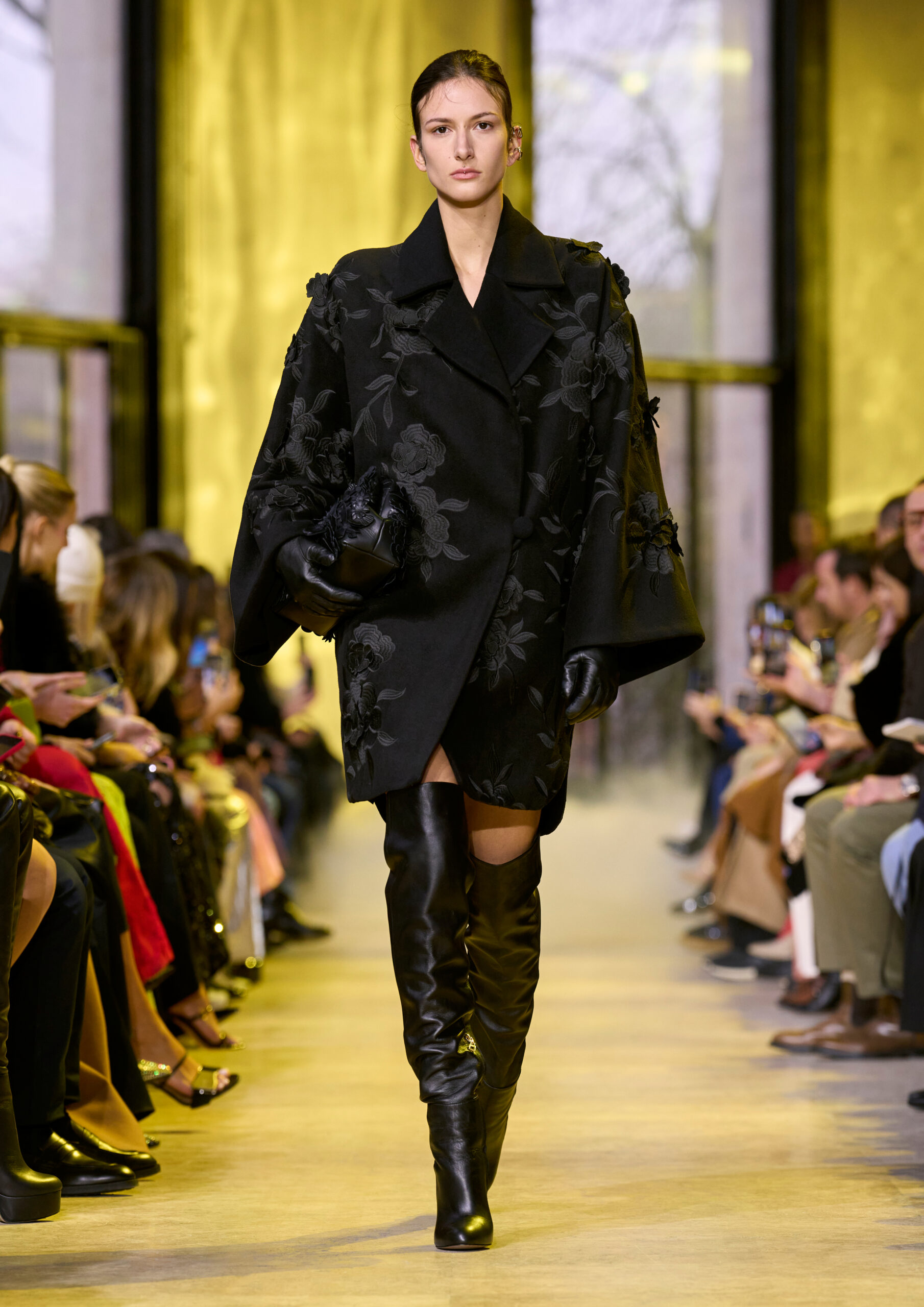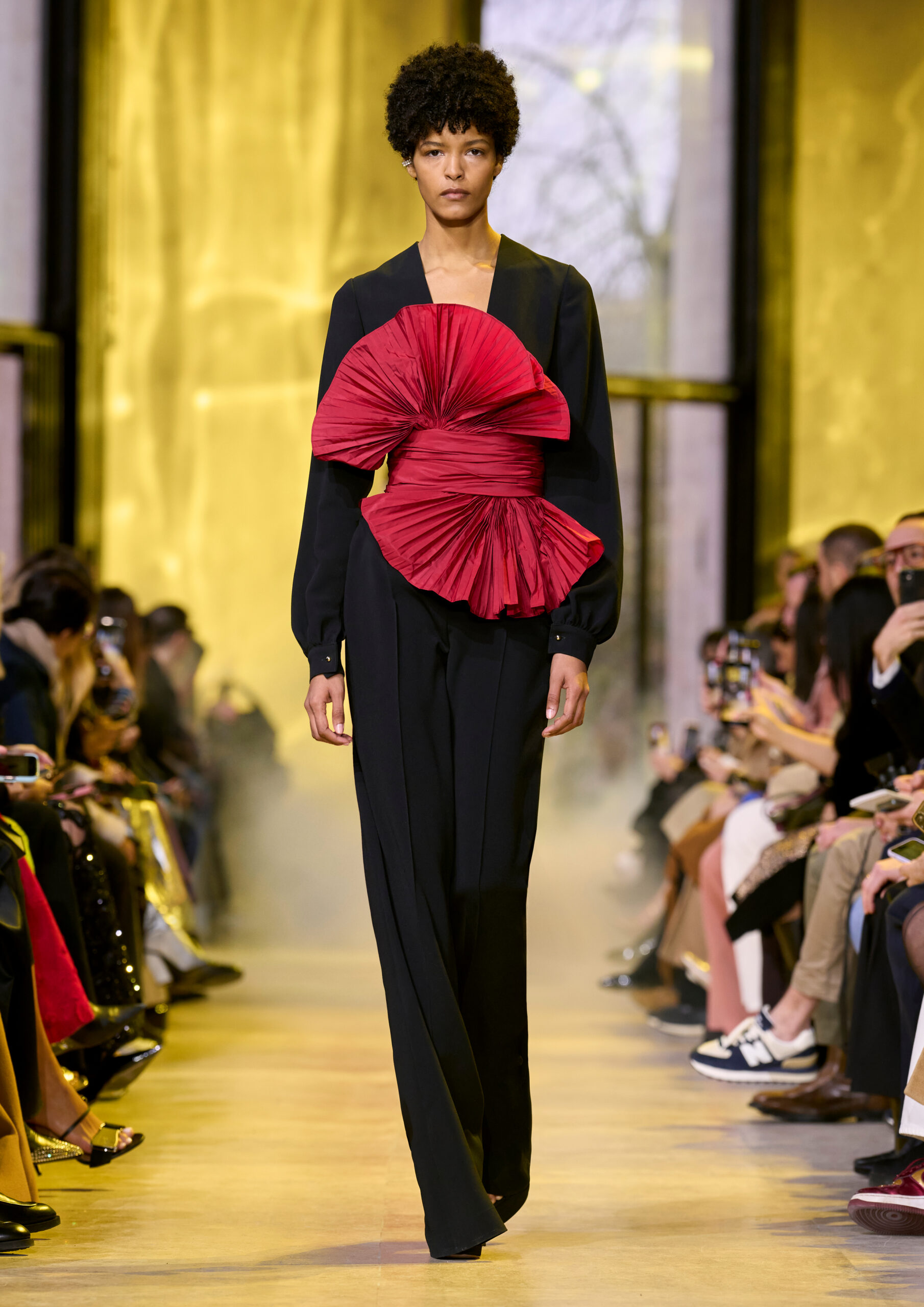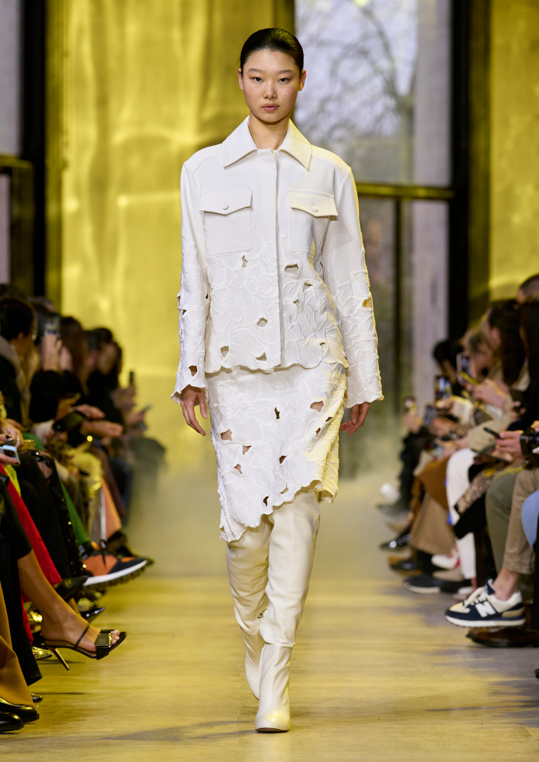 Les tenues portent la femme ELIE SAAB du jour à la nuit, où elle illumine les heures sombres. Des fleurs 3D complexes émergent de sequins étincelants et de tulle, se déplaçant sur les décolletés halter et les robes sirène transparentes. Des illuminations et des broderies de perles élaborées donnent une subtile brillance de cristal aux robes à décolleté en V et aux robes bustiers en velours moelleux et en crêpe agile. Des capes en soie fine avec capuche ajoutent une légère couche de prestance et de grandeur. Des taffetas puissants de New Red et de Citrine drapent et s’étalent sur les tailles de robes de cocktail courtes et de combinaisons-pantalons, et dans des robes flottantes avec des lignes d’épaules élaborées. Des fedoras en feutre doux – méticuleusement créés avec le maître chapelier italien, Borsalino – rehaussent délicatement les embellissements naissants sur les courts manteaux en laine. Des sacs à chaîne en cuir superposé et des talons hauts ELIE SAAB monogrammés en cristaux et en plexi ajoutent une touche finale de splendeur.