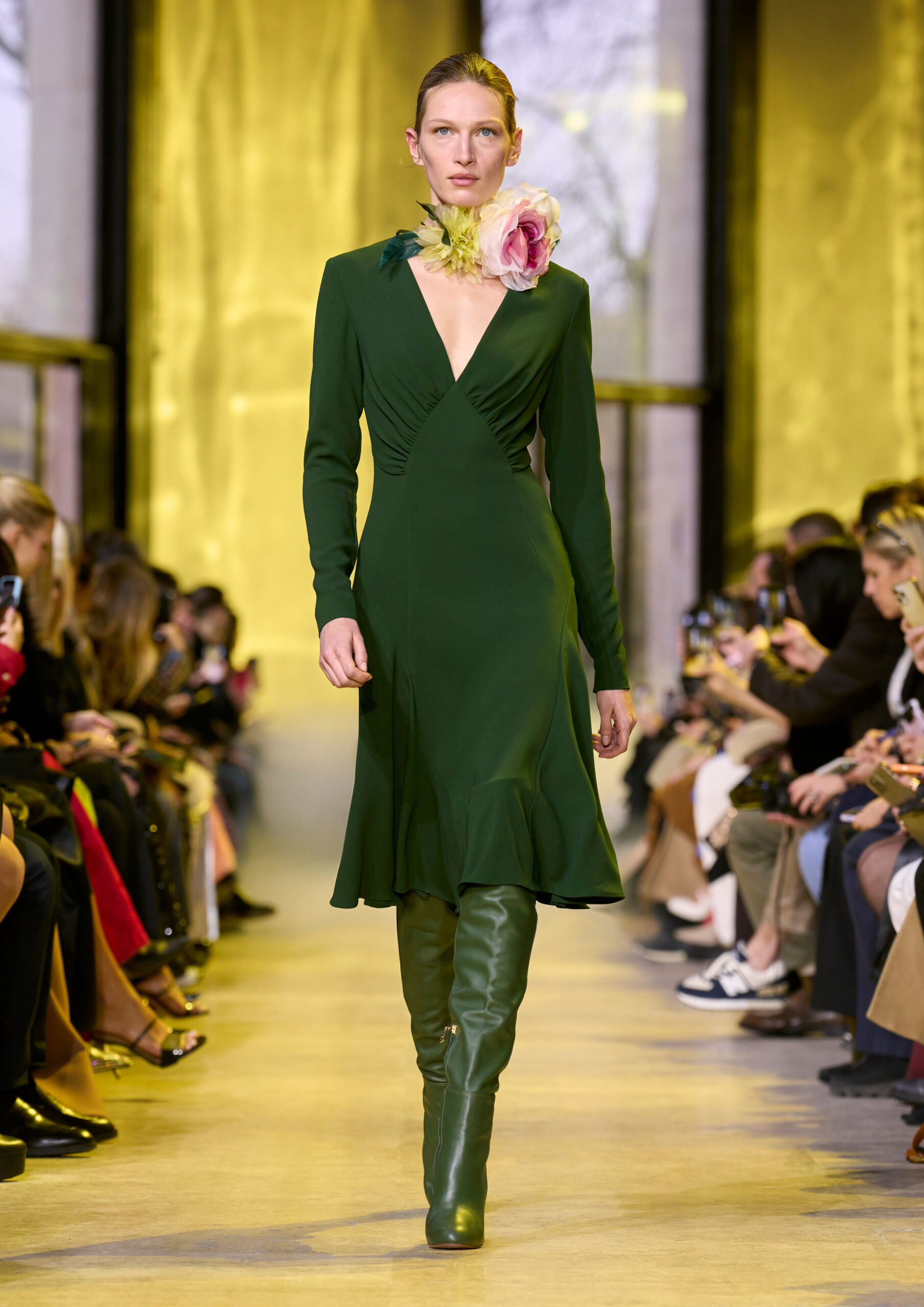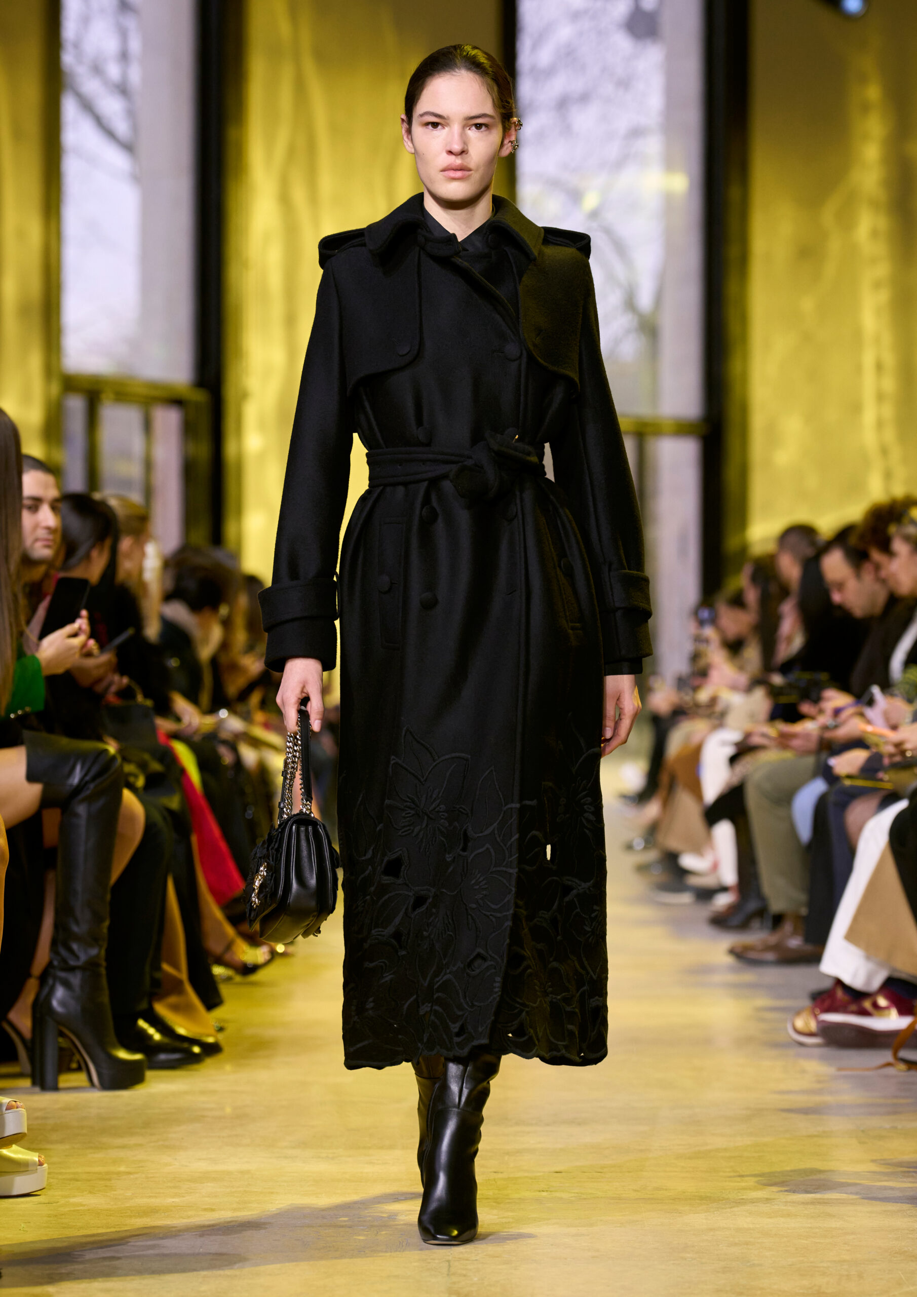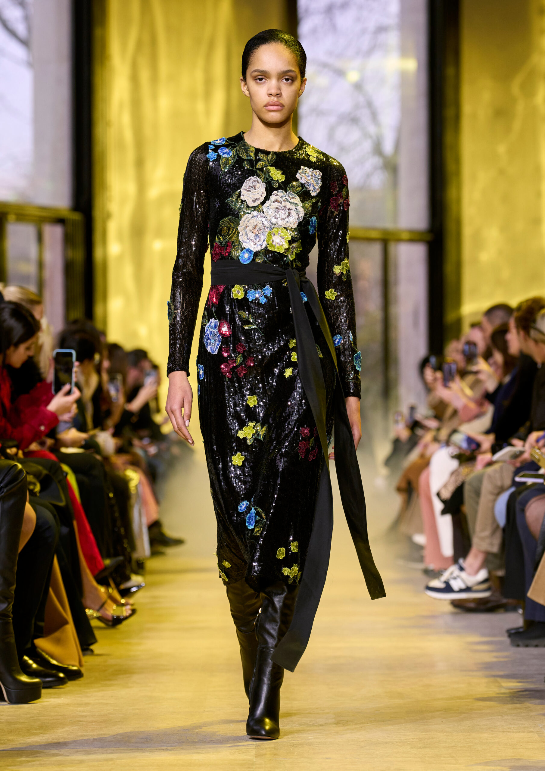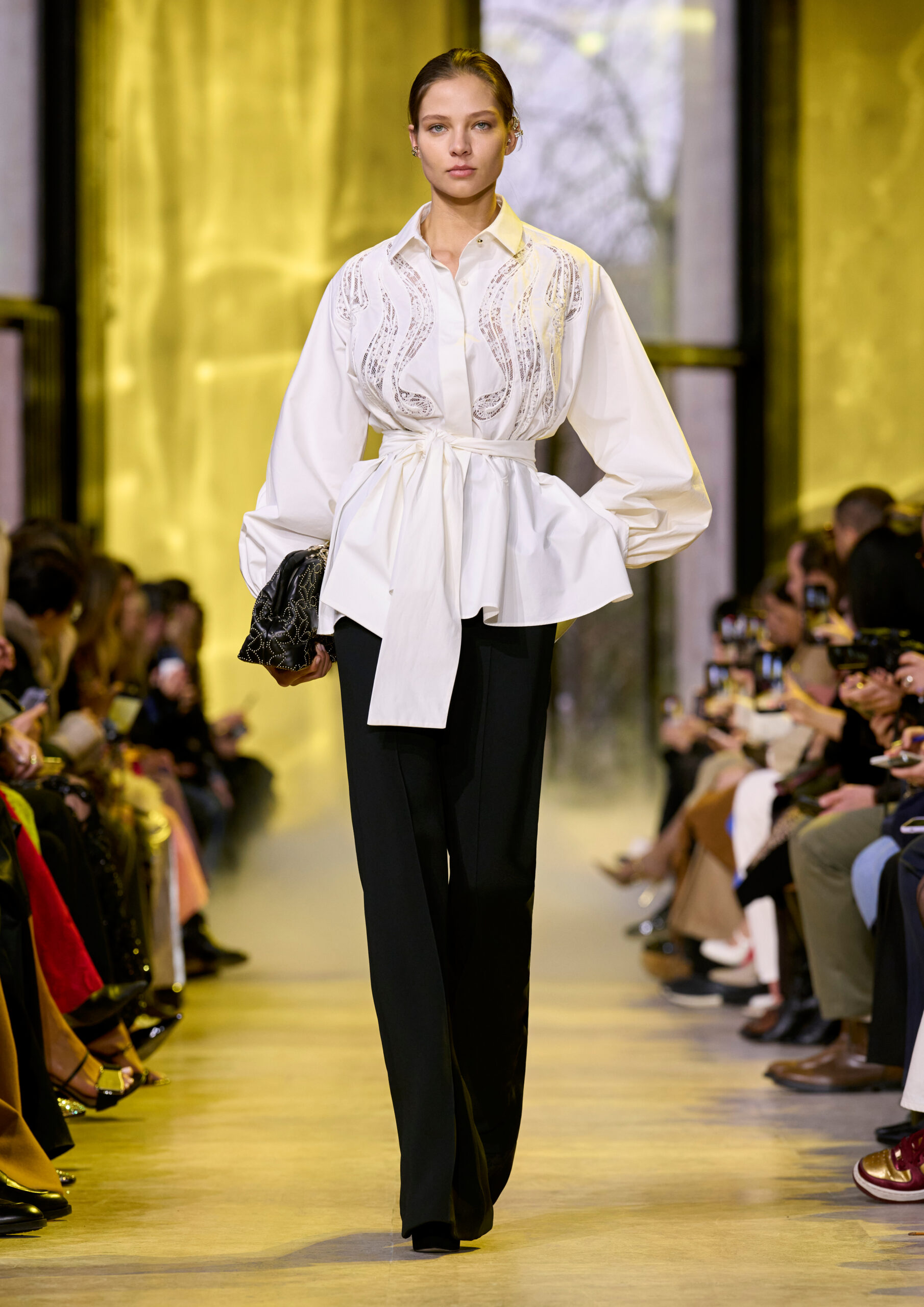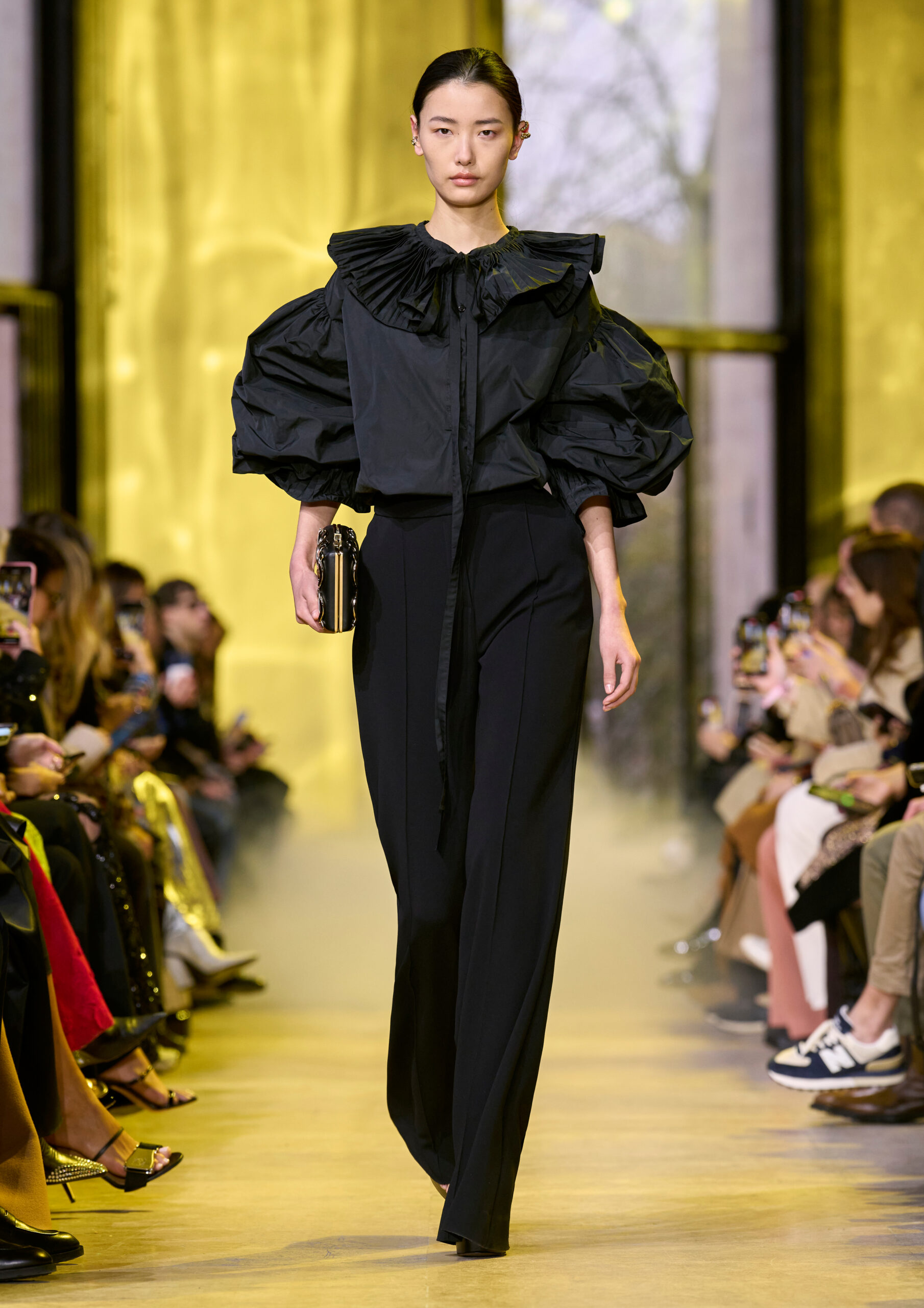 Les tenues portent la femme ELIE SAAB du jour à la nuit, où elle illumine les heures sombres. Des fleurs 3D complexes émergent de sequins étincelants et de tulle, se déplaçant sur les décolletés halter et les robes sirène transparentes. Des illuminations et des broderies de perles élaborées donnent une subtile brillance de cristal aux robes à décolleté en V et aux robes bustiers en velours moelleux et en crêpe agile. Des capes en soie fine avec capuche ajoutent une légère couche de prestance et de grandeur. Des taffetas puissants de New Red et de Citrine drapent et s’étalent sur les tailles de robes de cocktail courtes et de combinaisons-pantalons, et dans des robes flottantes avec des lignes d’épaules élaborées. Des fedoras en feutre doux – méticuleusement créés avec le maître chapelier italien, Borsalino – rehaussent délicatement les embellissements naissants sur les courts manteaux en laine. Des sacs à chaîne en cuir superposé et des talons hauts ELIE SAAB monogrammés en cristaux et en plexi ajoutent une touche finale de splendeur.