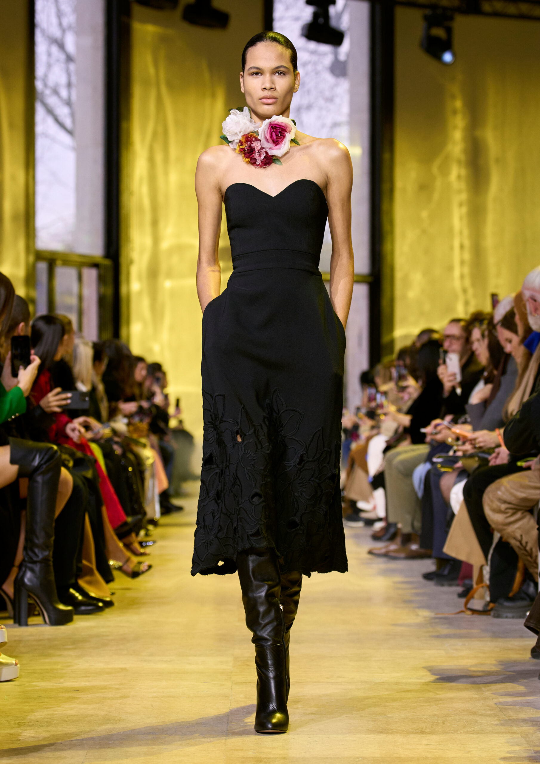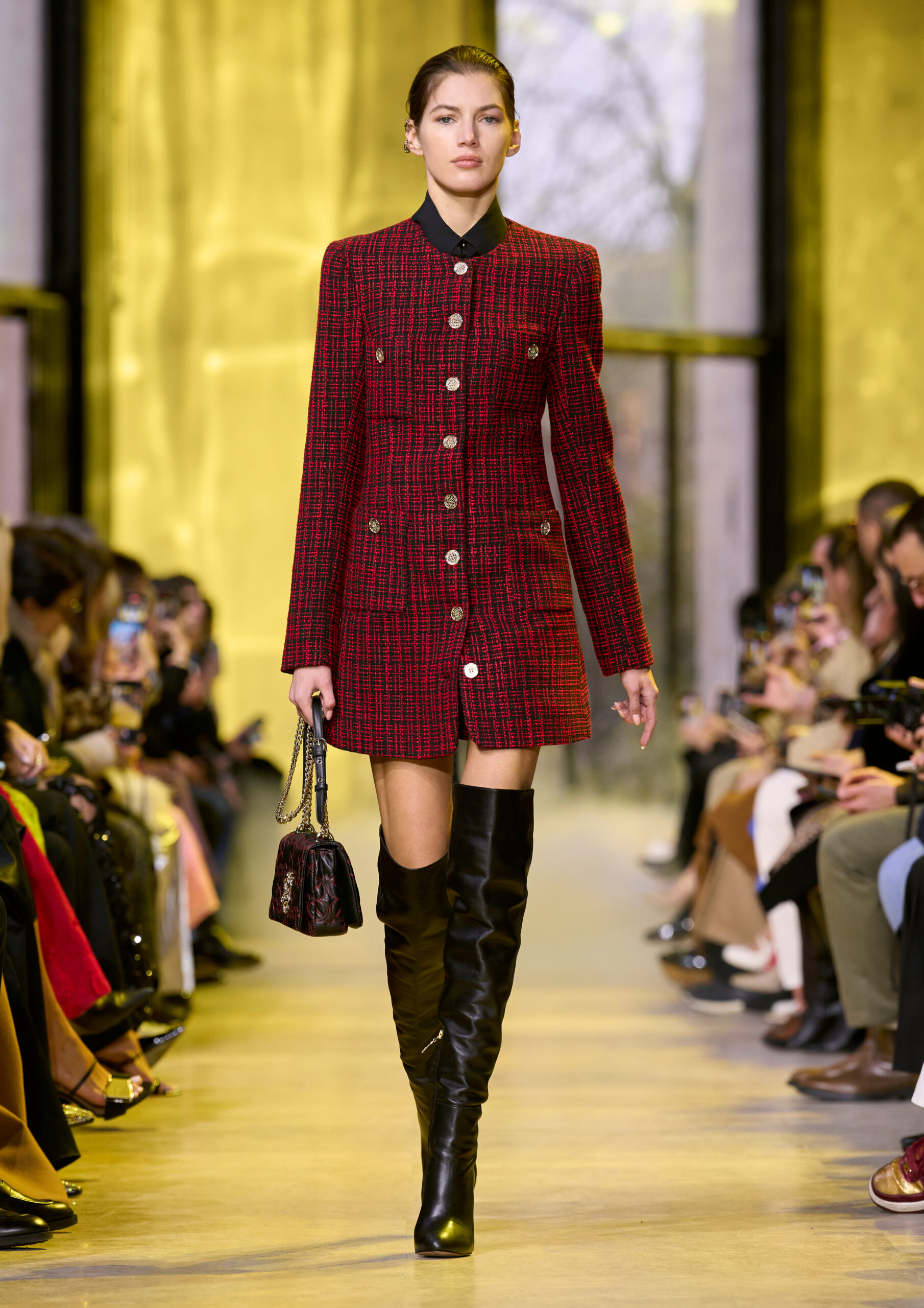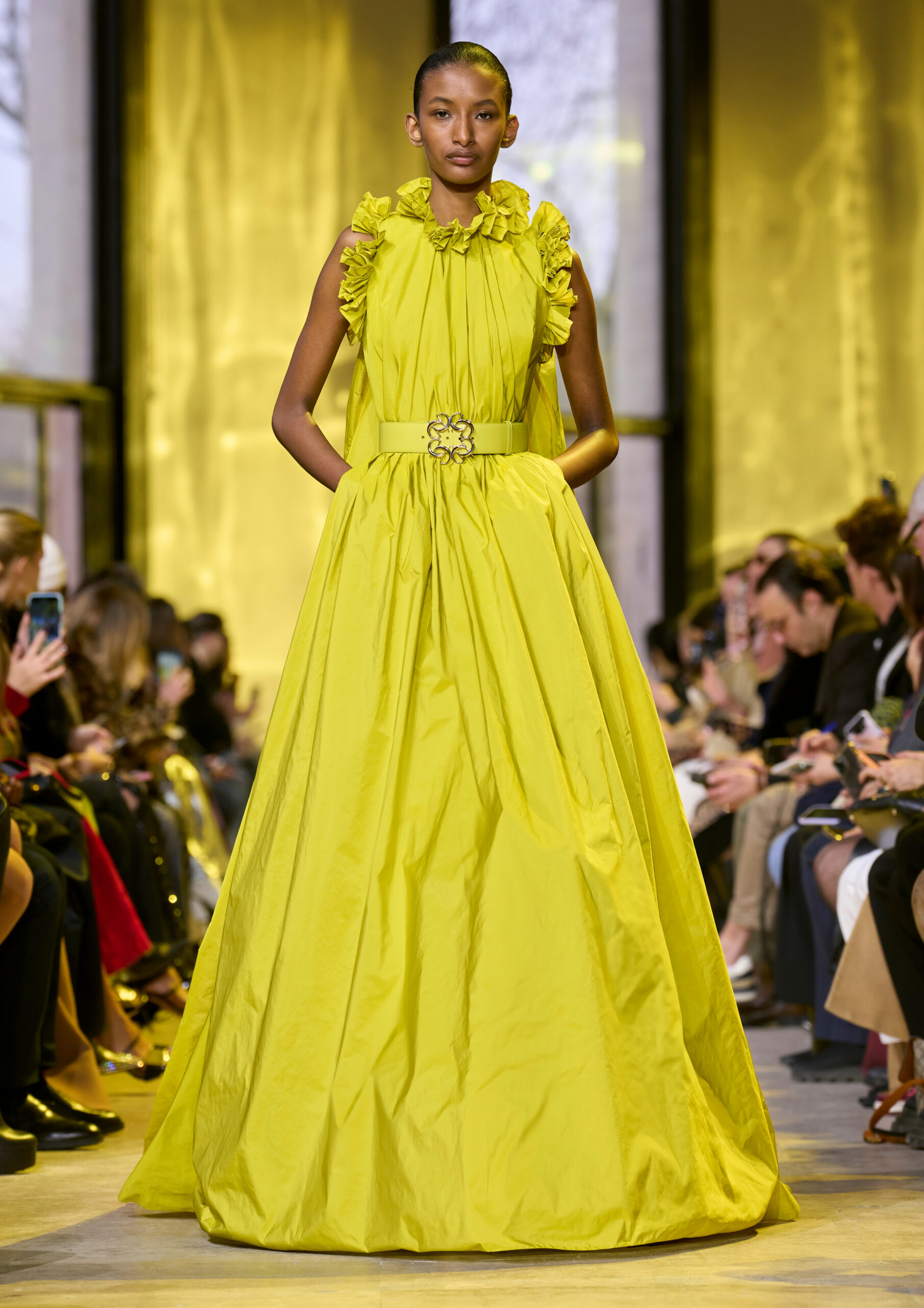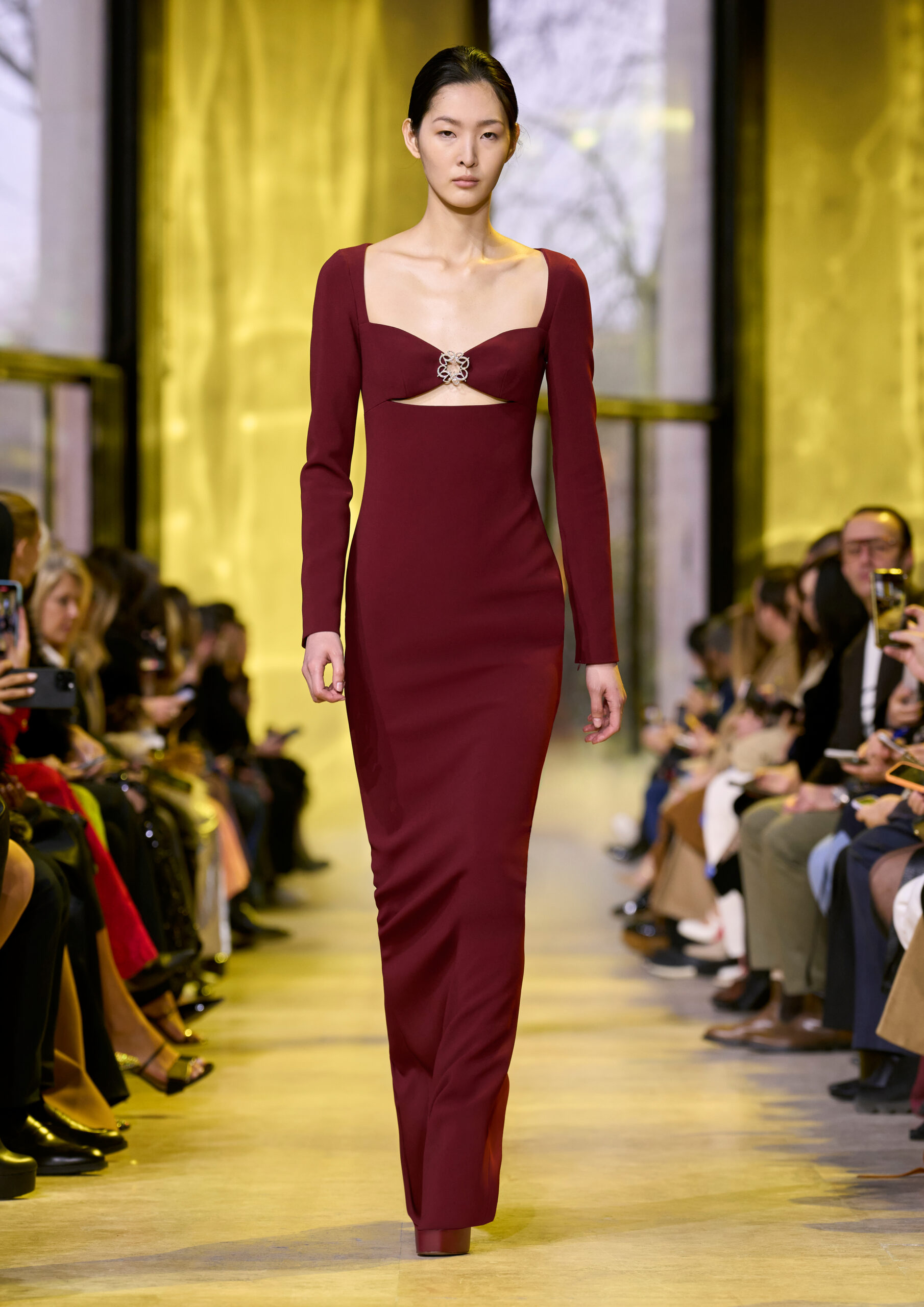 Les tenues portent la femme ELIE SAAB du jour à la nuit, où elle illumine les heures sombres. Des fleurs 3D complexes émergent de sequins étincelants et de tulle, se déplaçant sur les décolletés halter et les robes sirène transparentes. Des illuminations et des broderies de perles élaborées donnent une subtile brillance de cristal aux robes à décolleté en V et aux robes bustiers en velours moelleux et en crêpe agile. Des capes en soie fine avec capuche ajoutent une légère couche de prestance et de grandeur. Des taffetas puissants de New Red et de Citrine drapent et s’étalent sur les tailles de robes de cocktail courtes et de combinaisons-pantalons, et dans des robes flottantes avec des lignes d’épaules élaborées. Des fedoras en feutre doux – méticuleusement créés avec le maître chapelier italien, Borsalino – rehaussent délicatement les embellissements naissants sur les courts manteaux en laine. Des sacs à chaîne en cuir superposé et des talons hauts ELIE SAAB monogrammés en cristaux et en plexi ajoutent une touche finale de splendeur.
