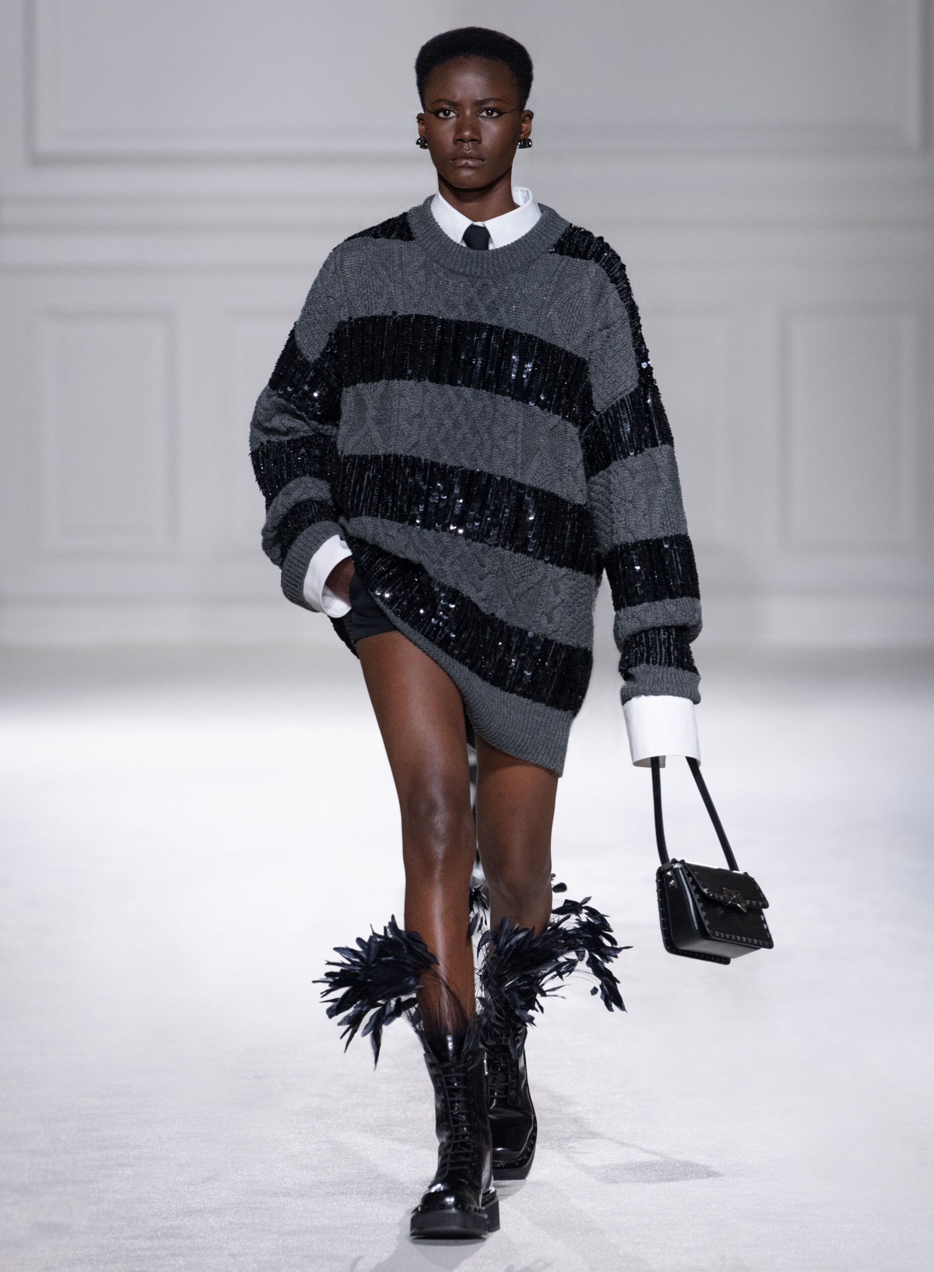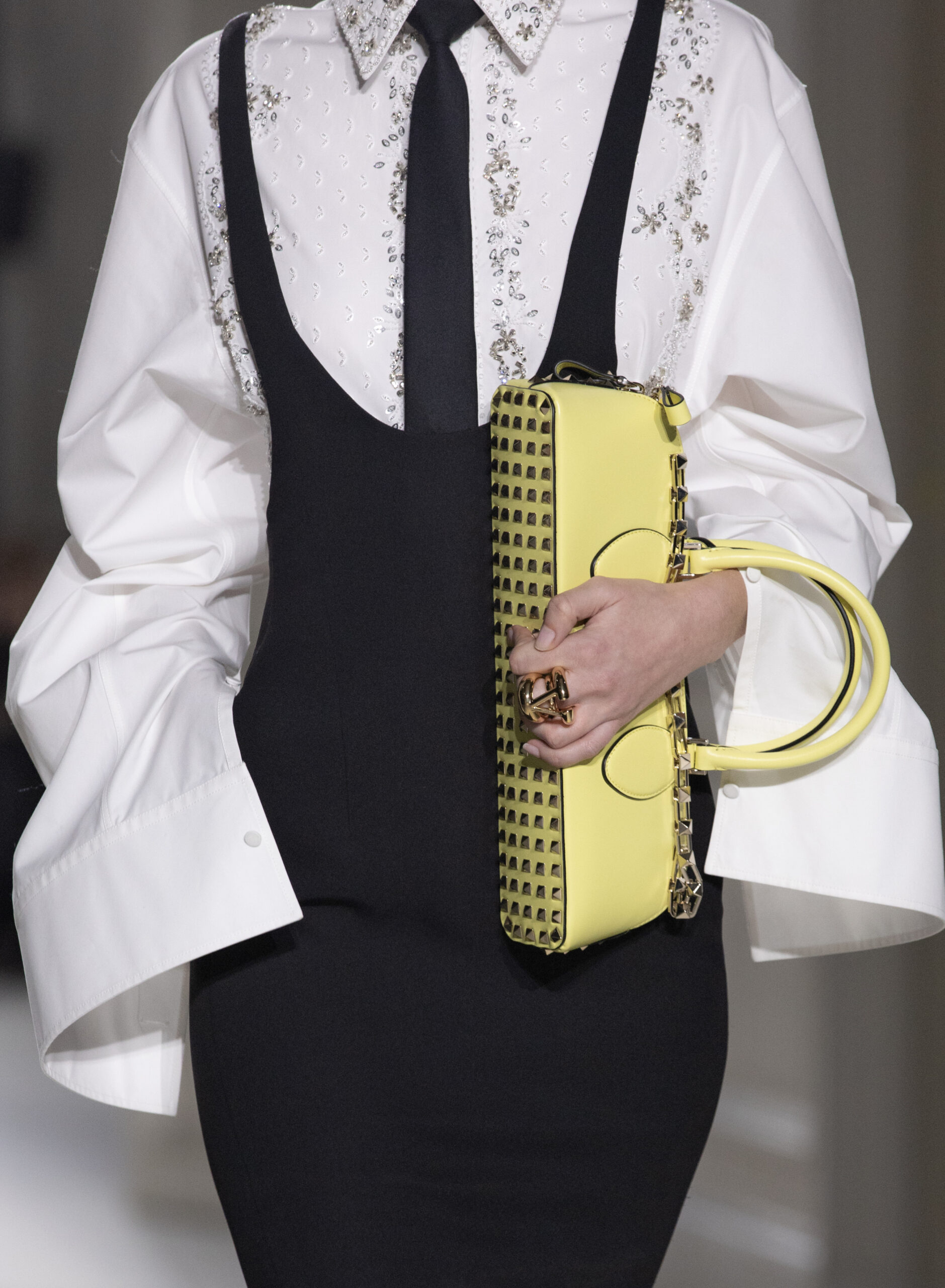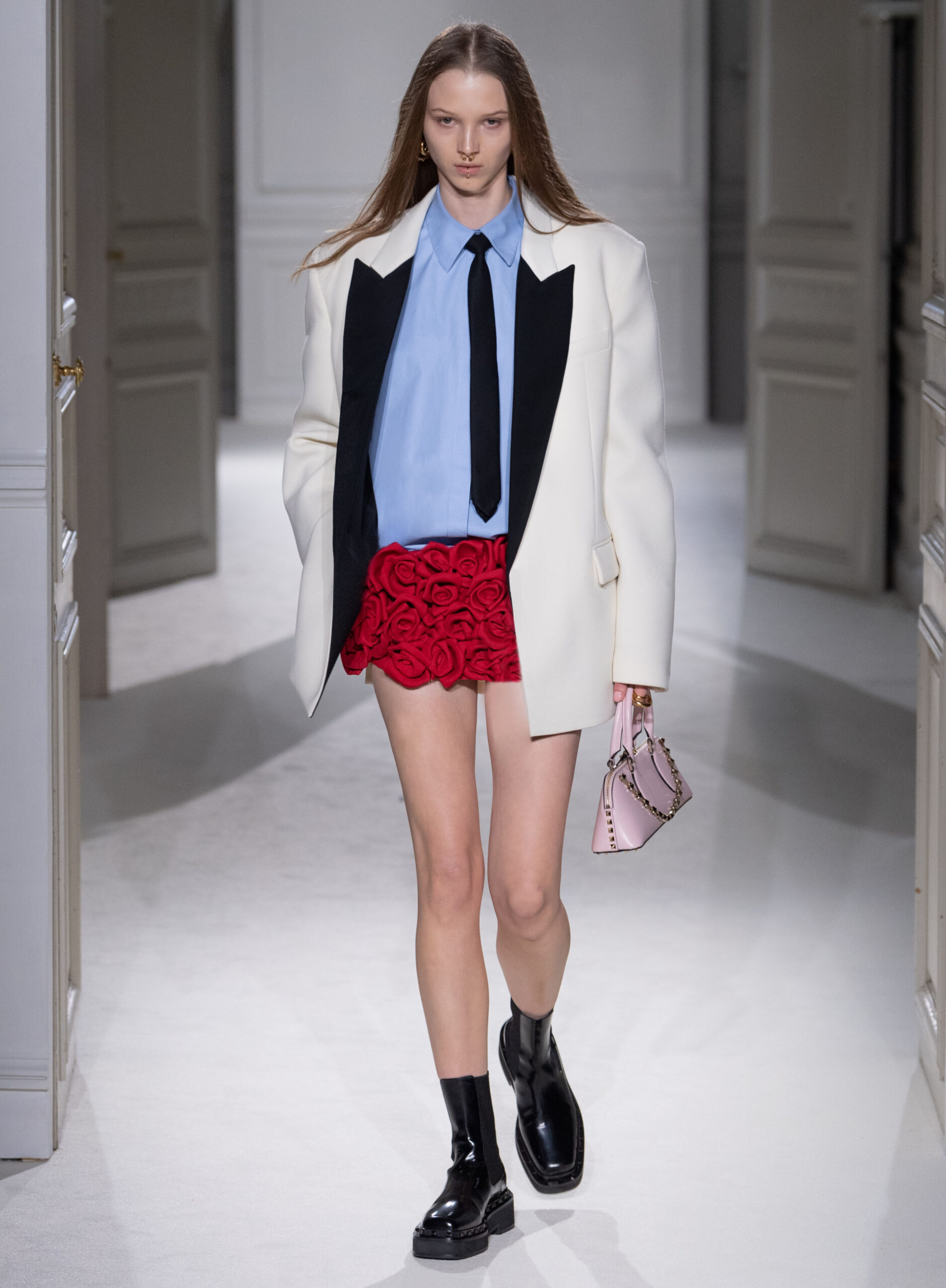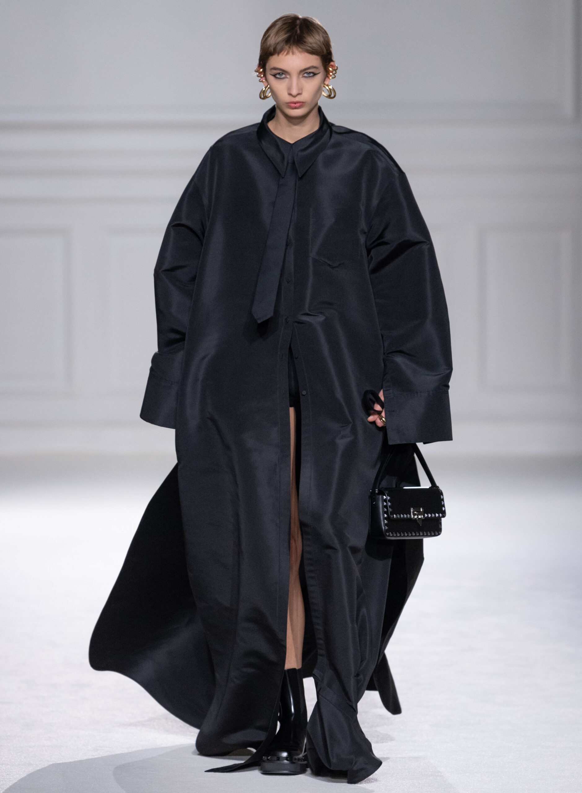 Les vêtements de tous les jours sont transformés en pièces de soirée, et les conventions vestimentaires sont bousculées pour créer des silhouettes dynamiques et modernes. La collection met en valeur la qualité de la confection, la palette épurée, ainsi que les valeurs fondamentales de la Maison Valentino, tout en ajoutant des éléments plus contemporains, tels que les Rockstud.
