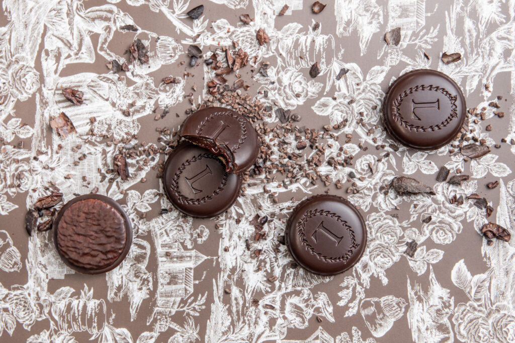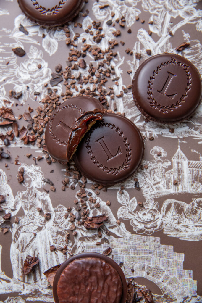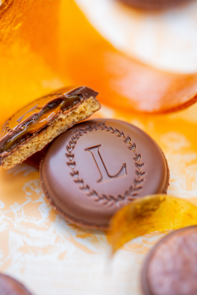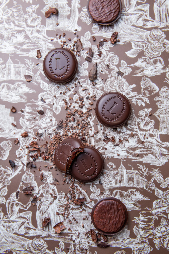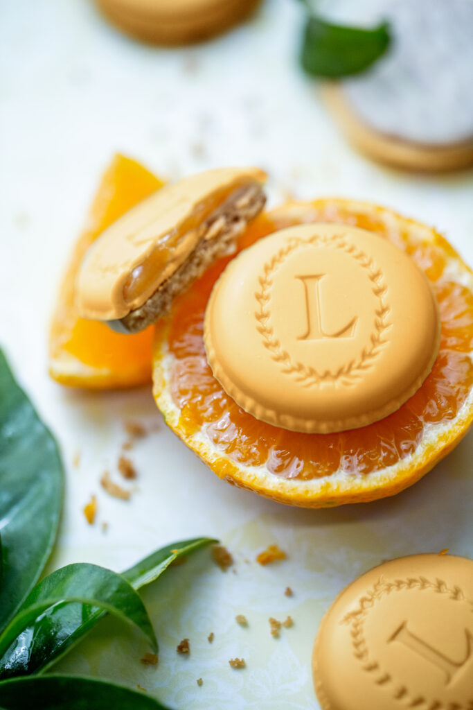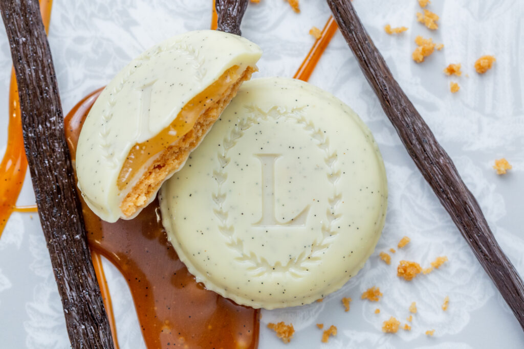Este delicioso bocadito ofrece una sorprendente combinación de texturas, con una crujiente galleta sin gluten, un centro fundente y una crujiente cobertura de chocolate que recuerda al famoso macarrón de la casa.
