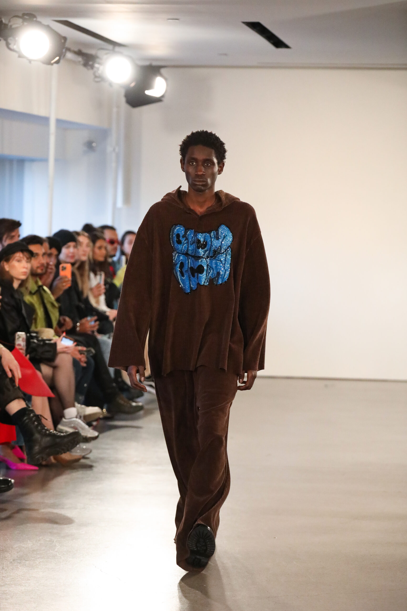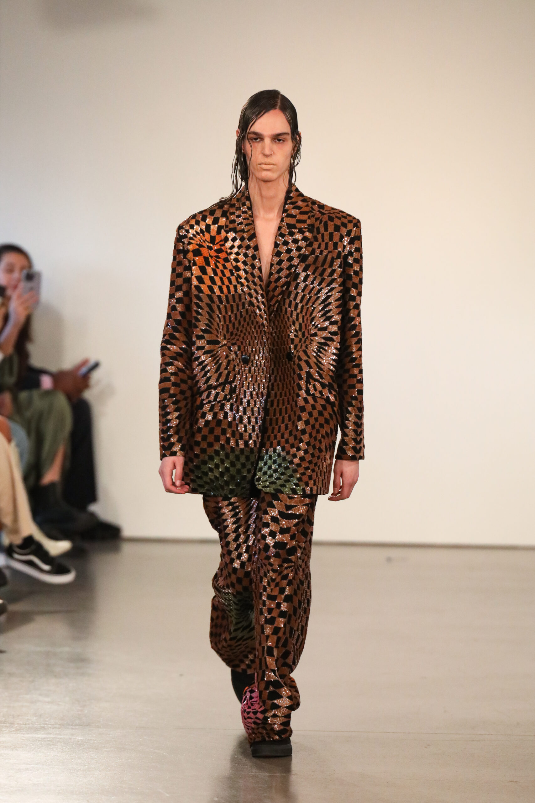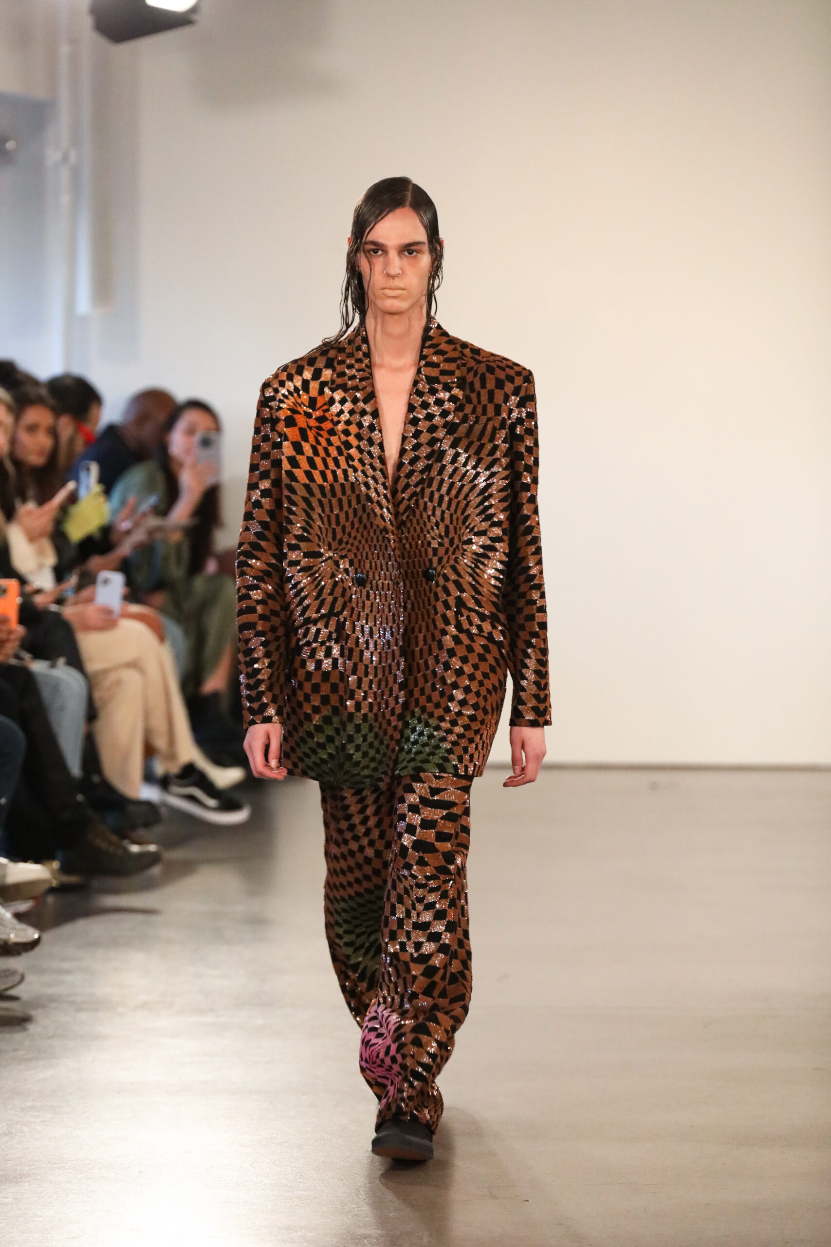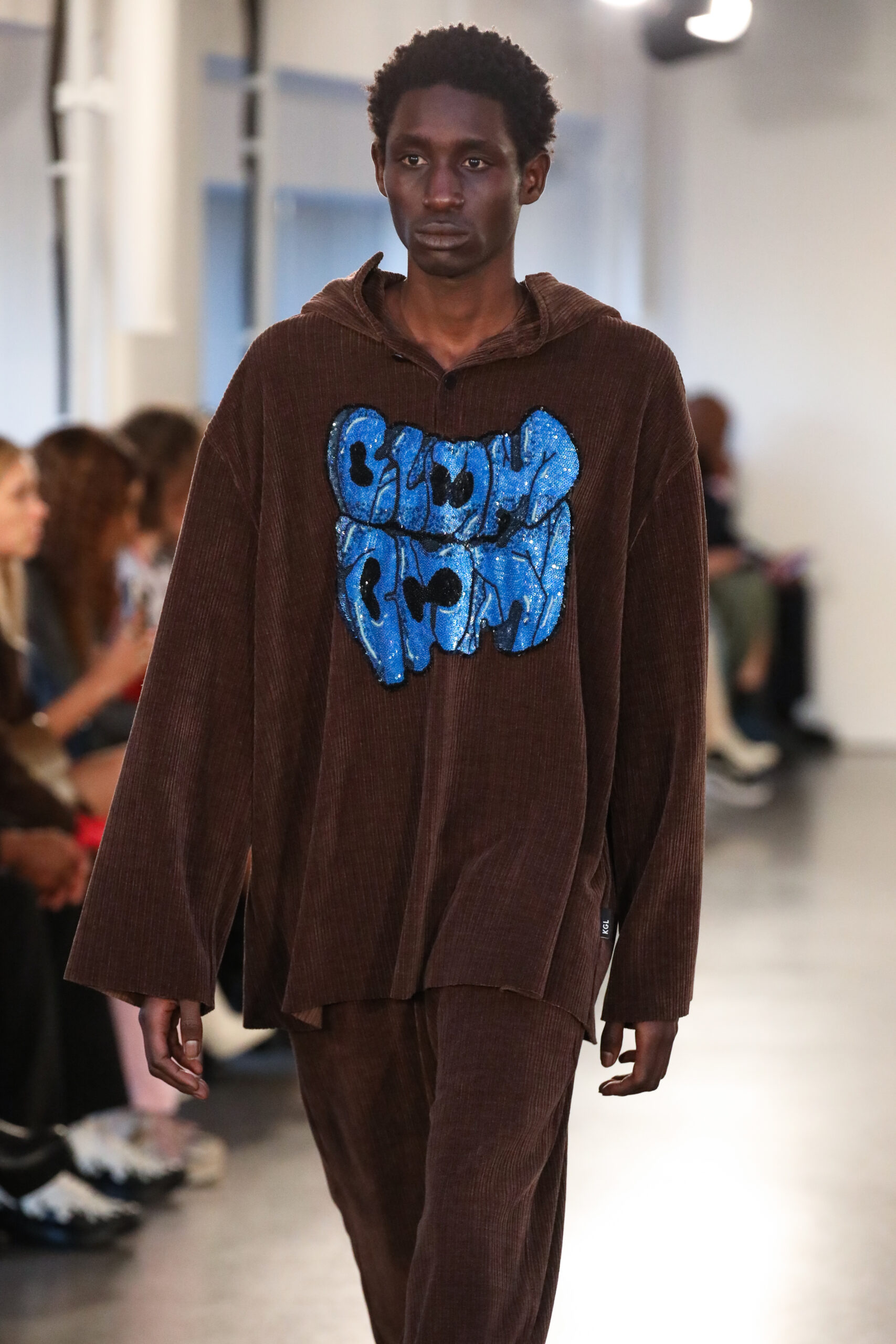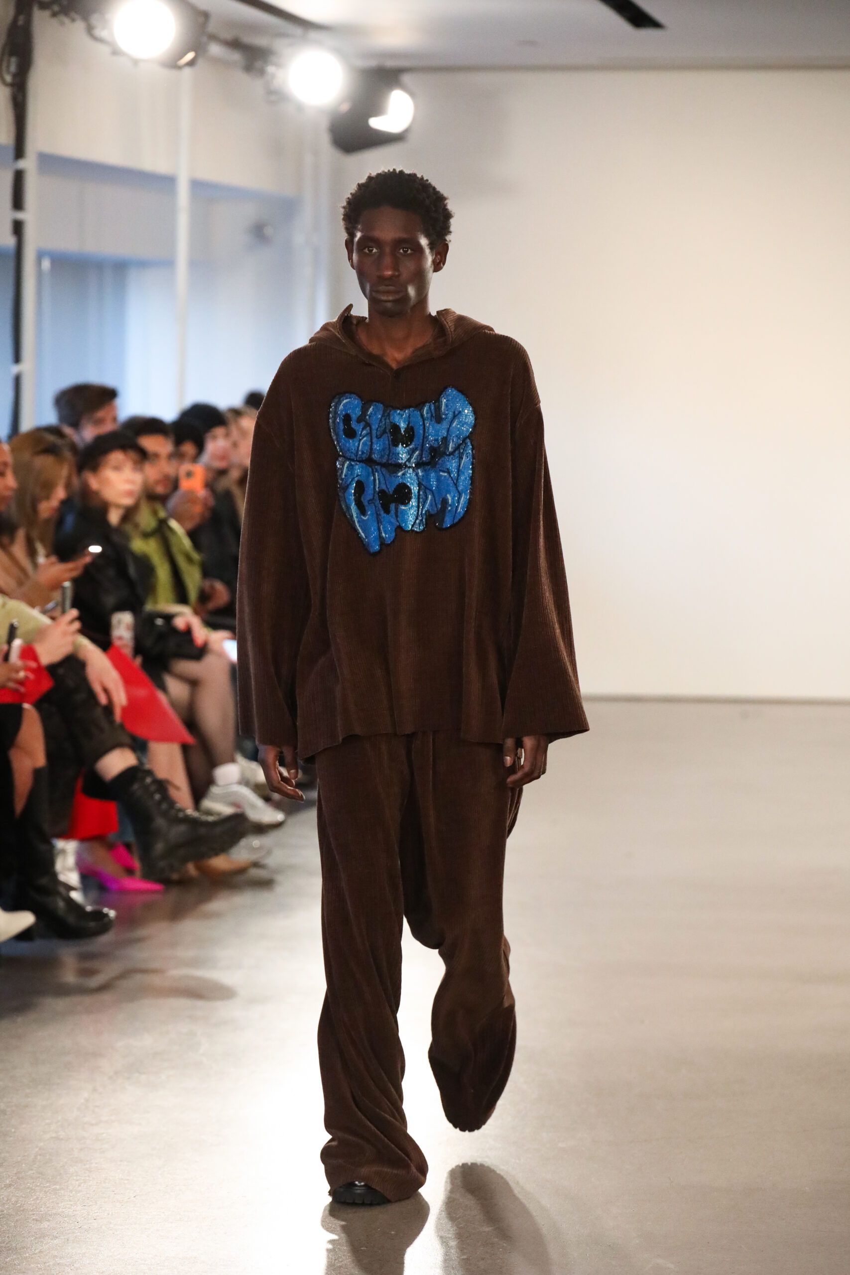 L’esprit est une entité prolifique, une prairie regorgeant de bizarreries. Certaines sont des biomorphes, qui confèrent à des phénomènes visuels banals des formes idiosyncrasiques, tandis que d’autres défient toute logique et toute limite pour libérer une cacophonie désinhibée d’images violemment euphoriques et appellent un besoin primordial de voir audelà du domaine des possibilités. KGL explore la complexité des pensées et des sentiments dans sa collection FW ’23 Agrestal Mind, tout en gardant intacte l’essence du paradoxe qui traverse l’éthique du design de la marque. Les lignes et les limites oscillent entre courbes douces et bords déchiquetés, tandis que les surfaces sont surchargées d’une riche pléthore de textures, à la fois tactiles et visuelles. Des tons neutres et tranquilles servent de base à la prolifération de bleus et de teintes viridiennes, tandis que des accents de roses et de jaunes éclatants les revigorent, ajoutant une nouvelle profondeur et de nouvelles perspectives. Une créature aux multiples facettes sert de mascotte pour la saison – concoctée comme une représentation de la curiosité innée et de la malléabilité de la psyché. Des versions tordues et alambiquées des grilles uniformes et des rayures apaisantes ornent les imprimés et les broderies, imitant la nature dans sa forme la plus sauvage et incontrôlée. Les proportions sont jouées de manière arbitraire et les éléments se bloquent les uns les autres pour être abrupts et fragmentés. Au milieu des tissus, on peut trouver des textures brillantes, des points décoratifs et des bordures de cuir renforcées. Grâce à un mélange d’éléments psychédéliques simples et de fleurs extravagantes de motifs brodés, de pièces décontractées et classiquement taillées, la dichotomie d’une imagination active est mise en avant. Une fête pour une personne qui se transforme en ruine, une créature émanant d’une boule à facettes qui scintille dans l’esprit, des fleurs qui agissent comme des portails de transformation : tout est aussi réel que possible dans le royaume infini de l’esprit.