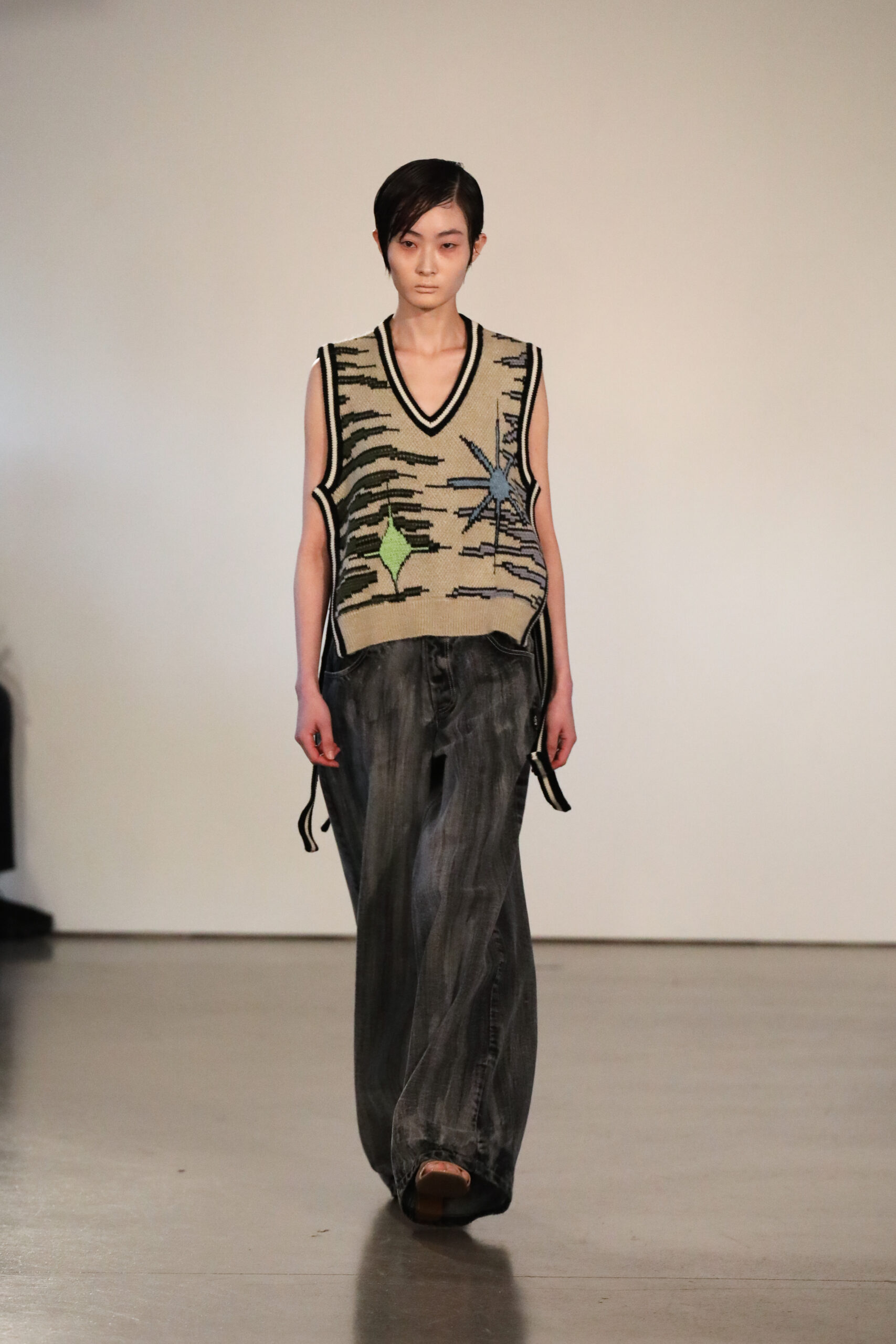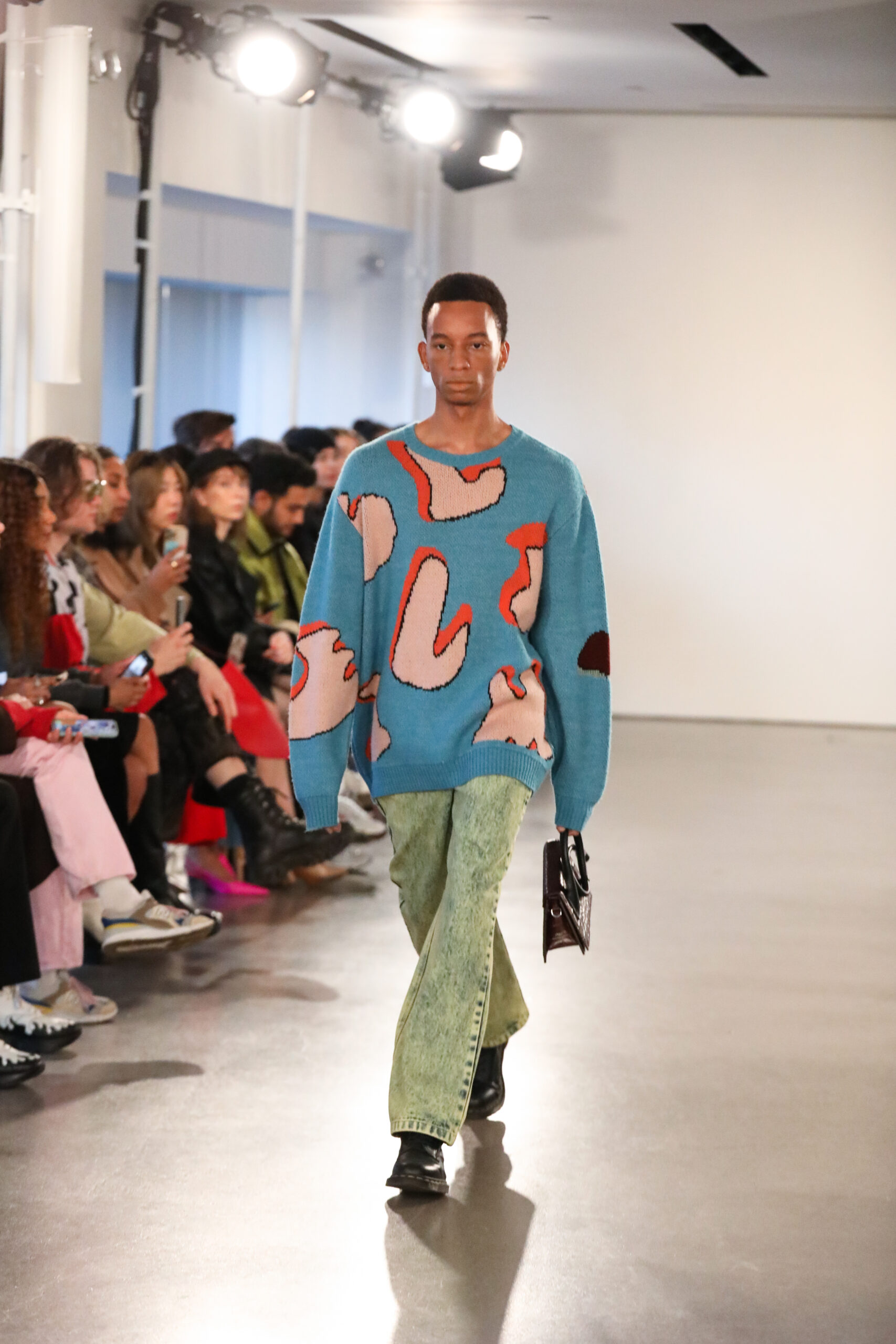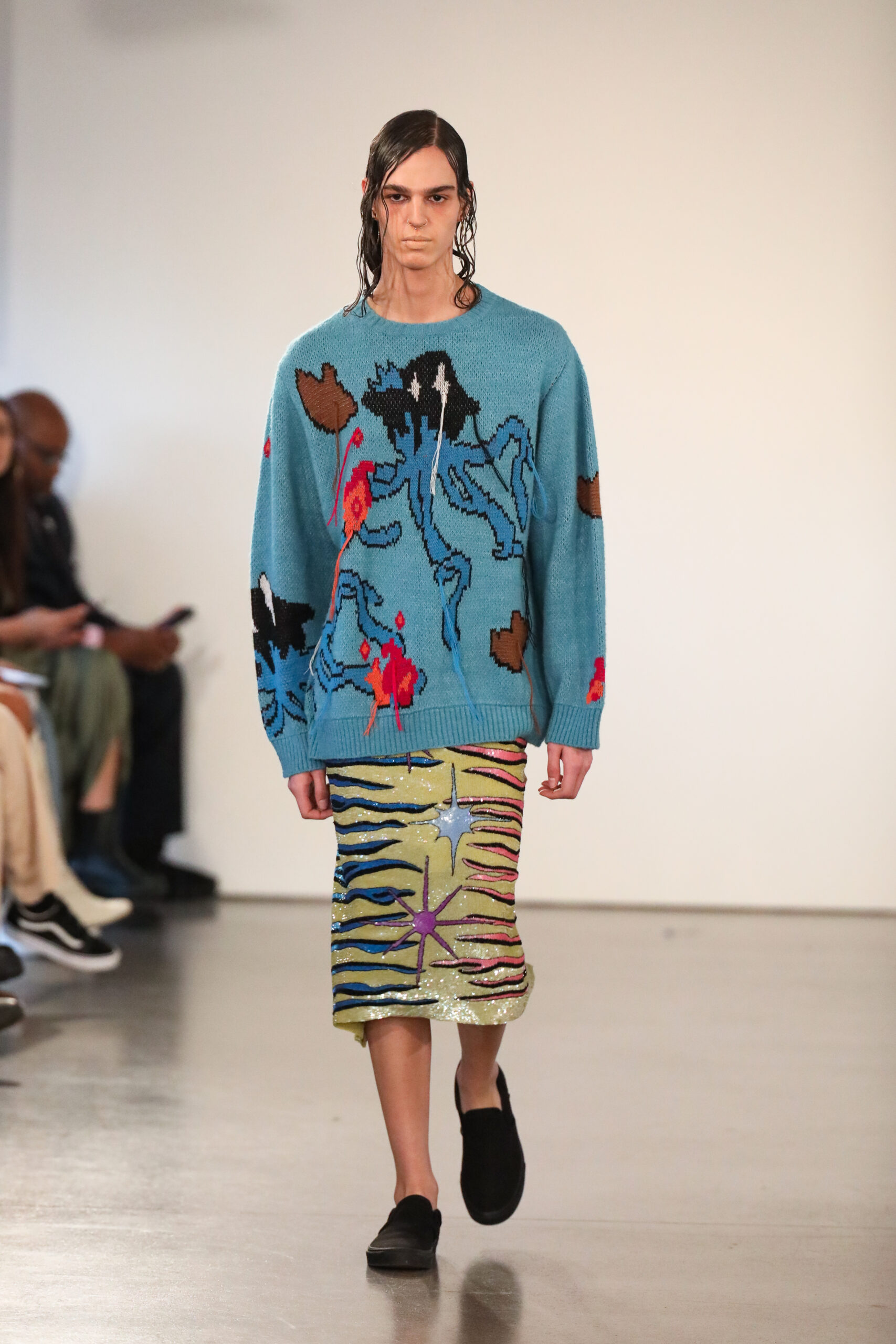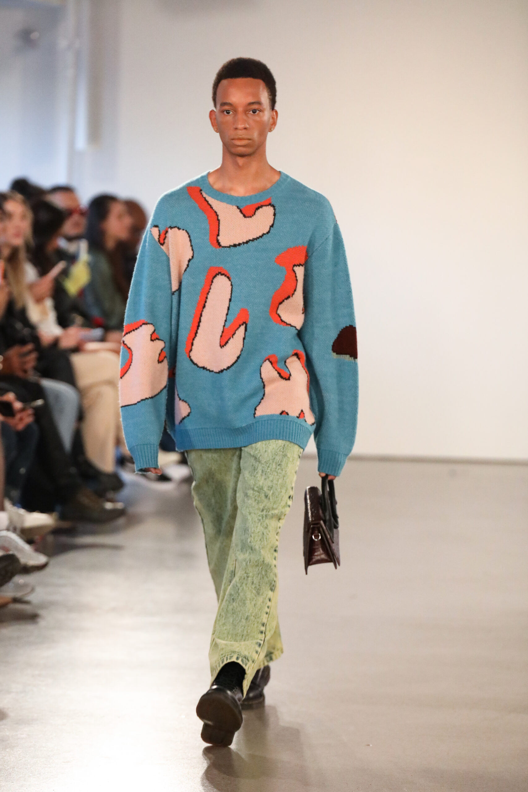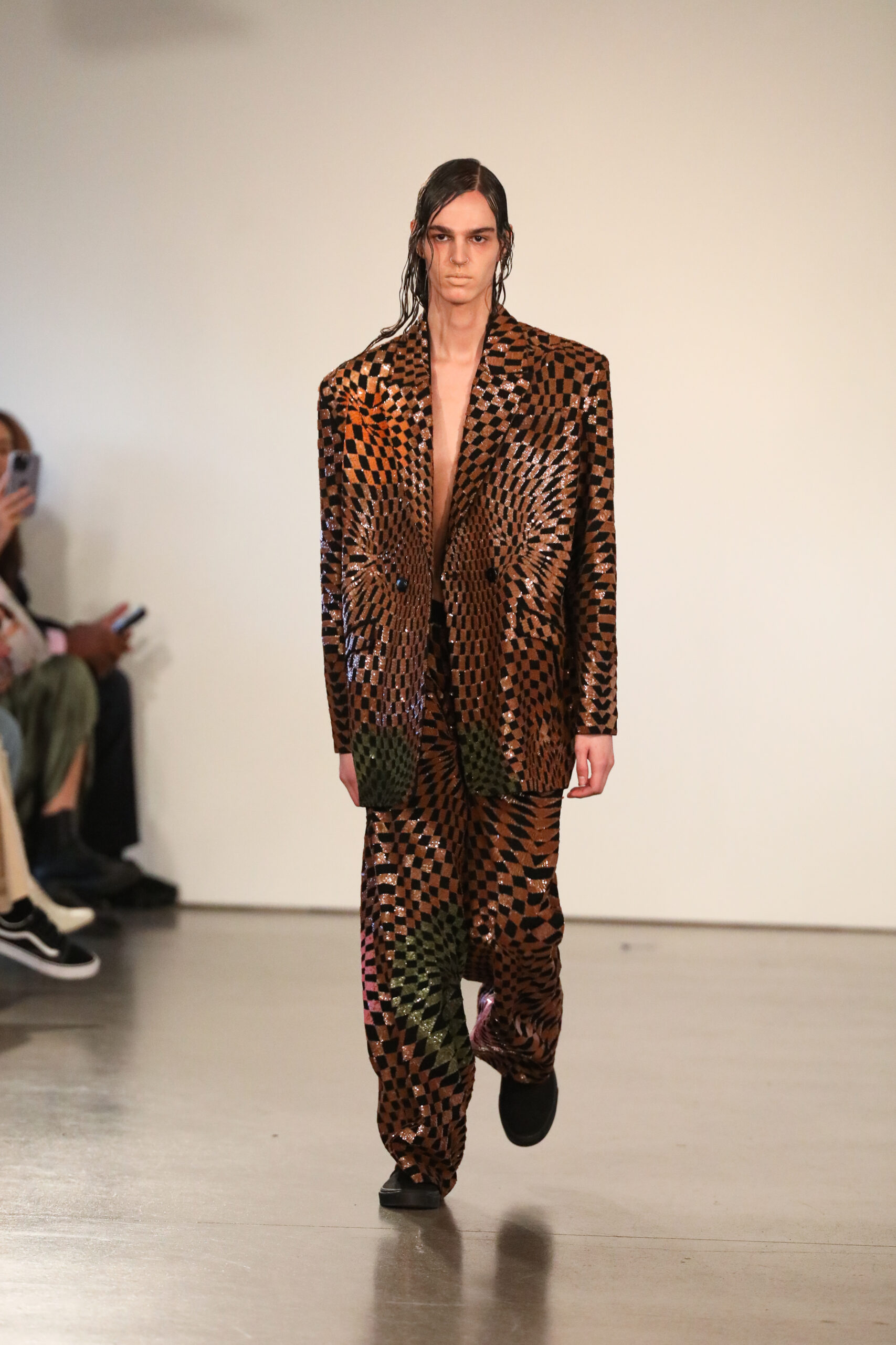 L’esprit est une entité prolifique, une prairie regorgeant de bizarreries. Certaines sont des biomorphes, qui confèrent à des phénomènes visuels banals des formes idiosyncrasiques, tandis que d’autres défient toute logique et toute limite pour libérer une cacophonie désinhibée d’images violemment euphoriques et appellent un besoin primordial de voir audelà du domaine des possibilités. KGL explore la complexité des pensées et des sentiments dans sa collection FW ’23 Agrestal Mind, tout en gardant intacte l’essence du paradoxe qui traverse l’éthique du design de la marque. Les lignes et les limites oscillent entre courbes douces et bords déchiquetés, tandis que les surfaces sont surchargées d’une riche pléthore de textures, à la fois tactiles et visuelles. Des tons neutres et tranquilles servent de base à la prolifération de bleus et de teintes viridiennes, tandis que des accents de roses et de jaunes éclatants les revigorent, ajoutant une nouvelle profondeur et de nouvelles perspectives. Une créature aux multiples facettes sert de mascotte pour la saison – concoctée comme une représentation de la curiosité innée et de la malléabilité de la psyché. Des versions tordues et alambiquées des grilles uniformes et des rayures apaisantes ornent les imprimés et les broderies, imitant la nature dans sa forme la plus sauvage et incontrôlée. Les proportions sont jouées de manière arbitraire et les éléments se bloquent les uns les autres pour être abrupts et fragmentés. Au milieu des tissus, on peut trouver des textures brillantes, des points décoratifs et des bordures de cuir renforcées. Grâce à un mélange d’éléments psychédéliques simples et de fleurs extravagantes de motifs brodés, de pièces décontractées et classiquement taillées, la dichotomie d’une imagination active est mise en avant. Une fête pour une personne qui se transforme en ruine, une créature émanant d’une boule à facettes qui scintille dans l’esprit, des fleurs qui agissent comme des portails de transformation : tout est aussi réel que possible dans le royaume infini de l’esprit.