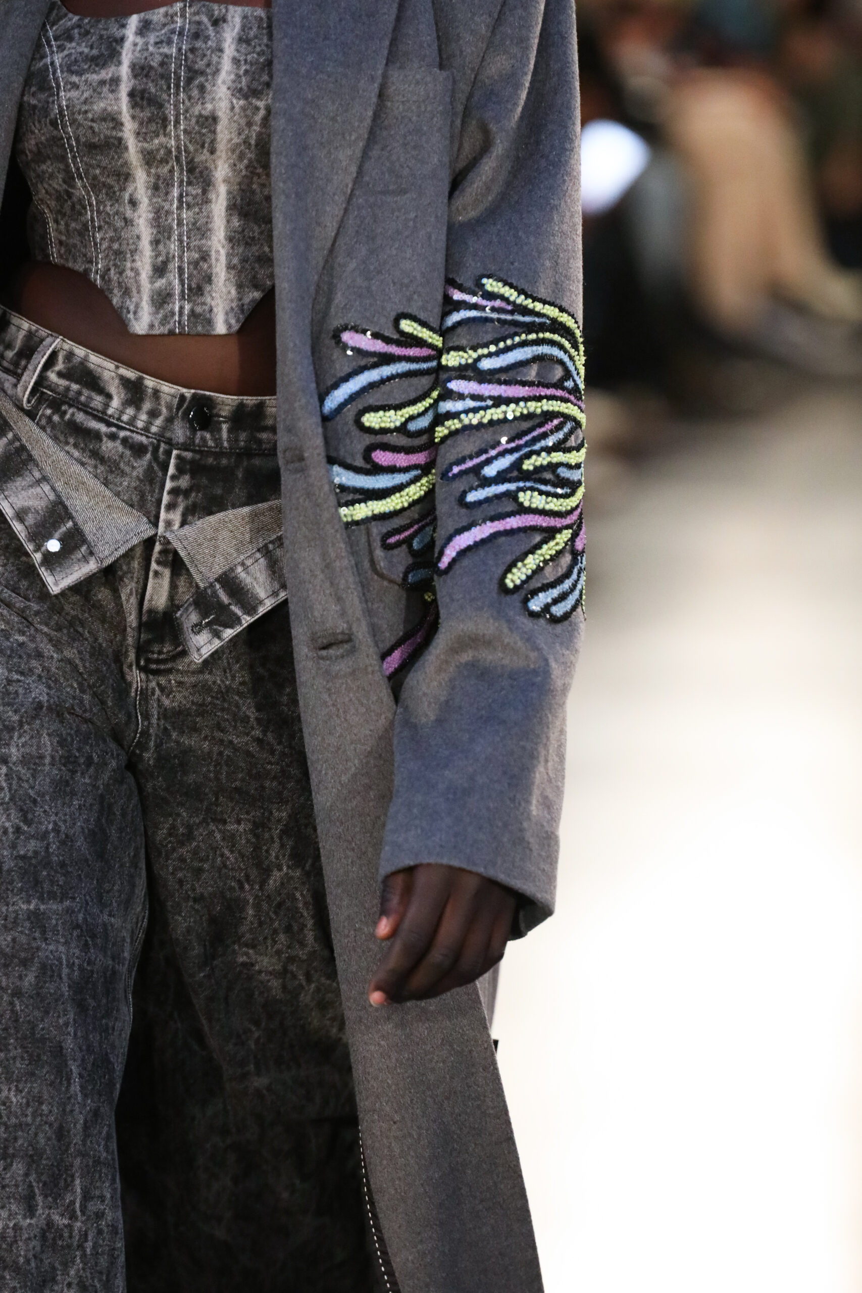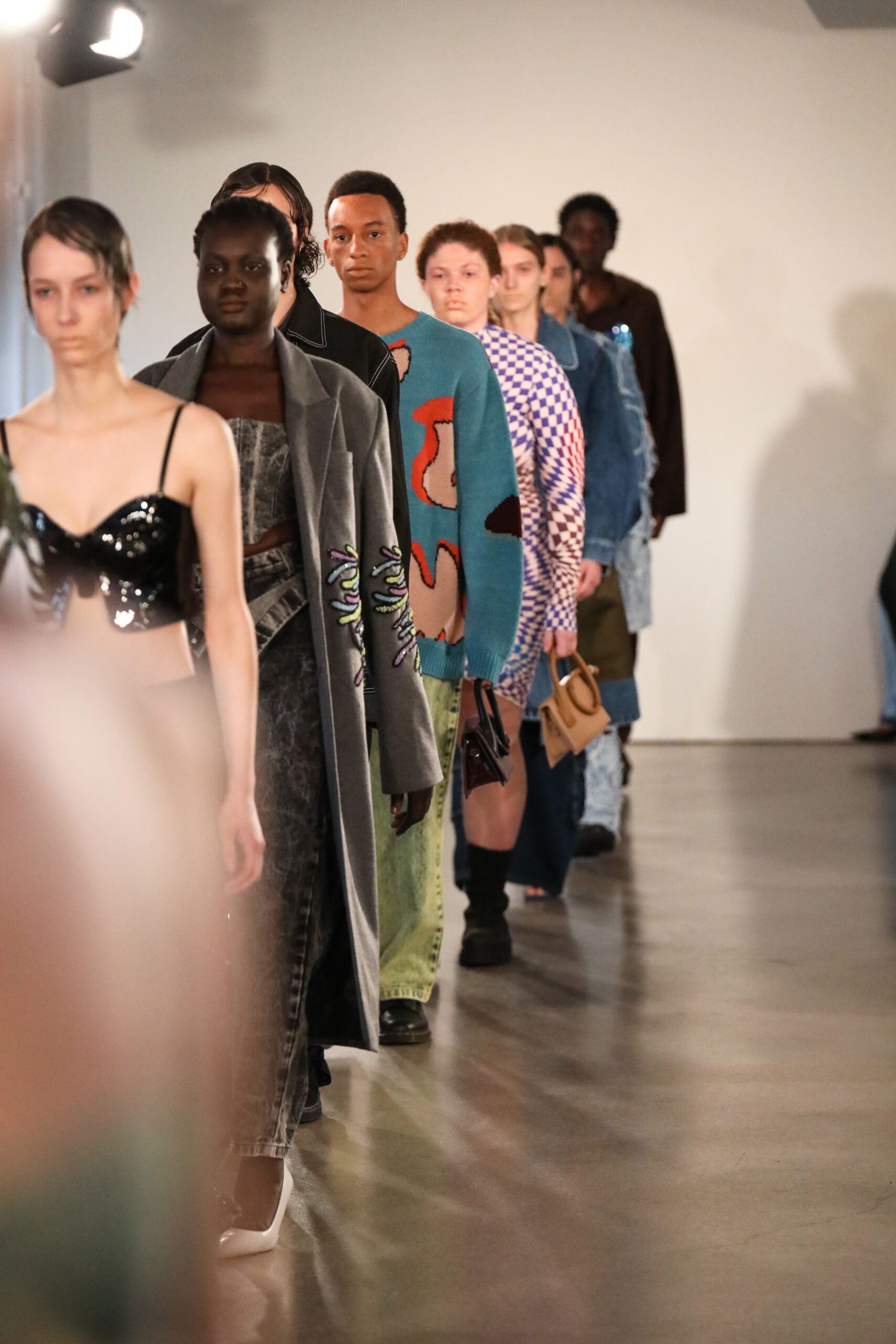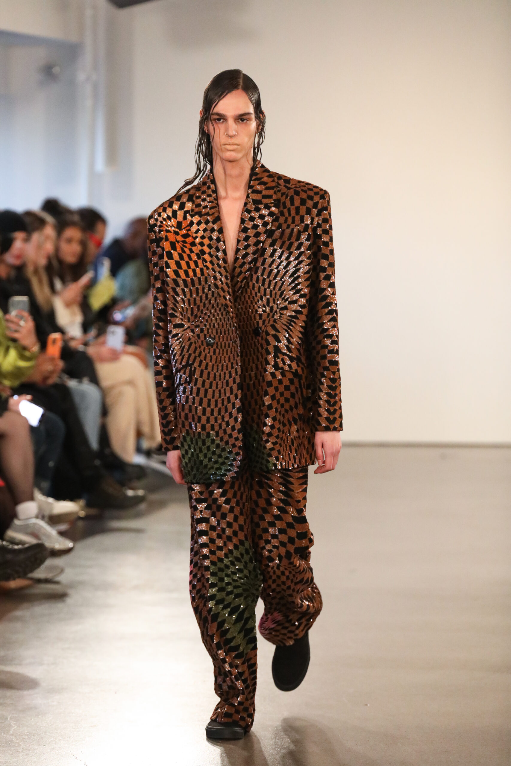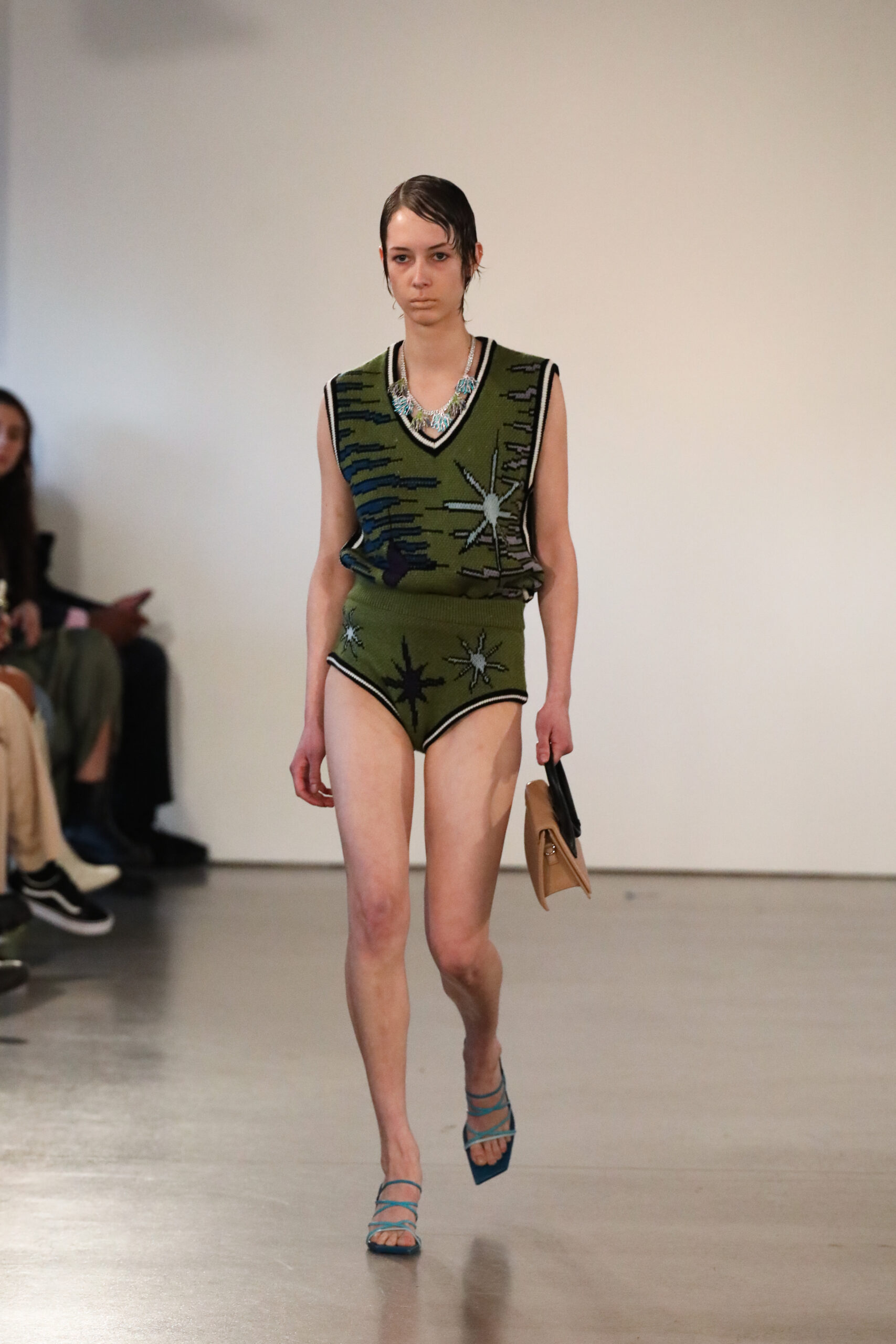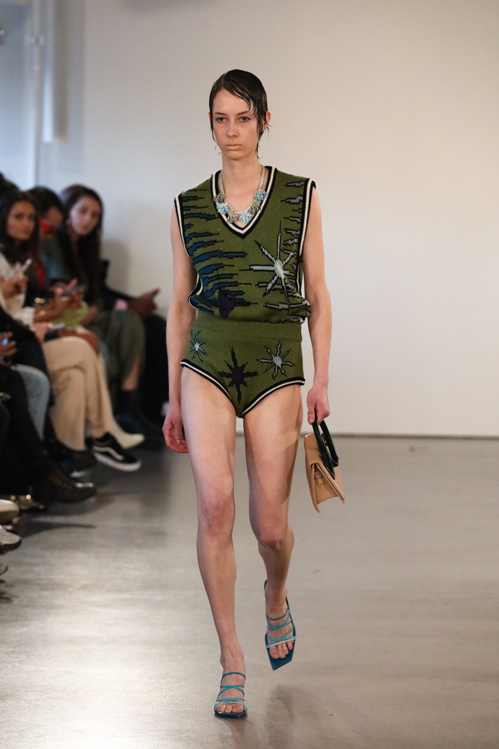 L’esprit est une entité prolifique, une prairie regorgeant de bizarreries. Certaines sont des biomorphes, qui confèrent à des phénomènes visuels banals des formes idiosyncrasiques, tandis que d’autres défient toute logique et toute limite pour libérer une cacophonie désinhibée d’images violemment euphoriques et appellent un besoin primordial de voir audelà du domaine des possibilités. KGL explore la complexité des pensées et des sentiments dans sa collection FW ’23 Agrestal Mind, tout en gardant intacte l’essence du paradoxe qui traverse l’éthique du design de la marque. Les lignes et les limites oscillent entre courbes douces et bords déchiquetés, tandis que les surfaces sont surchargées d’une riche pléthore de textures, à la fois tactiles et visuelles. Des tons neutres et tranquilles servent de base à la prolifération de bleus et de teintes viridiennes, tandis que des accents de roses et de jaunes éclatants les revigorent, ajoutant une nouvelle profondeur et de nouvelles perspectives. Une créature aux multiples facettes sert de mascotte pour la saison – concoctée comme une représentation de la curiosité innée et de la malléabilité de la psyché. Des versions tordues et alambiquées des grilles uniformes et des rayures apaisantes ornent les imprimés et les broderies, imitant la nature dans sa forme la plus sauvage et incontrôlée. Les proportions sont jouées de manière arbitraire et les éléments se bloquent les uns les autres pour être abrupts et fragmentés. Au milieu des tissus, on peut trouver des textures brillantes, des points décoratifs et des bordures de cuir renforcées. Grâce à un mélange d’éléments psychédéliques simples et de fleurs extravagantes de motifs brodés, de pièces décontractées et classiquement taillées, la dichotomie d’une imagination active est mise en avant. Une fête pour une personne qui se transforme en ruine, une créature émanant d’une boule à facettes qui scintille dans l’esprit, des fleurs qui agissent comme des portails de transformation : tout est aussi réel que possible dans le royaume infini de l’esprit.