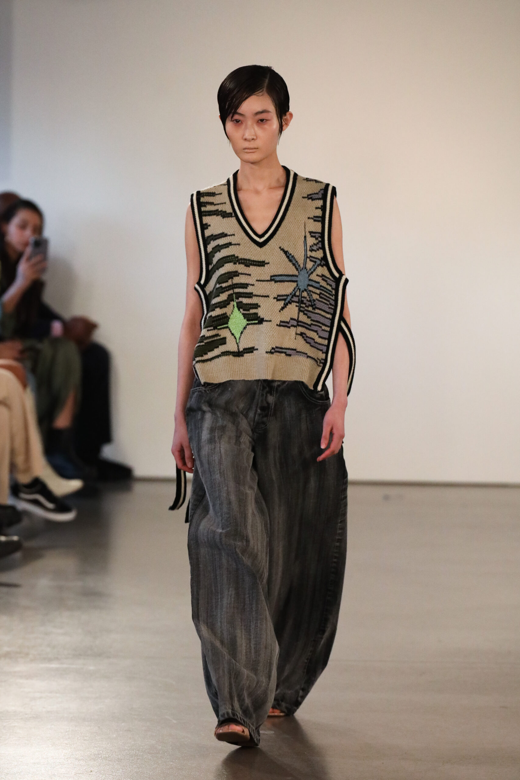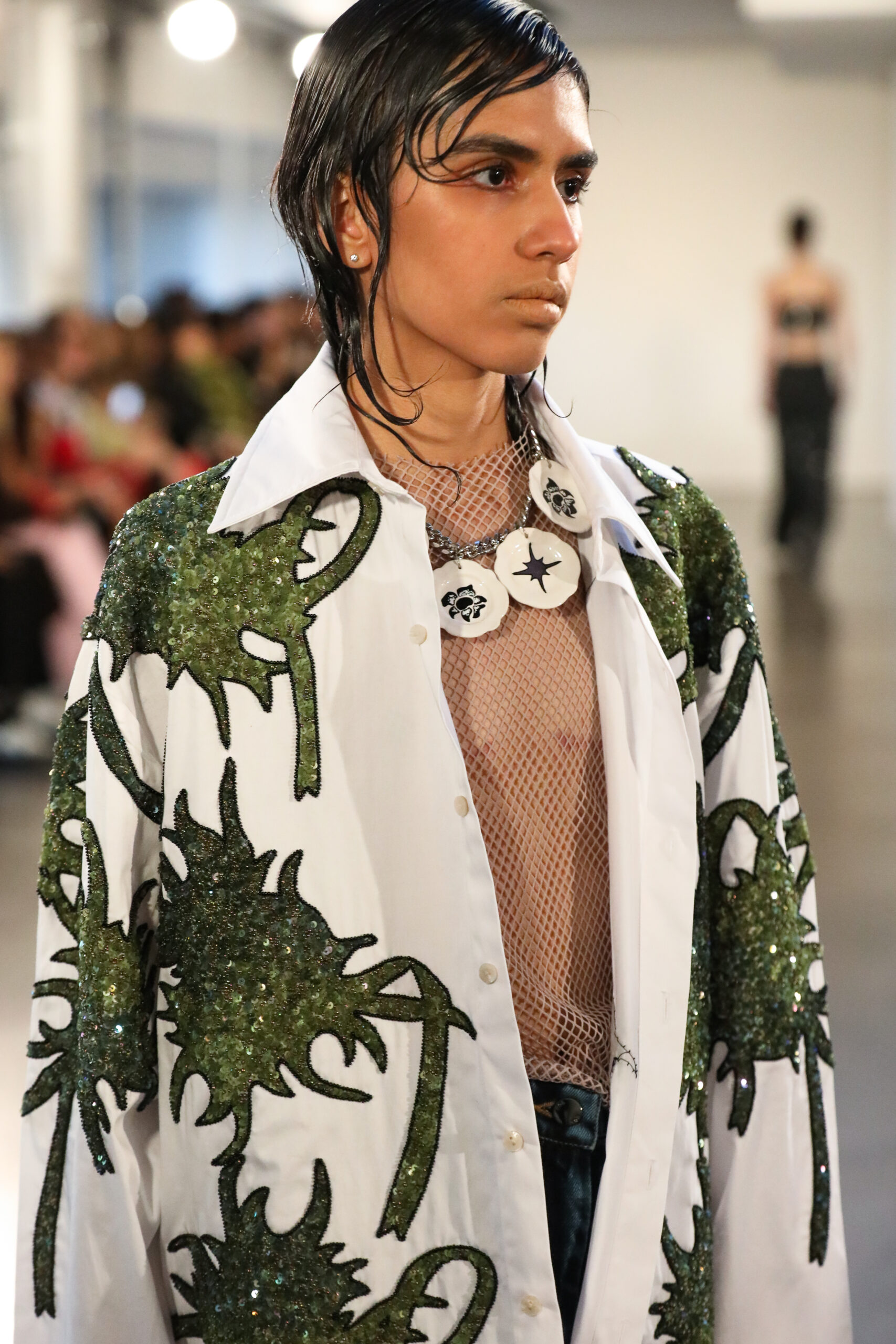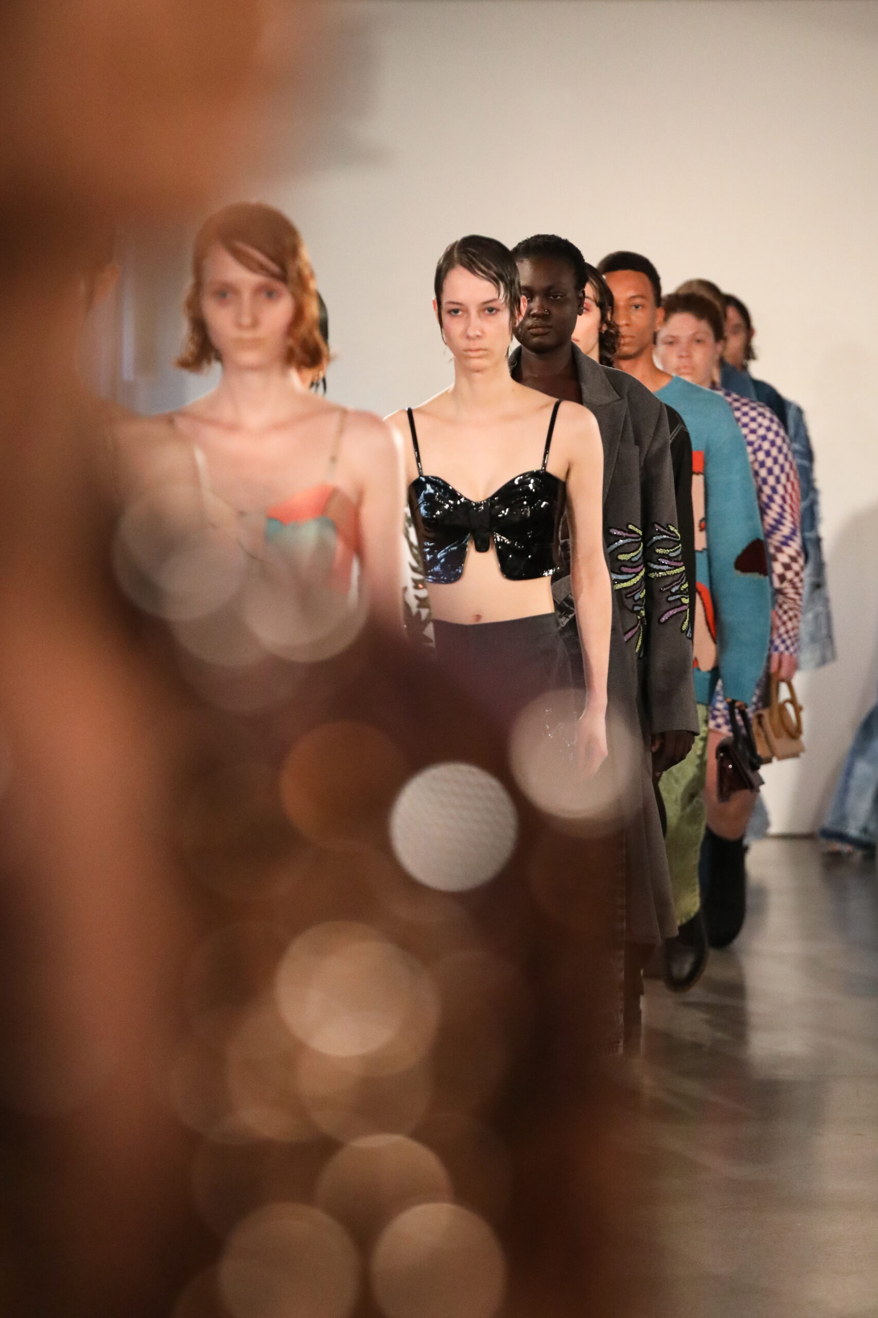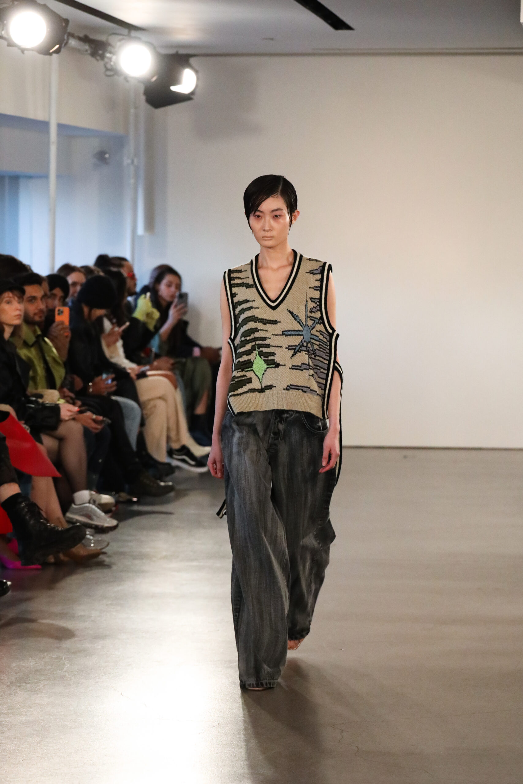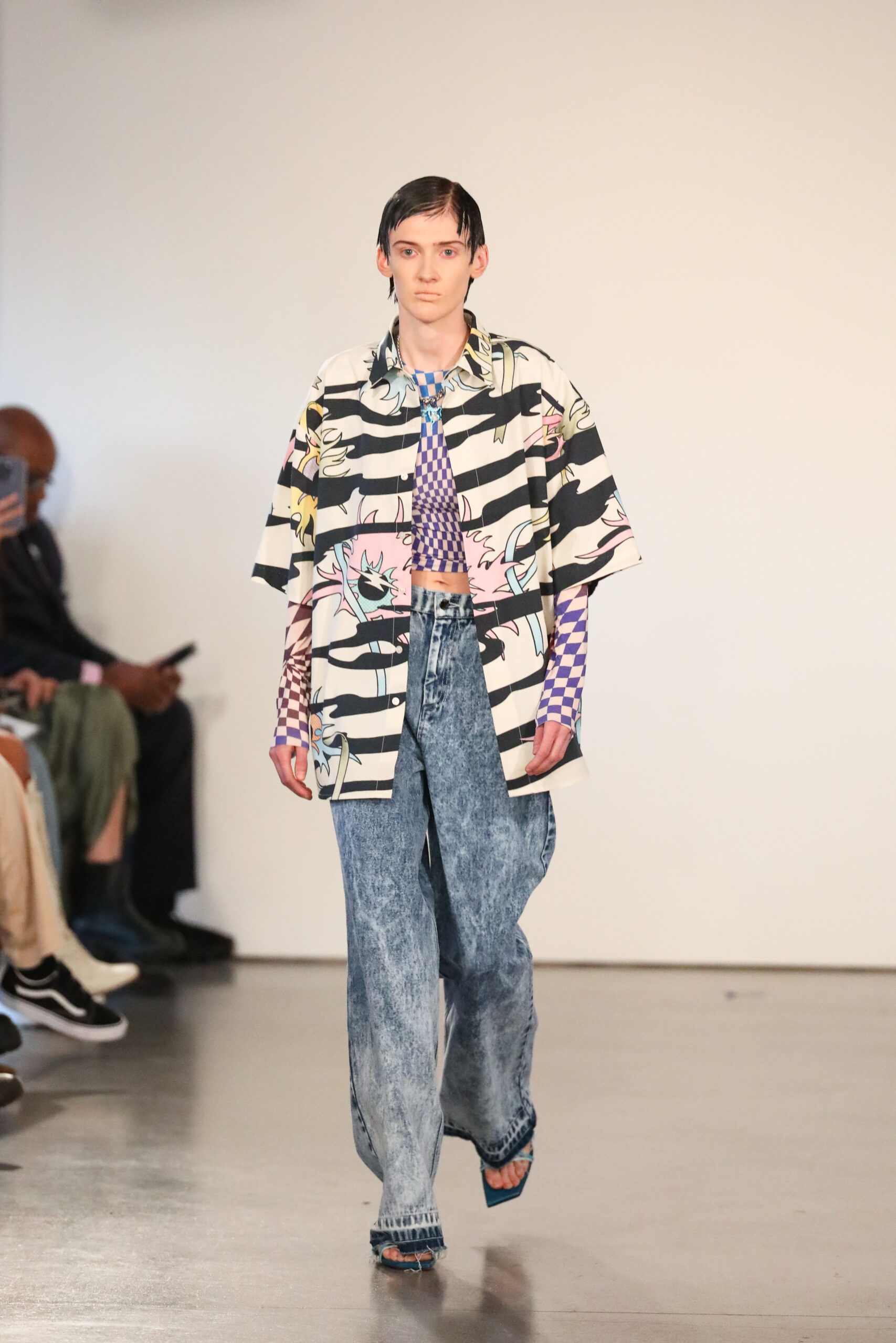L’esprit est une entité prolifique, une prairie regorgeant de bizarreries. Certaines sont des biomorphes, qui confèrent à des phénomènes visuels banals des formes idiosyncrasiques, tandis que d’autres défient toute logique et toute limite pour libérer une cacophonie désinhibée d’images violemment euphoriques et appellent un besoin primordial de voir audelà du domaine des possibilités. KGL explore la complexité des pensées et des sentiments dans sa collection FW ’23 Agrestal Mind, tout en gardant intacte l’essence du paradoxe qui traverse l’éthique du design de la marque. Les lignes et les limites oscillent entre courbes douces et bords déchiquetés, tandis que les surfaces sont surchargées d’une riche pléthore de textures, à la fois tactiles et visuelles. Des tons neutres et tranquilles servent de base à la prolifération de bleus et de teintes viridiennes, tandis que des accents de roses et de jaunes éclatants les revigorent, ajoutant une nouvelle profondeur et de nouvelles perspectives. Une créature aux multiples facettes sert de mascotte pour la saison – concoctée comme une représentation de la curiosité innée et de la malléabilité de la psyché. Des versions tordues et alambiquées des grilles uniformes et des rayures apaisantes ornent les imprimés et les broderies, imitant la nature dans sa forme la plus sauvage et incontrôlée. Les proportions sont jouées de manière arbitraire et les éléments se bloquent les uns les autres pour être abrupts et fragmentés. Au milieu des tissus, on peut trouver des textures brillantes, des points décoratifs et des bordures de cuir renforcées. Grâce à un mélange d’éléments psychédéliques simples et de fleurs extravagantes de motifs brodés, de pièces décontractées et classiquement taillées, la dichotomie d’une imagination active est mise en avant. Une fête pour une personne qui se transforme en ruine, une créature émanant d’une boule à facettes qui scintille dans l’esprit, des fleurs qui agissent comme des portails de transformation : tout est aussi réel que possible dans le royaume infini de l’esprit.