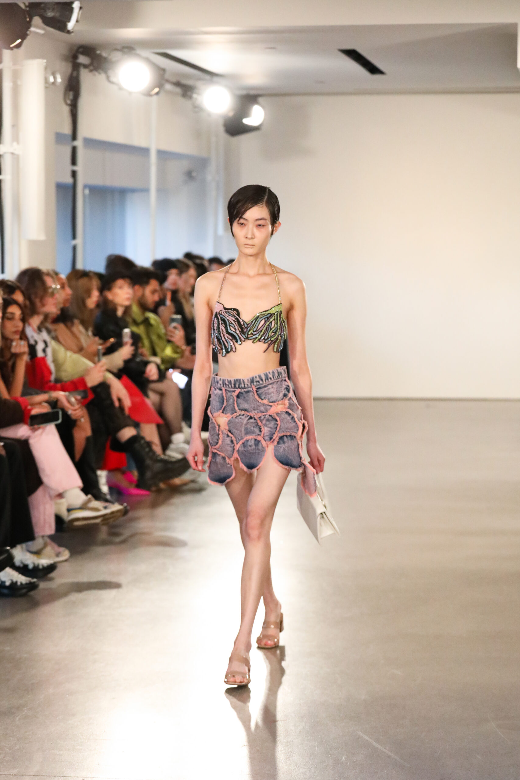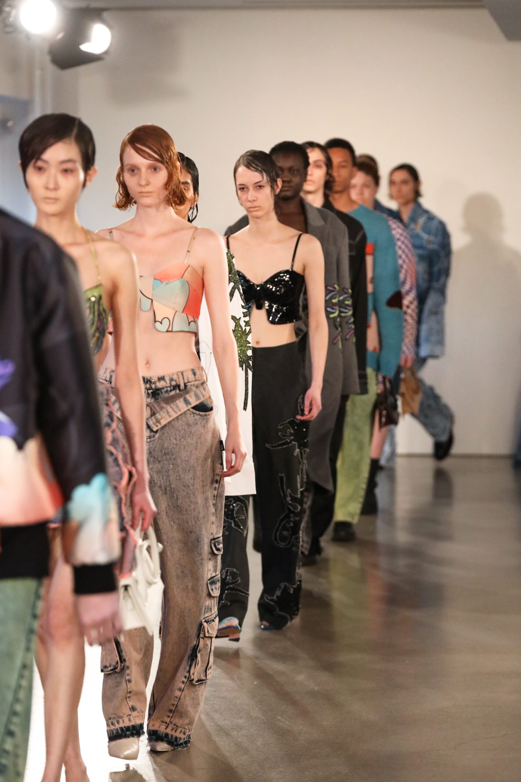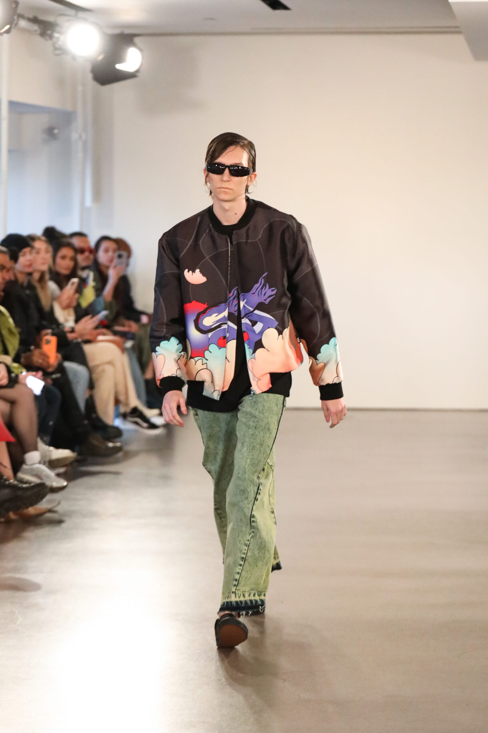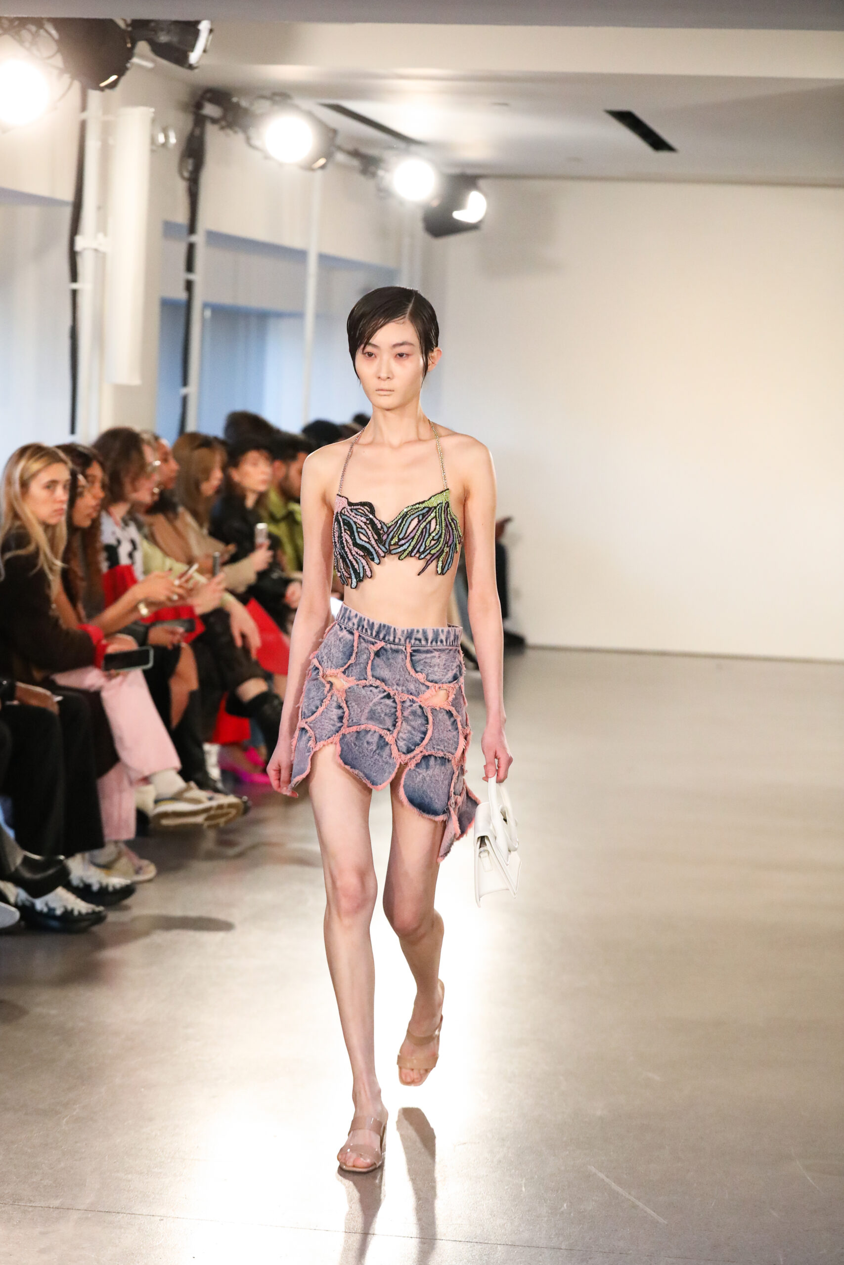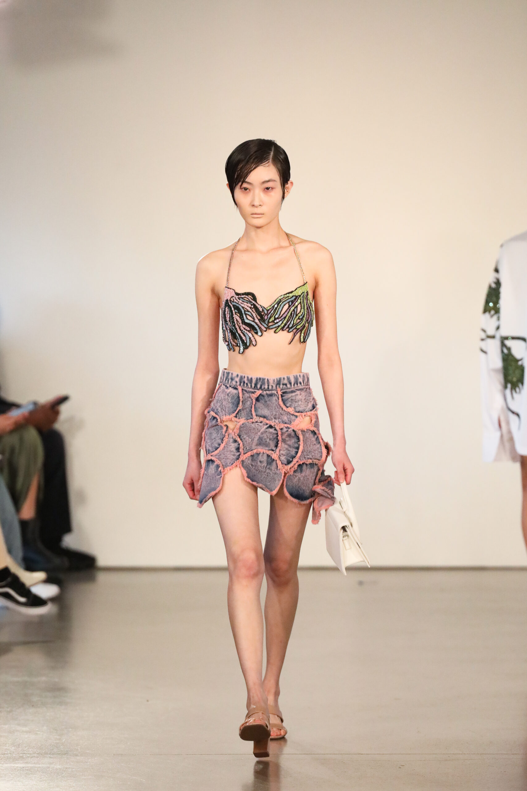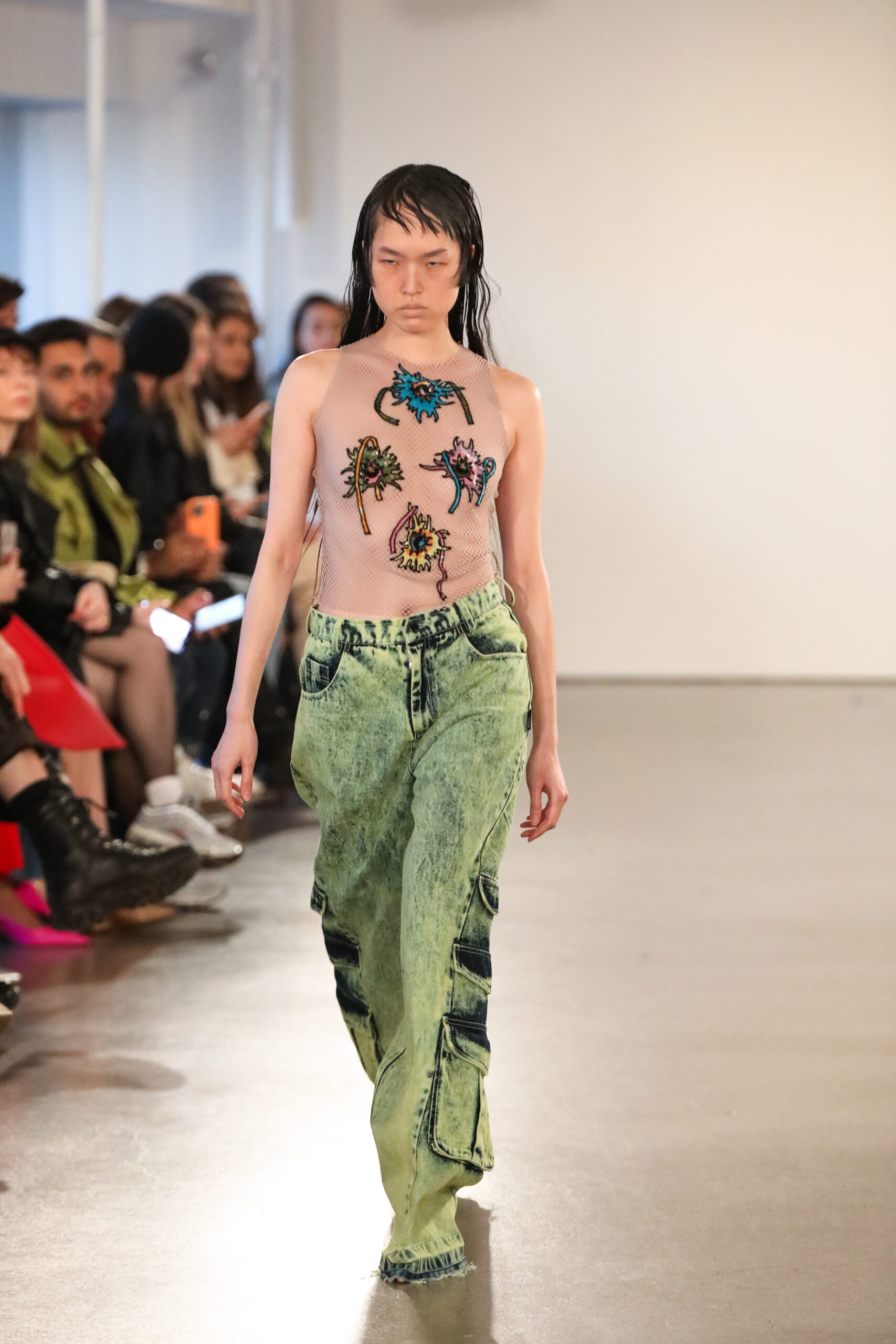 L’esprit est une entité prolifique, une prairie regorgeant de bizarreries. Certaines sont des biomorphes, qui confèrent à des phénomènes visuels banals des formes idiosyncrasiques, tandis que d’autres défient toute logique et toute limite pour libérer une cacophonie désinhibée d’images violemment euphoriques et appellent un besoin primordial de voir audelà du domaine des possibilités. KGL explore la complexité des pensées et des sentiments dans sa collection FW ’23 Agrestal Mind, tout en gardant intacte l’essence du paradoxe qui traverse l’éthique du design de la marque. Les lignes et les limites oscillent entre courbes douces et bords déchiquetés, tandis que les surfaces sont surchargées d’une riche pléthore de textures, à la fois tactiles et visuelles. Des tons neutres et tranquilles servent de base à la prolifération de bleus et de teintes viridiennes, tandis que des accents de roses et de jaunes éclatants les revigorent, ajoutant une nouvelle profondeur et de nouvelles perspectives. Une créature aux multiples facettes sert de mascotte pour la saison – concoctée comme une représentation de la curiosité innée et de la malléabilité de la psyché. Des versions tordues et alambiquées des grilles uniformes et des rayures apaisantes ornent les imprimés et les broderies, imitant la nature dans sa forme la plus sauvage et incontrôlée. Les proportions sont jouées de manière arbitraire et les éléments se bloquent les uns les autres pour être abrupts et fragmentés. Au milieu des tissus, on peut trouver des textures brillantes, des points décoratifs et des bordures de cuir renforcées. Grâce à un mélange d’éléments psychédéliques simples et de fleurs extravagantes de motifs brodés, de pièces décontractées et classiquement taillées, la dichotomie d’une imagination active est mise en avant. Une fête pour une personne qui se transforme en ruine, une créature émanant d’une boule à facettes qui scintille dans l’esprit, des fleurs qui agissent comme des portails de transformation : tout est aussi réel que possible dans le royaume infini de l’esprit.