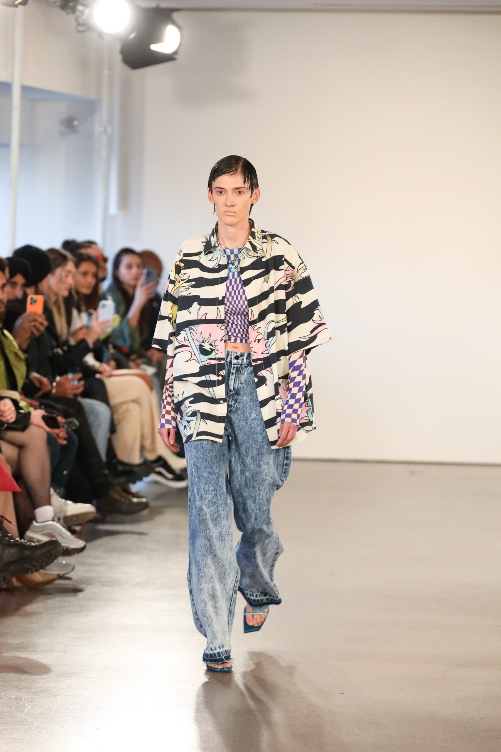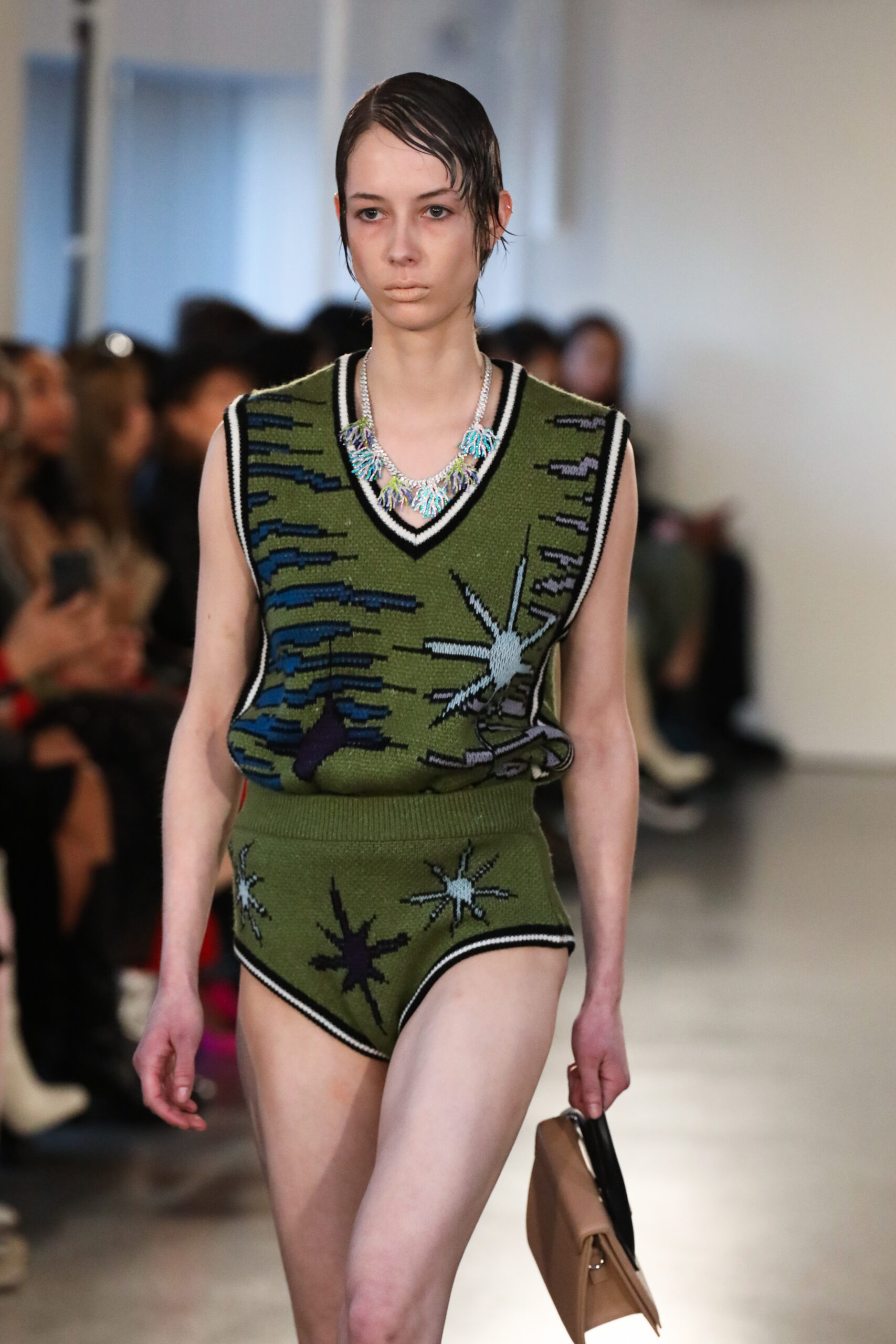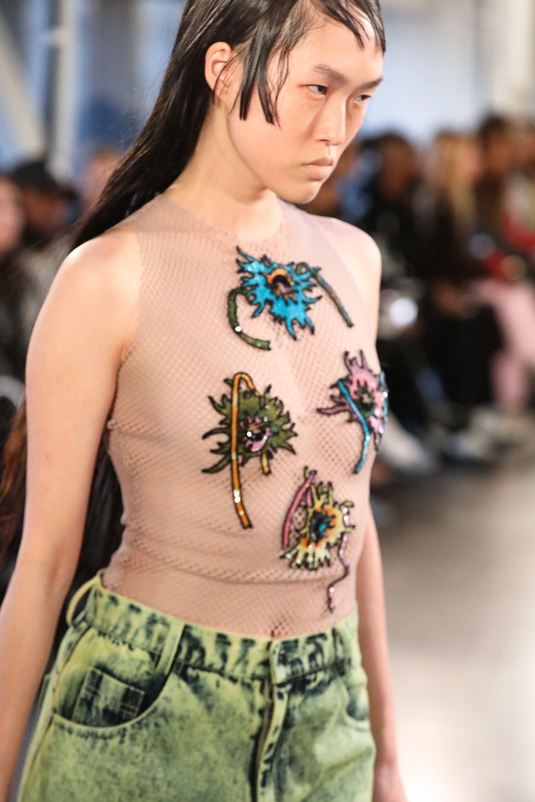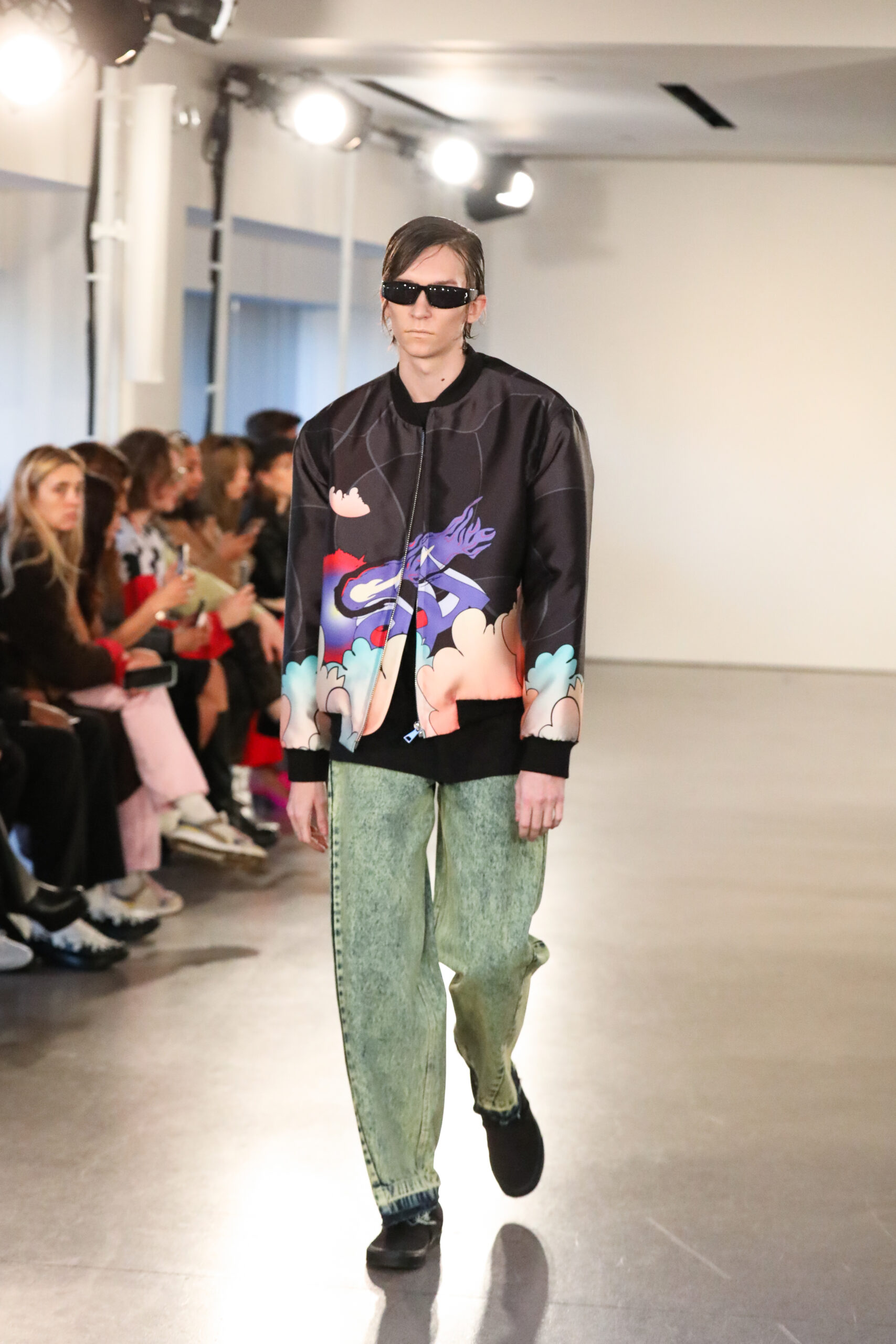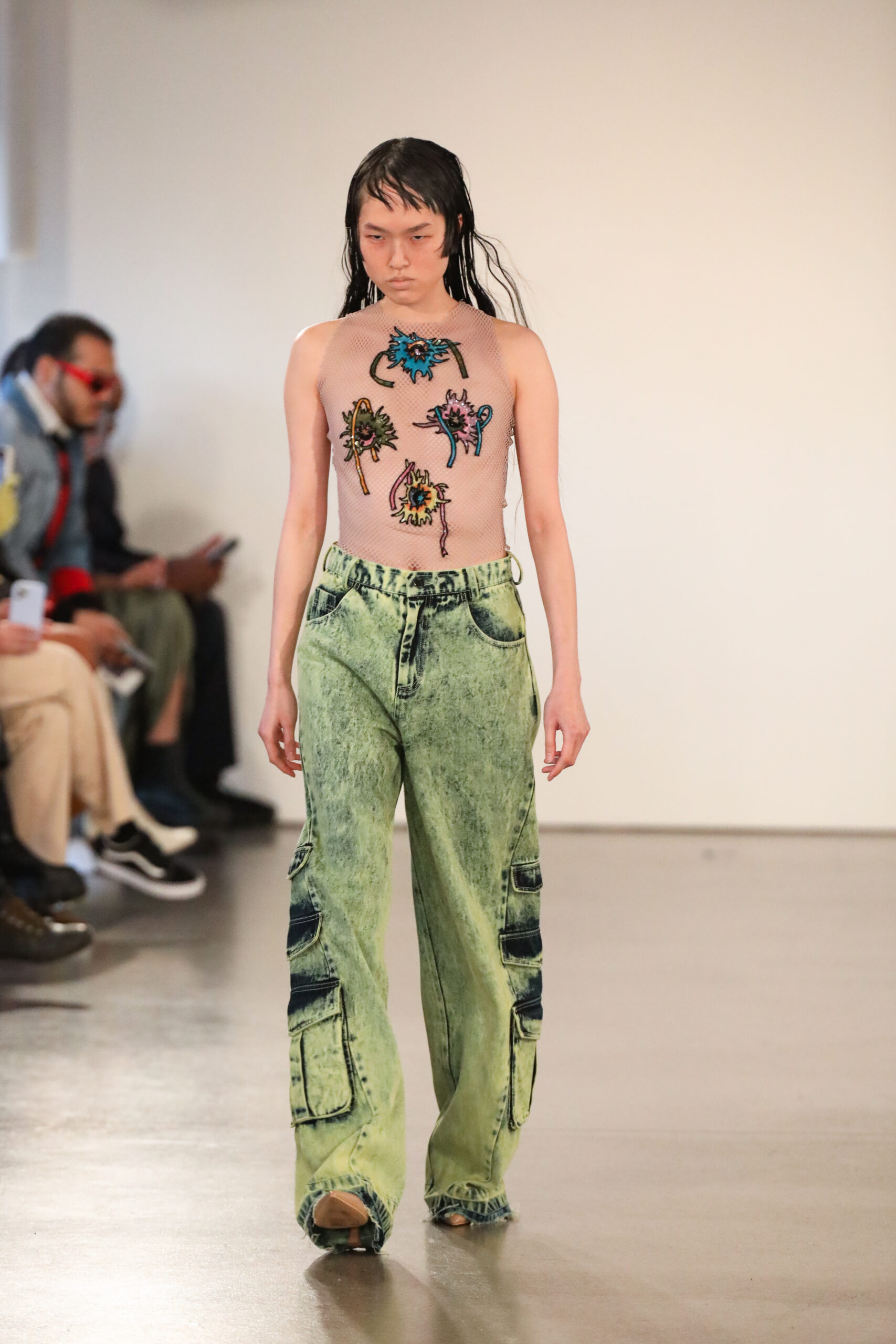 L’esprit est une entité prolifique, une prairie regorgeant de bizarreries. Certaines sont des biomorphes, qui confèrent à des phénomènes visuels banals des formes idiosyncrasiques, tandis que d’autres défient toute logique et toute limite pour libérer une cacophonie désinhibée d’images violemment euphoriques et appellent un besoin primordial de voir audelà du domaine des possibilités. KGL explore la complexité des pensées et des sentiments dans sa collection FW ’23 Agrestal Mind, tout en gardant intacte l’essence du paradoxe qui traverse l’éthique du design de la marque. Les lignes et les limites oscillent entre courbes douces et bords déchiquetés, tandis que les surfaces sont surchargées d’une riche pléthore de textures, à la fois tactiles et visuelles. Des tons neutres et tranquilles servent de base à la prolifération de bleus et de teintes viridiennes, tandis que des accents de roses et de jaunes éclatants les revigorent, ajoutant une nouvelle profondeur et de nouvelles perspectives. Une créature aux multiples facettes sert de mascotte pour la saison – concoctée comme une représentation de la curiosité innée et de la malléabilité de la psyché. Des versions tordues et alambiquées des grilles uniformes et des rayures apaisantes ornent les imprimés et les broderies, imitant la nature dans sa forme la plus sauvage et incontrôlée. Les proportions sont jouées de manière arbitraire et les éléments se bloquent les uns les autres pour être abrupts et fragmentés. Au milieu des tissus, on peut trouver des textures brillantes, des points décoratifs et des bordures de cuir renforcées. Grâce à un mélange d’éléments psychédéliques simples et de fleurs extravagantes de motifs brodés, de pièces décontractées et classiquement taillées, la dichotomie d’une imagination active est mise en avant. Une fête pour une personne qui se transforme en ruine, une créature émanant d’une boule à facettes qui scintille dans l’esprit, des fleurs qui agissent comme des portails de transformation : tout est aussi réel que possible dans le royaume infini de l’esprit.
