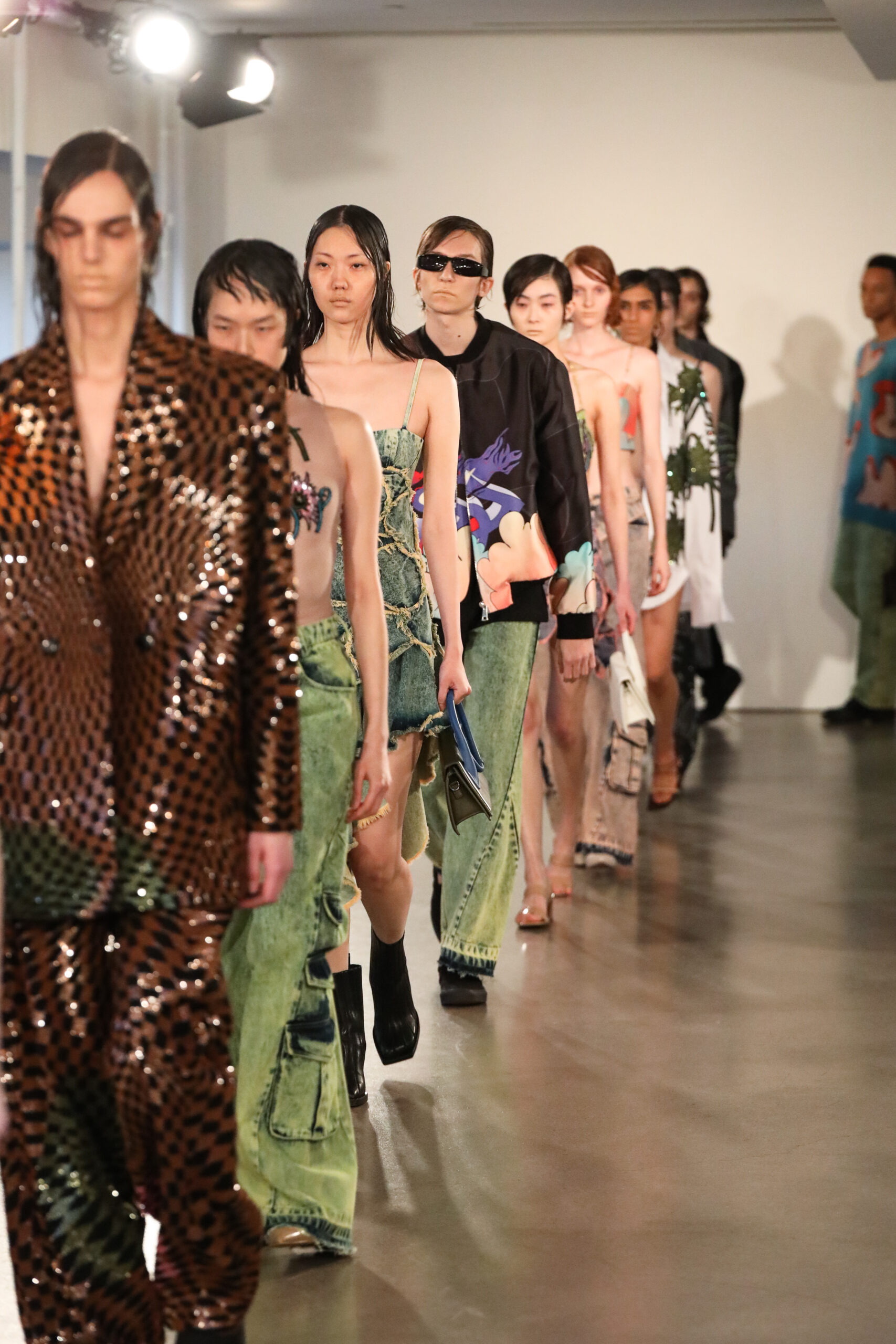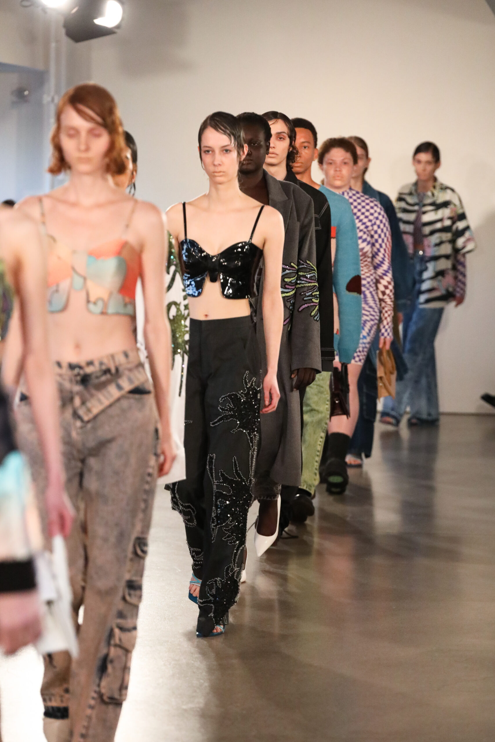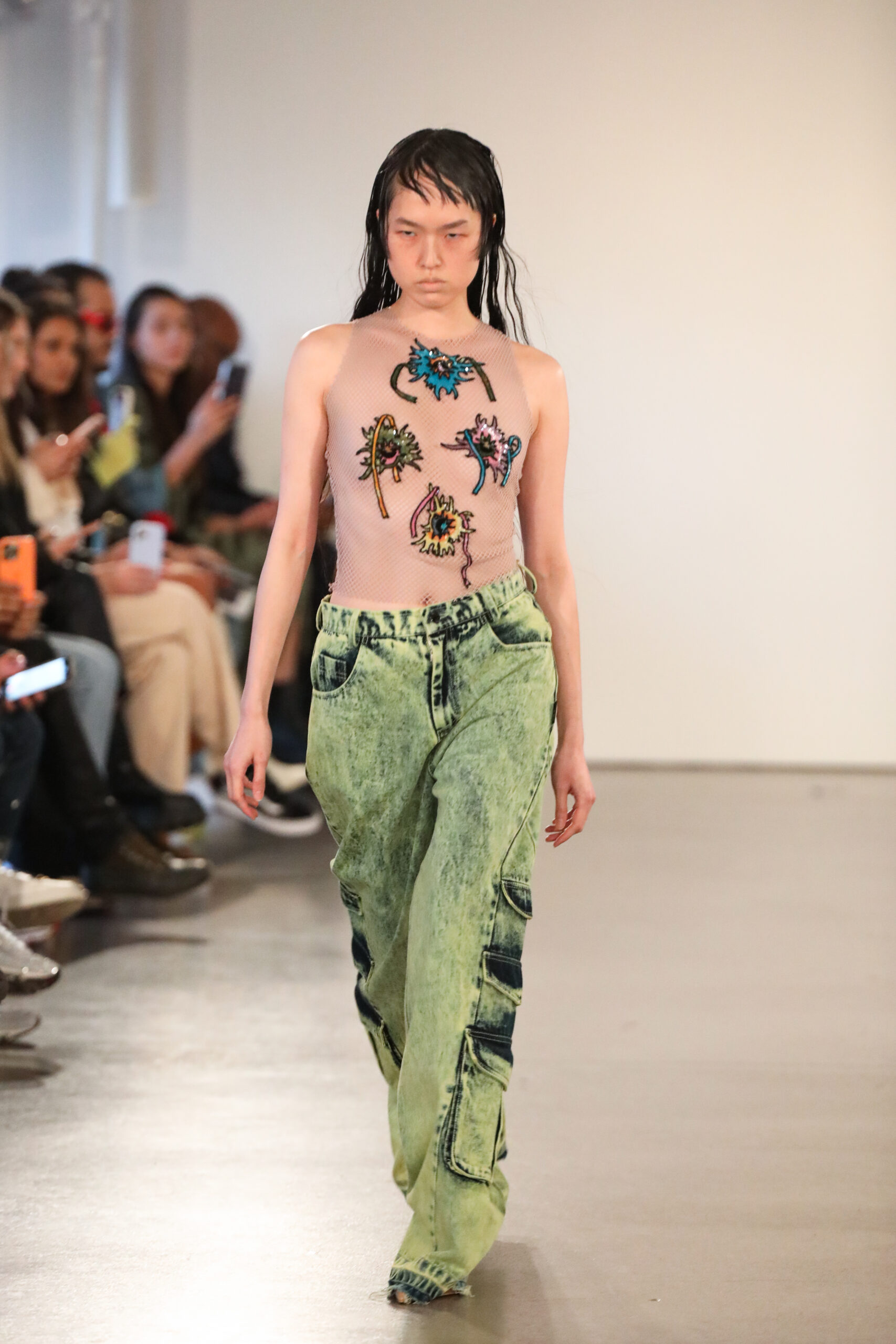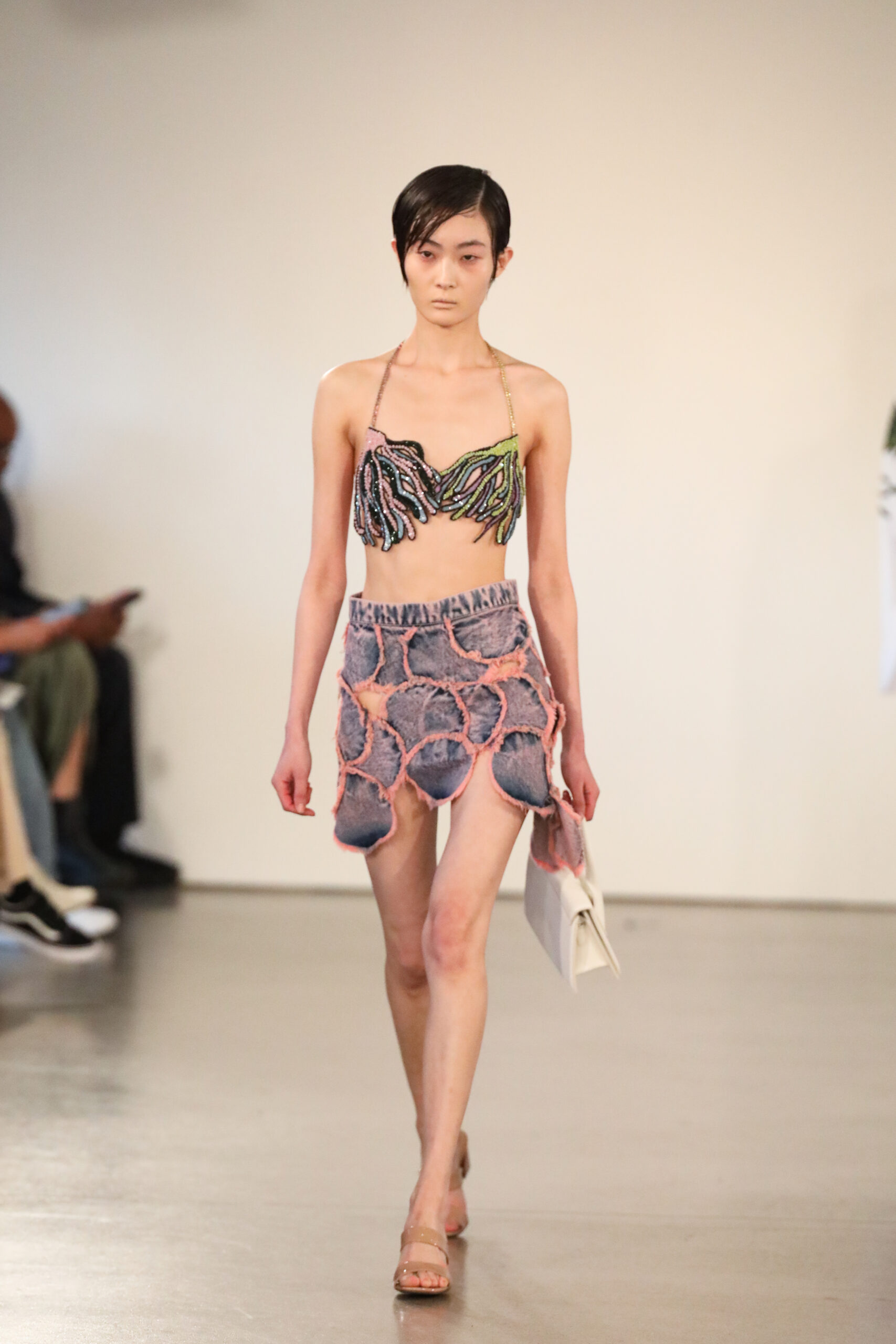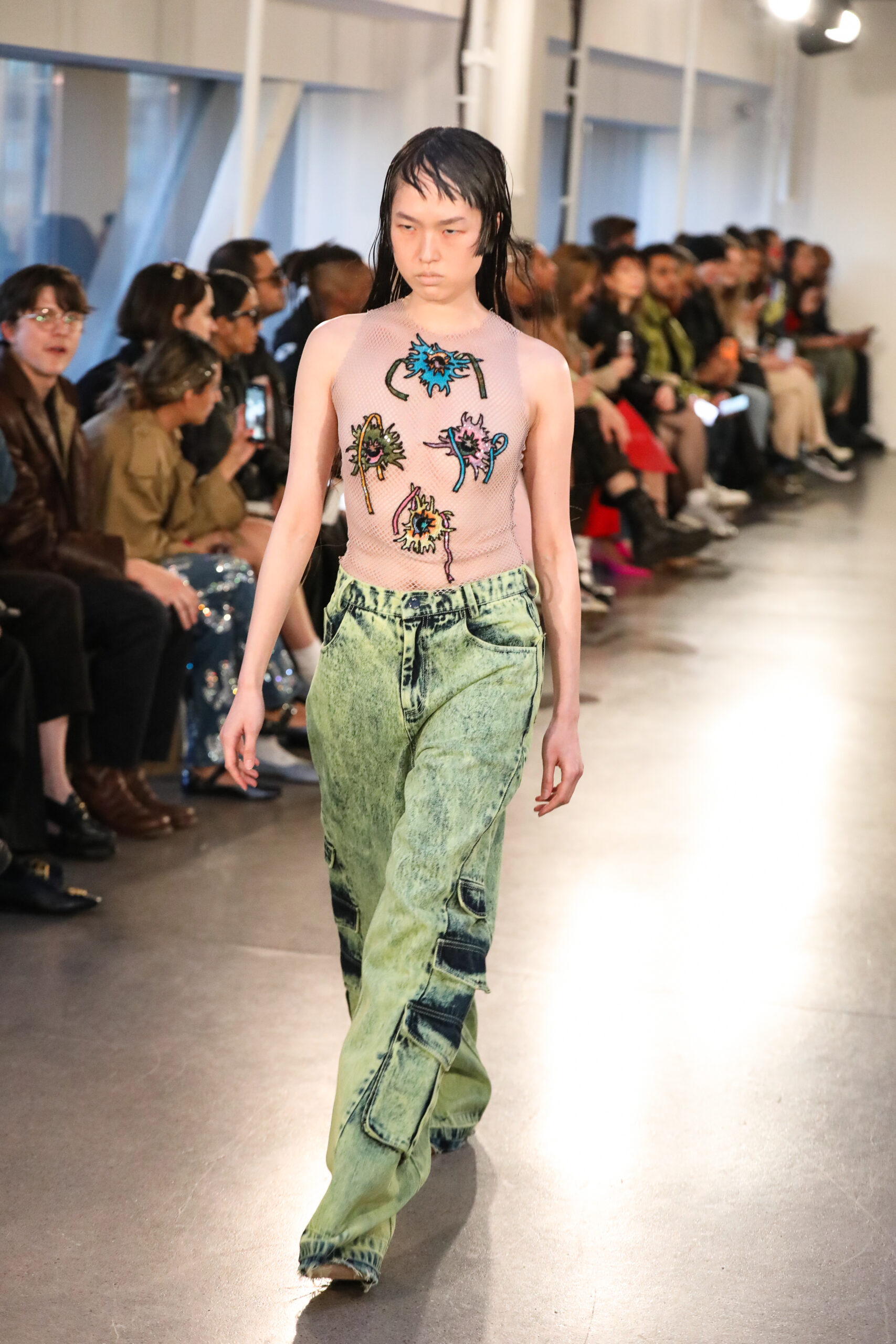 L’esprit est une entité prolifique, une prairie regorgeant de bizarreries. Certaines sont des biomorphes, qui confèrent à des phénomènes visuels banals des formes idiosyncrasiques, tandis que d’autres défient toute logique et toute limite pour libérer une cacophonie désinhibée d’images violemment euphoriques et appellent un besoin primordial de voir audelà du domaine des possibilités. KGL explore la complexité des pensées et des sentiments dans sa collection FW ’23 Agrestal Mind, tout en gardant intacte l’essence du paradoxe qui traverse l’éthique du design de la marque. Les lignes et les limites oscillent entre courbes douces et bords déchiquetés, tandis que les surfaces sont surchargées d’une riche pléthore de textures, à la fois tactiles et visuelles. Des tons neutres et tranquilles servent de base à la prolifération de bleus et de teintes viridiennes, tandis que des accents de roses et de jaunes éclatants les revigorent, ajoutant une nouvelle profondeur et de nouvelles perspectives. Une créature aux multiples facettes sert de mascotte pour la saison – concoctée comme une représentation de la curiosité innée et de la malléabilité de la psyché. Des versions tordues et alambiquées des grilles uniformes et des rayures apaisantes ornent les imprimés et les broderies, imitant la nature dans sa forme la plus sauvage et incontrôlée. Les proportions sont jouées de manière arbitraire et les éléments se bloquent les uns les autres pour être abrupts et fragmentés. Au milieu des tissus, on peut trouver des textures brillantes, des points décoratifs et des bordures de cuir renforcées. Grâce à un mélange d’éléments psychédéliques simples et de fleurs extravagantes de motifs brodés, de pièces décontractées et classiquement taillées, la dichotomie d’une imagination active est mise en avant. Une fête pour une personne qui se transforme en ruine, une créature émanant d’une boule à facettes qui scintille dans l’esprit, des fleurs qui agissent comme des portails de transformation : tout est aussi réel que possible dans le royaume infini de l’esprit.