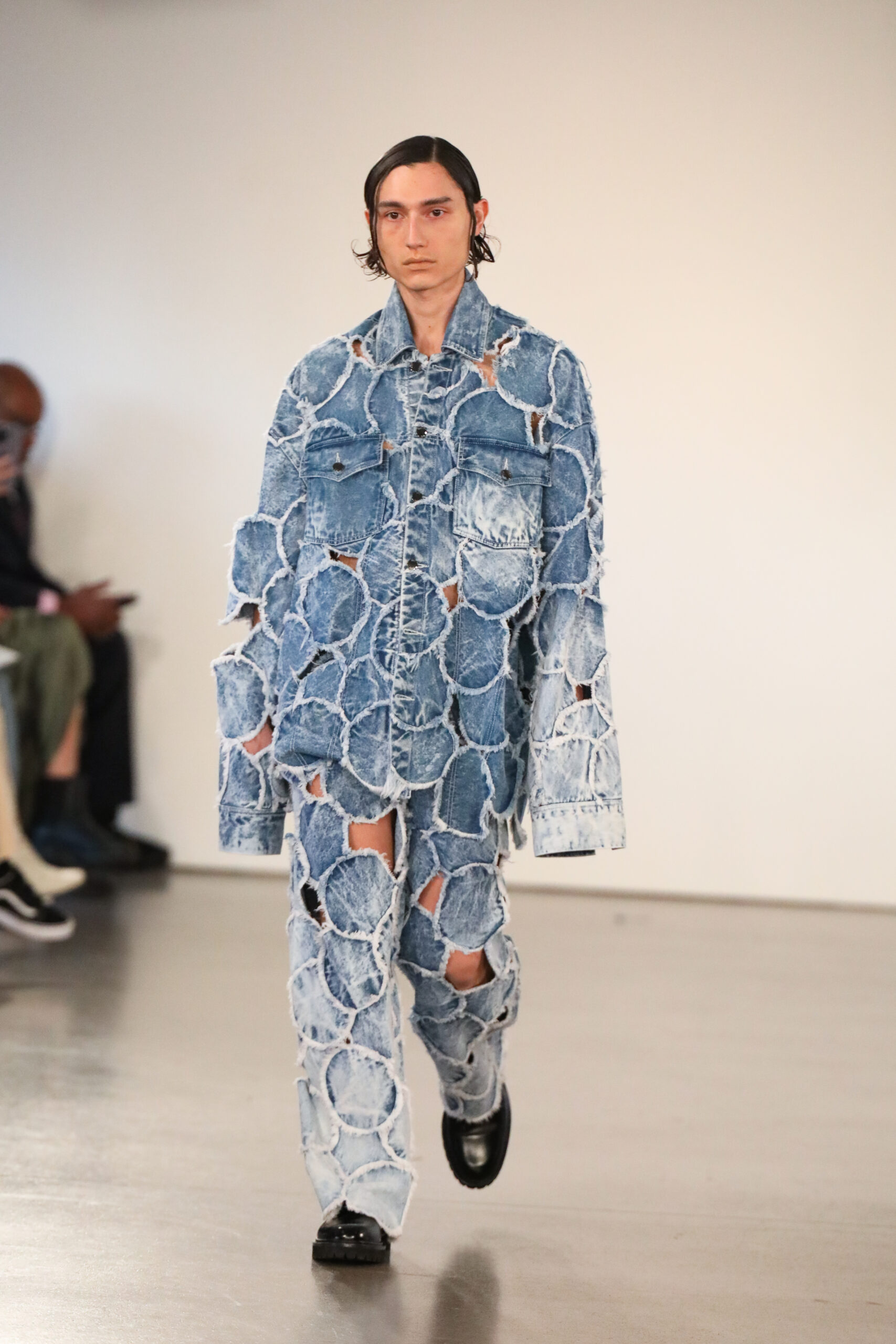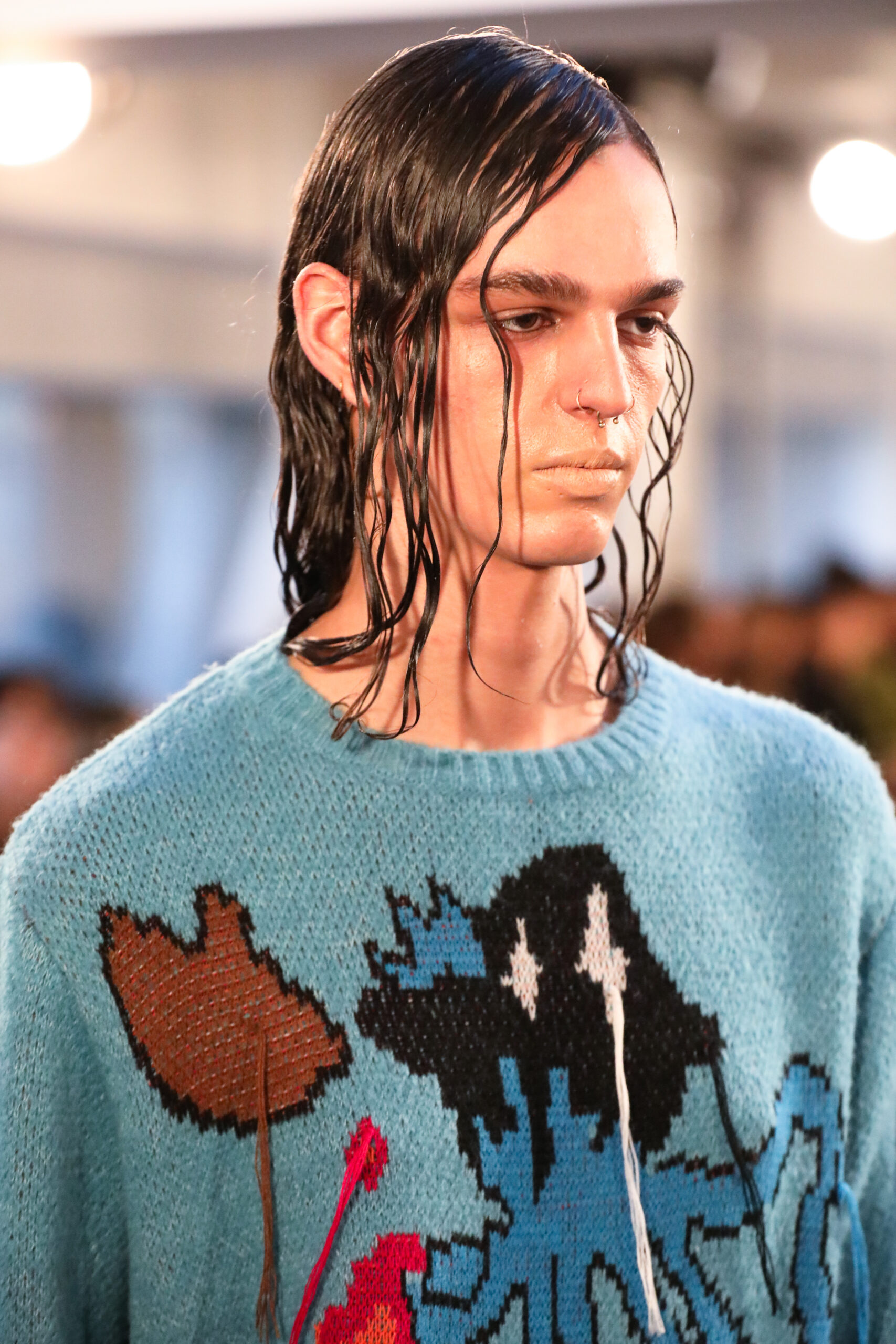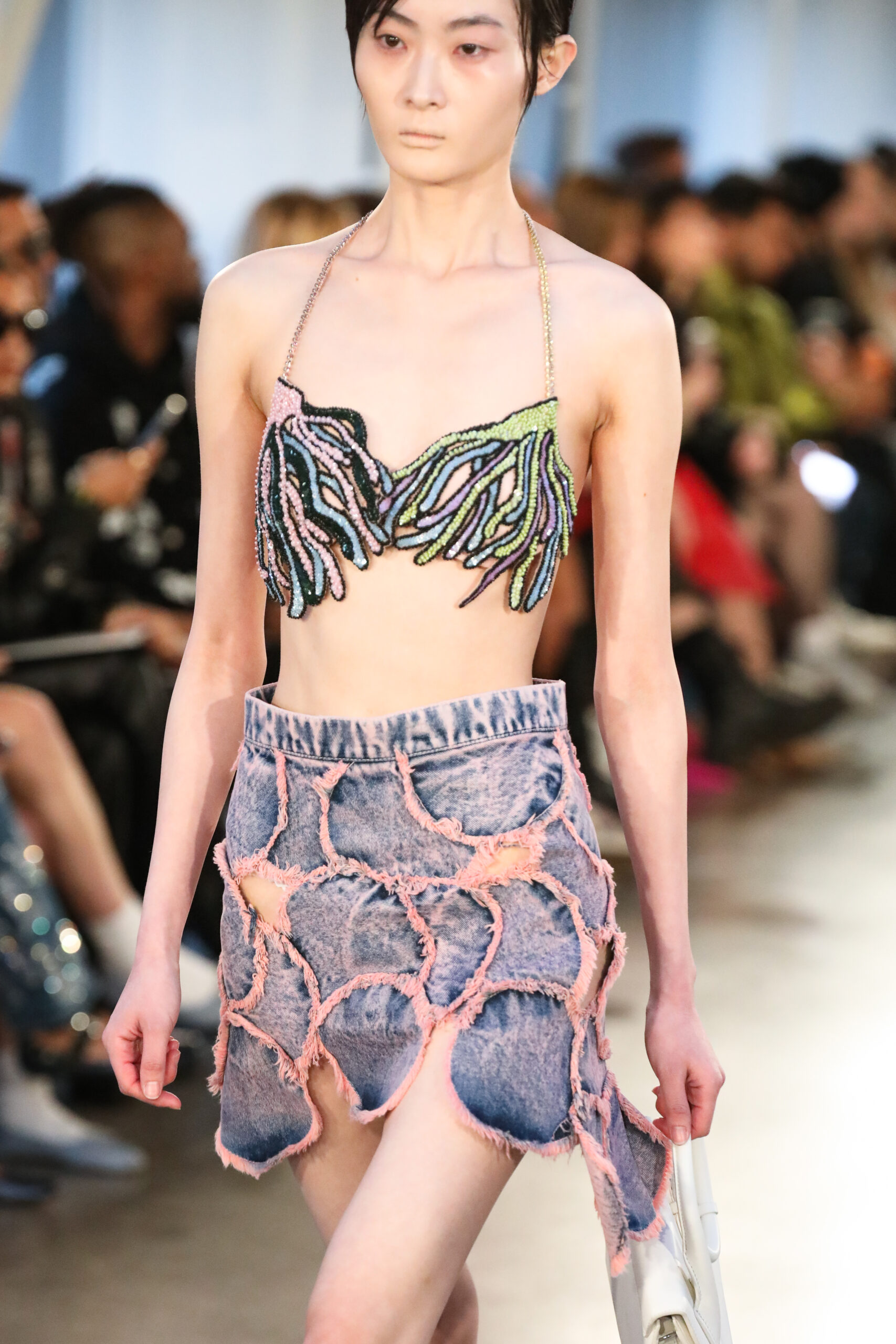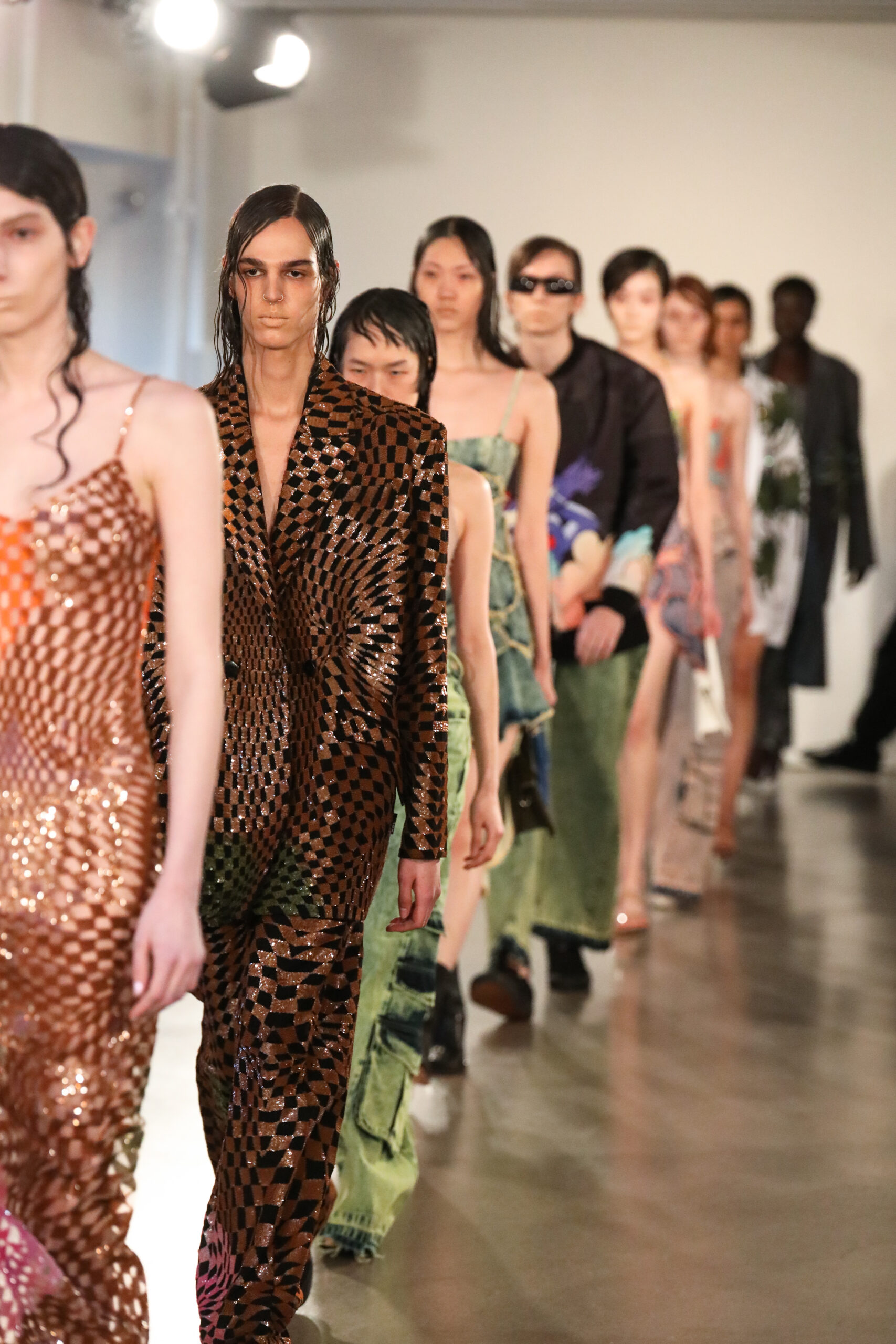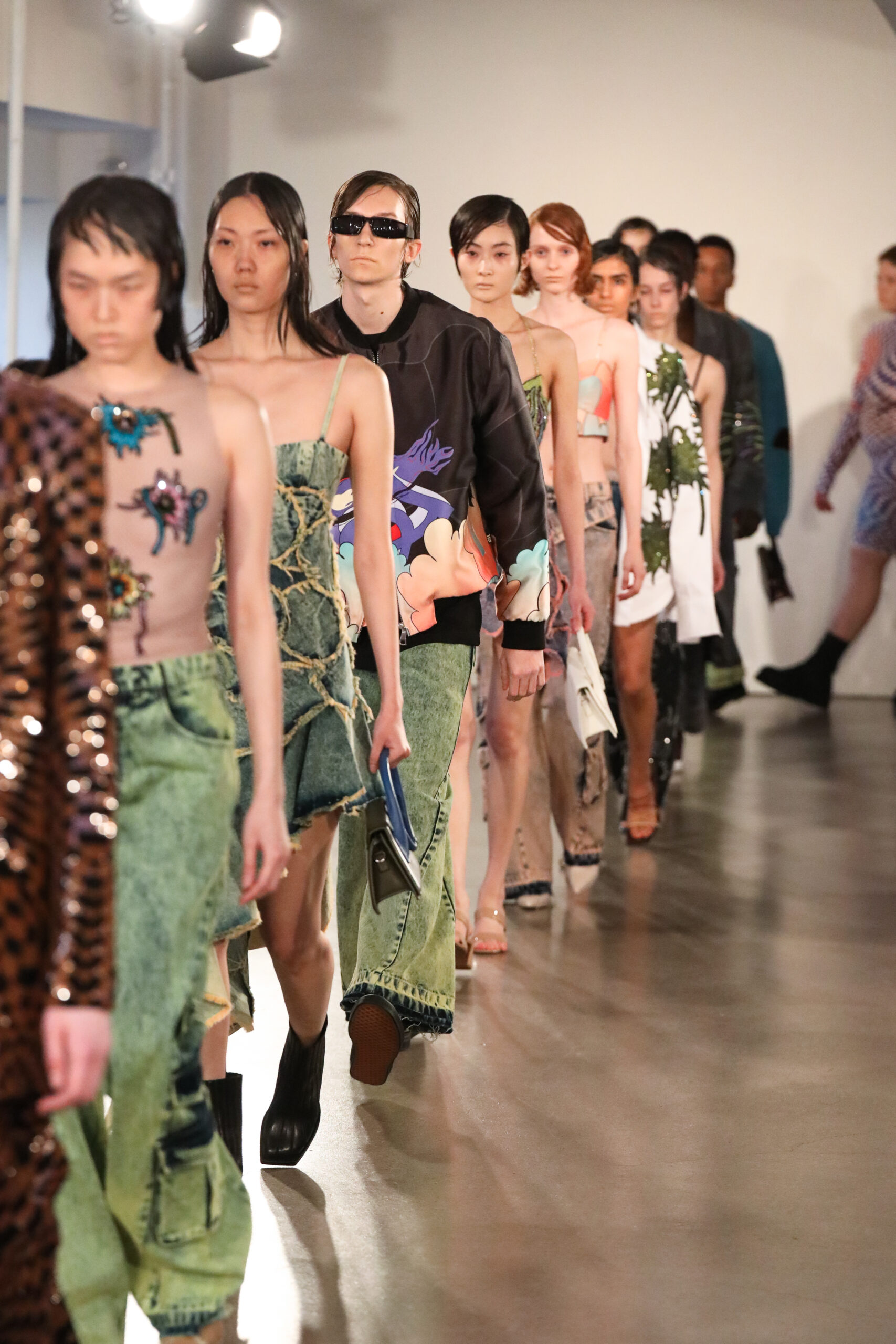 L’esprit est une entité prolifique, une prairie regorgeant de bizarreries. Certaines sont des biomorphes, qui confèrent à des phénomènes visuels banals des formes idiosyncrasiques, tandis que d’autres défient toute logique et toute limite pour libérer une cacophonie désinhibée d’images violemment euphoriques et appellent un besoin primordial de voir audelà du domaine des possibilités. KGL explore la complexité des pensées et des sentiments dans sa collection FW ’23 Agrestal Mind, tout en gardant intacte l’essence du paradoxe qui traverse l’éthique du design de la marque. Les lignes et les limites oscillent entre courbes douces et bords déchiquetés, tandis que les surfaces sont surchargées d’une riche pléthore de textures, à la fois tactiles et visuelles. Des tons neutres et tranquilles servent de base à la prolifération de bleus et de teintes viridiennes, tandis que des accents de roses et de jaunes éclatants les revigorent, ajoutant une nouvelle profondeur et de nouvelles perspectives. Une créature aux multiples facettes sert de mascotte pour la saison – concoctée comme une représentation de la curiosité innée et de la malléabilité de la psyché. Des versions tordues et alambiquées des grilles uniformes et des rayures apaisantes ornent les imprimés et les broderies, imitant la nature dans sa forme la plus sauvage et incontrôlée. Les proportions sont jouées de manière arbitraire et les éléments se bloquent les uns les autres pour être abrupts et fragmentés. Au milieu des tissus, on peut trouver des textures brillantes, des points décoratifs et des bordures de cuir renforcées. Grâce à un mélange d’éléments psychédéliques simples et de fleurs extravagantes de motifs brodés, de pièces décontractées et classiquement taillées, la dichotomie d’une imagination active est mise en avant. Une fête pour une personne qui se transforme en ruine, une créature émanant d’une boule à facettes qui scintille dans l’esprit, des fleurs qui agissent comme des portails de transformation : tout est aussi réel que possible dans le royaume infini de l’esprit.