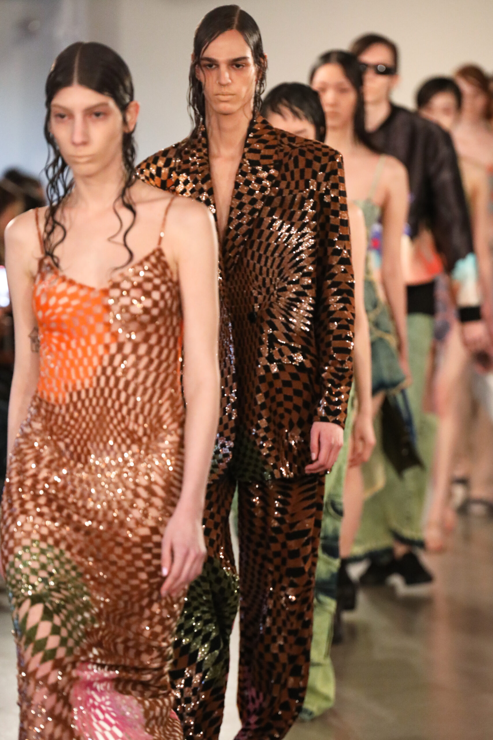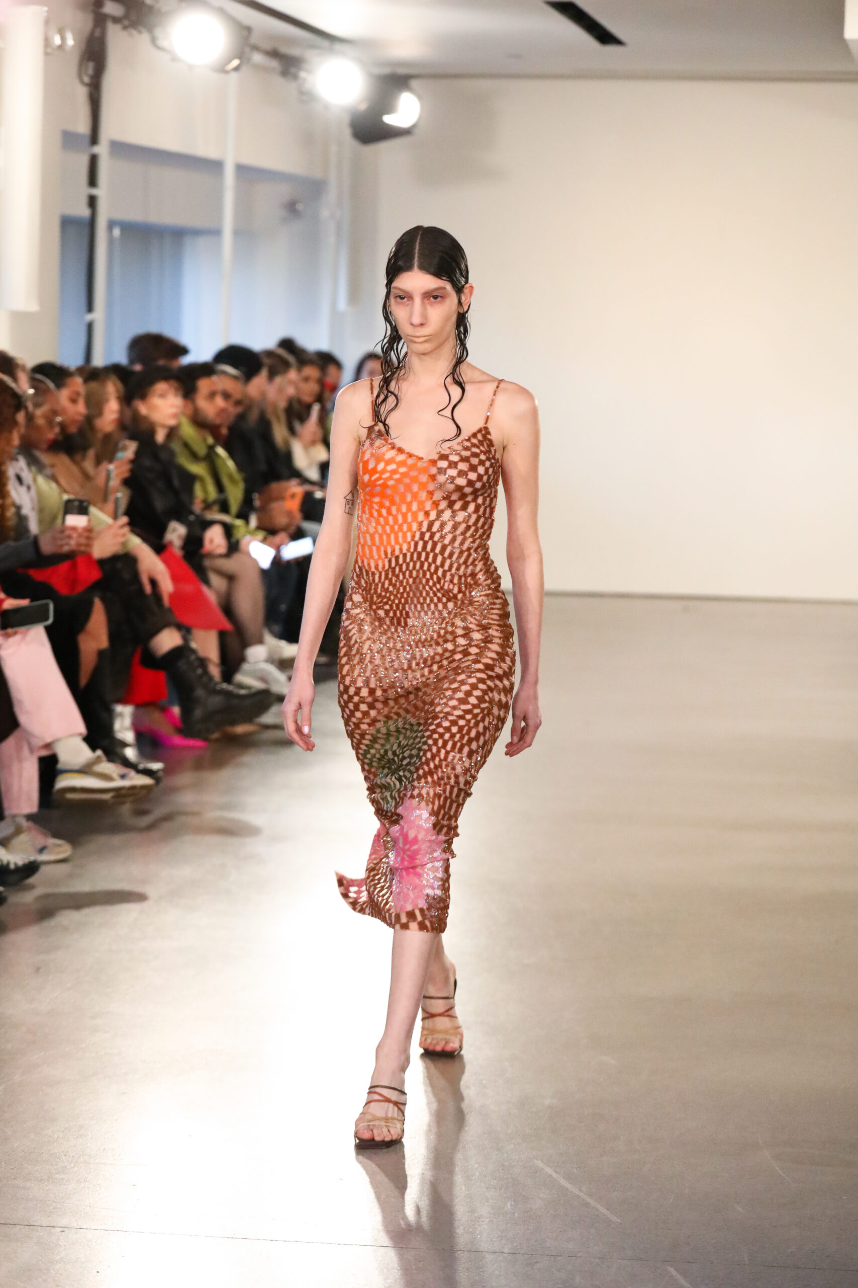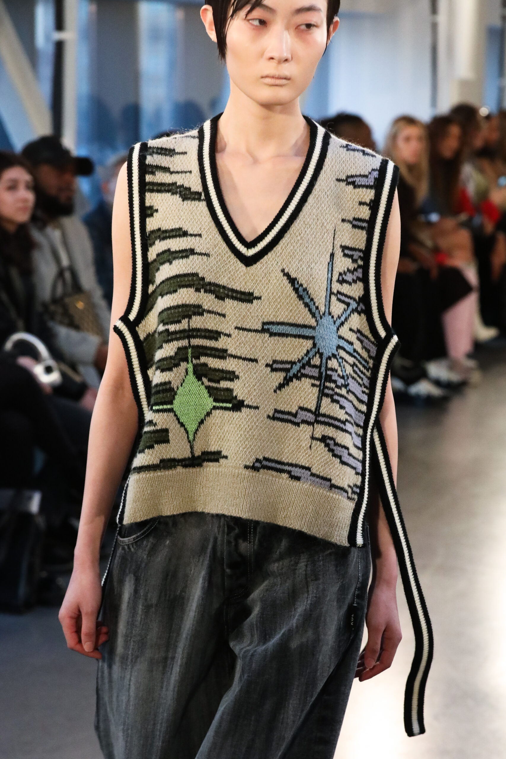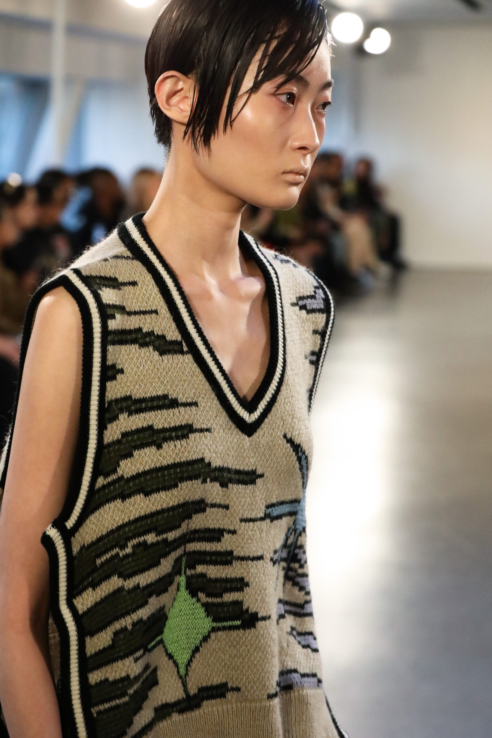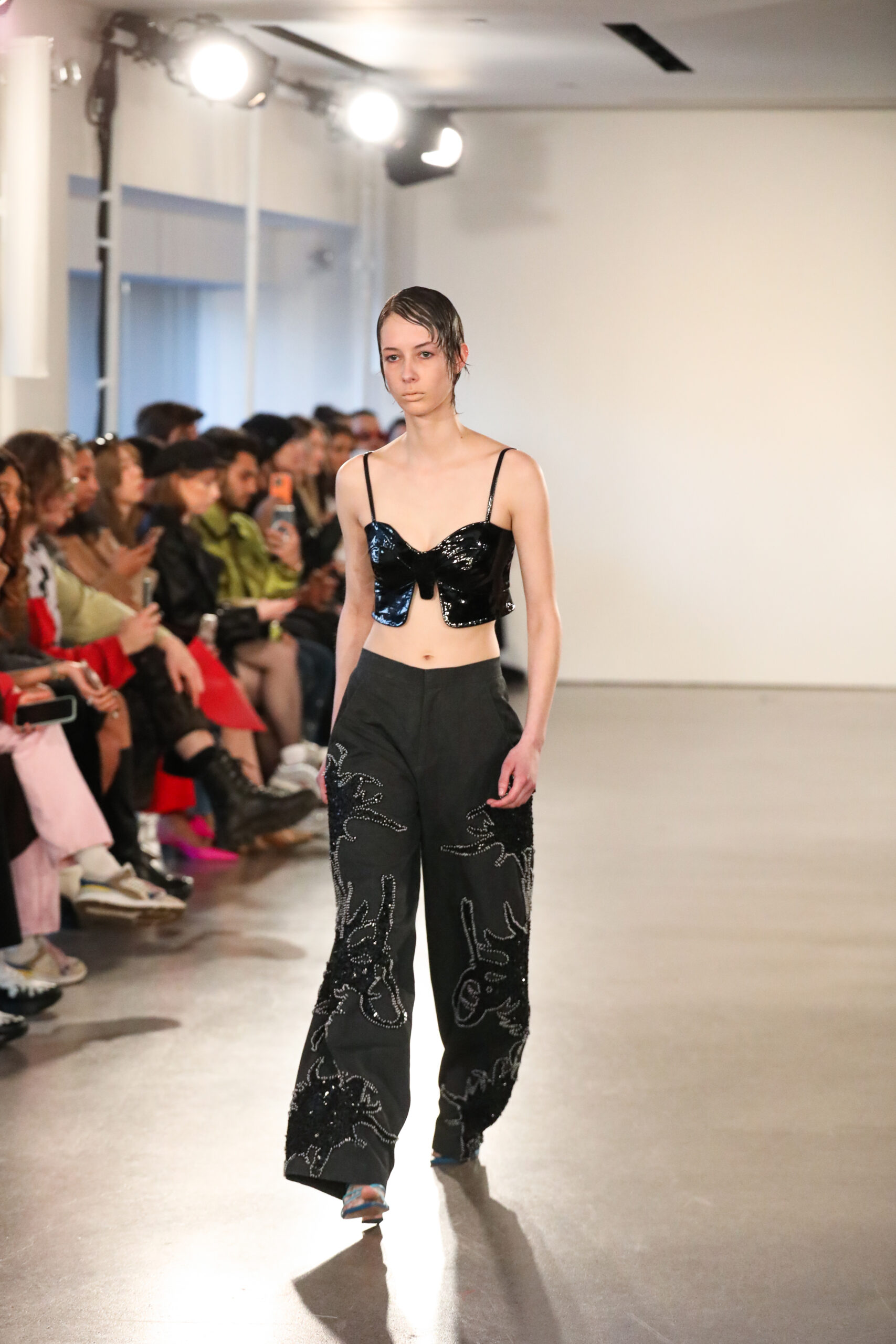 L’esprit est une entité prolifique, une prairie regorgeant de bizarreries. Certaines sont des biomorphes, qui confèrent à des phénomènes visuels banals des formes idiosyncrasiques, tandis que d’autres défient toute logique et toute limite pour libérer une cacophonie désinhibée d’images violemment euphoriques et appellent un besoin primordial de voir audelà du domaine des possibilités. KGL explore la complexité des pensées et des sentiments dans sa collection FW ’23 Agrestal Mind, tout en gardant intacte l’essence du paradoxe qui traverse l’éthique du design de la marque. Les lignes et les limites oscillent entre courbes douces et bords déchiquetés, tandis que les surfaces sont surchargées d’une riche pléthore de textures, à la fois tactiles et visuelles. Des tons neutres et tranquilles servent de base à la prolifération de bleus et de teintes viridiennes, tandis que des accents de roses et de jaunes éclatants les revigorent, ajoutant une nouvelle profondeur et de nouvelles perspectives. Une créature aux multiples facettes sert de mascotte pour la saison – concoctée comme une représentation de la curiosité innée et de la malléabilité de la psyché. Des versions tordues et alambiquées des grilles uniformes et des rayures apaisantes ornent les imprimés et les broderies, imitant la nature dans sa forme la plus sauvage et incontrôlée. Les proportions sont jouées de manière arbitraire et les éléments se bloquent les uns les autres pour être abrupts et fragmentés. Au milieu des tissus, on peut trouver des textures brillantes, des points décoratifs et des bordures de cuir renforcées. Grâce à un mélange d’éléments psychédéliques simples et de fleurs extravagantes de motifs brodés, de pièces décontractées et classiquement taillées, la dichotomie d’une imagination active est mise en avant. Une fête pour une personne qui se transforme en ruine, une créature émanant d’une boule à facettes qui scintille dans l’esprit, des fleurs qui agissent comme des portails de transformation : tout est aussi réel que possible dans le royaume infini de l’esprit.