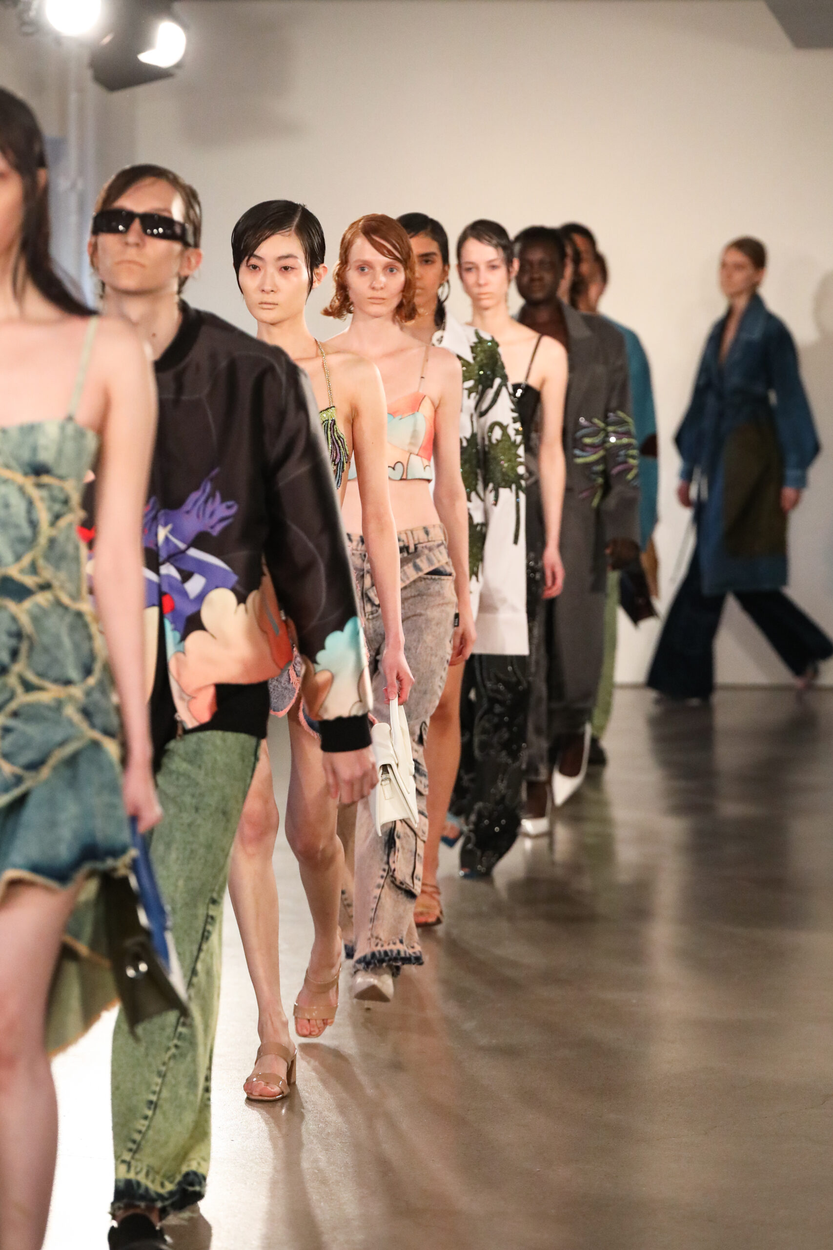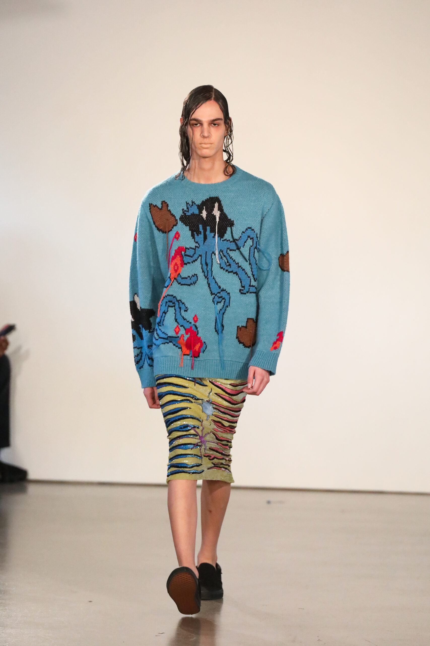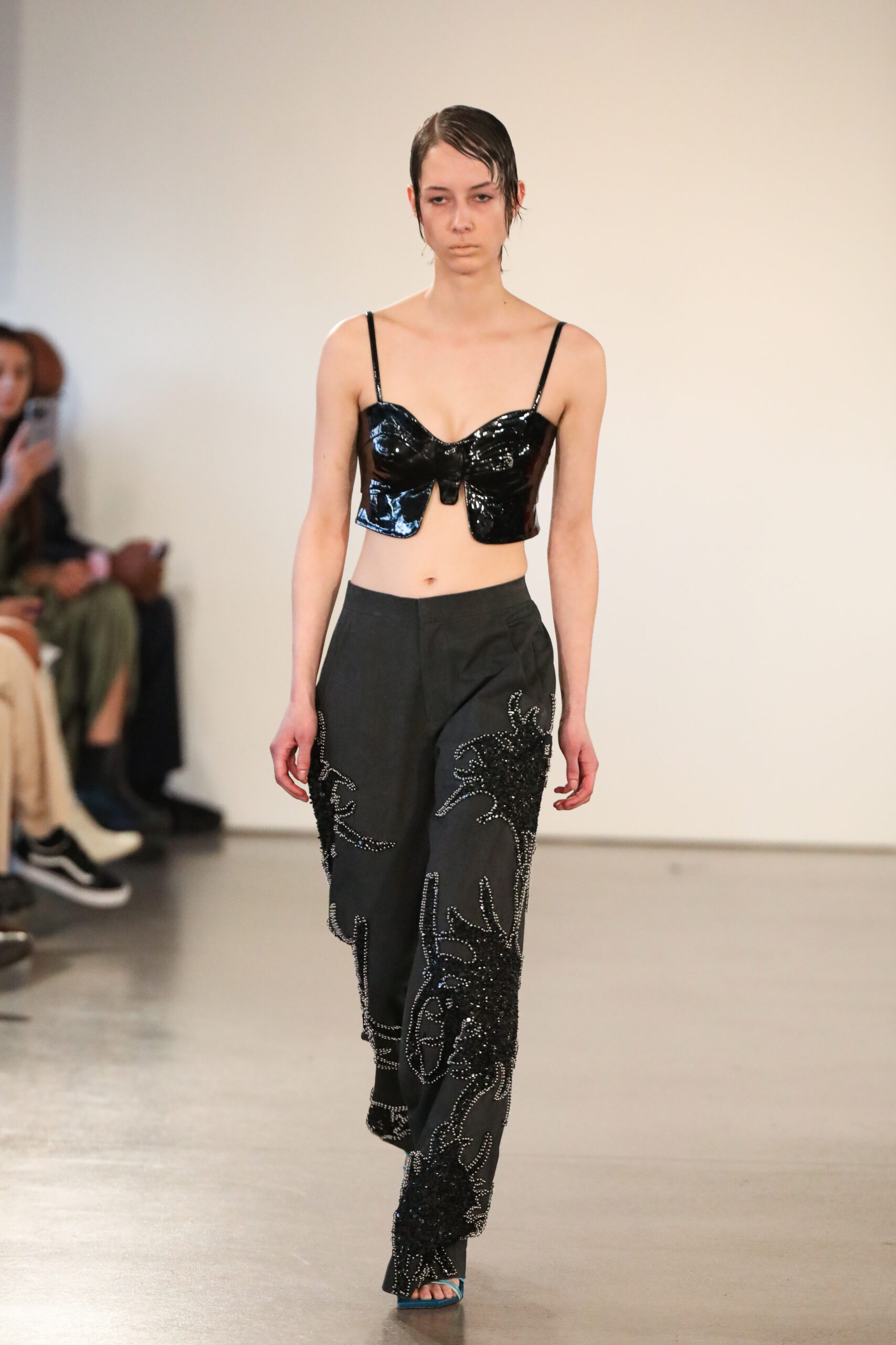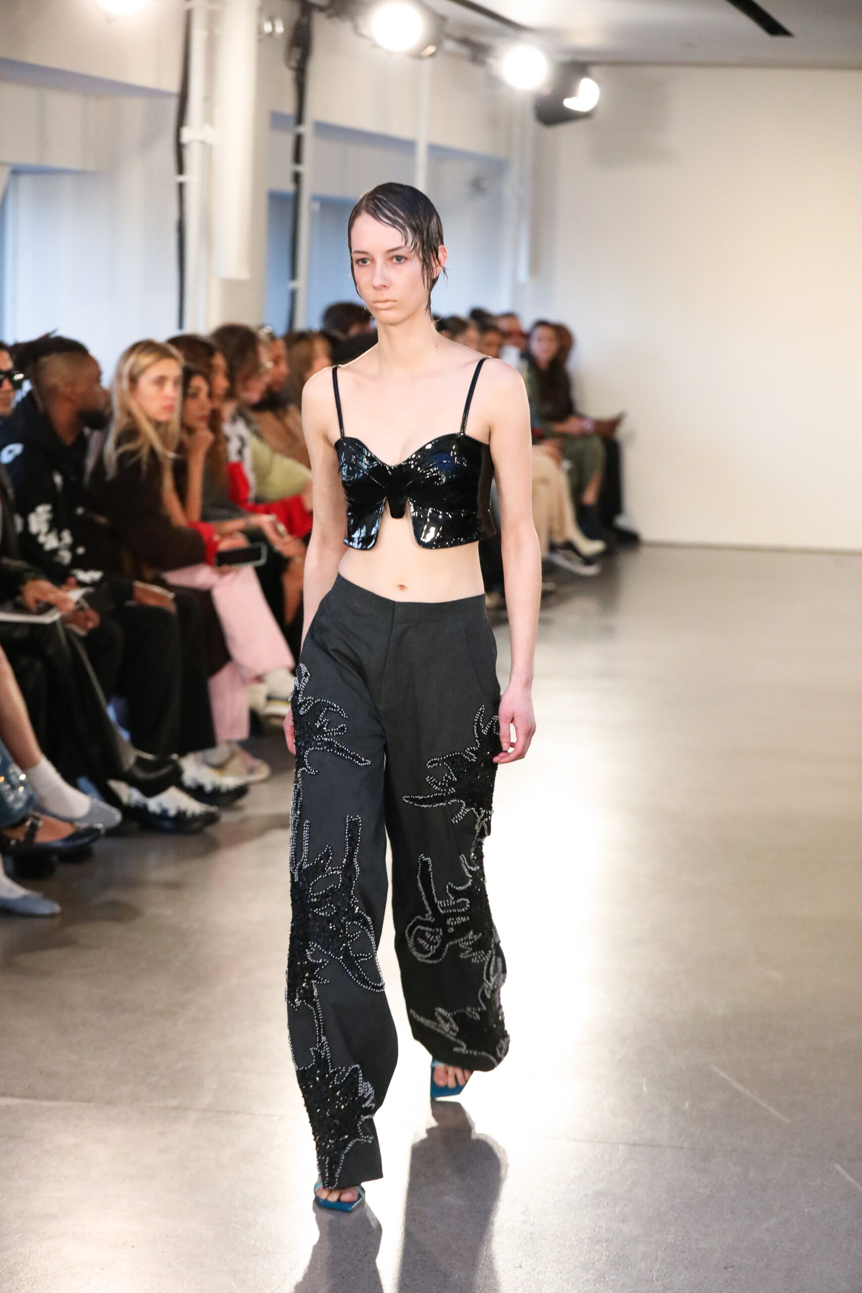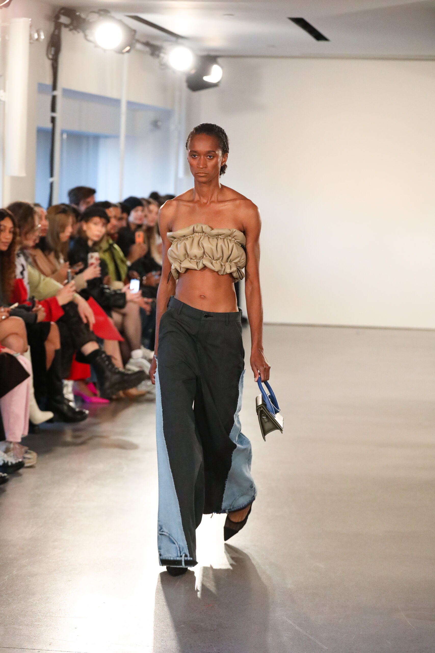 L’esprit est une entité prolifique, une prairie regorgeant de bizarreries. Certaines sont des biomorphes, qui confèrent à des phénomènes visuels banals des formes idiosyncrasiques, tandis que d’autres défient toute logique et toute limite pour libérer une cacophonie désinhibée d’images violemment euphoriques et appellent un besoin primordial de voir audelà du domaine des possibilités. KGL explore la complexité des pensées et des sentiments dans sa collection FW ’23 Agrestal Mind, tout en gardant intacte l’essence du paradoxe qui traverse l’éthique du design de la marque. Les lignes et les limites oscillent entre courbes douces et bords déchiquetés, tandis que les surfaces sont surchargées d’une riche pléthore de textures, à la fois tactiles et visuelles. Des tons neutres et tranquilles servent de base à la prolifération de bleus et de teintes viridiennes, tandis que des accents de roses et de jaunes éclatants les revigorent, ajoutant une nouvelle profondeur et de nouvelles perspectives. Une créature aux multiples facettes sert de mascotte pour la saison – concoctée comme une représentation de la curiosité innée et de la malléabilité de la psyché. Des versions tordues et alambiquées des grilles uniformes et des rayures apaisantes ornent les imprimés et les broderies, imitant la nature dans sa forme la plus sauvage et incontrôlée. Les proportions sont jouées de manière arbitraire et les éléments se bloquent les uns les autres pour être abrupts et fragmentés. Au milieu des tissus, on peut trouver des textures brillantes, des points décoratifs et des bordures de cuir renforcées. Grâce à un mélange d’éléments psychédéliques simples et de fleurs extravagantes de motifs brodés, de pièces décontractées et classiquement taillées, la dichotomie d’une imagination active est mise en avant. Une fête pour une personne qui se transforme en ruine, une créature émanant d’une boule à facettes qui scintille dans l’esprit, des fleurs qui agissent comme des portails de transformation : tout est aussi réel que possible dans le royaume infini de l’esprit.