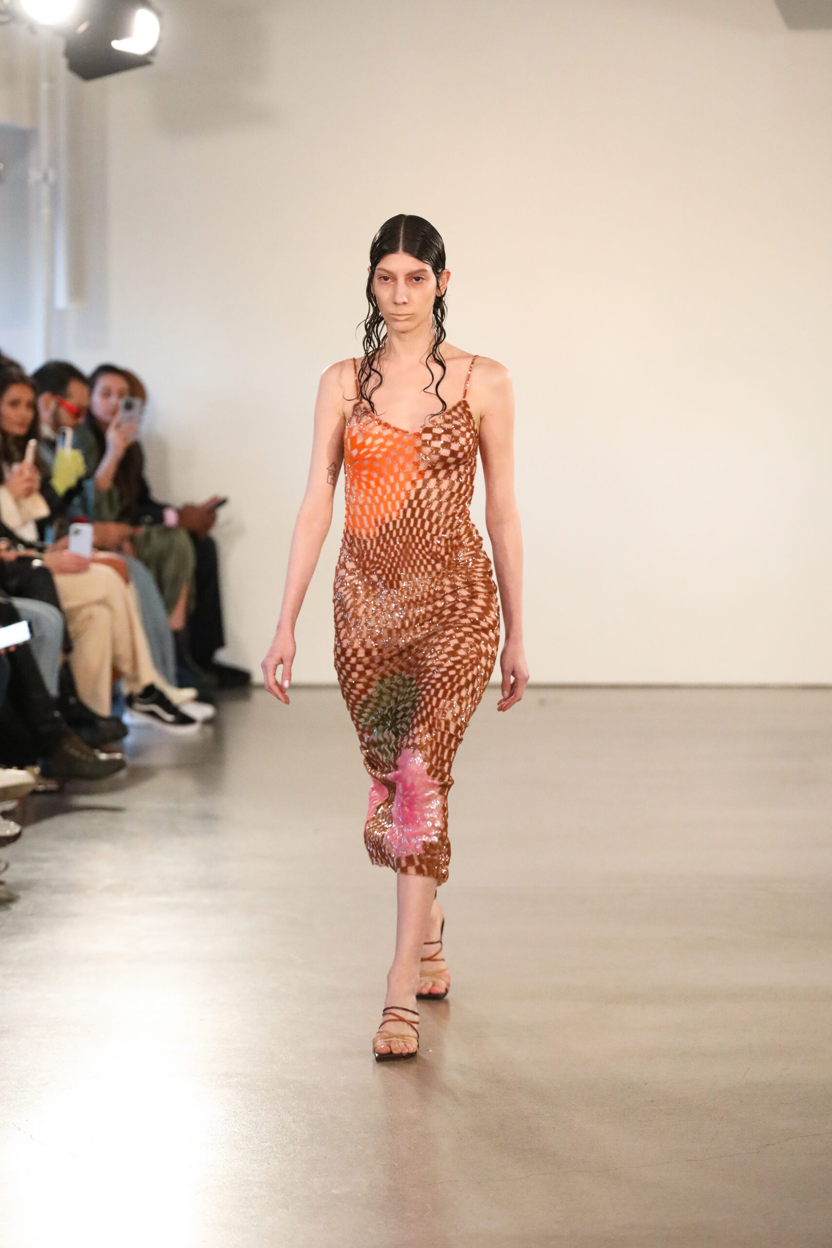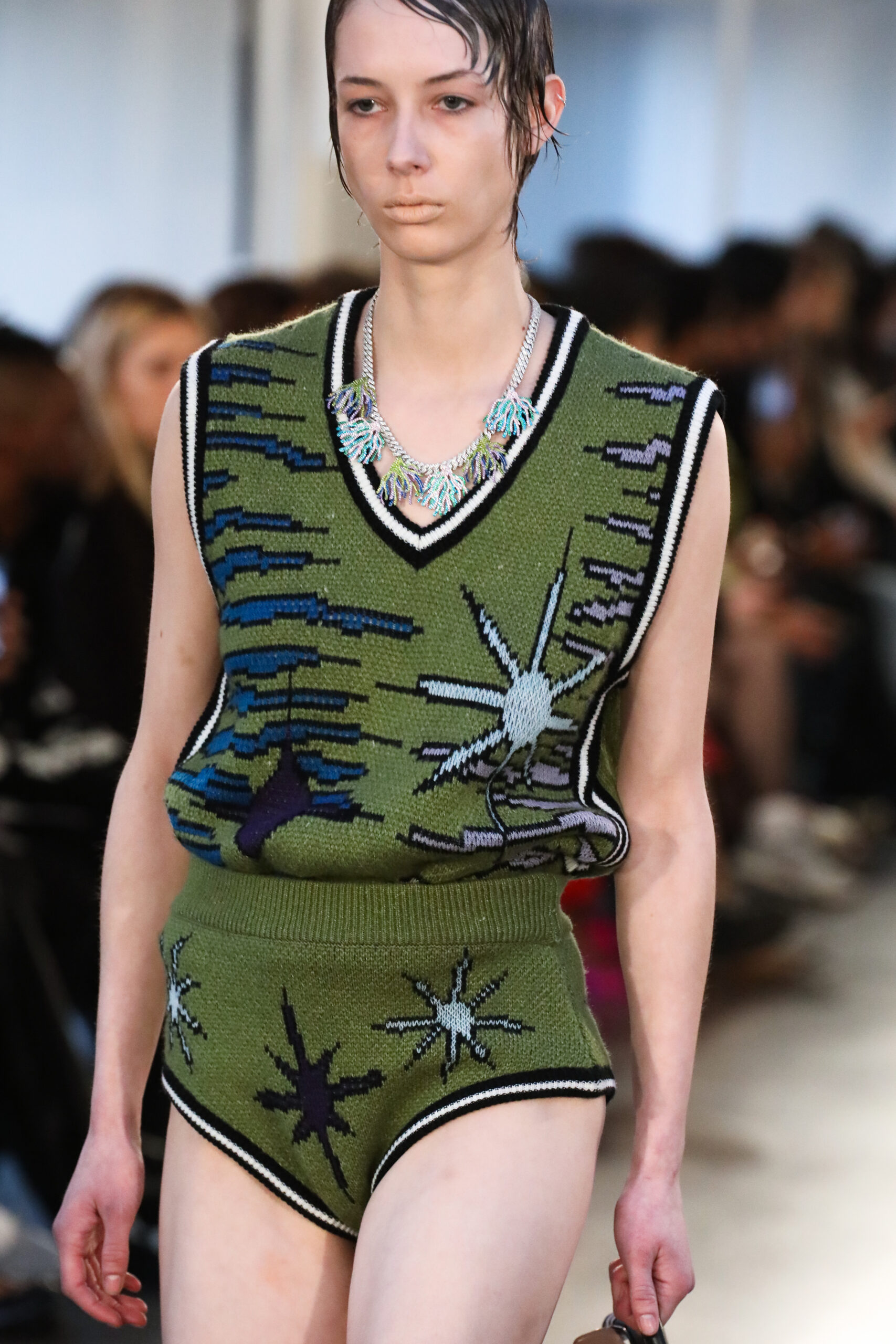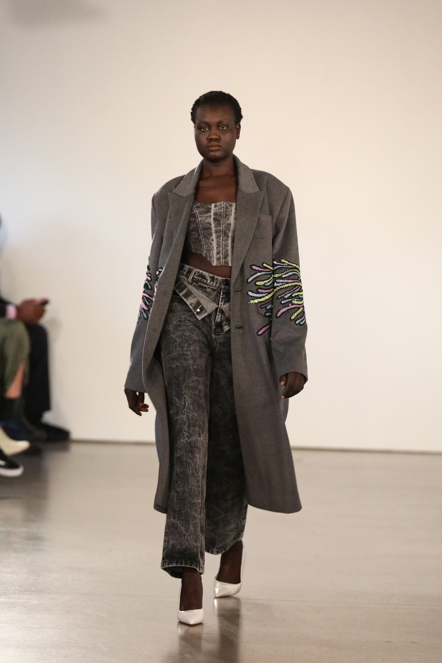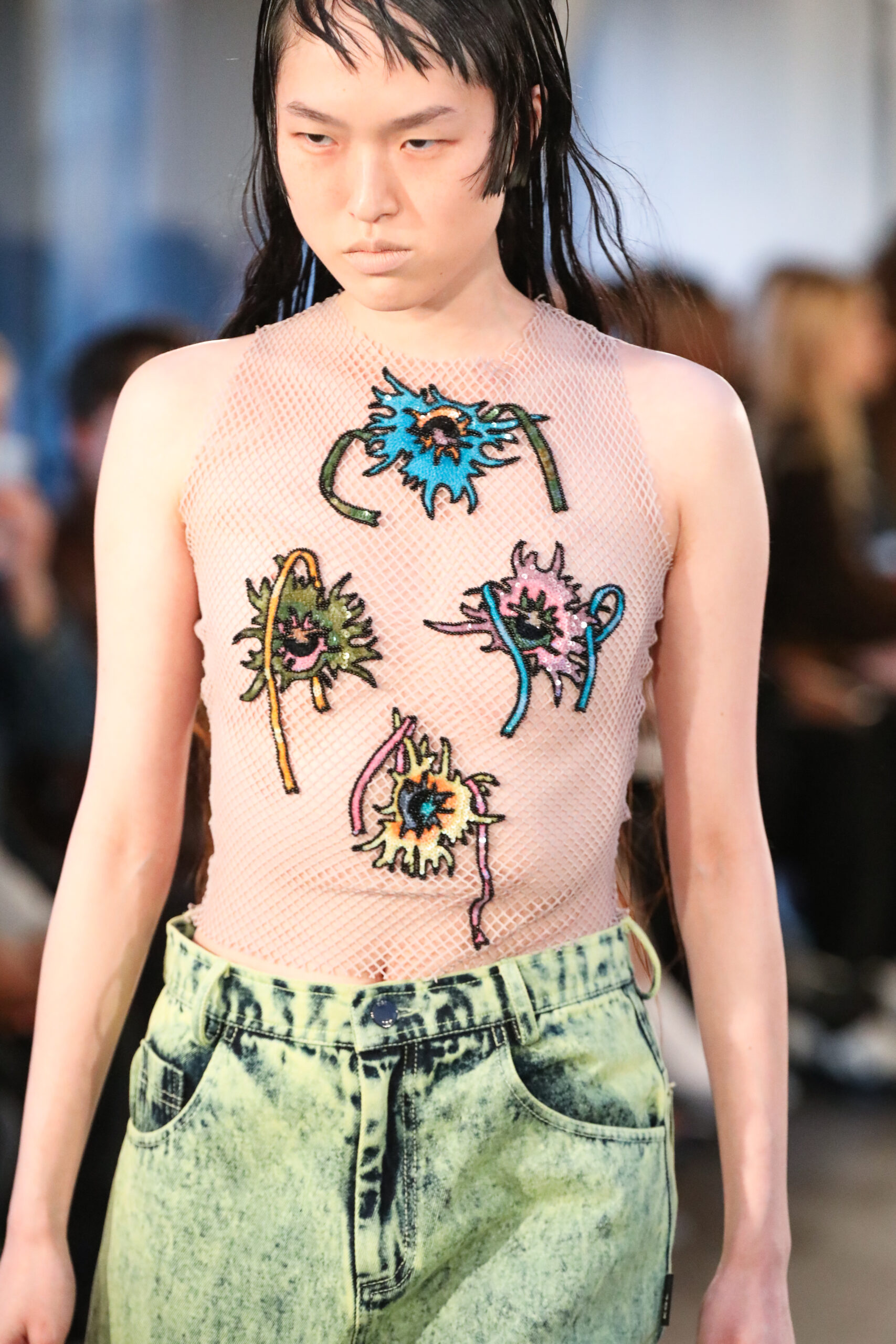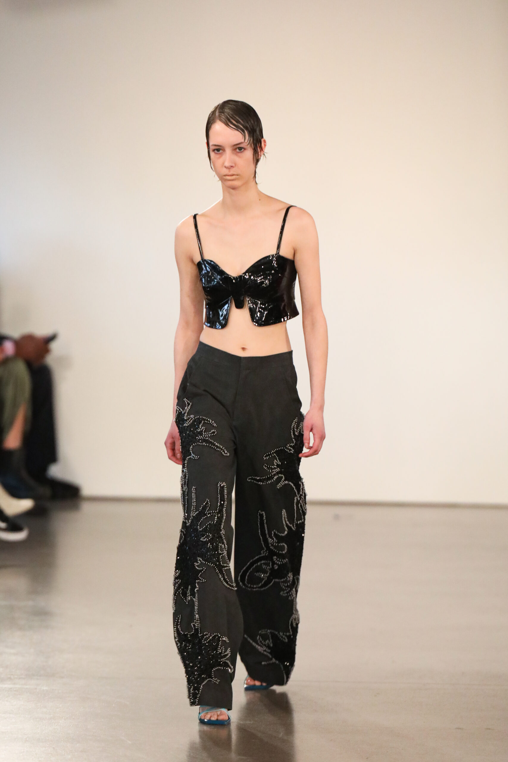 L’esprit est une entité prolifique, une prairie regorgeant de bizarreries. Certaines sont des biomorphes, qui confèrent à des phénomènes visuels banals des formes idiosyncrasiques, tandis que d’autres défient toute logique et toute limite pour libérer une cacophonie désinhibée d’images violemment euphoriques et appellent un besoin primordial de voir audelà du domaine des possibilités. KGL explore la complexité des pensées et des sentiments dans sa collection FW ’23 Agrestal Mind, tout en gardant intacte l’essence du paradoxe qui traverse l’éthique du design de la marque. Les lignes et les limites oscillent entre courbes douces et bords déchiquetés, tandis que les surfaces sont surchargées d’une riche pléthore de textures, à la fois tactiles et visuelles. Des tons neutres et tranquilles servent de base à la prolifération de bleus et de teintes viridiennes, tandis que des accents de roses et de jaunes éclatants les revigorent, ajoutant une nouvelle profondeur et de nouvelles perspectives. Une créature aux multiples facettes sert de mascotte pour la saison – concoctée comme une représentation de la curiosité innée et de la malléabilité de la psyché. Des versions tordues et alambiquées des grilles uniformes et des rayures apaisantes ornent les imprimés et les broderies, imitant la nature dans sa forme la plus sauvage et incontrôlée. Les proportions sont jouées de manière arbitraire et les éléments se bloquent les uns les autres pour être abrupts et fragmentés. Au milieu des tissus, on peut trouver des textures brillantes, des points décoratifs et des bordures de cuir renforcées. Grâce à un mélange d’éléments psychédéliques simples et de fleurs extravagantes de motifs brodés, de pièces décontractées et classiquement taillées, la dichotomie d’une imagination active est mise en avant. Une fête pour une personne qui se transforme en ruine, une créature émanant d’une boule à facettes qui scintille dans l’esprit, des fleurs qui agissent comme des portails de transformation : tout est aussi réel que possible dans le royaume infini de l’esprit.