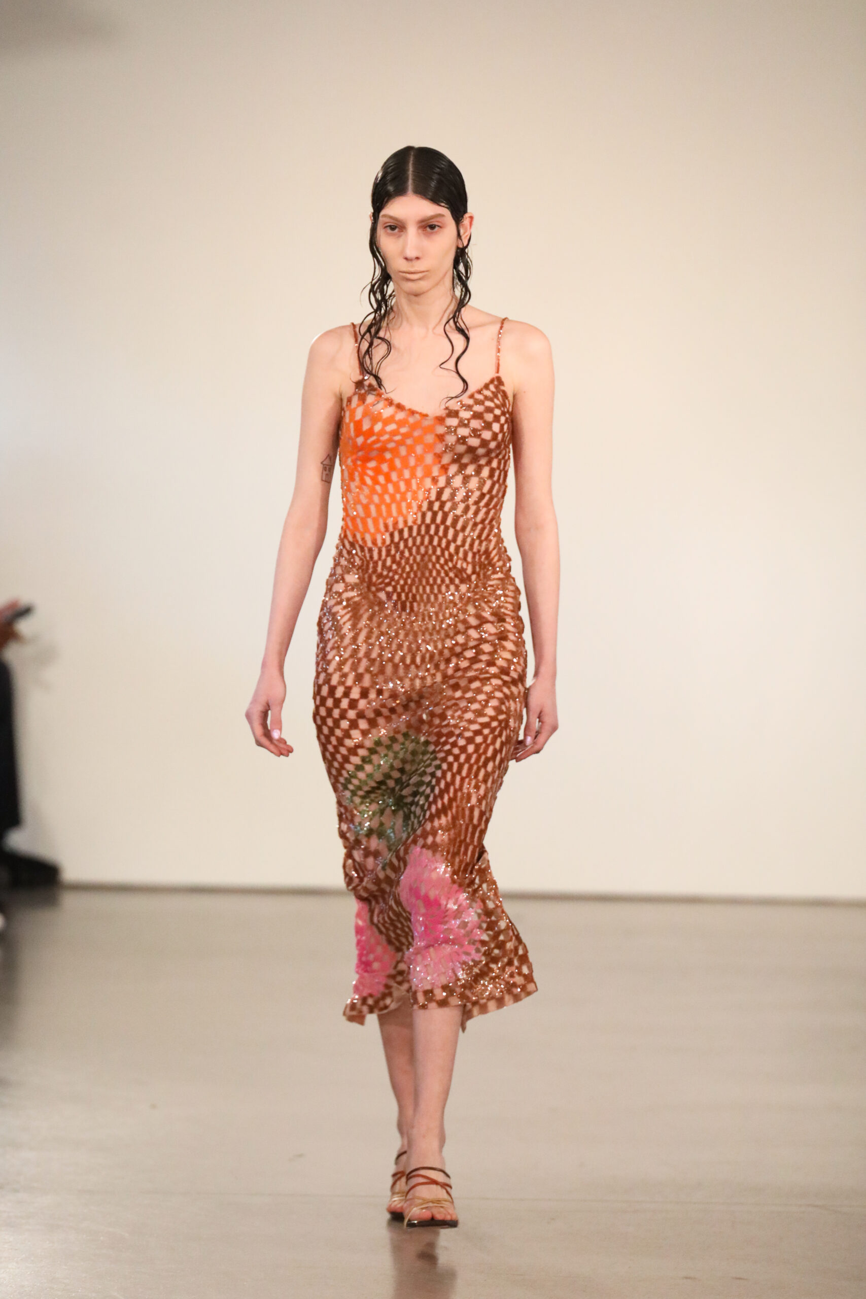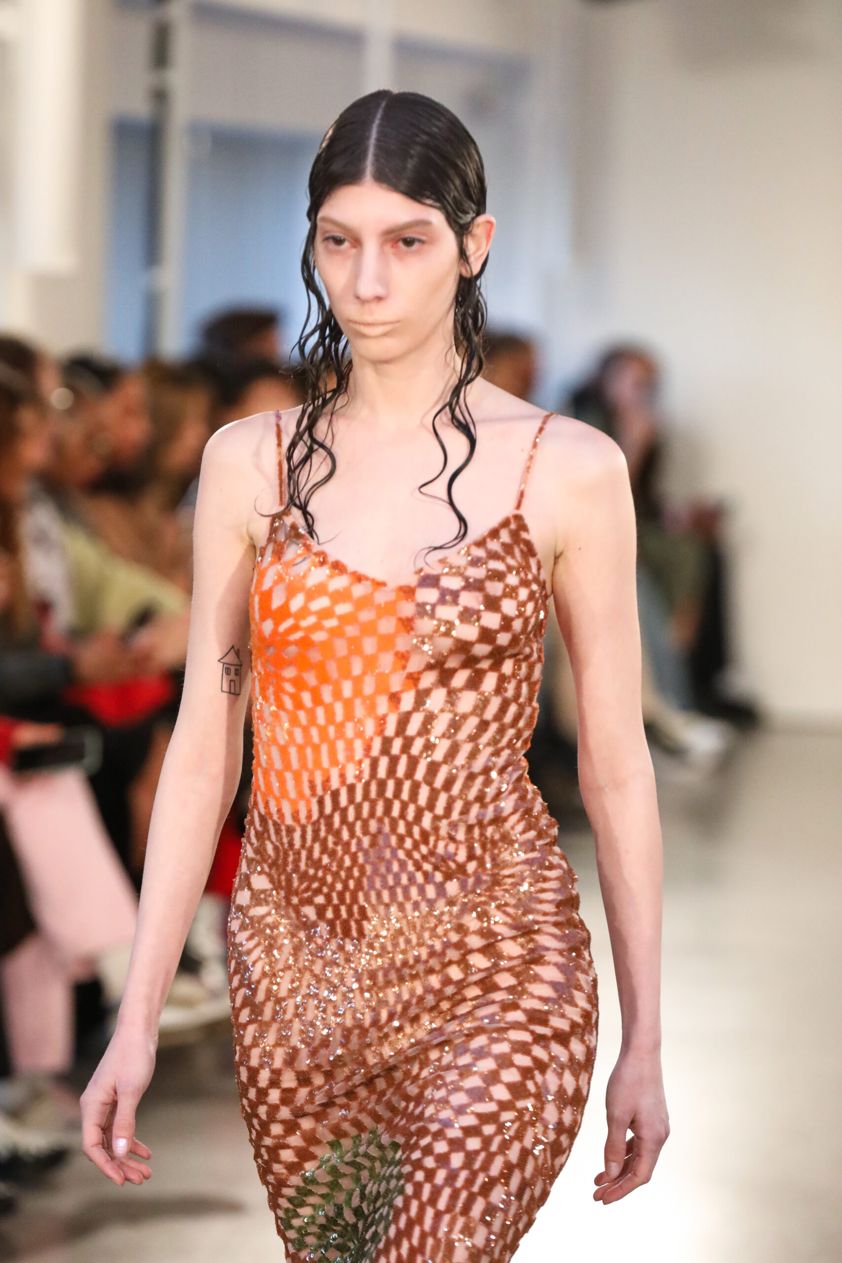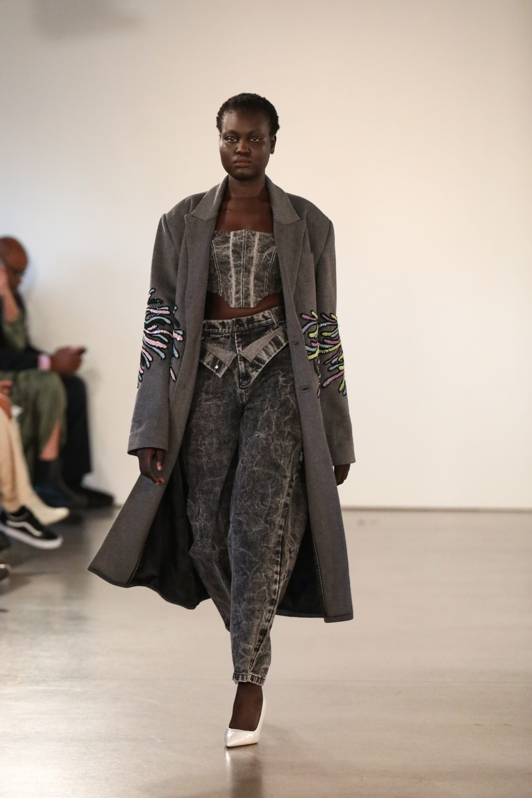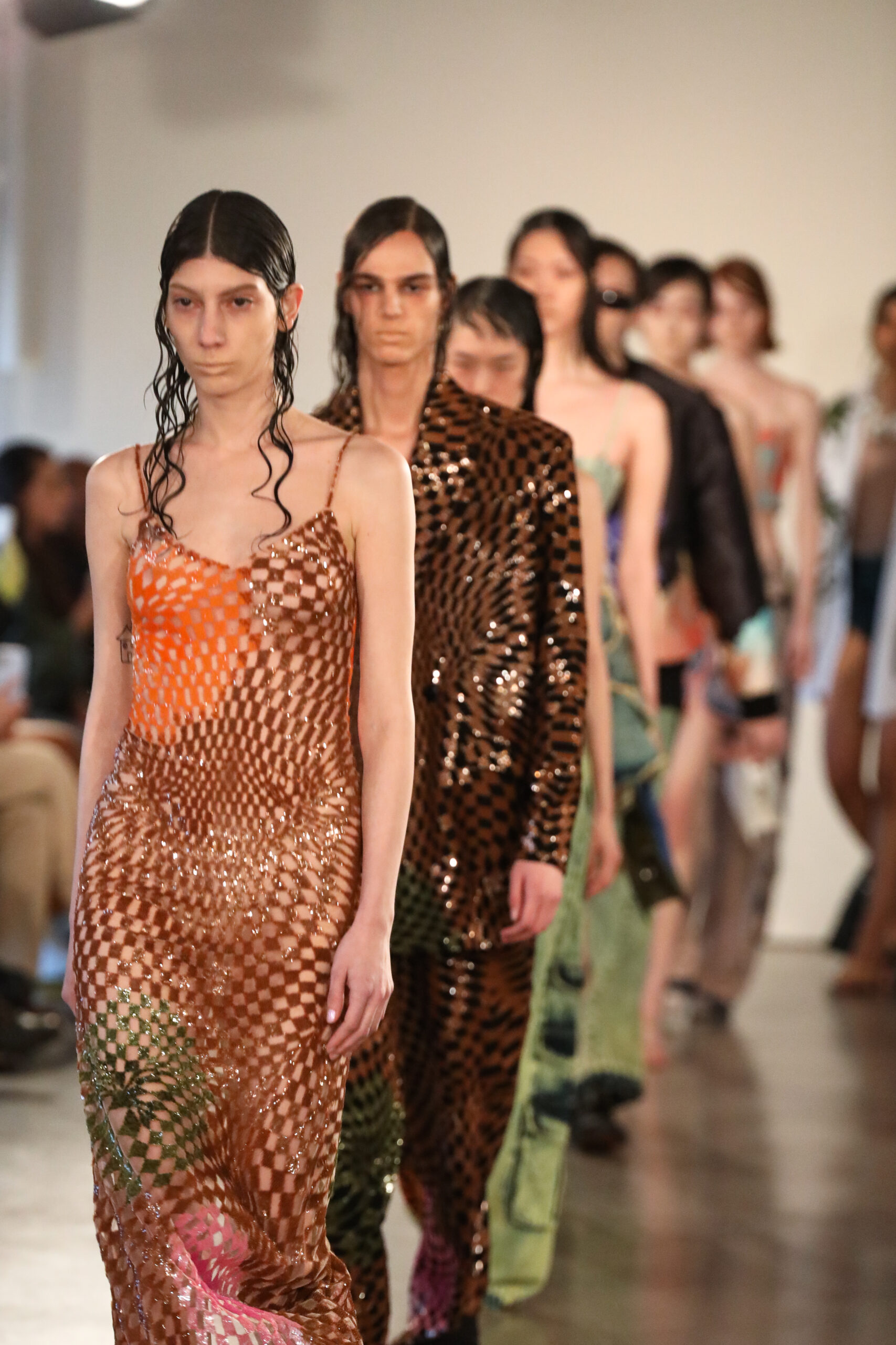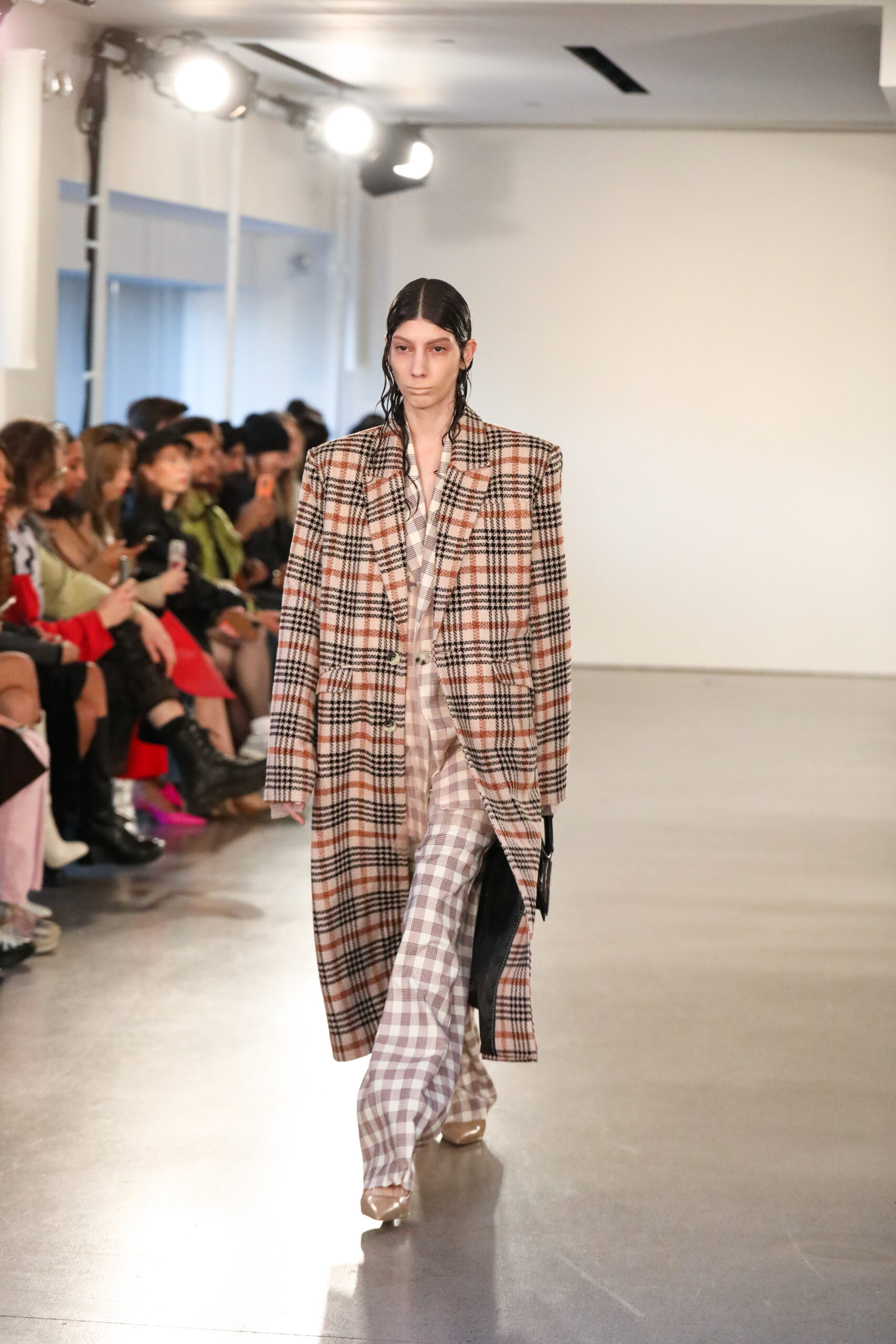 L’esprit est une entité prolifique, une prairie regorgeant de bizarreries. Certaines sont des biomorphes, qui confèrent à des phénomènes visuels banals des formes idiosyncrasiques, tandis que d’autres défient toute logique et toute limite pour libérer une cacophonie désinhibée d’images violemment euphoriques et appellent un besoin primordial de voir audelà du domaine des possibilités. KGL explore la complexité des pensées et des sentiments dans sa collection FW ’23 Agrestal Mind, tout en gardant intacte l’essence du paradoxe qui traverse l’éthique du design de la marque. Les lignes et les limites oscillent entre courbes douces et bords déchiquetés, tandis que les surfaces sont surchargées d’une riche pléthore de textures, à la fois tactiles et visuelles. Des tons neutres et tranquilles servent de base à la prolifération de bleus et de teintes viridiennes, tandis que des accents de roses et de jaunes éclatants les revigorent, ajoutant une nouvelle profondeur et de nouvelles perspectives. Une créature aux multiples facettes sert de mascotte pour la saison – concoctée comme une représentation de la curiosité innée et de la malléabilité de la psyché. Des versions tordues et alambiquées des grilles uniformes et des rayures apaisantes ornent les imprimés et les broderies, imitant la nature dans sa forme la plus sauvage et incontrôlée. Les proportions sont jouées de manière arbitraire et les éléments se bloquent les uns les autres pour être abrupts et fragmentés. Au milieu des tissus, on peut trouver des textures brillantes, des points décoratifs et des bordures de cuir renforcées. Grâce à un mélange d’éléments psychédéliques simples et de fleurs extravagantes de motifs brodés, de pièces décontractées et classiquement taillées, la dichotomie d’une imagination active est mise en avant. Une fête pour une personne qui se transforme en ruine, une créature émanant d’une boule à facettes qui scintille dans l’esprit, des fleurs qui agissent comme des portails de transformation : tout est aussi réel que possible dans le royaume infini de l’esprit.
