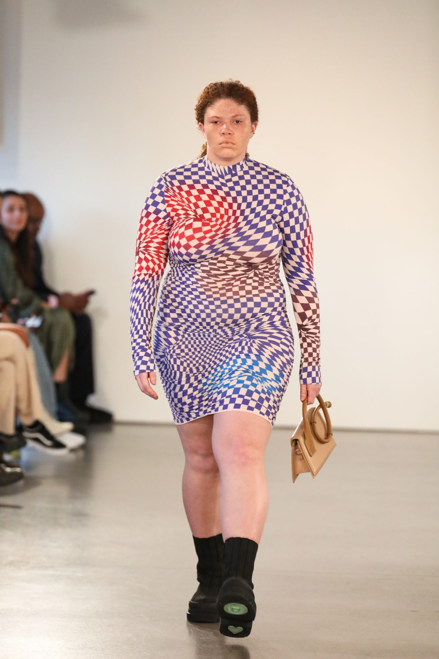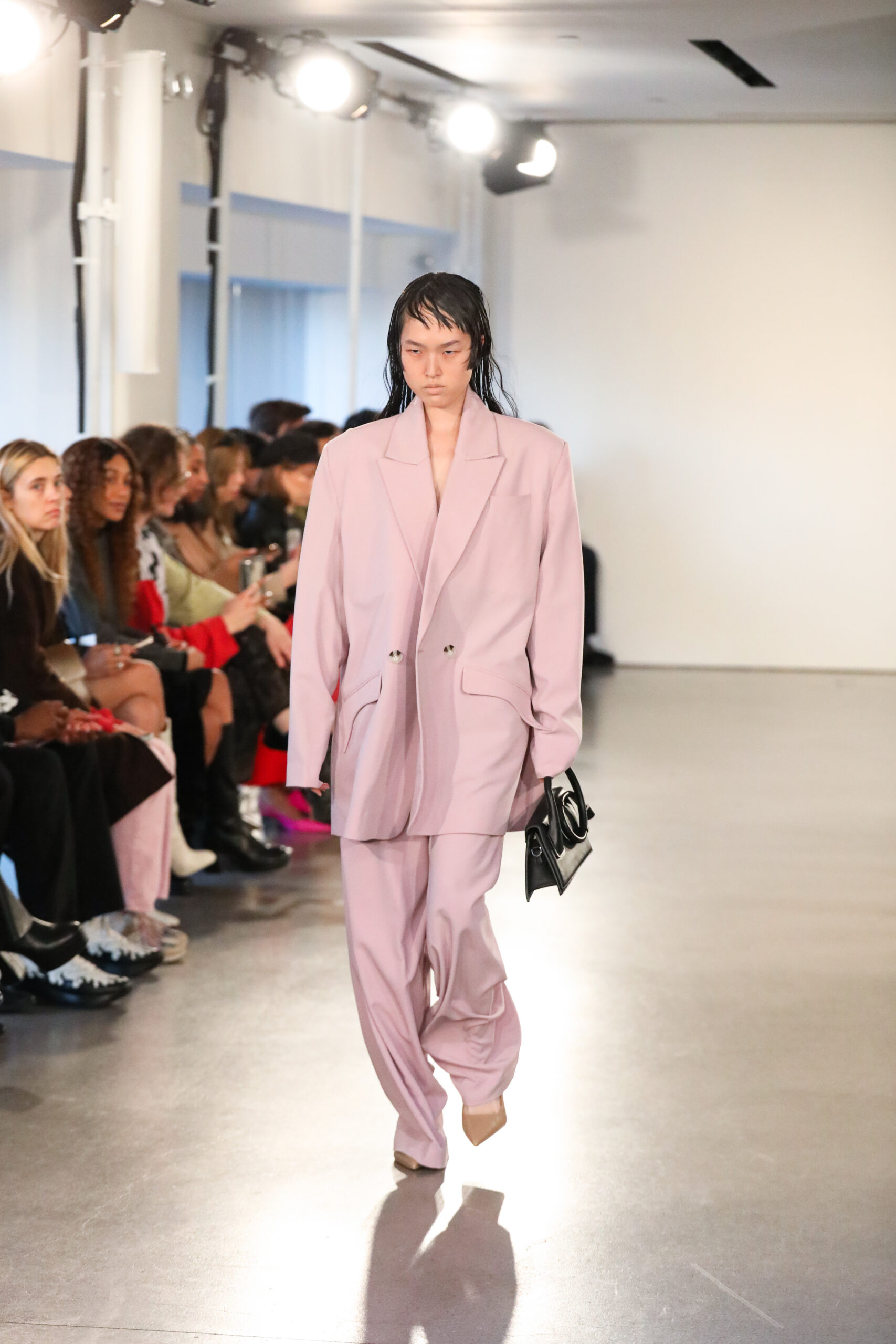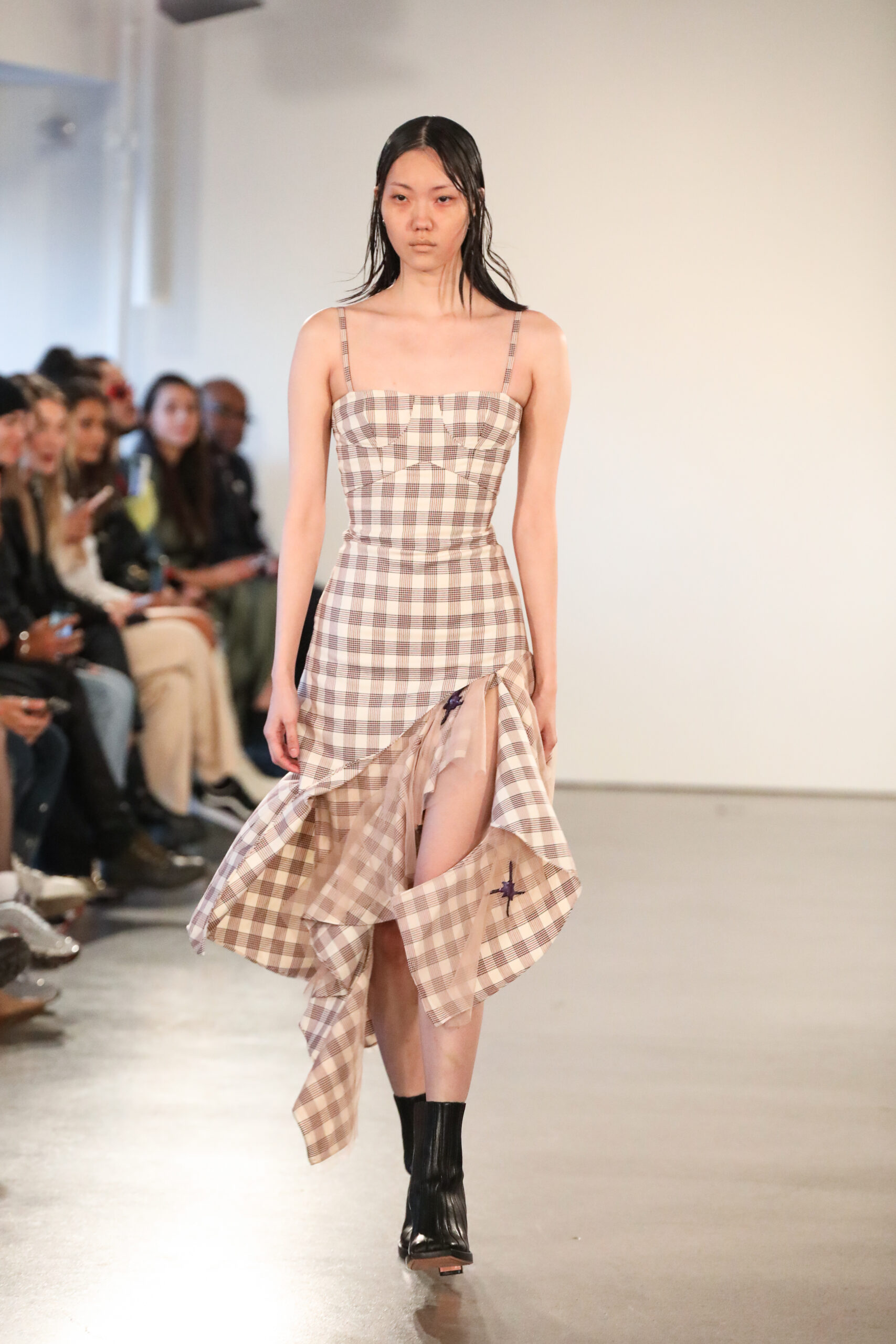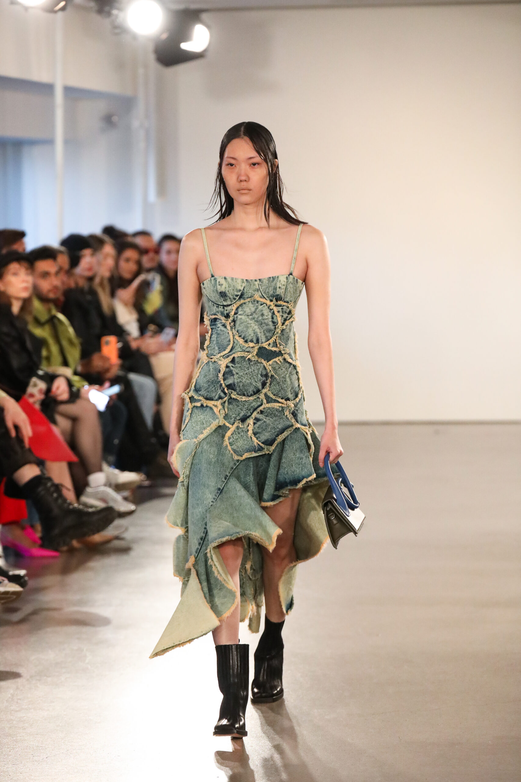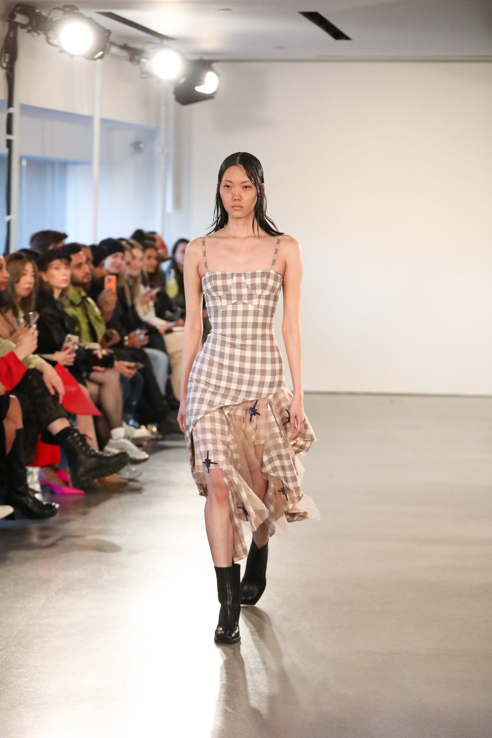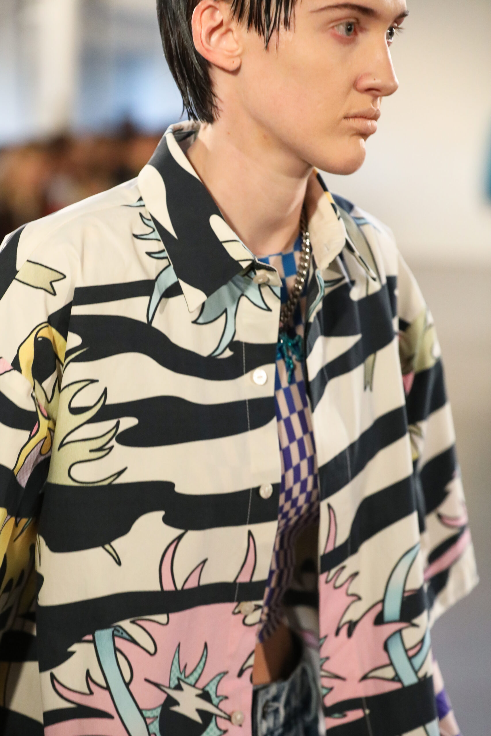 L’esprit est une entité prolifique, une prairie regorgeant de bizarreries. Certaines sont des biomorphes, qui confèrent à des phénomènes visuels banals des formes idiosyncrasiques, tandis que d’autres défient toute logique et toute limite pour libérer une cacophonie désinhibée d’images violemment euphoriques et appellent un besoin primordial de voir audelà du domaine des possibilités. KGL explore la complexité des pensées et des sentiments dans sa collection FW ’23 Agrestal Mind, tout en gardant intacte l’essence du paradoxe qui traverse l’éthique du design de la marque. Les lignes et les limites oscillent entre courbes douces et bords déchiquetés, tandis que les surfaces sont surchargées d’une riche pléthore de textures, à la fois tactiles et visuelles. Des tons neutres et tranquilles servent de base à la prolifération de bleus et de teintes viridiennes, tandis que des accents de roses et de jaunes éclatants les revigorent, ajoutant une nouvelle profondeur et de nouvelles perspectives. Une créature aux multiples facettes sert de mascotte pour la saison – concoctée comme une représentation de la curiosité innée et de la malléabilité de la psyché. Des versions tordues et alambiquées des grilles uniformes et des rayures apaisantes ornent les imprimés et les broderies, imitant la nature dans sa forme la plus sauvage et incontrôlée. Les proportions sont jouées de manière arbitraire et les éléments se bloquent les uns les autres pour être abrupts et fragmentés. Au milieu des tissus, on peut trouver des textures brillantes, des points décoratifs et des bordures de cuir renforcées. Grâce à un mélange d’éléments psychédéliques simples et de fleurs extravagantes de motifs brodés, de pièces décontractées et classiquement taillées, la dichotomie d’une imagination active est mise en avant. Une fête pour une personne qui se transforme en ruine, une créature émanant d’une boule à facettes qui scintille dans l’esprit, des fleurs qui agissent comme des portails de transformation : tout est aussi réel que possible dans le royaume infini de l’esprit.