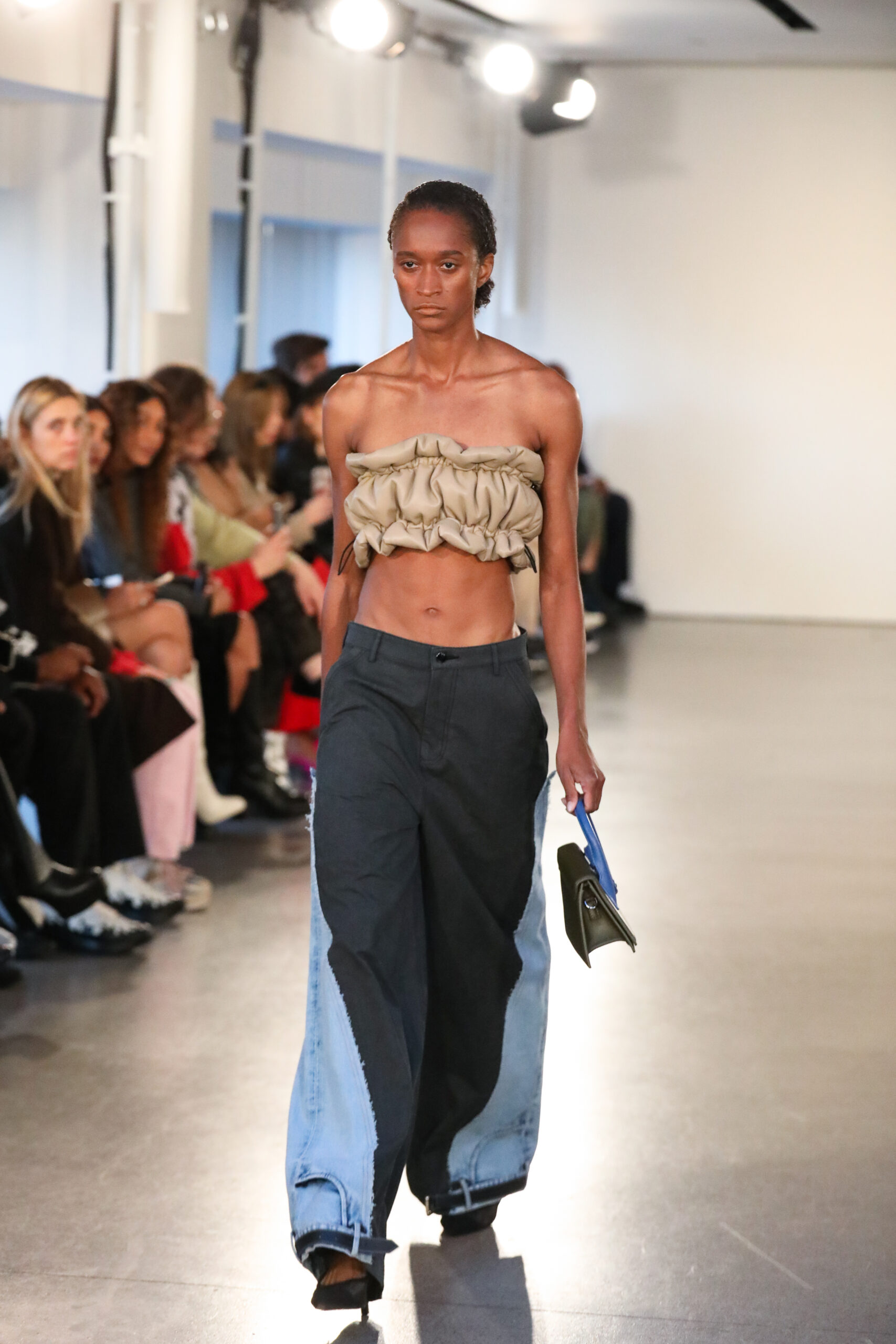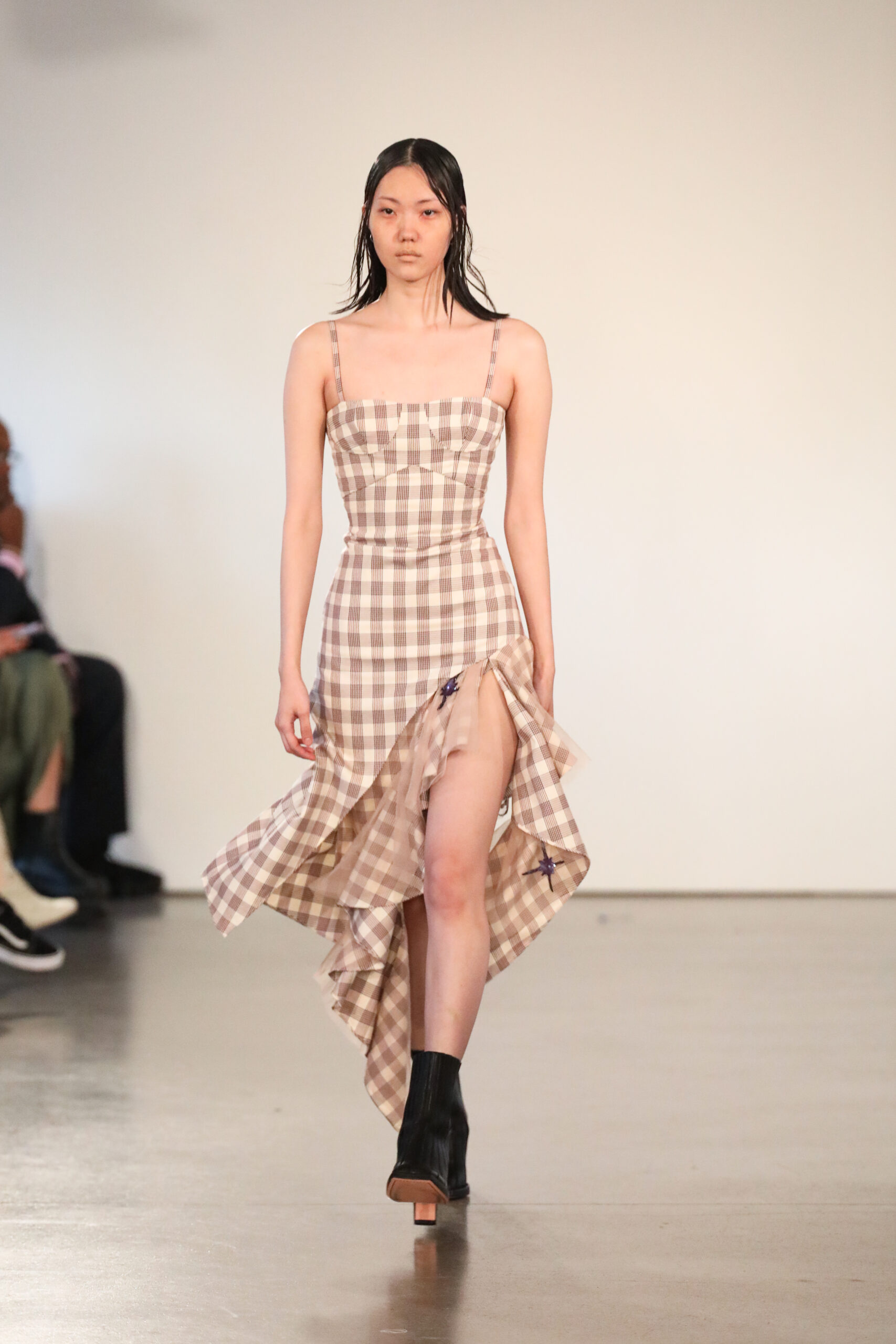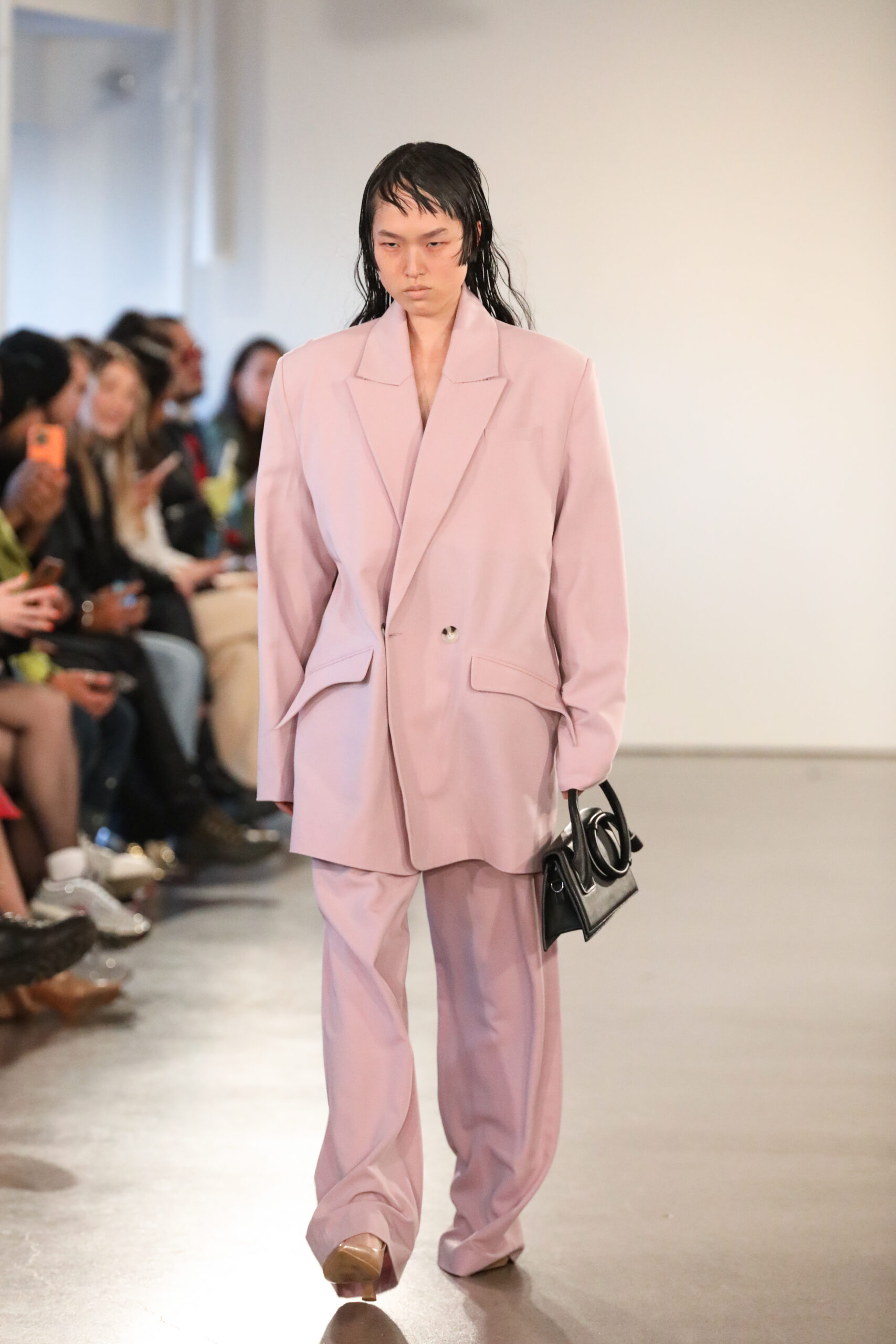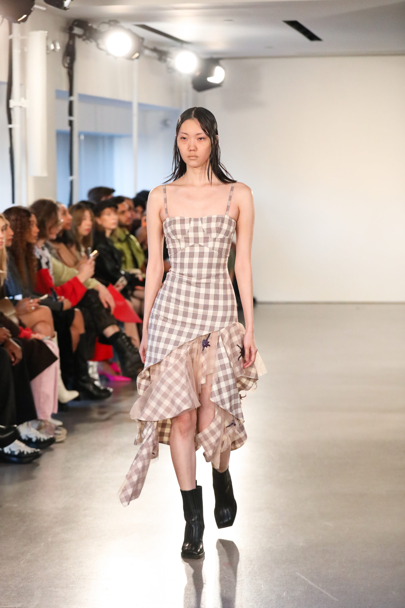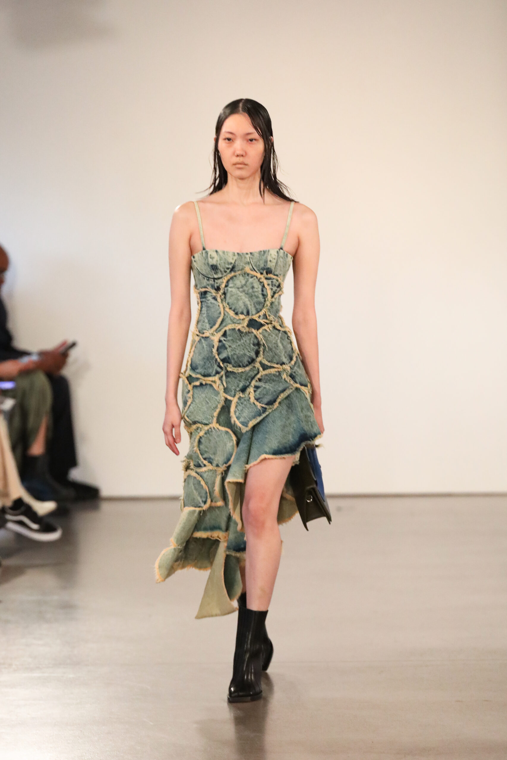 L’esprit est une entité prolifique, une prairie regorgeant de bizarreries. Certaines sont des biomorphes, qui confèrent à des phénomènes visuels banals des formes idiosyncrasiques, tandis que d’autres défient toute logique et toute limite pour libérer une cacophonie désinhibée d’images violemment euphoriques et appellent un besoin primordial de voir audelà du domaine des possibilités. KGL explore la complexité des pensées et des sentiments dans sa collection FW ’23 Agrestal Mind, tout en gardant intacte l’essence du paradoxe qui traverse l’éthique du design de la marque. Les lignes et les limites oscillent entre courbes douces et bords déchiquetés, tandis que les surfaces sont surchargées d’une riche pléthore de textures, à la fois tactiles et visuelles. Des tons neutres et tranquilles servent de base à la prolifération de bleus et de teintes viridiennes, tandis que des accents de roses et de jaunes éclatants les revigorent, ajoutant une nouvelle profondeur et de nouvelles perspectives. Une créature aux multiples facettes sert de mascotte pour la saison – concoctée comme une représentation de la curiosité innée et de la malléabilité de la psyché. Des versions tordues et alambiquées des grilles uniformes et des rayures apaisantes ornent les imprimés et les broderies, imitant la nature dans sa forme la plus sauvage et incontrôlée. Les proportions sont jouées de manière arbitraire et les éléments se bloquent les uns les autres pour être abrupts et fragmentés. Au milieu des tissus, on peut trouver des textures brillantes, des points décoratifs et des bordures de cuir renforcées. Grâce à un mélange d’éléments psychédéliques simples et de fleurs extravagantes de motifs brodés, de pièces décontractées et classiquement taillées, la dichotomie d’une imagination active est mise en avant. Une fête pour une personne qui se transforme en ruine, une créature émanant d’une boule à facettes qui scintille dans l’esprit, des fleurs qui agissent comme des portails de transformation : tout est aussi réel que possible dans le royaume infini de l’esprit.