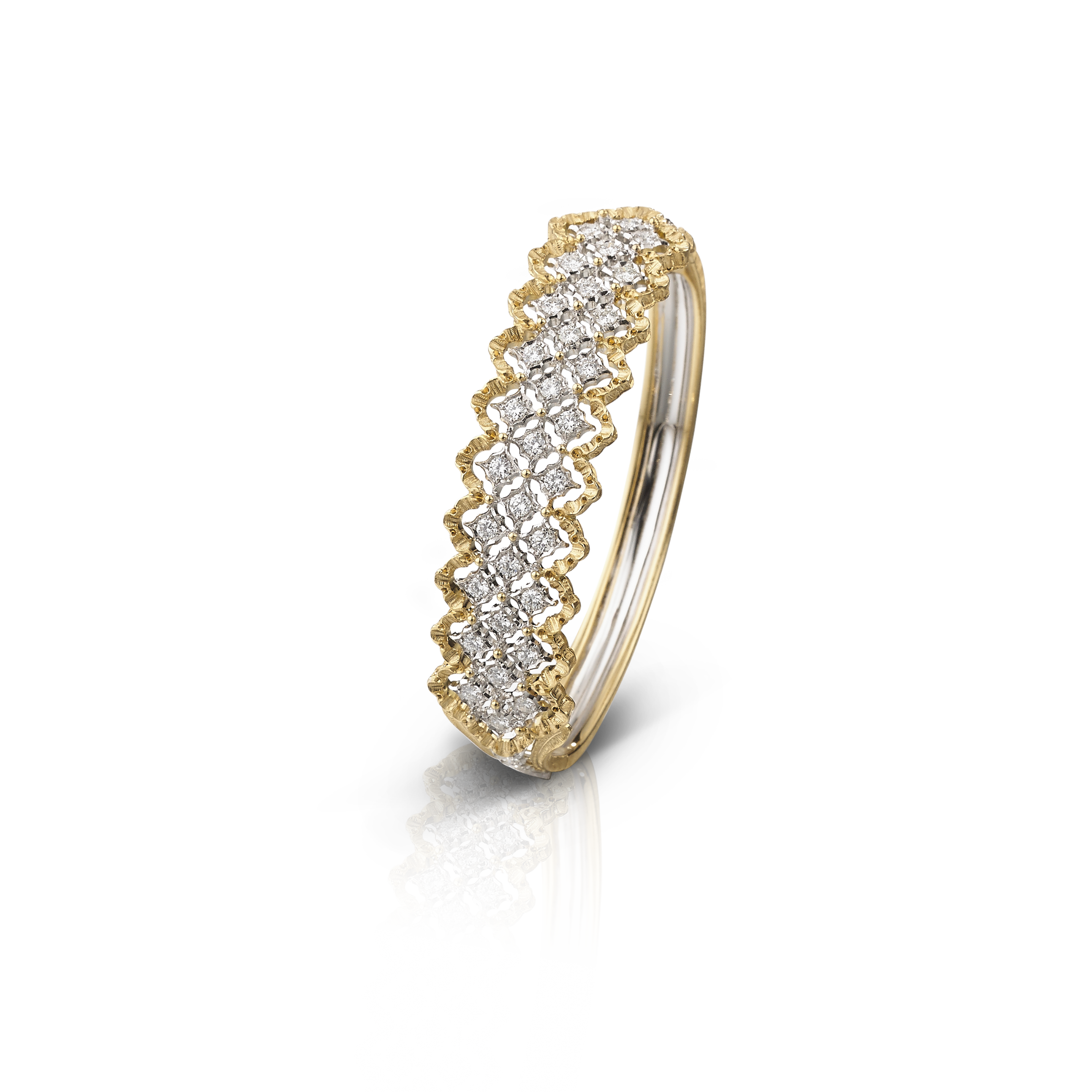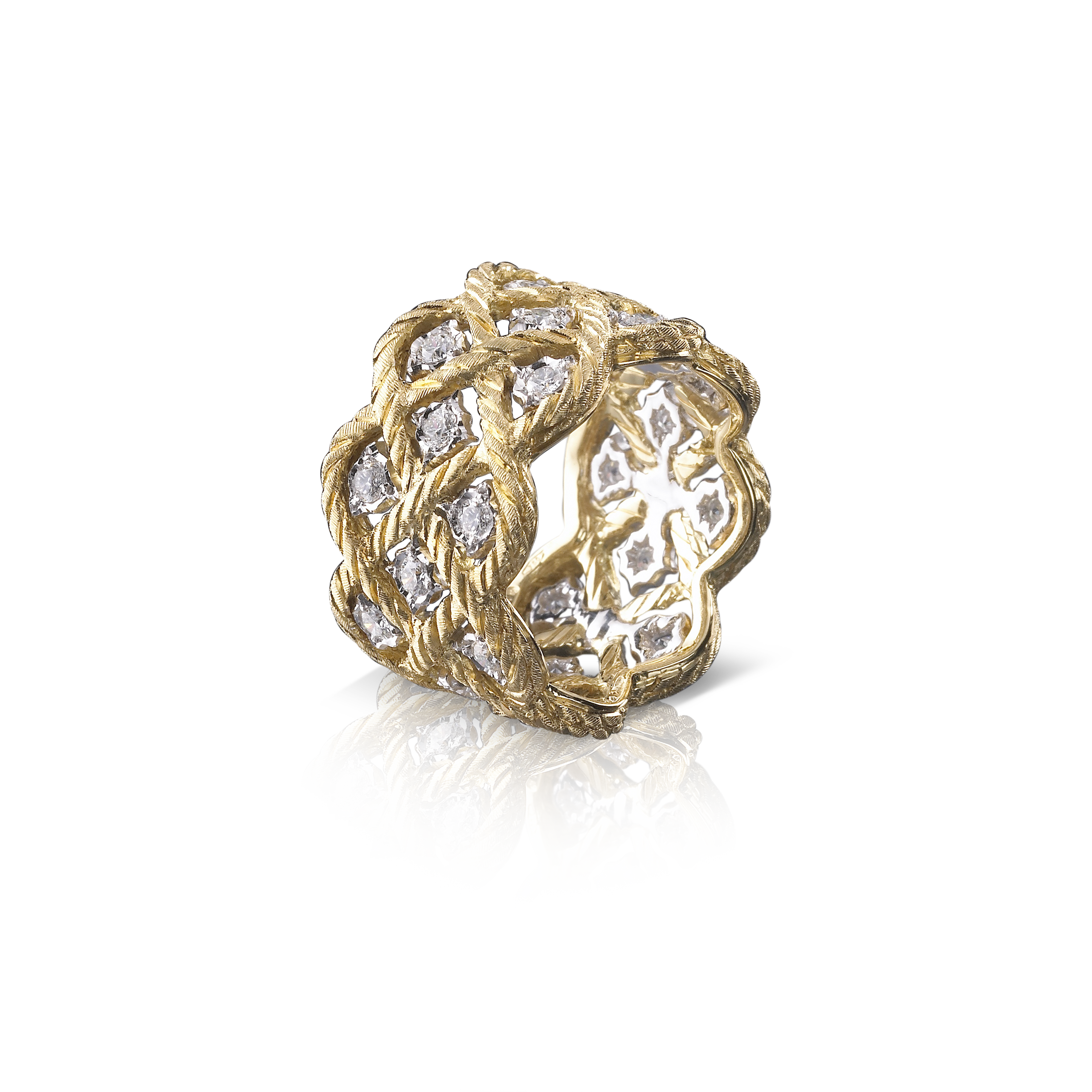 Elle portait les boucles d’oreilles Buccellati collection Rombi deux ors gravés et diamants blancs, ainsi que la bague Buccellati collection Étoilée deux ors gravés et diamants blancs.