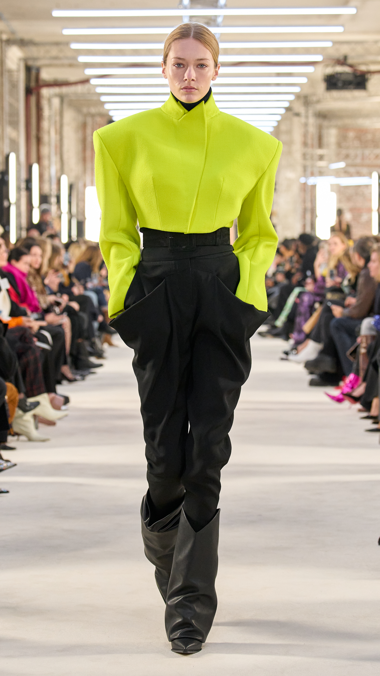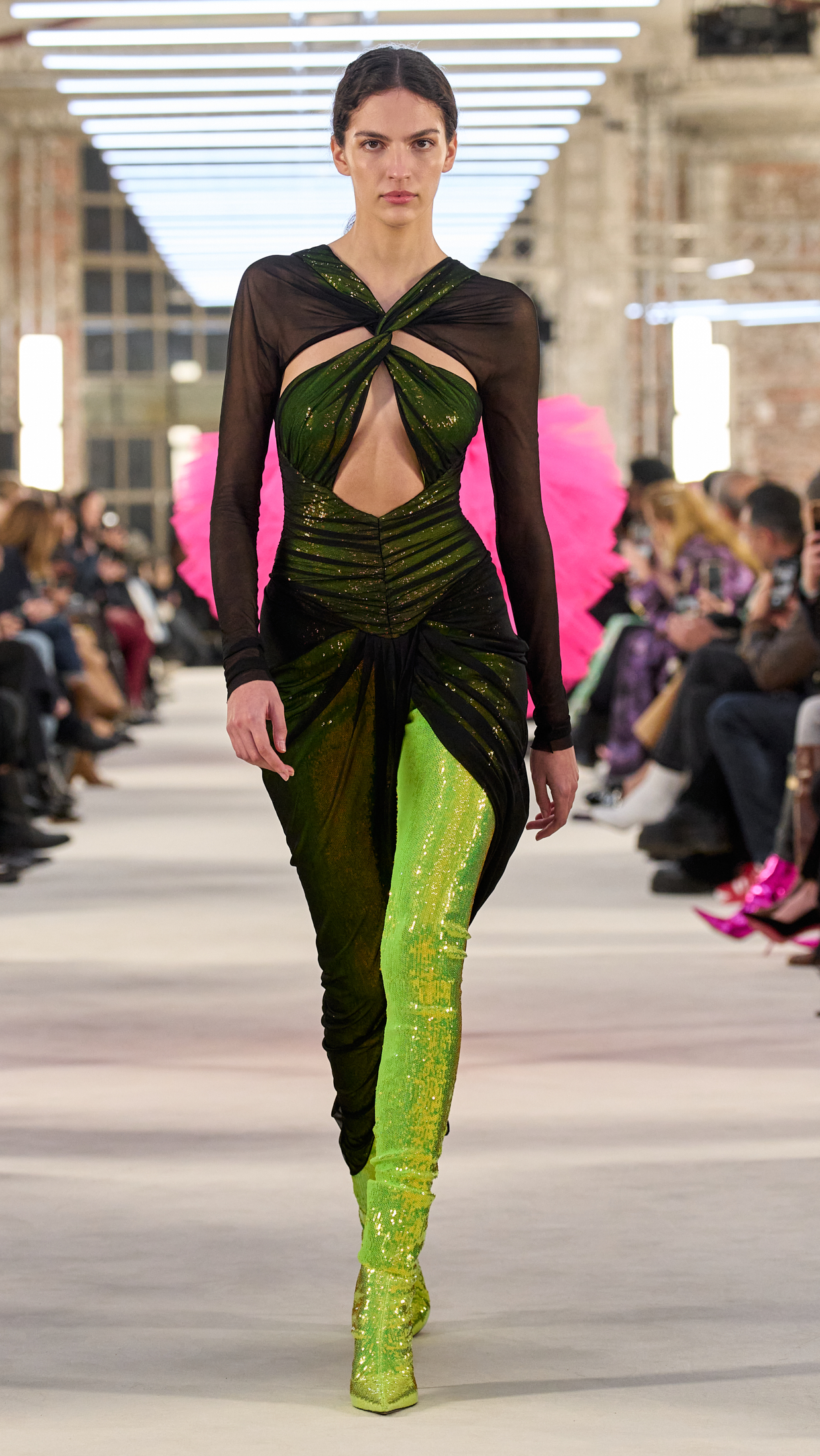 Mais ce n’est pas la seule surprise que nous réserve cette collection. Vauthier a revisité certaines de ses pièces emblématiques telles que les vestes bien coupées, les bombers, les pantalons seconde peau et les ourlets ultra-sexy. Les robes bustier en velours noir ont été ornées d’une explosion de volants rose vif, créant une version modernisée de la jupe bouffante. Les sequins turquoise brillent de la capuche jusqu’aux bottes assorties, en hommage à Grace Jones. Une veste de smoking a été associée à une jupe asymétrique en rhodoid laqué miroir, offrant une vision moderne et originale du motif diamant, qui est la tendance forte de la saison prochaine.