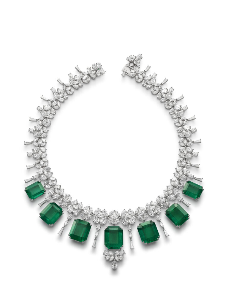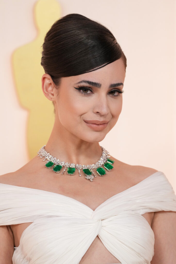 Sofia Carson avait choisi un collier issu de la Collection Haute Joaillerie en or blanc 18 carats certifié Fairmined, serti de 7 émeraudes taille octogonale (122,59 carats) et de diamants taille poire, taille marquise, taille baguette et taille ronde pour un total de 95,27 carats.