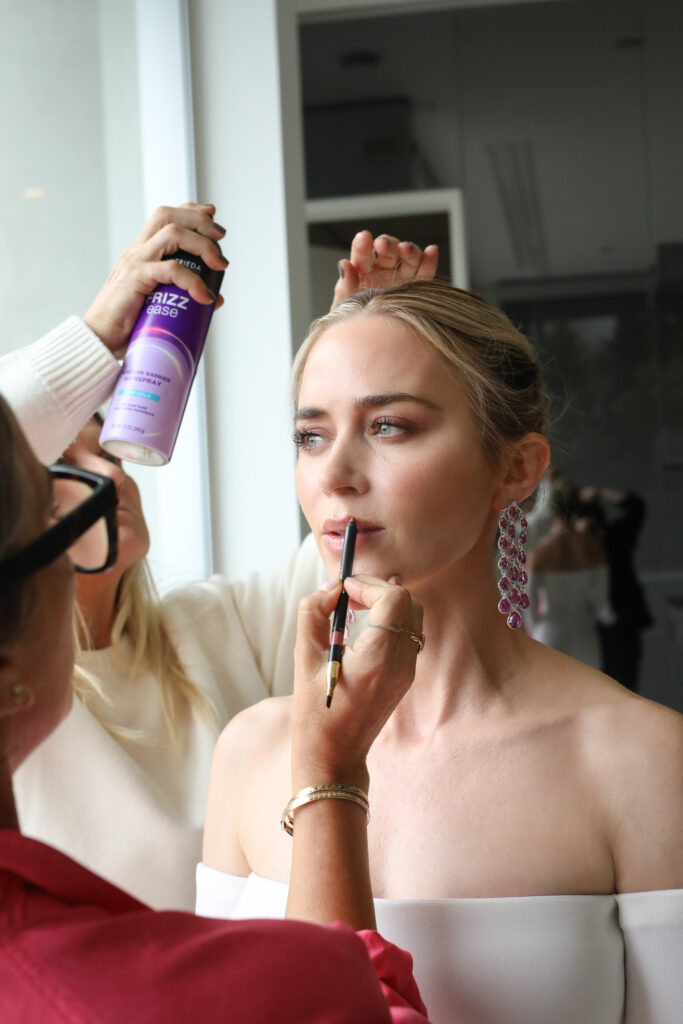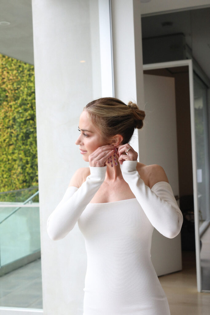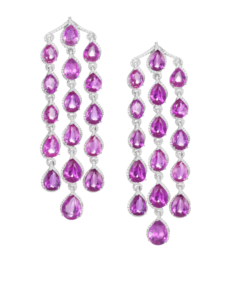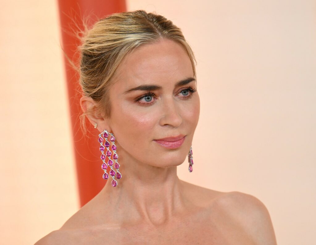 Emily Blunt était parée d’une paire de boucles d’oreilles en or blanc 18 carats serties de saphirs roses taille poire (76,17 carats) et de diamants (5,89 carats), ainsi que de plusieurs bagues issues de la Collection Haute Joaillerie, notamment une en platine sertie de diamants (10,76 carats) et deux autres en or blanc 18 carats serties de diamants et de diamants taille émeraude.