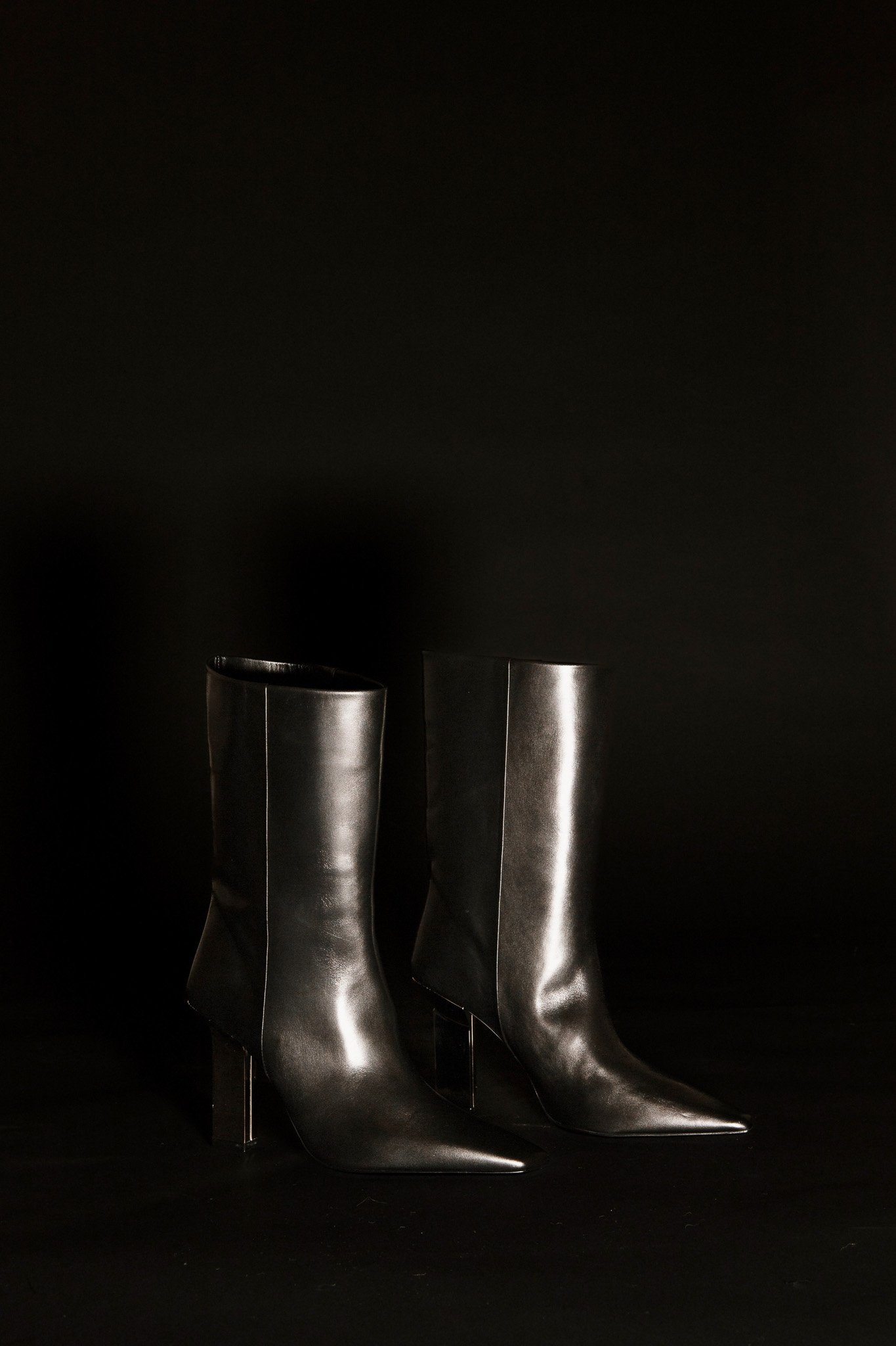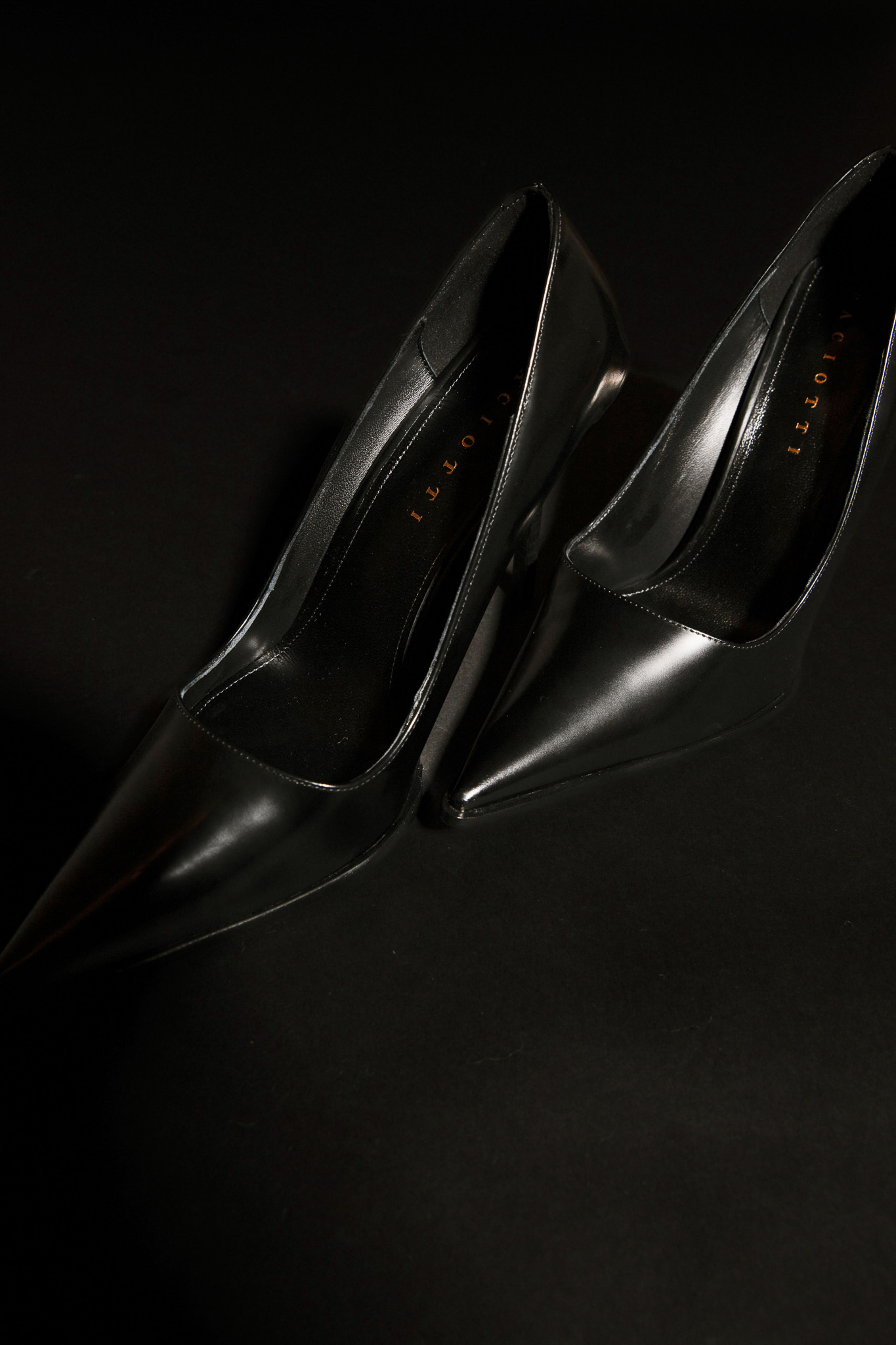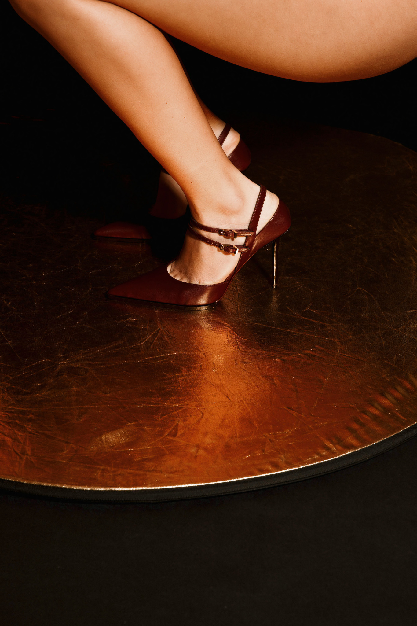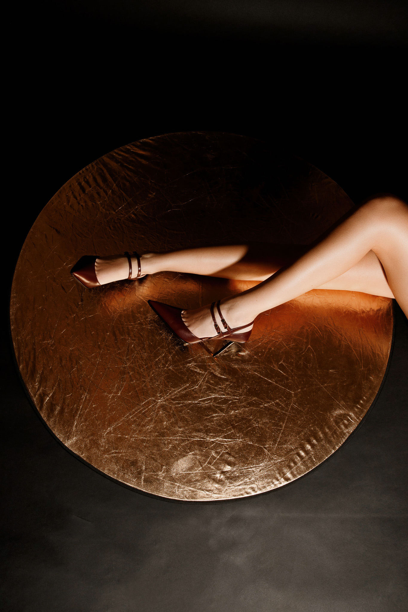 La silhouette ouverte « Miley » représente l’âme la plus féminine et sensuelle des modèles féminins et est présentée dans deux matériaux chauds et importants, le cuir et le velours, décorés de pinces avec des lames dorées.