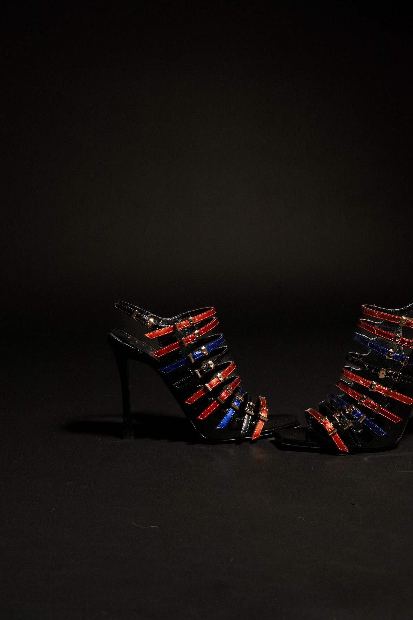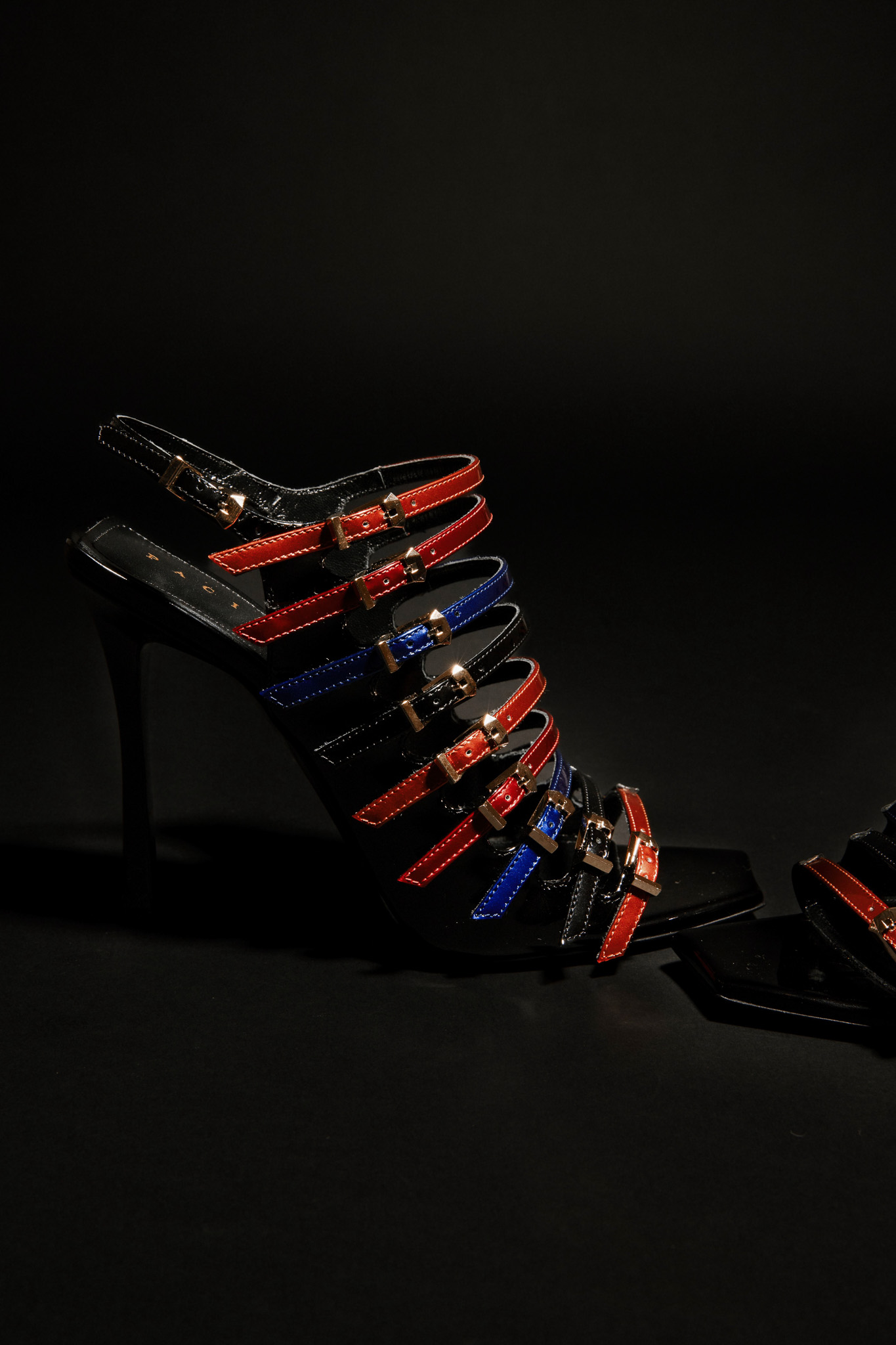 Le fil rouge de la collection femme est l’utilisation de vernis dans une touche punk : noir, aubergine ou multicolore comme dans le cas de la sandale « Lipa 105 ».