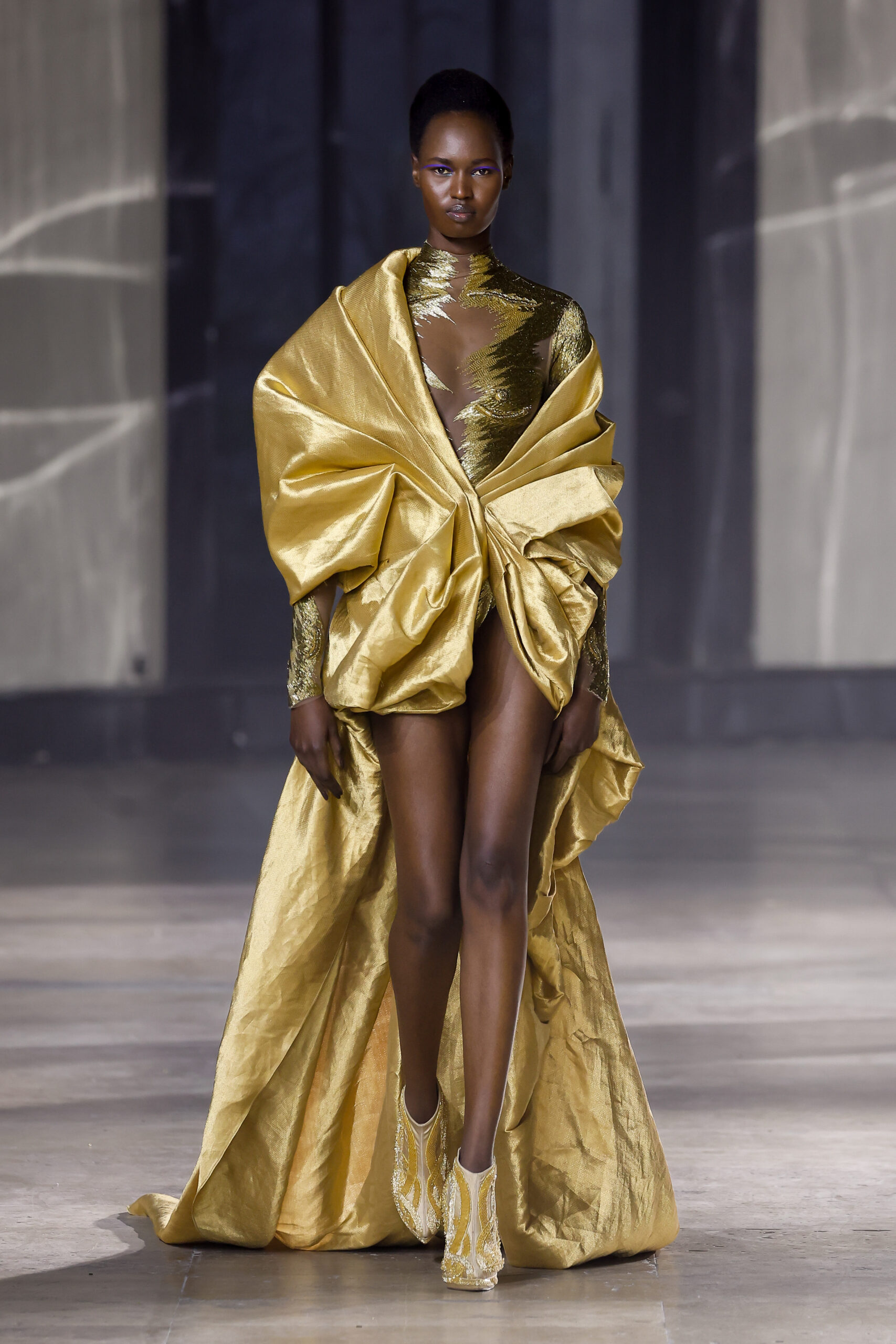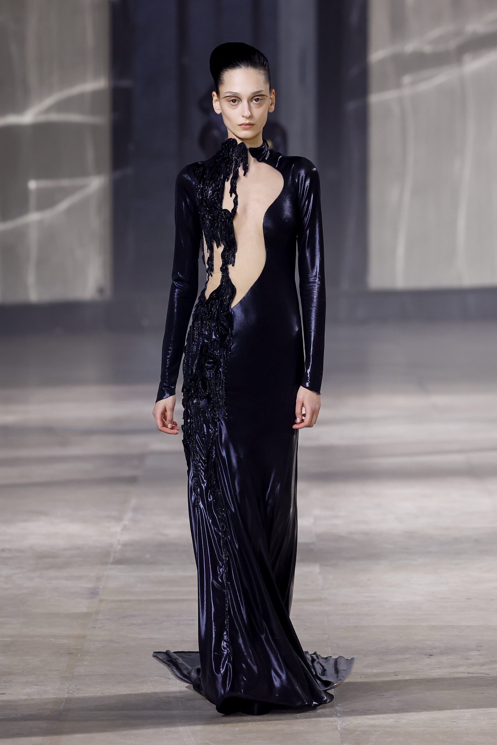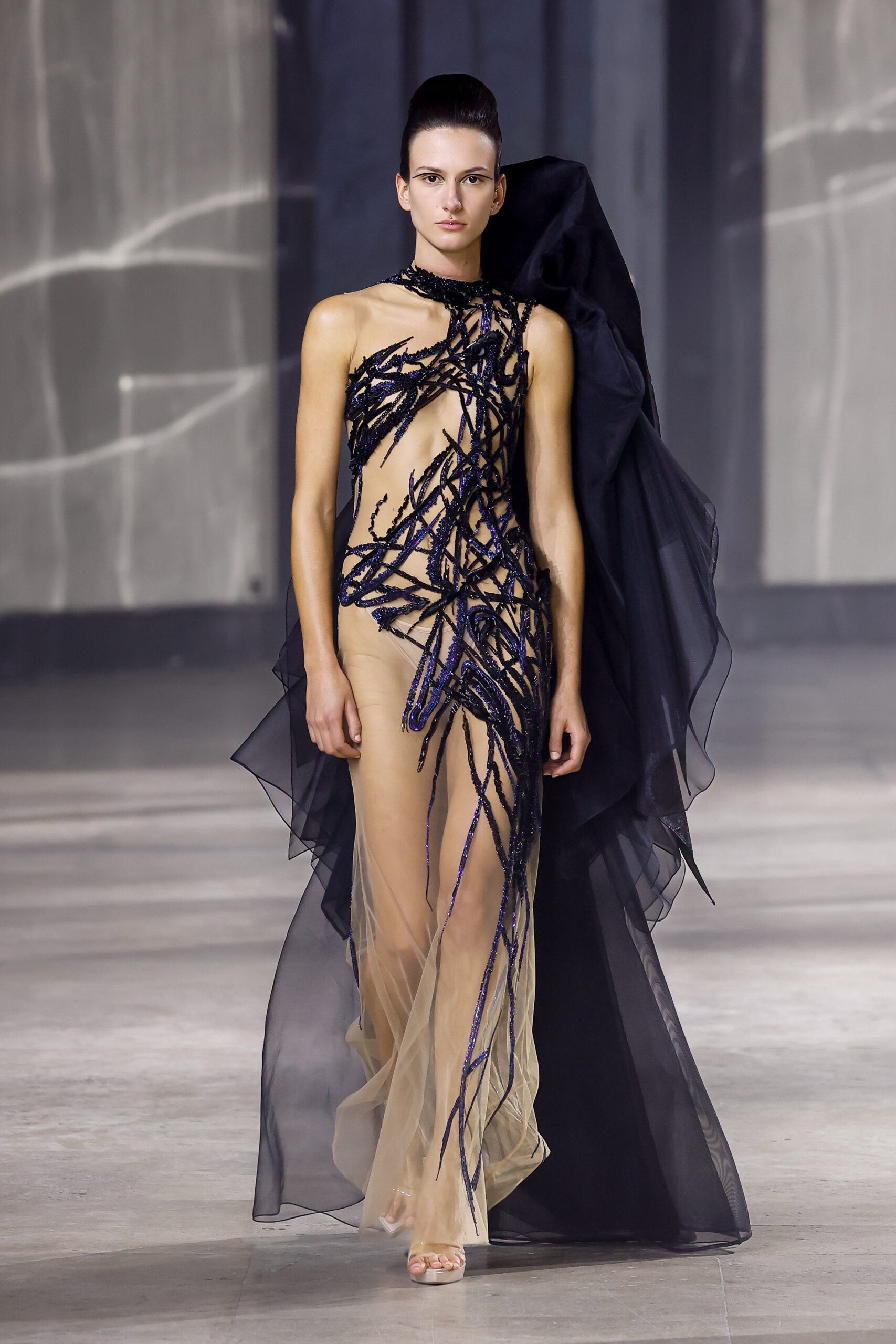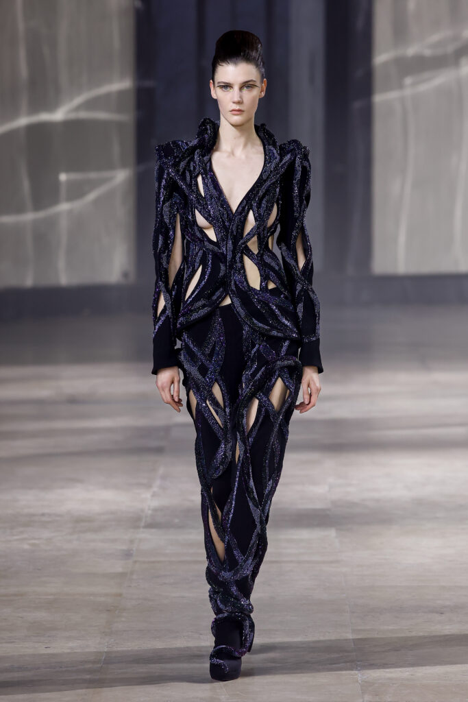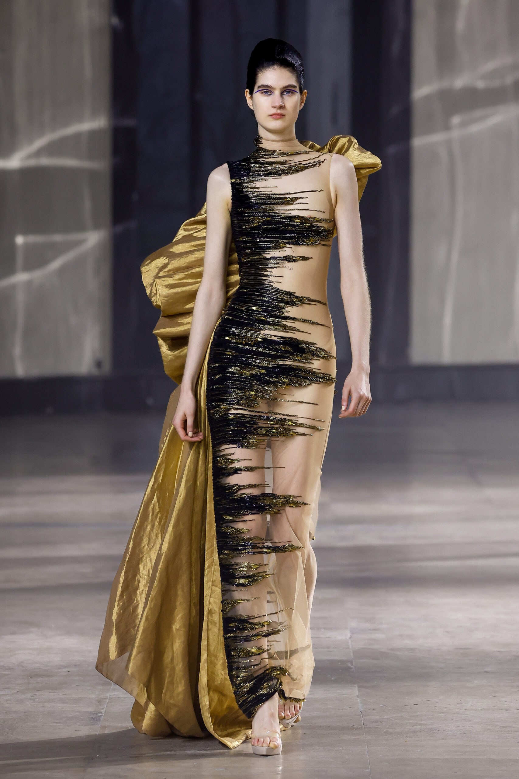 Les robes jumelles en tissu tissé à la main, en or et en argent, incarnent la fusion de l’immobilité du zéro avec les possibilités infinies de l’infini. Les drapés sculpturaux en satin, en mousseline et en organza d’un bleu électrique indigo représentent une vision futuriste. Des robes élémentaires en noir et en nude révèlent stratégiquement la forme dans son état le plus pur, tandis que les broderies lumineuses évoquent la lave en fusion ou les profondeurs d’un océan sombre.