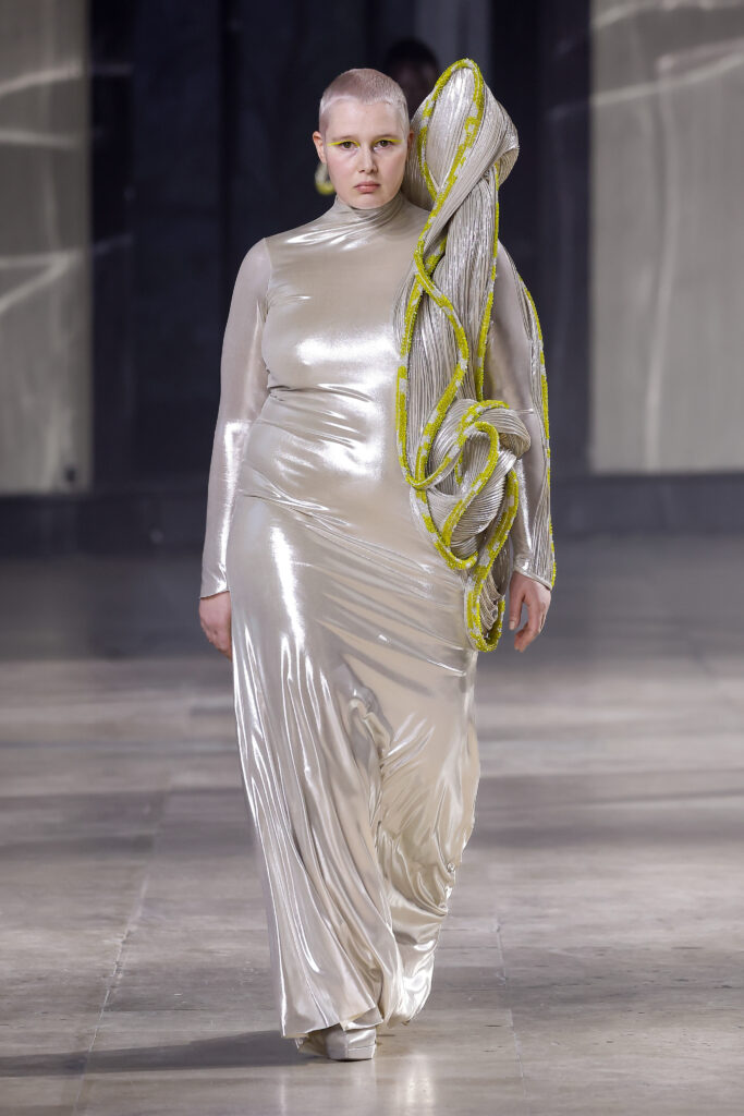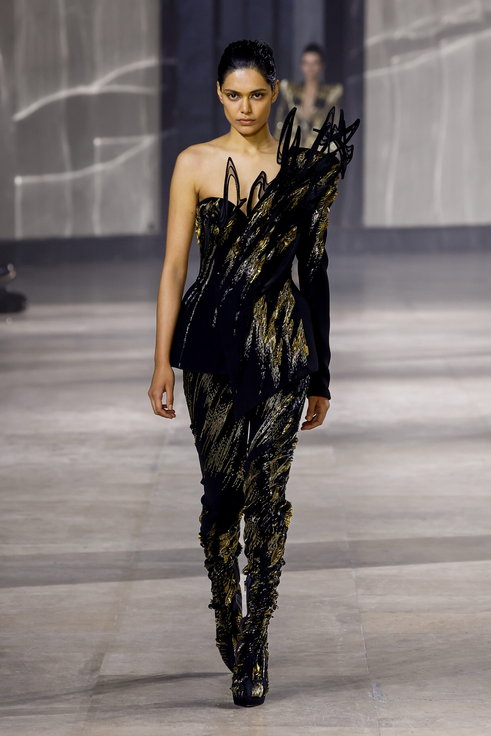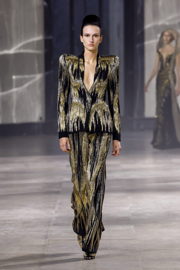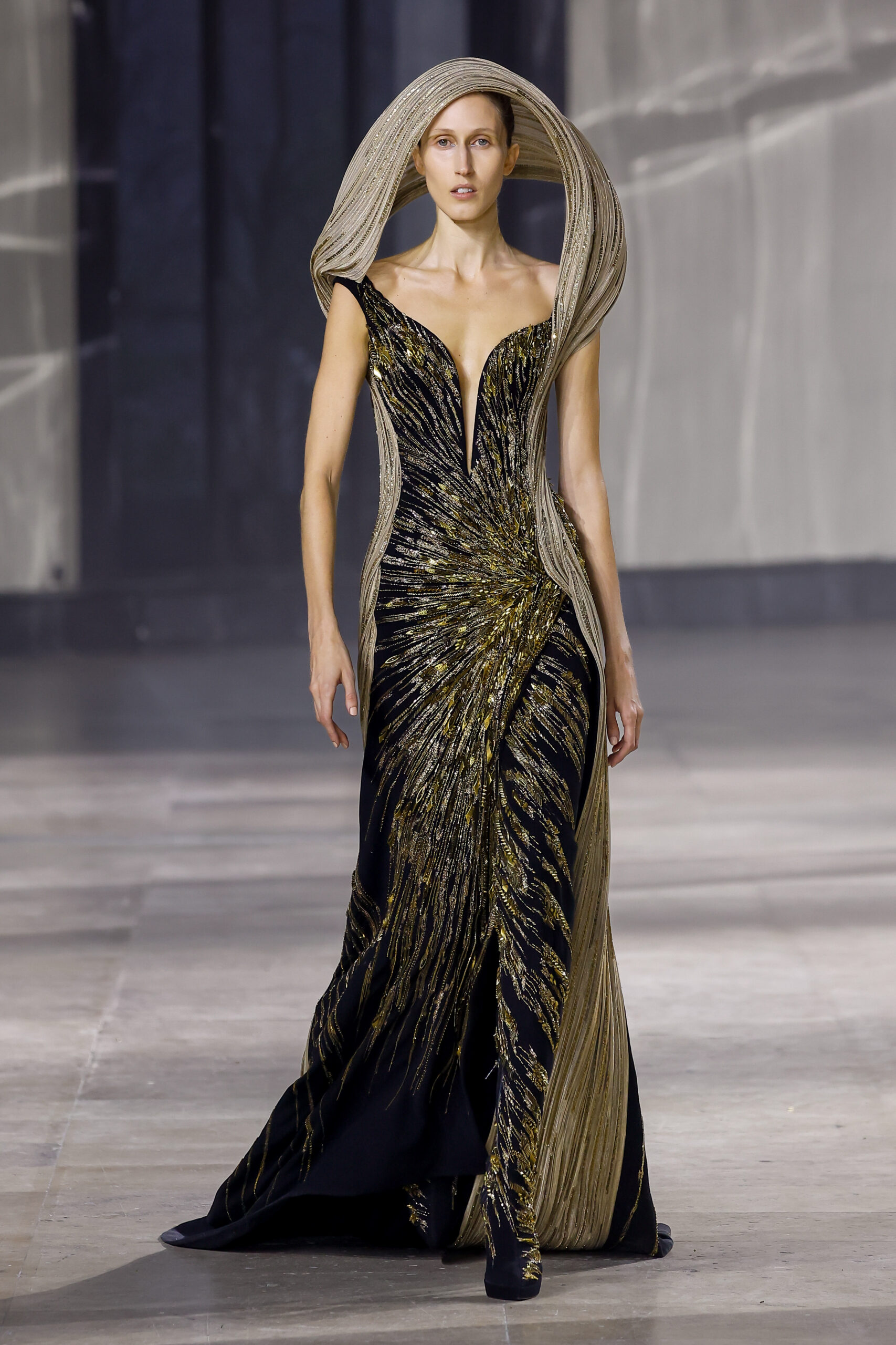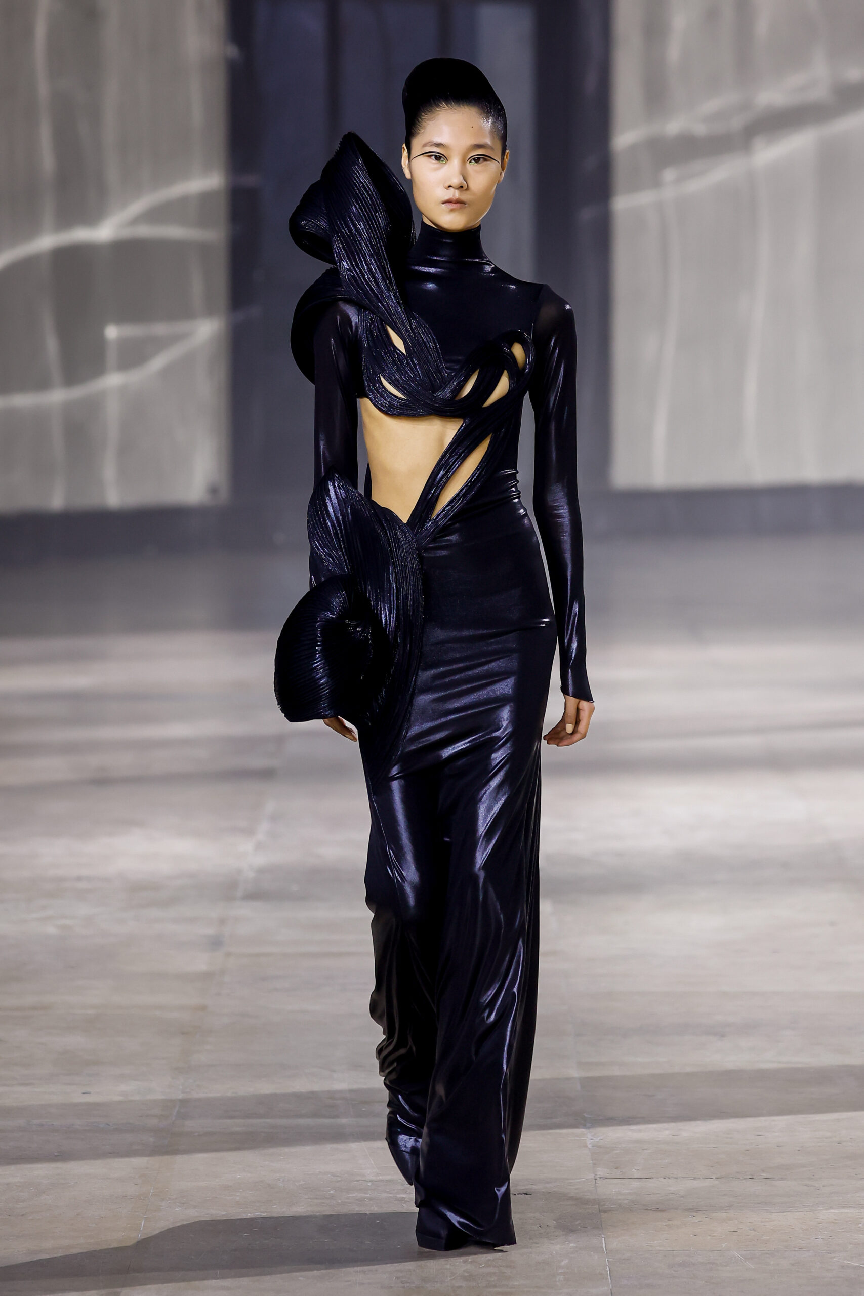 Les robes jumelles en tissu tissé à la main, en or et en argent, incarnent la fusion de l’immobilité du zéro avec les possibilités infinies de l’infini. Les drapés sculpturaux en satin, en mousseline et en organza d’un bleu électrique indigo représentent une vision futuriste. Des robes élémentaires en noir et en nude révèlent stratégiquement la forme dans son état le plus pur, tandis que les broderies lumineuses évoquent la lave en fusion ou les profondeurs d’un océan sombre.