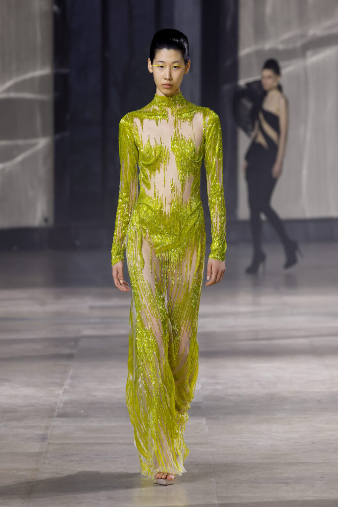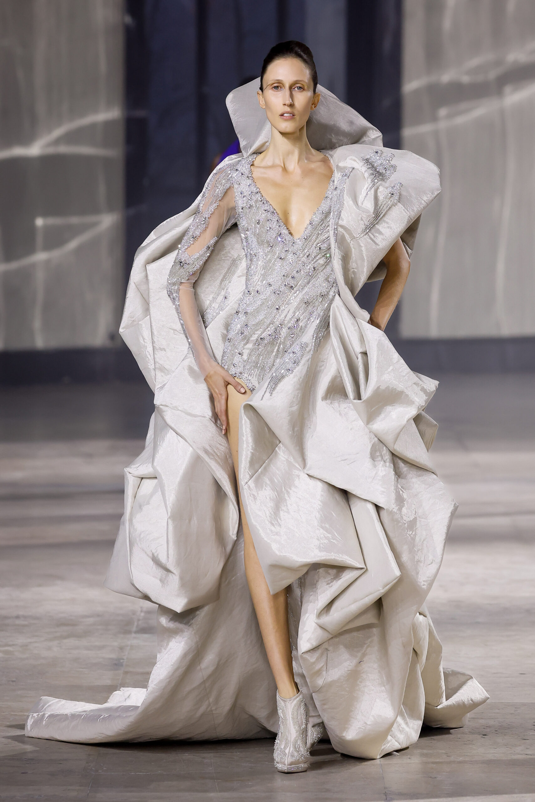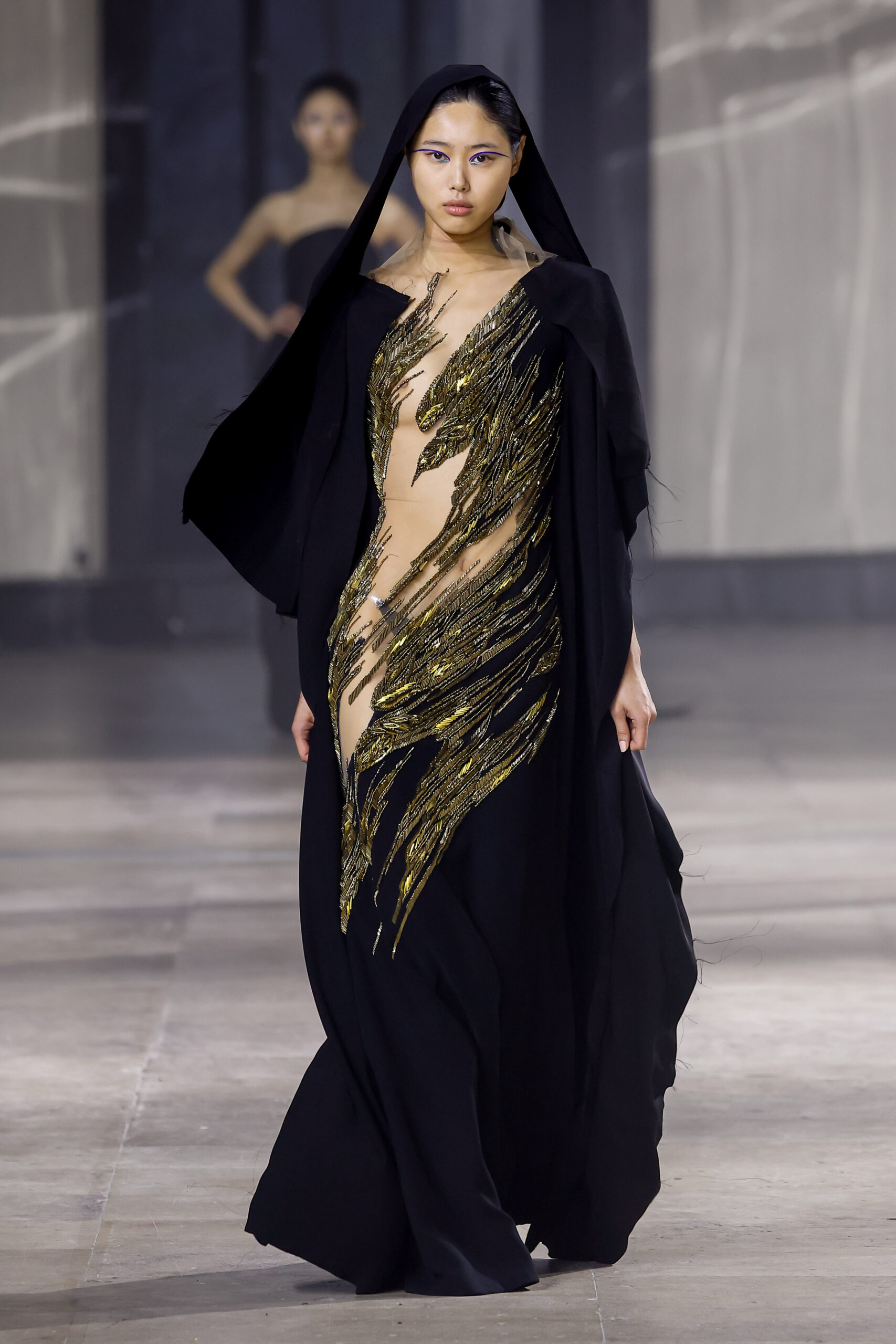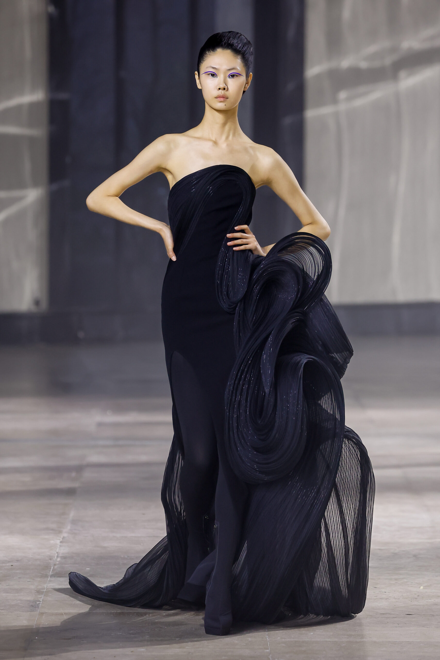 Les robes jumelles en tissu tissé à la main, en or et en argent, incarnent la fusion de l’immobilité du zéro avec les possibilités infinies de l’infini. Les drapés sculpturaux en satin, en mousseline et en organza d’un bleu électrique indigo représentent une vision futuriste. Des robes élémentaires en noir et en nude révèlent stratégiquement la forme dans son état le plus pur, tandis que les broderies lumineuses évoquent la lave en fusion ou les profondeurs d’un océan sombre.