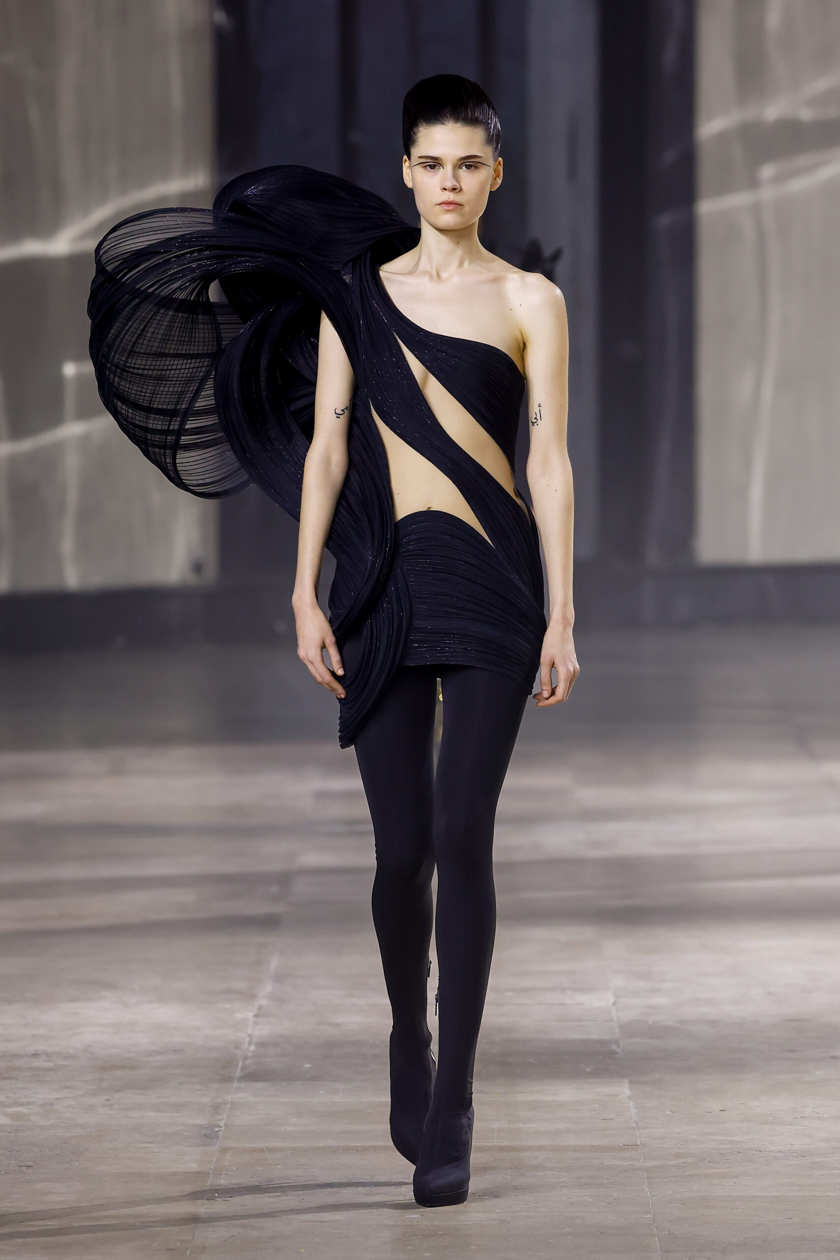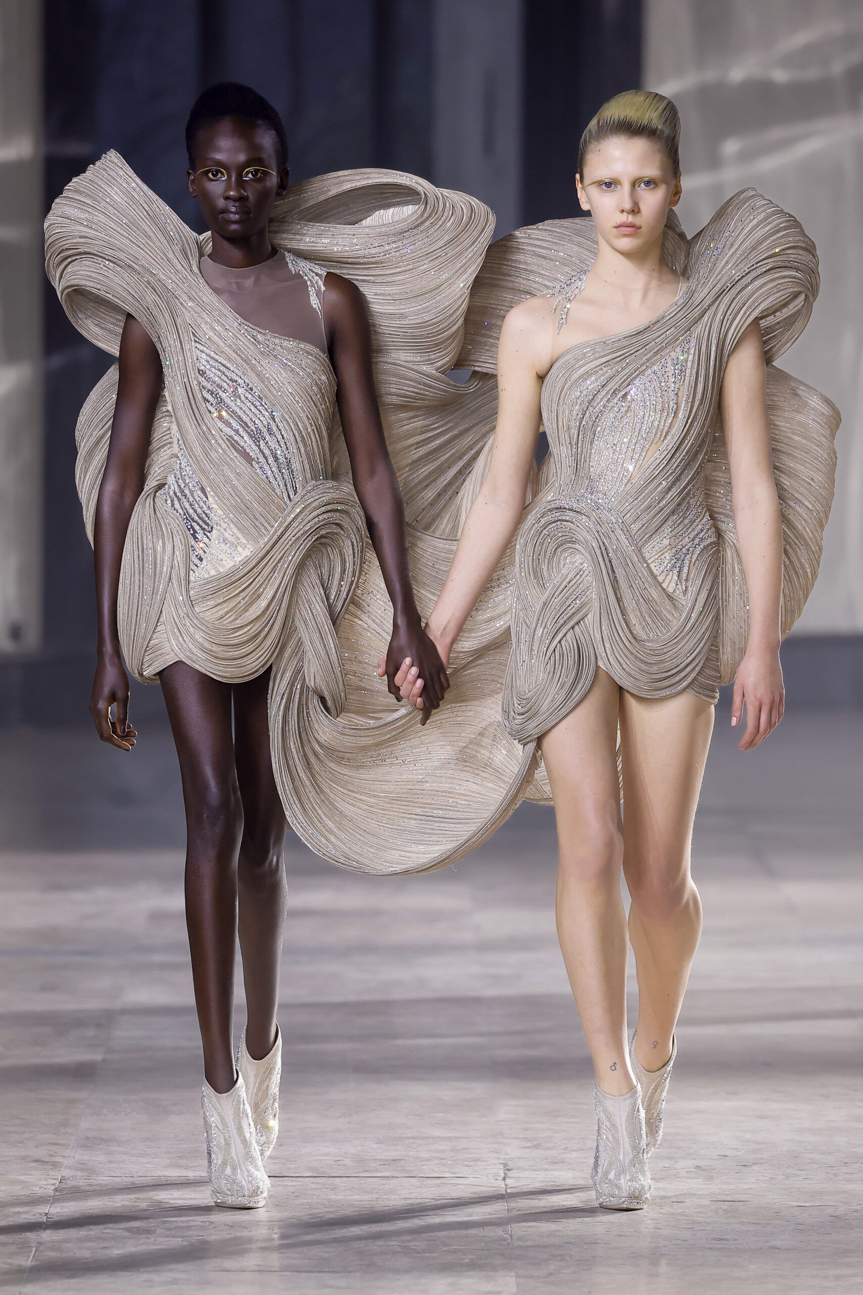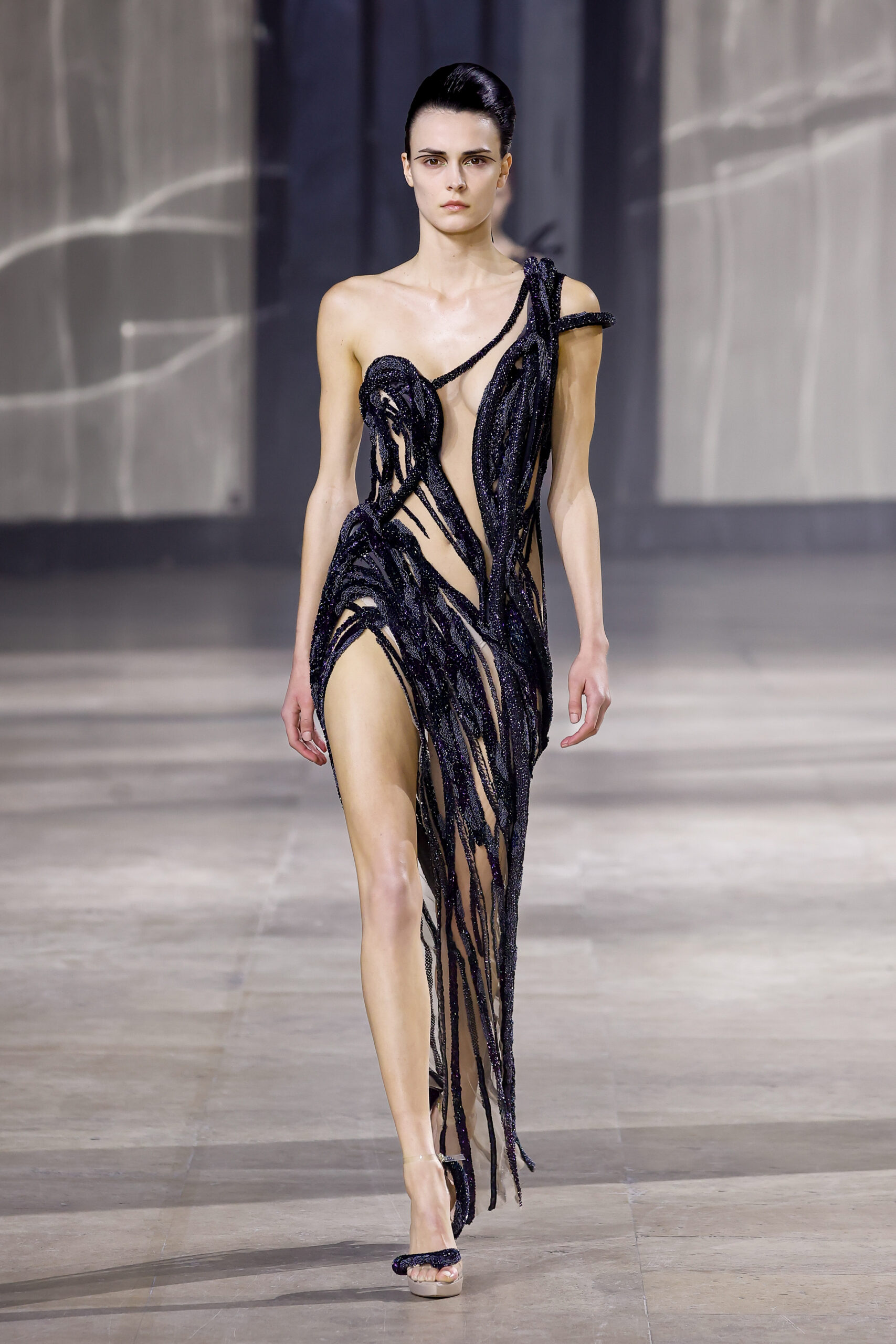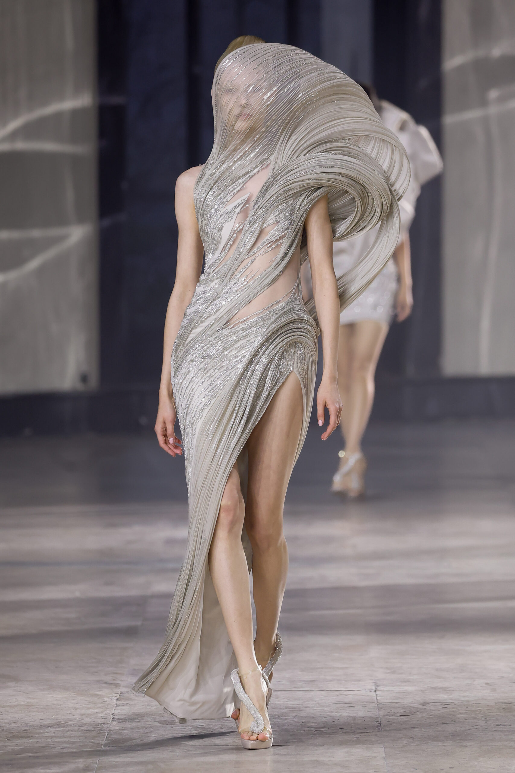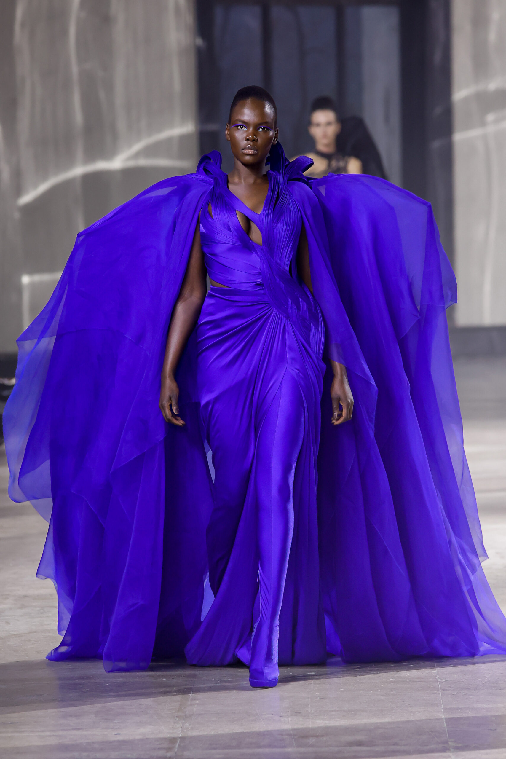 Les robes jumelles en tissu tissé à la main, en or et en argent, incarnent la fusion de l’immobilité du zéro avec les possibilités infinies de l’infini. Les drapés sculpturaux en satin, en mousseline et en organza d’un bleu électrique indigo représentent une vision futuriste. Des robes élémentaires en noir et en nude révèlent stratégiquement la forme dans son état le plus pur, tandis que les broderies lumineuses évoquent la lave en fusion ou les profondeurs d’un océan sombre.