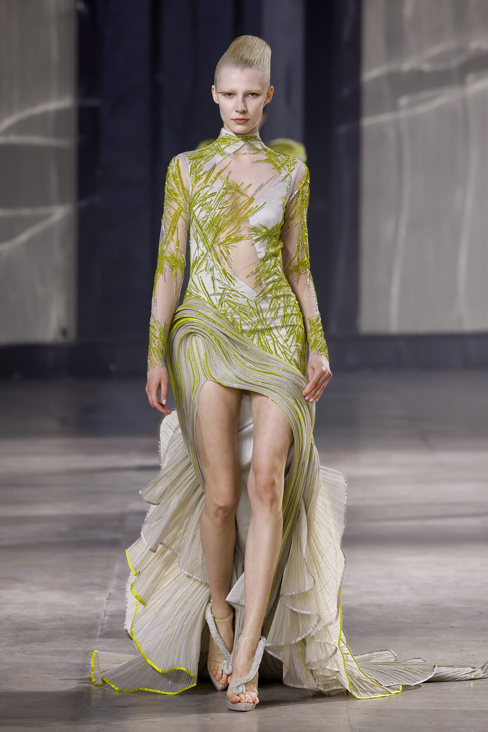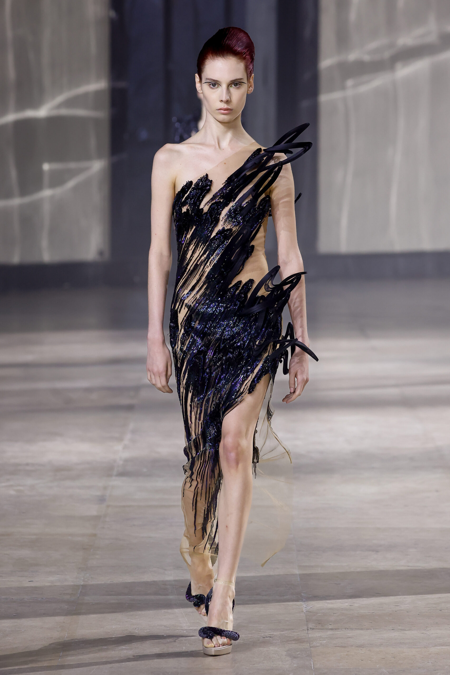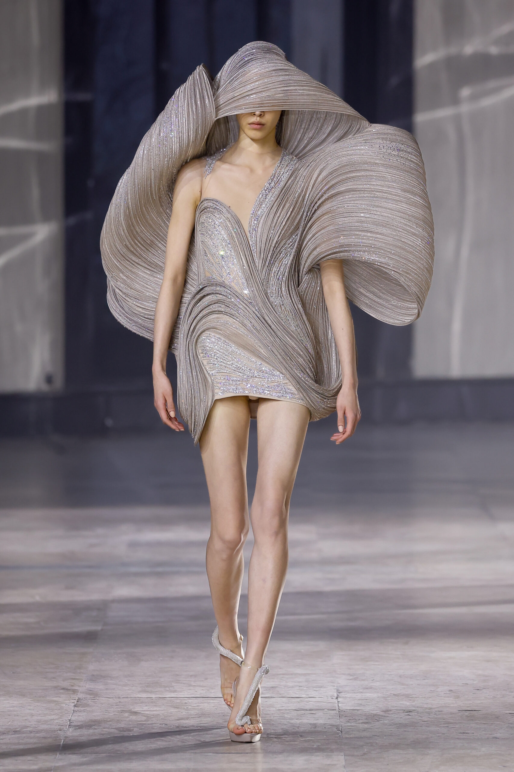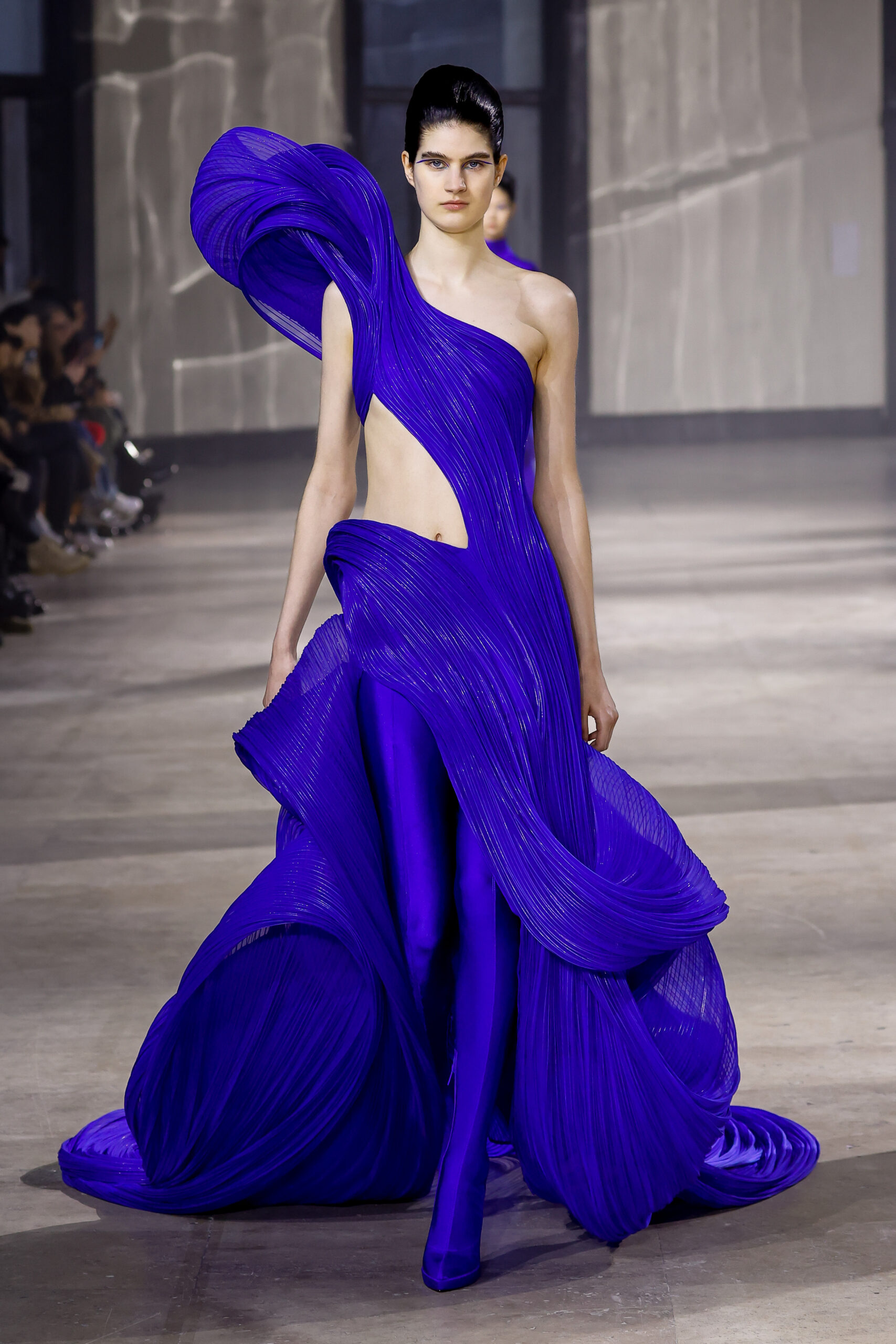 Les robes jumelles en tissu tissé à la main, en or et en argent, incarnent la fusion de l’immobilité du zéro avec les possibilités infinies de l’infini. Les drapés sculpturaux en satin, en mousseline et en organza d’un bleu électrique indigo représentent une vision futuriste. Des robes élémentaires en noir et en nude révèlent stratégiquement la forme dans son état le plus pur, tandis que les broderies lumineuses évoquent la lave en fusion ou les profondeurs d’un océan sombre.