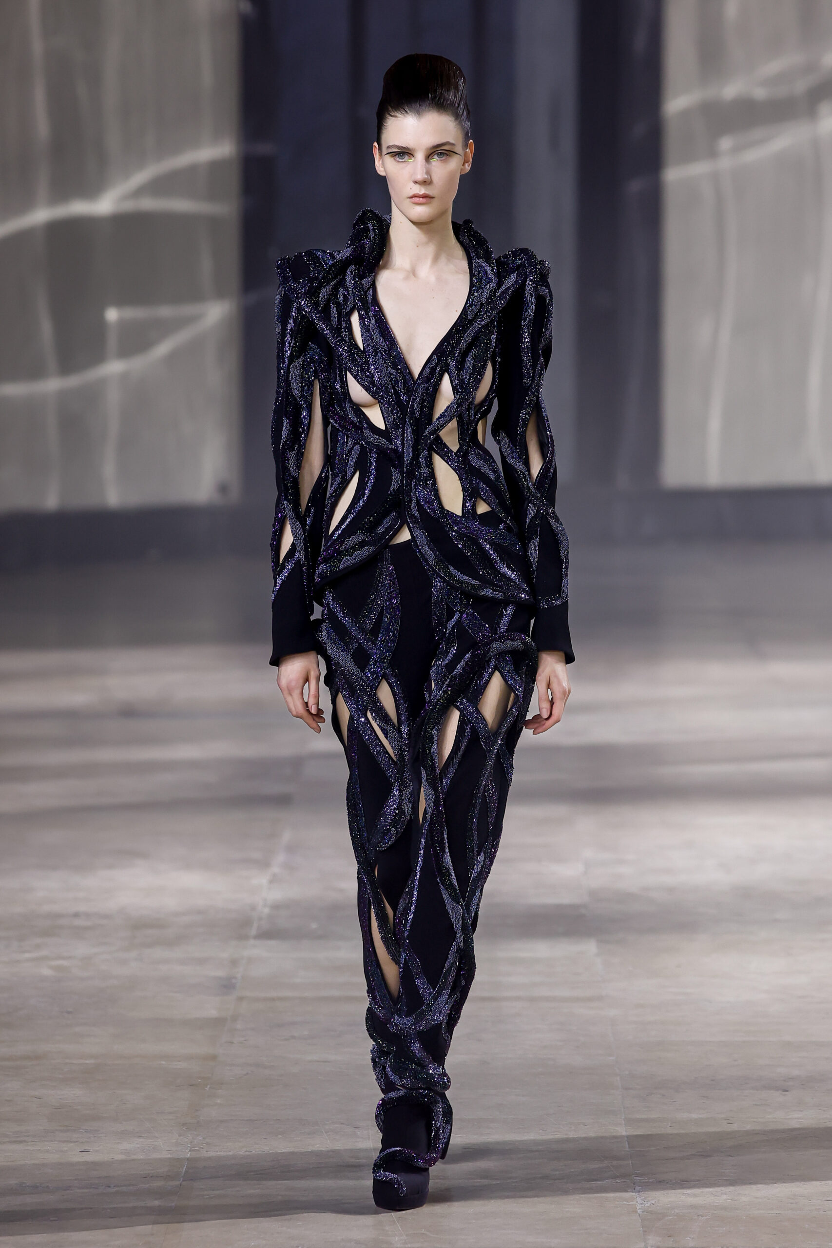 La dernière partie de la collection est en or et noir, inspirée des civilisations égyptiennes anciennes, de l’exploration du temps et de la métaphysique. Les ongles pyramidaux sont cousus dans des broderies directionnelles détaillées, apportant une touche unique à chaque pièce.