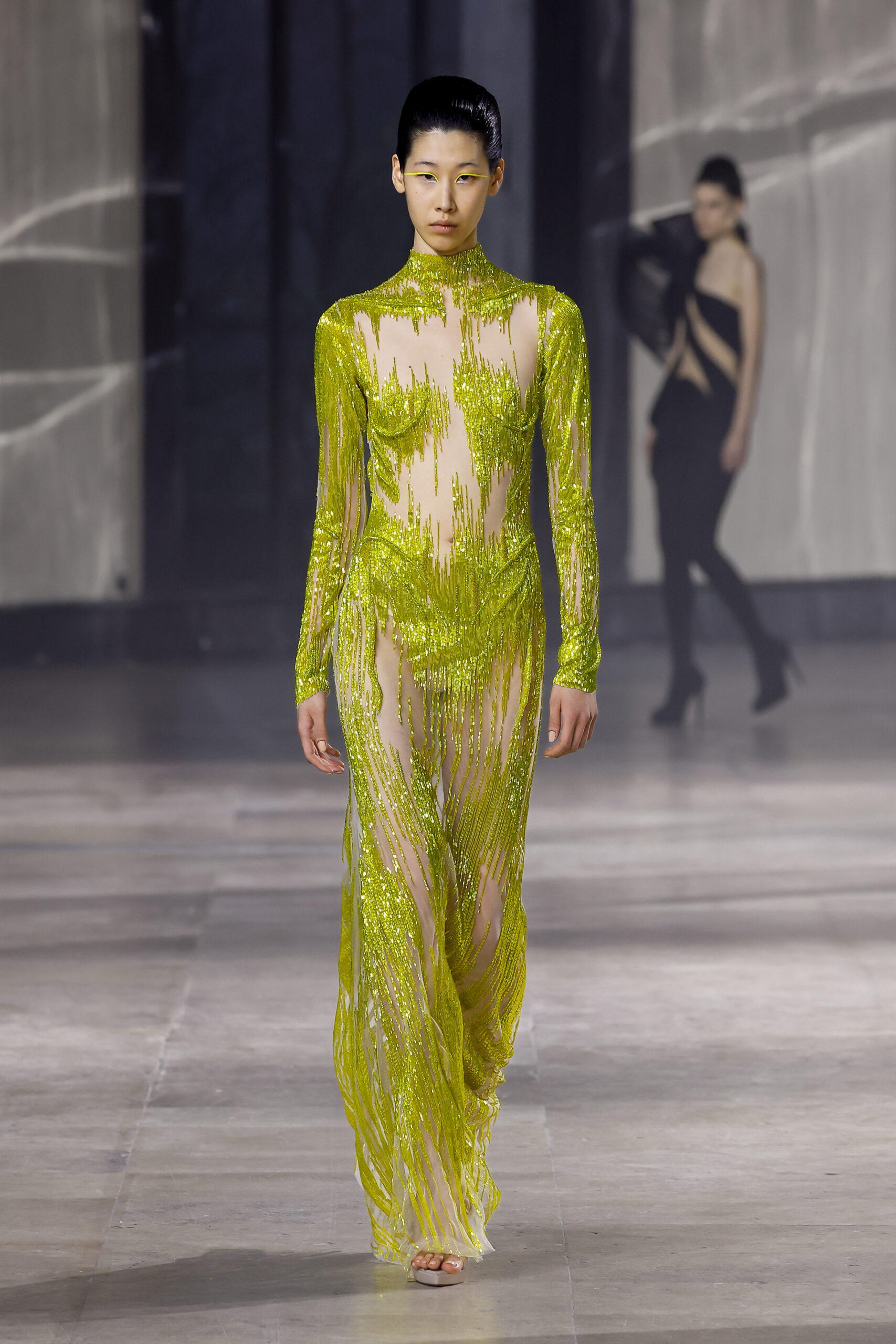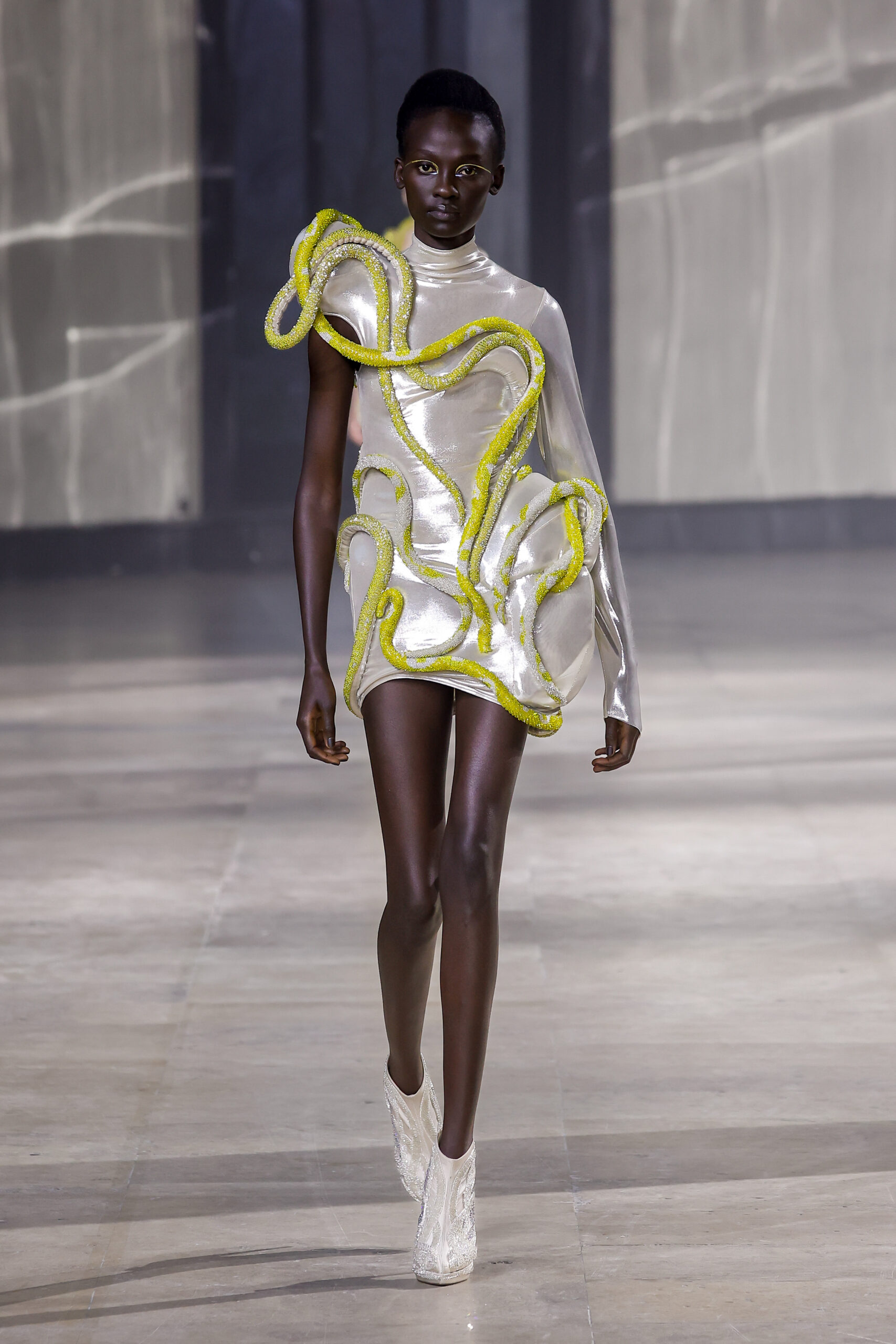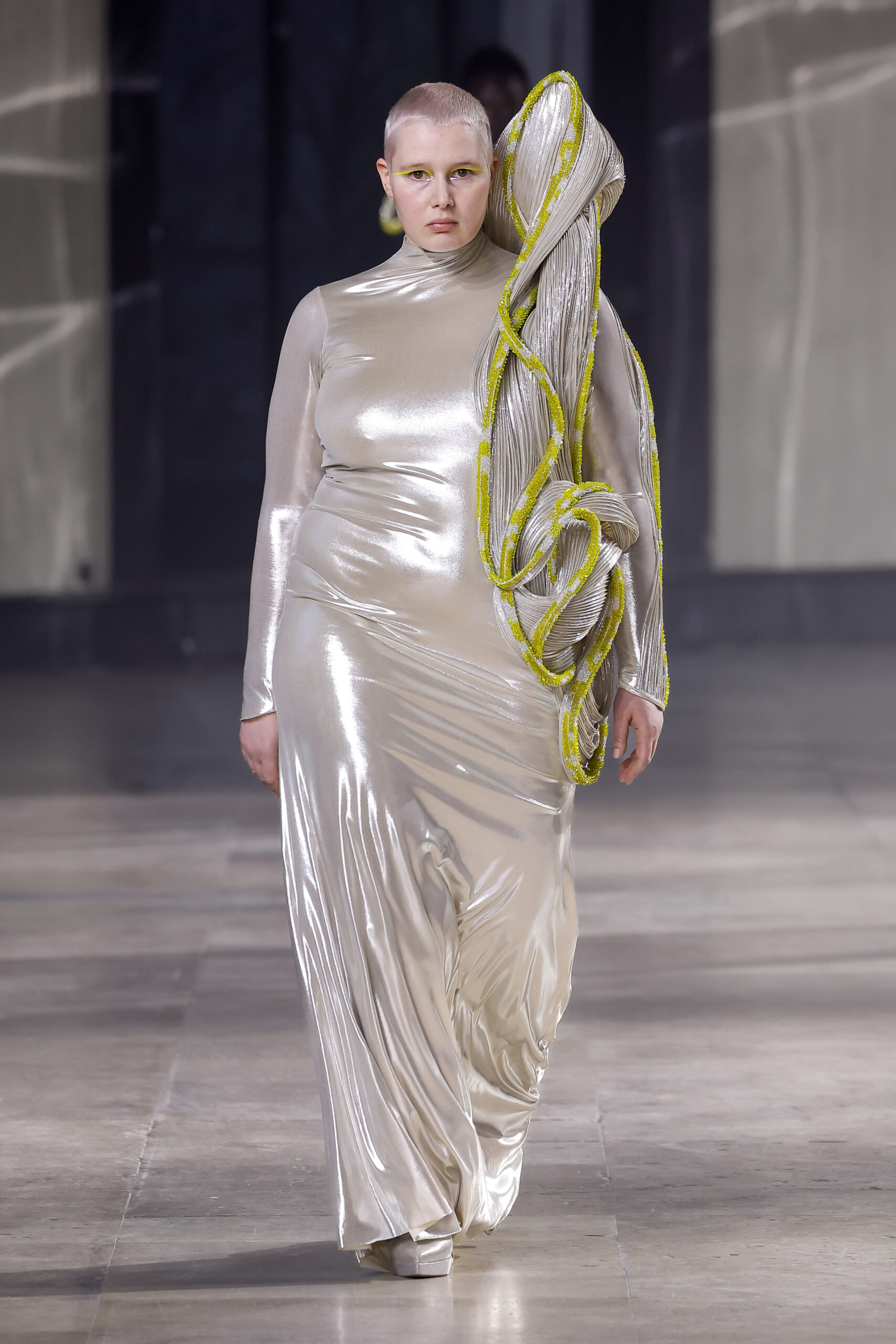 Une robe serpent s’enroule et s’entrelace tout au long du corps, inspirée par la Kundalini. Les vagues brodées à la main serpentent doucement sur le corps, illuminées par des perles de verre noires et arc-en-ciel violettes et bleues iridescentes. Les robes gothiques en jersey noir simulant du cuir et en jaune néon psychédélique contrastent avec la robe serpent en argent et jaune Kundalini.