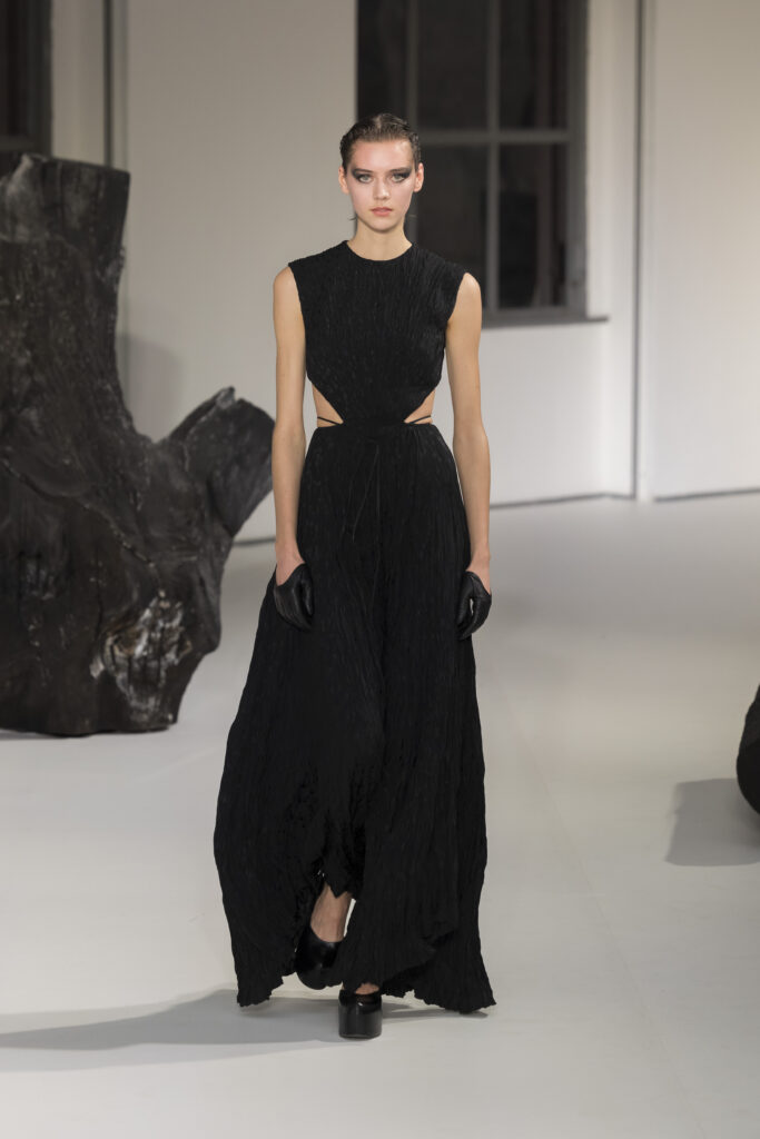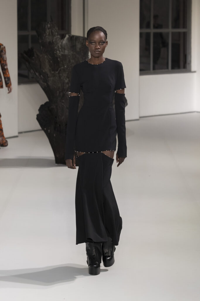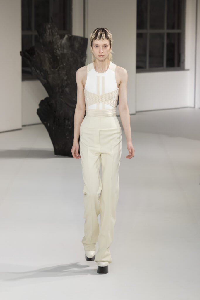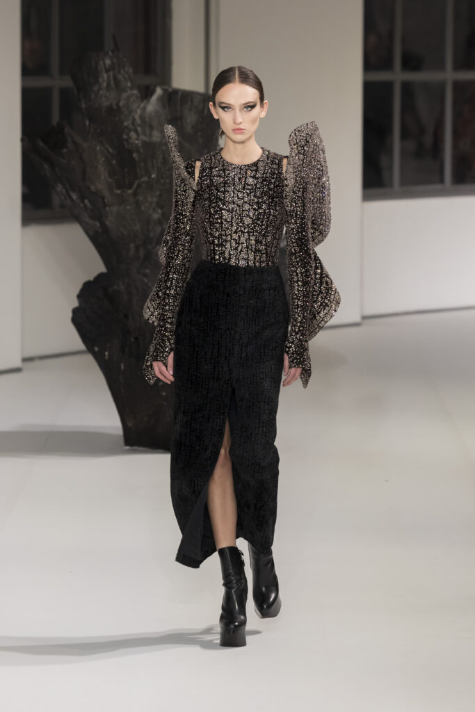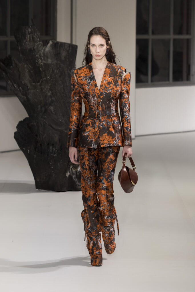 I worked with atelier means to craft all of this into fabrics. Garments are designed with layers that come undone and peel off, revealing new, evolutive shapes. Embroideries recall Sunburst Lichen; tree bark is fashioned into fabric. Sharp and shapely tailoring, and touches of surgical latex provide lab-like precision, while draping and sculpting hint at the glorification of femininity that underlines all of my work. Even platforms and heels are set on fire to mutate.
