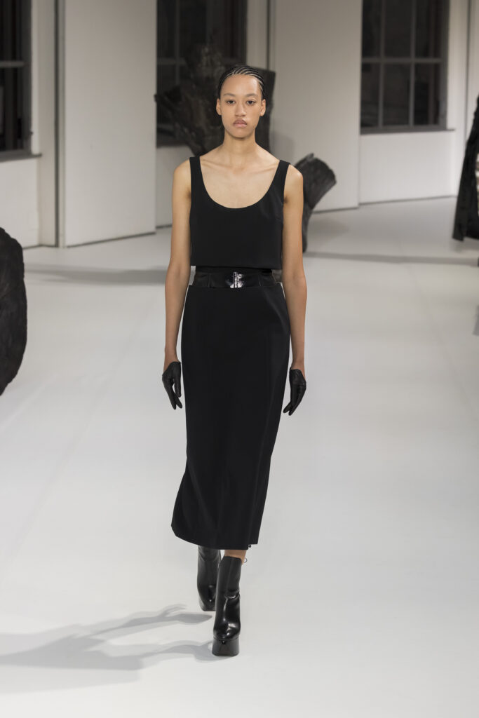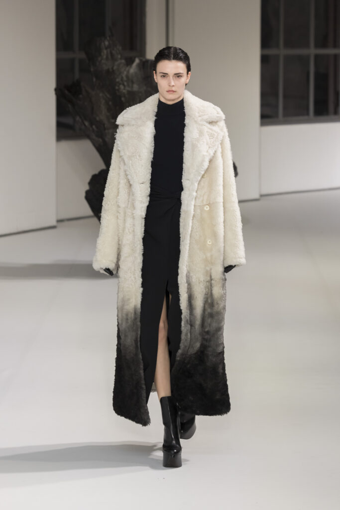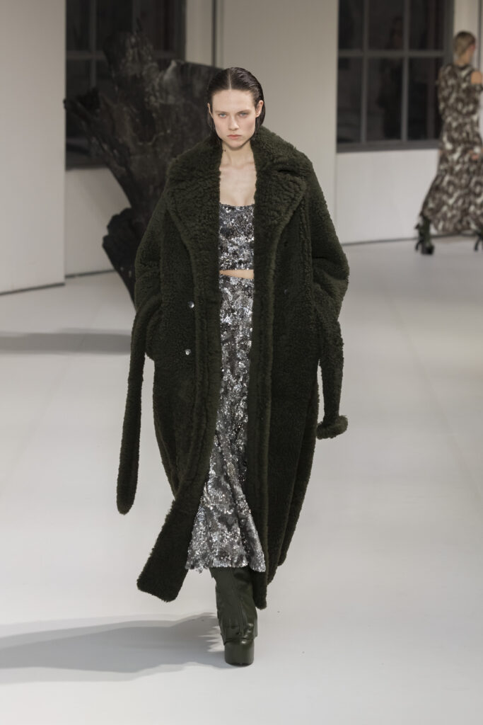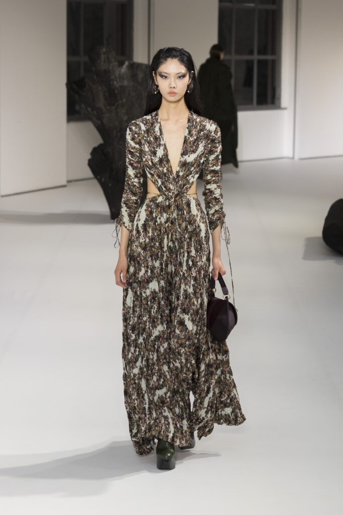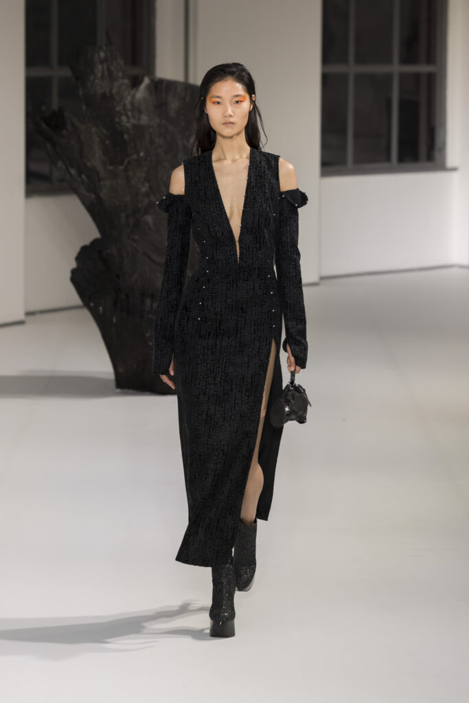 I worked with atelier means to craft all of this into fabrics. Garments are designed with layers that come undone and peel off, revealing new, evolutive shapes. Embroideries recall Sunburst Lichen; tree bark is fashioned into fabric. Sharp and shapely tailoring, and touches of surgical latex provide lab-like precision, while draping and sculpting hint at the glorification of femininity that underlines all of my work. Even platforms and heels are set on fire to mutate.