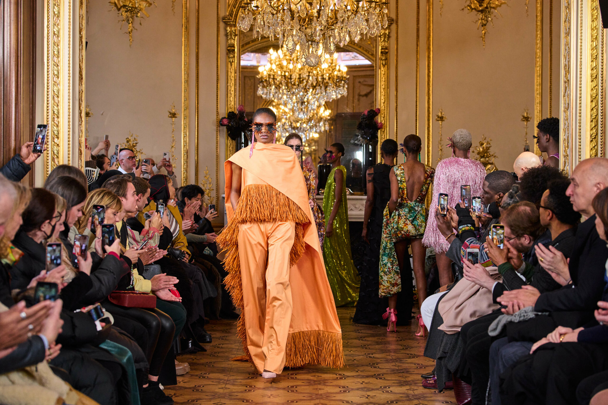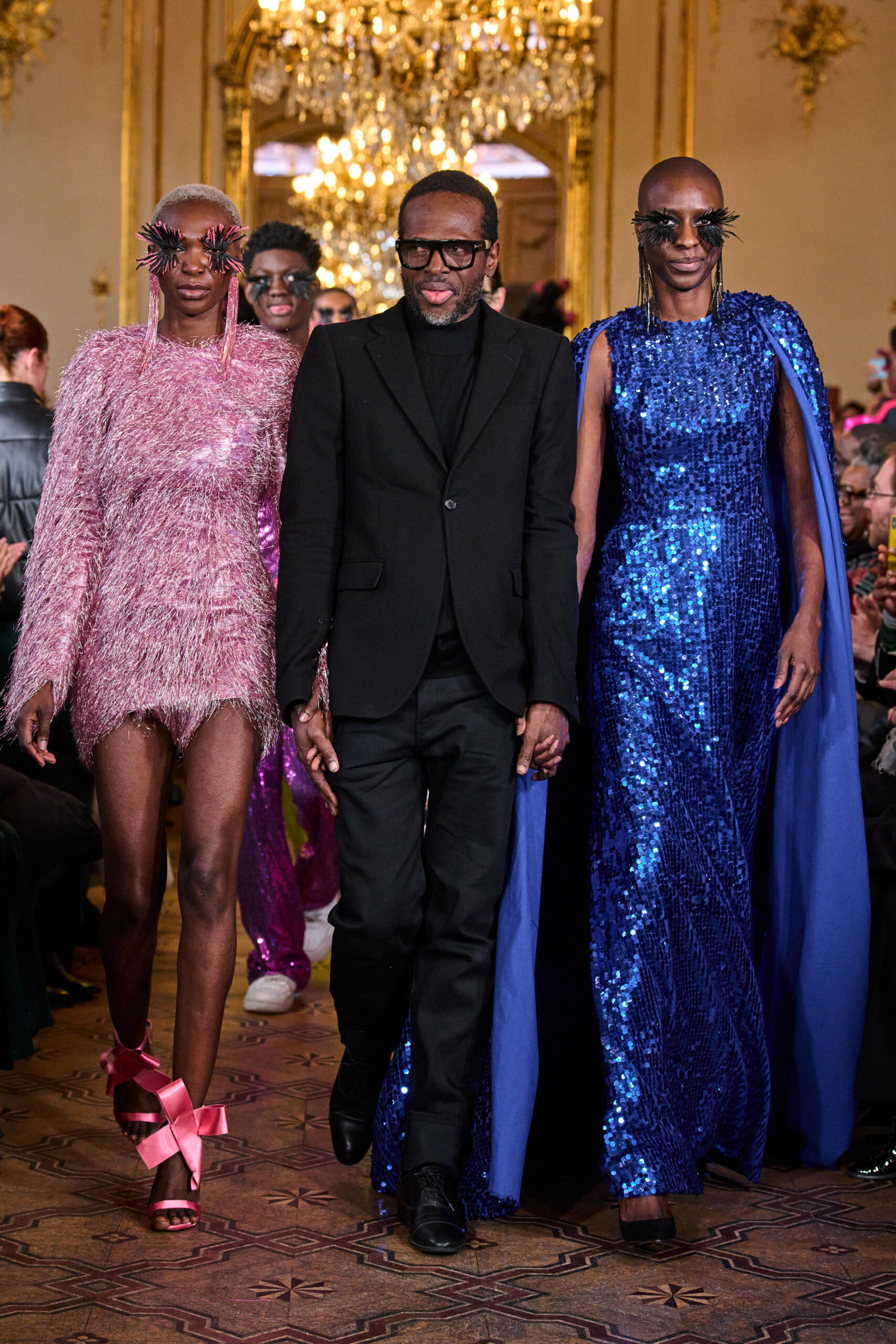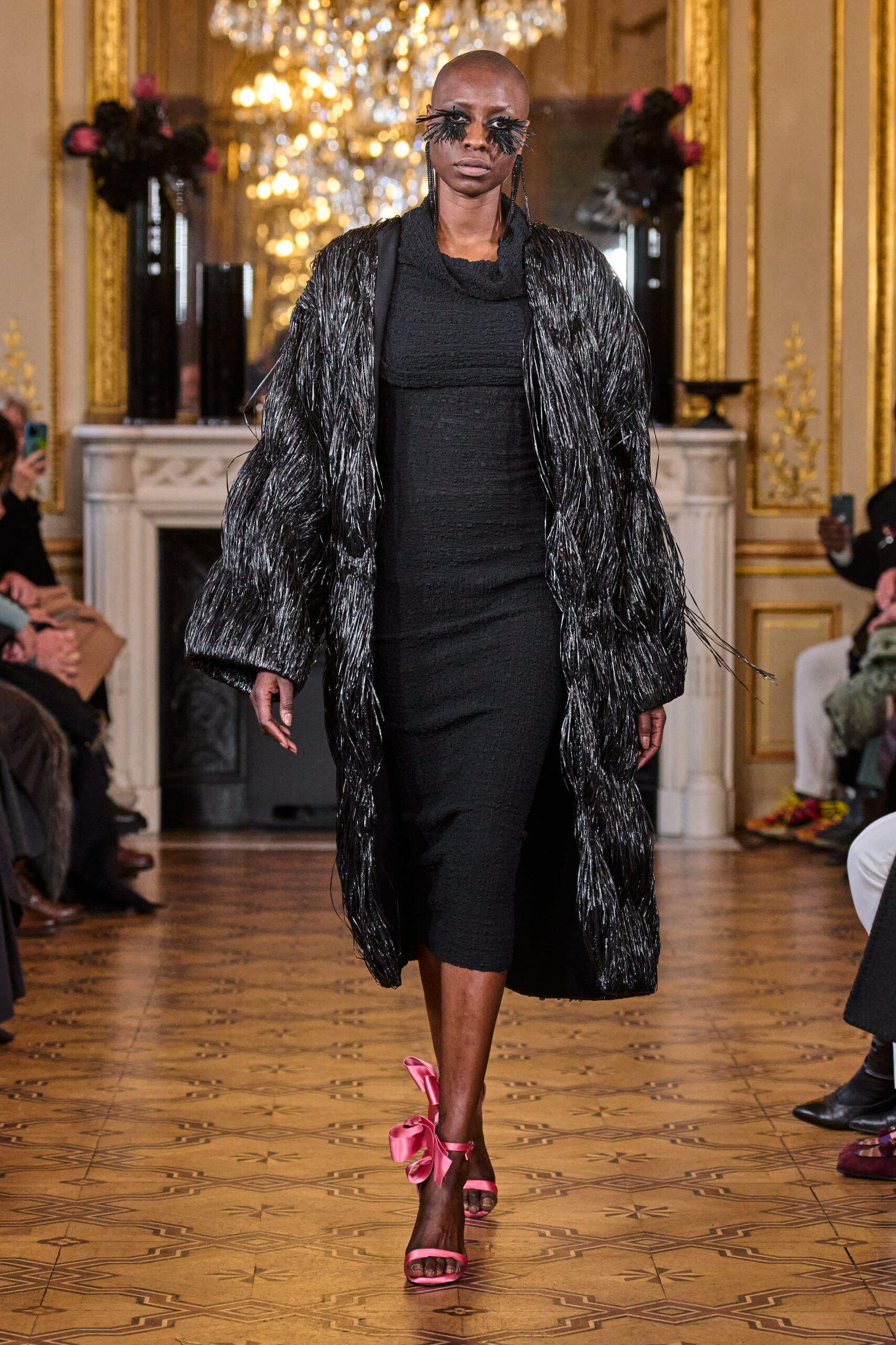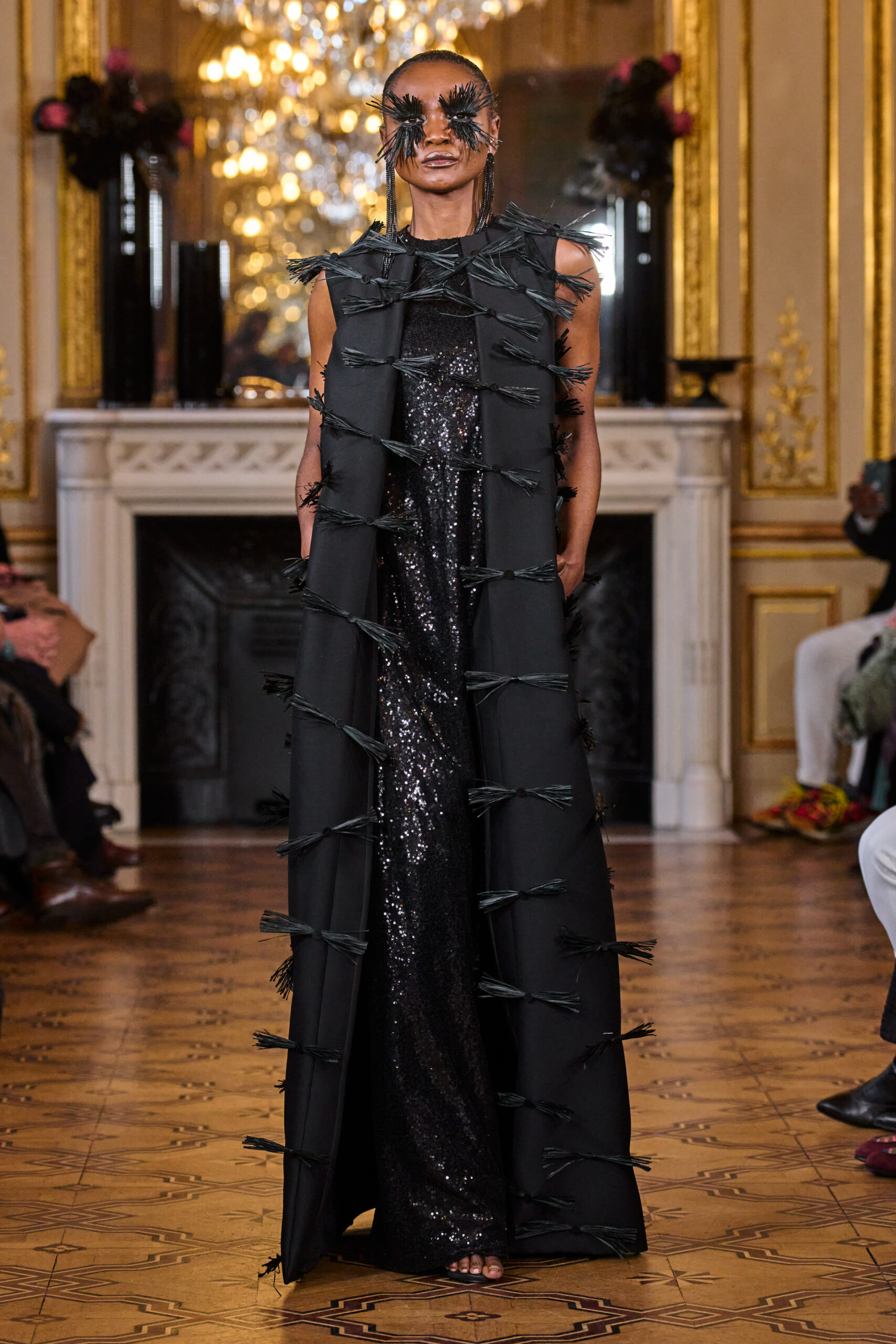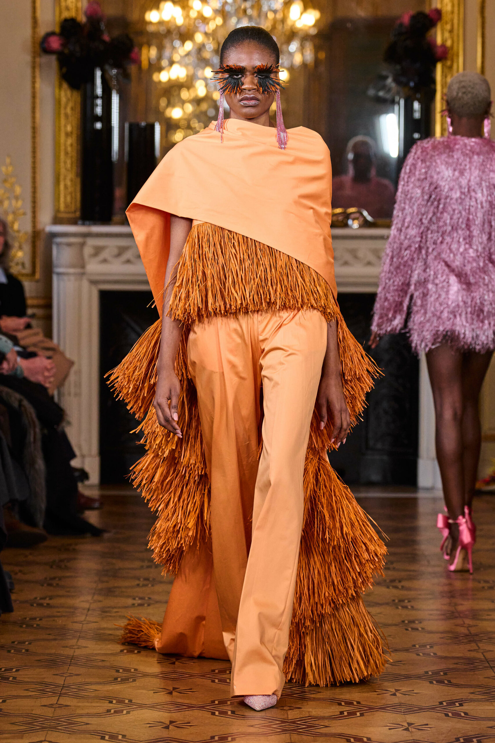 La femme Imane Ayissi ose la couleur avec des tons vibrants tels que le fuchsia, l’orange et le bleu électrique. La sobriété est également présente avec la robe noire emblématique du créateur. Les différentes longueurs des vêtements contrastent avec l’asymétrie qui ne laisse personne indifférent. La beauté métissée est l’objectif de cette collection. Les faux-cils en fibre de raphia, imaginés par Marcello Costa, donnent une touche d’originalité à chaque look.